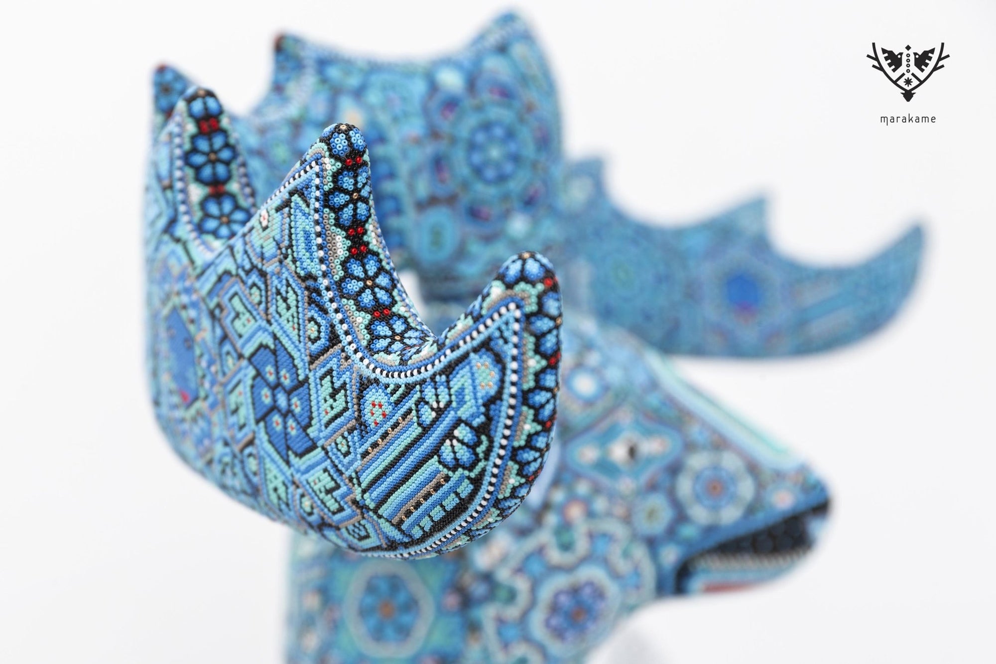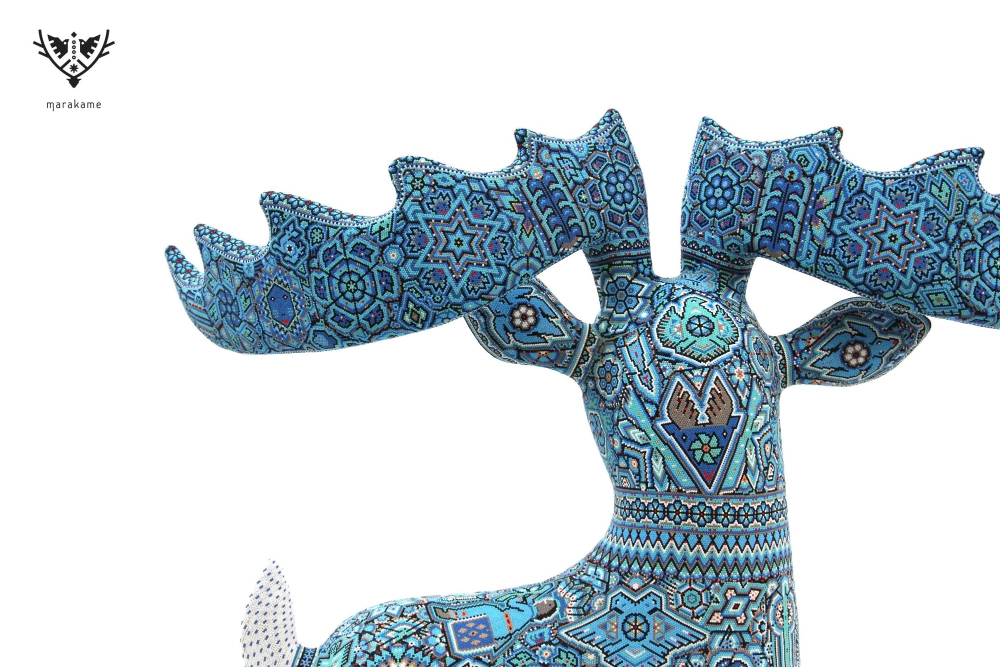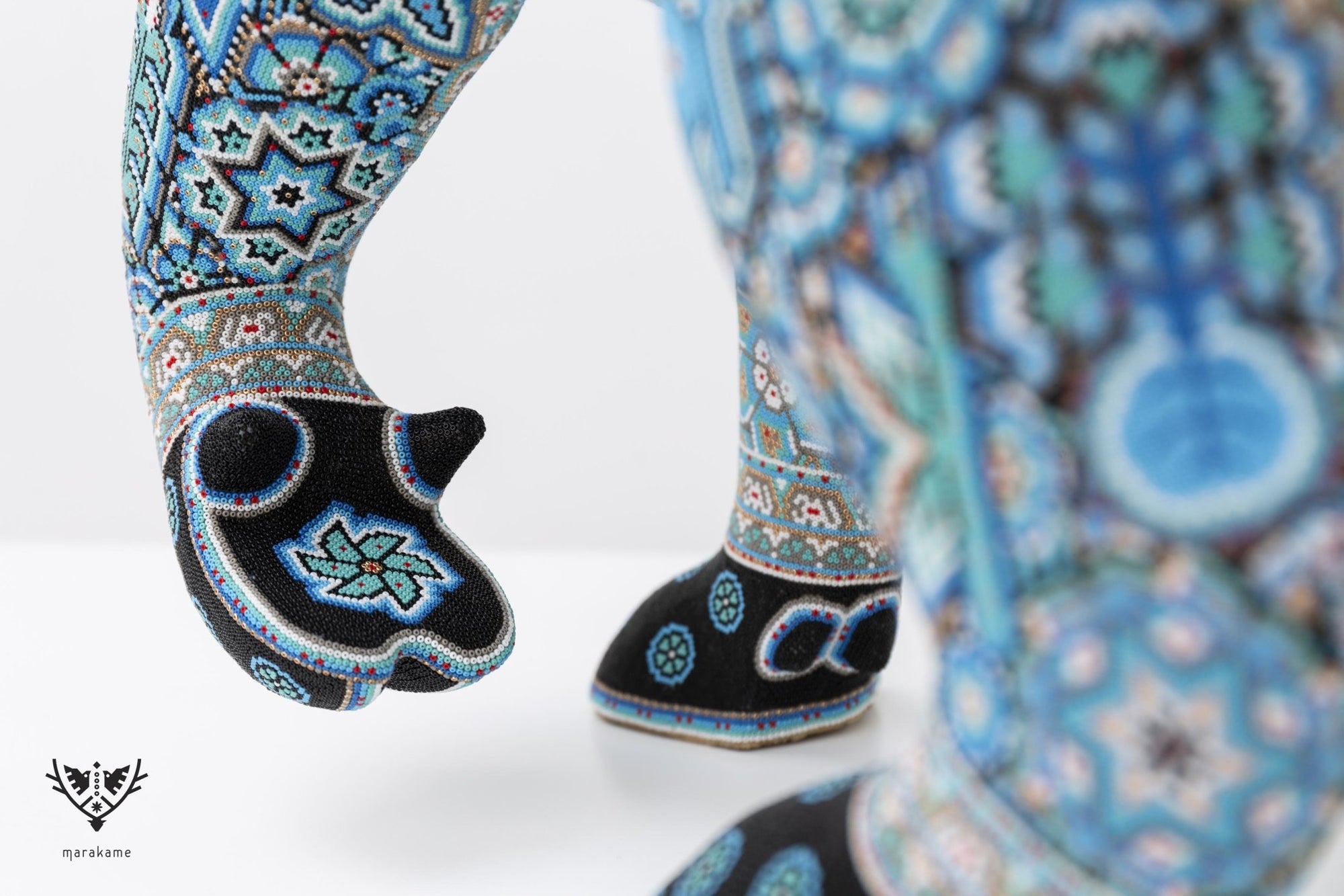 Marakame innova e integra las habilidades de los artistas Zapotecas, fusionando las piezas logradas por ellos con la destreza visual y manual de los Wixárika al pegar chaquiras de tamaño diminuto una a una (más de 250 mil cristales en esta pieza) durante períodos que van de entre 15 y 300 días.