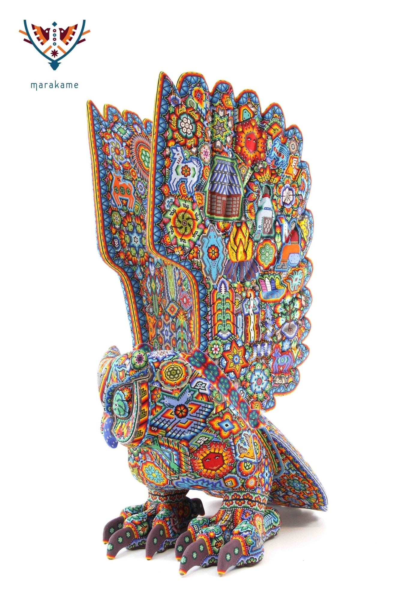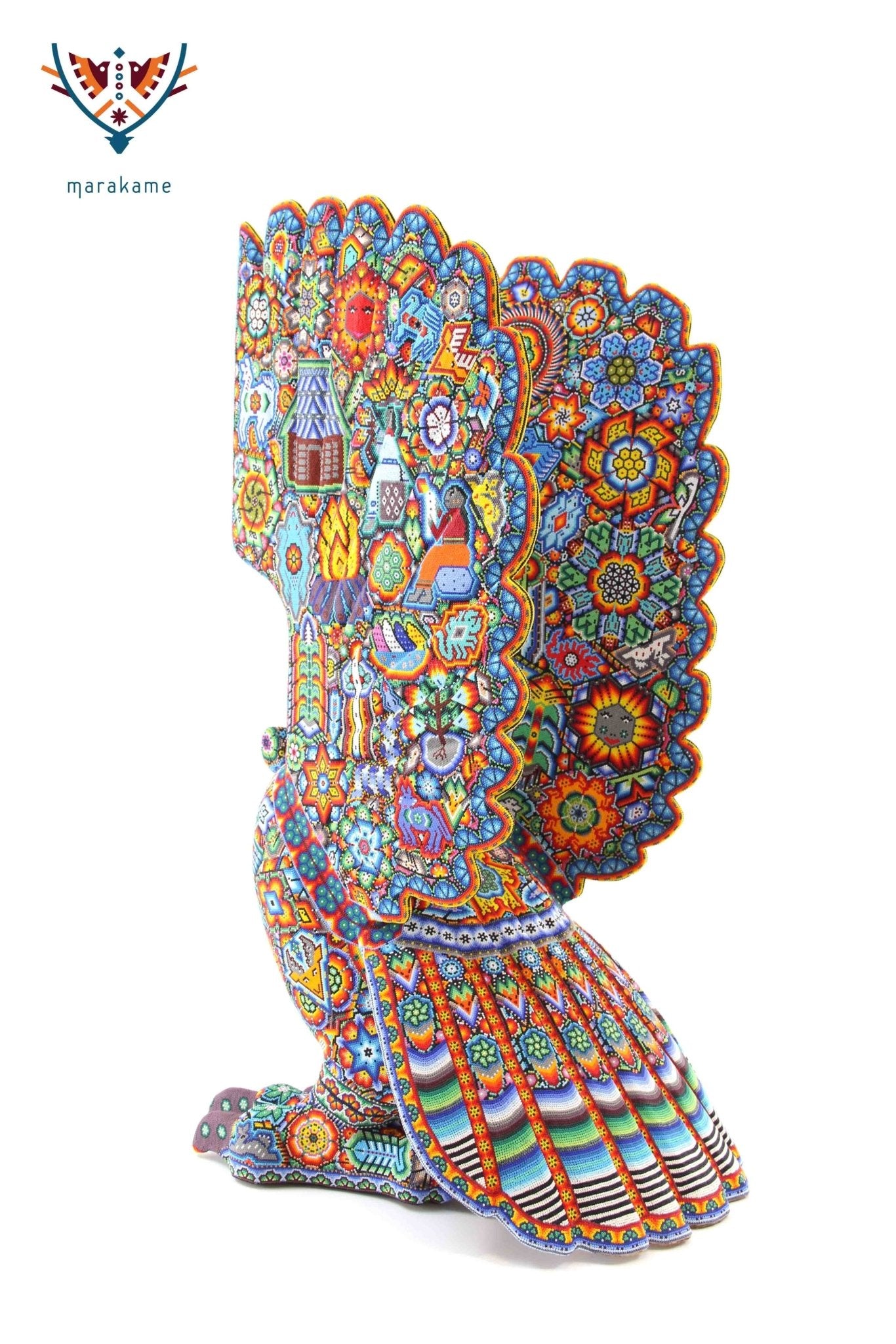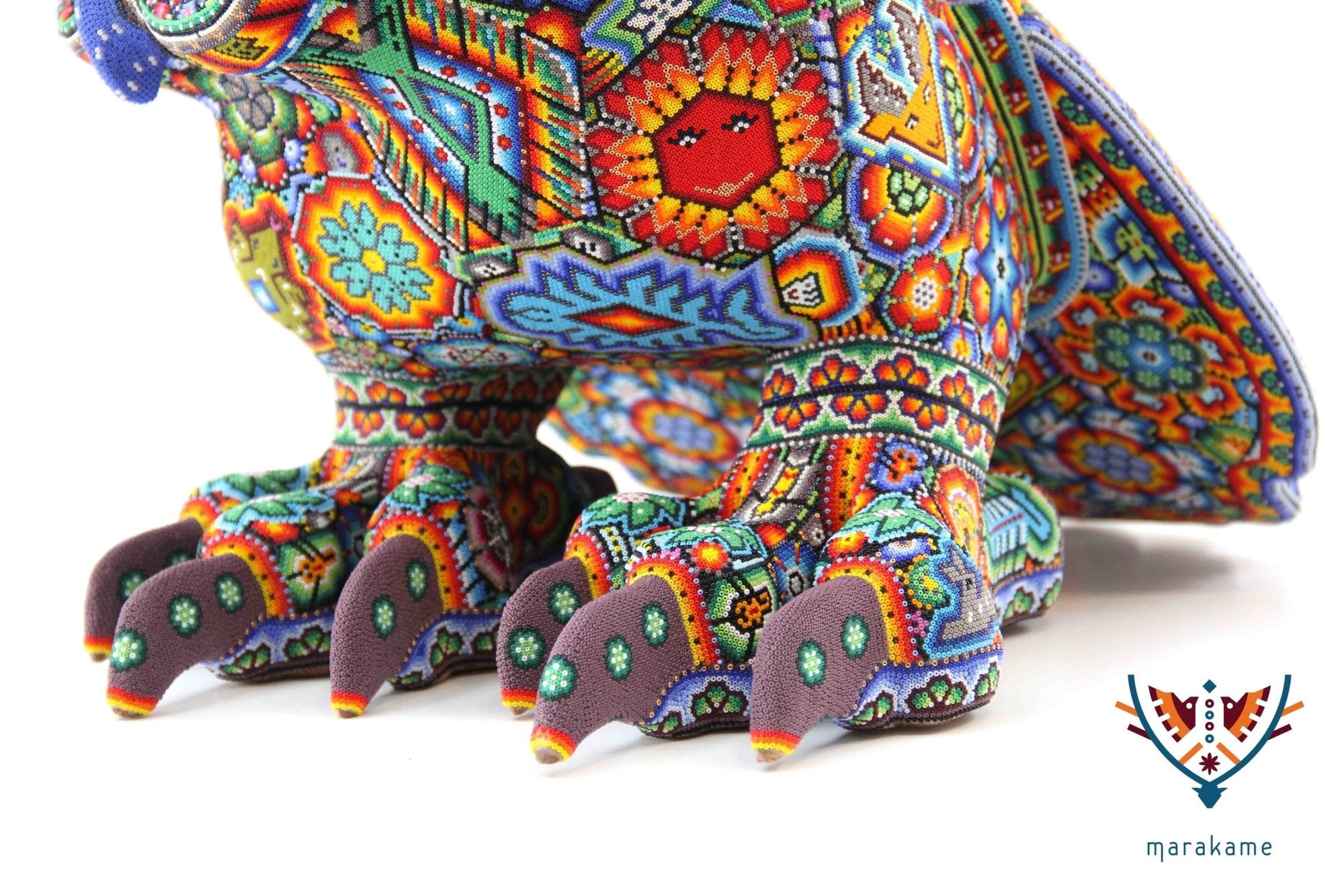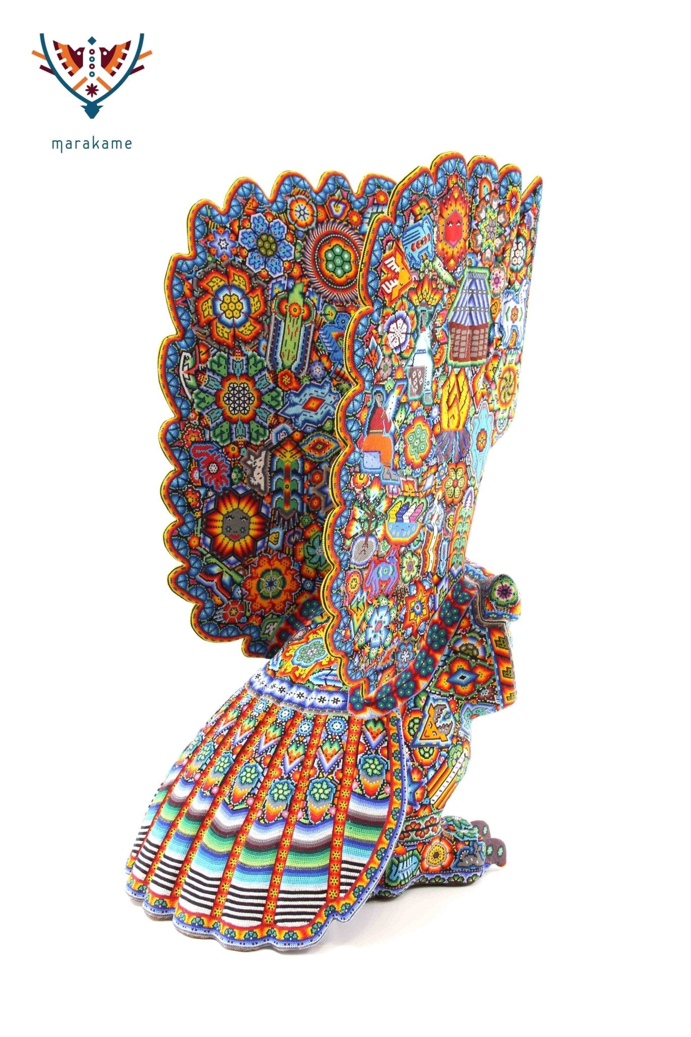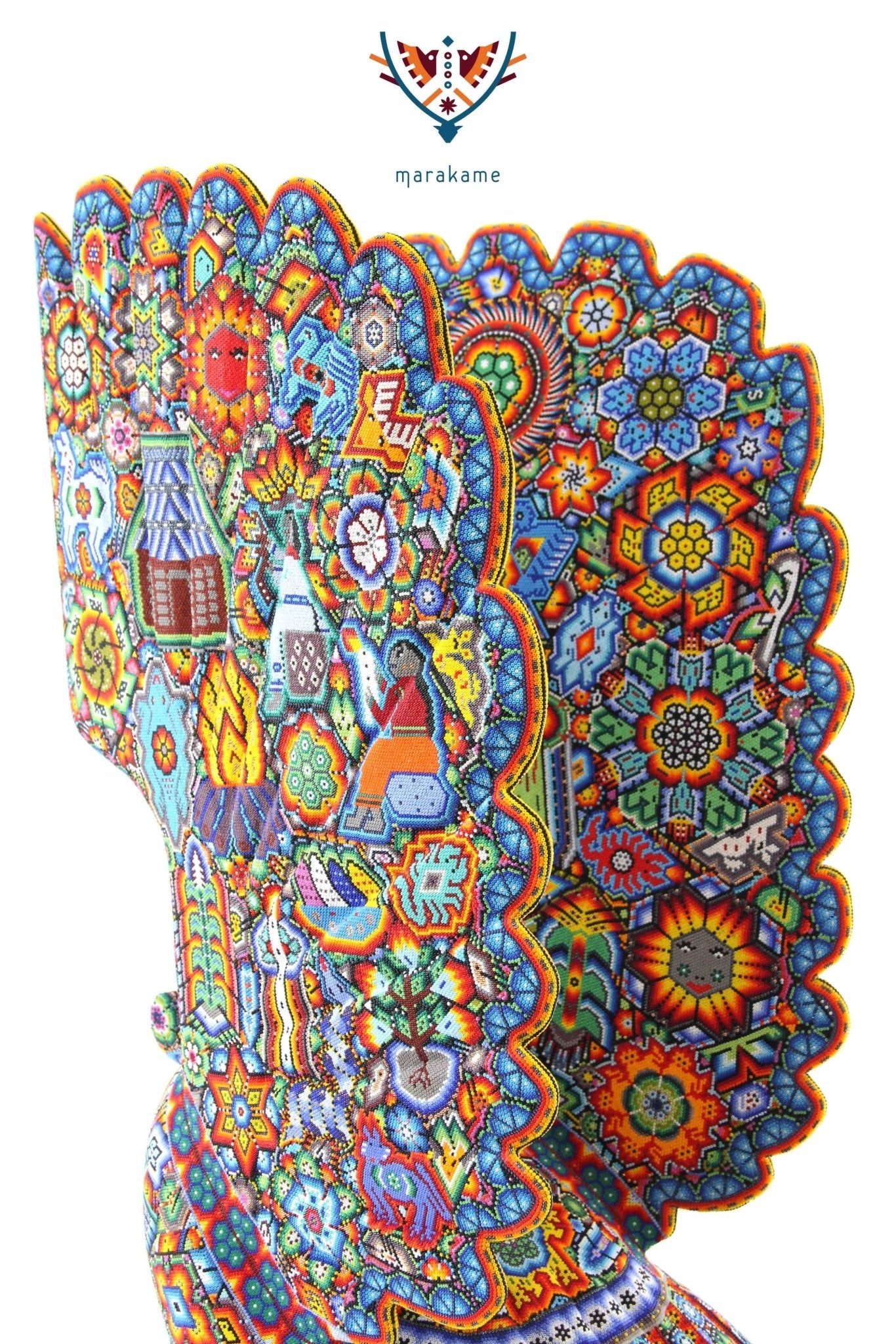 Marakame innova e integra las habilidades de los artistas Zapotecas, fusionando las piezas logradas por ellos con la destreza visual y manual de los Wixárika al pegar chaquiras de tamaño diminuto una a una (entre 25 mil y 40 mil chaquiras por pieza) durante períodos que van de entre 15 y 300 días.