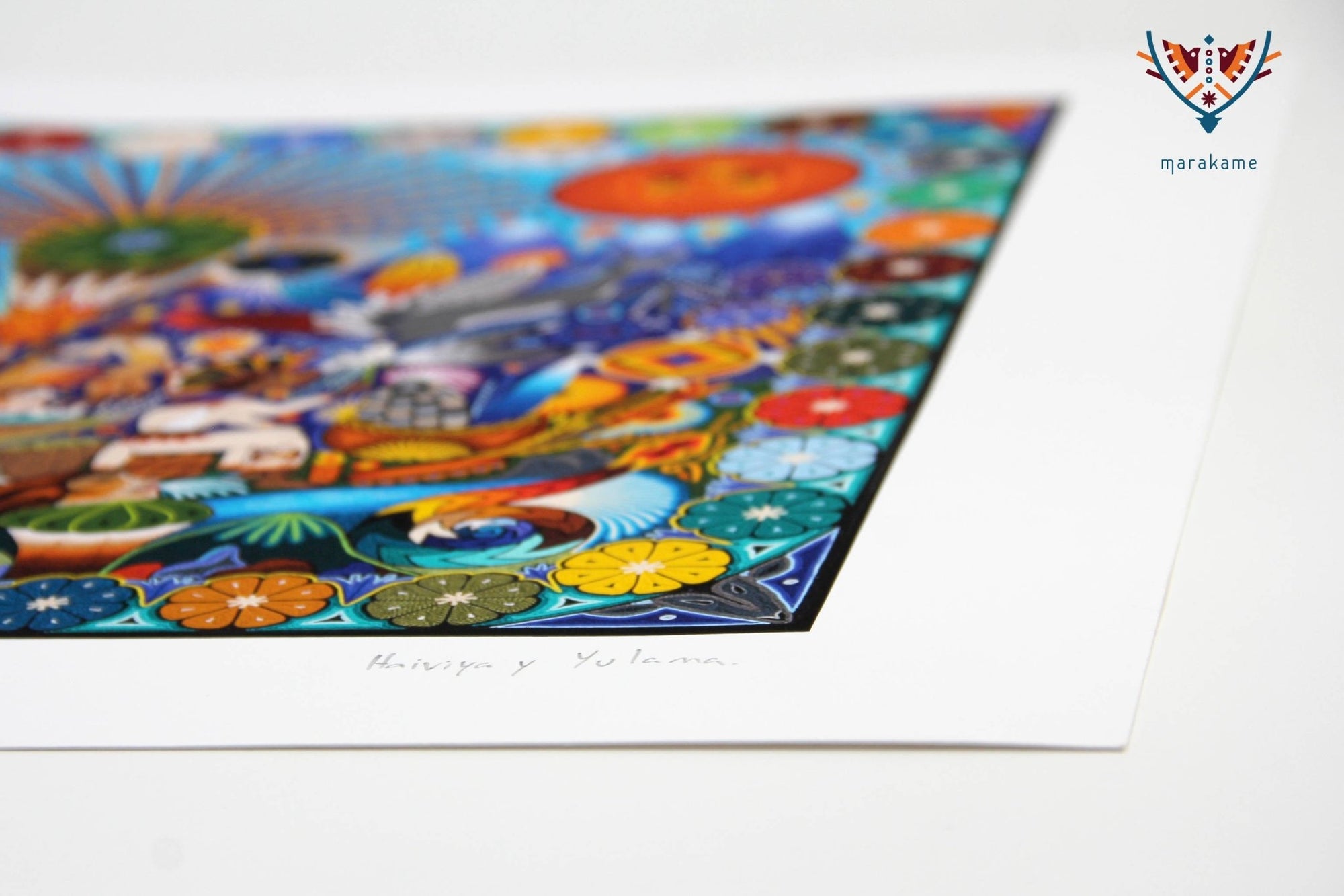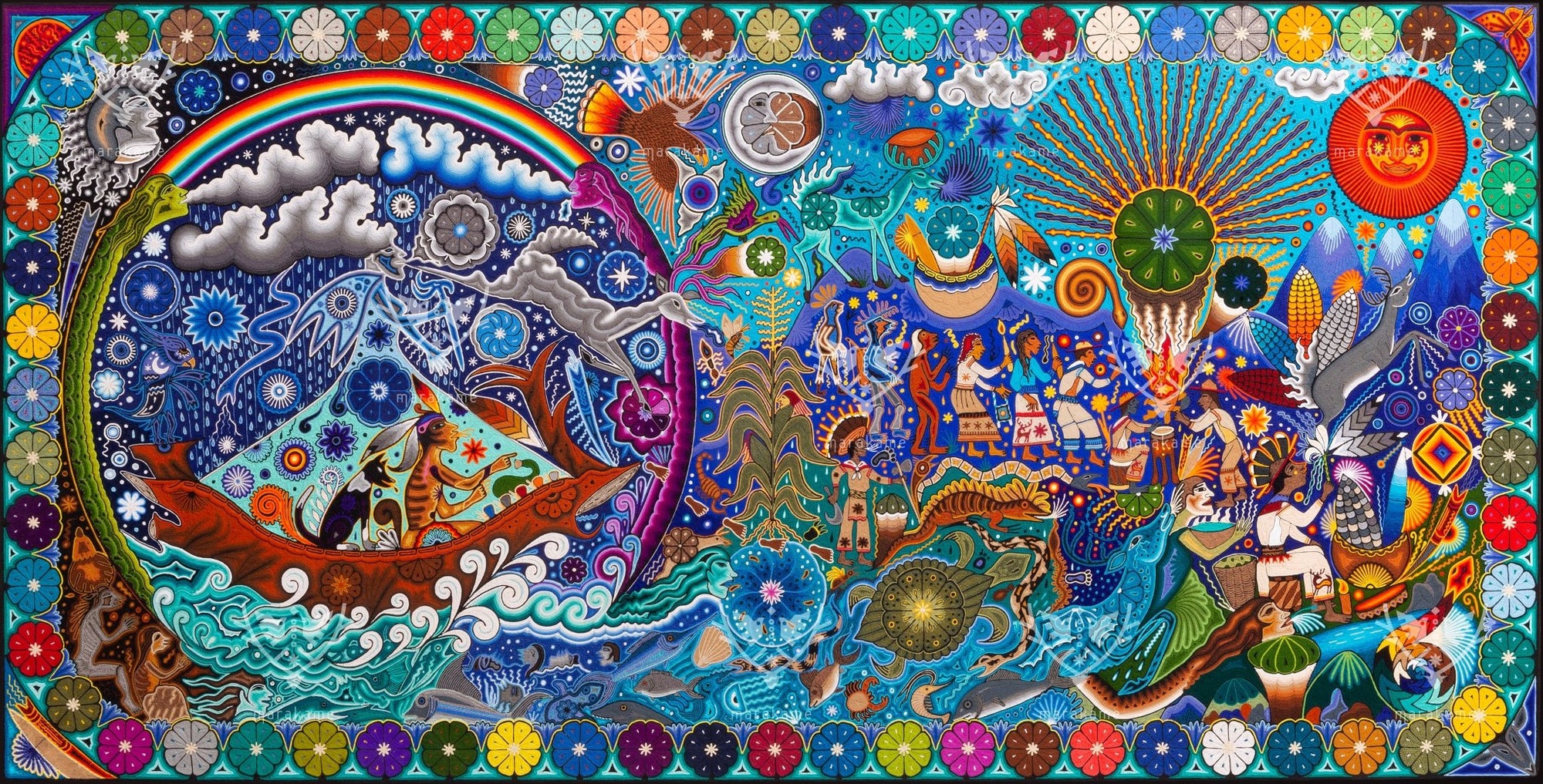 • Nacimiento de las deidades es una obra magistral de la cosmovisión wixárika, un viaje visual al origen sagrado del universo según el pueblo huichol. A través de una narrativa circular y simbólica, representa la creación del mundo, la conexión entre los elementos, los dioses, los animales y los rituales ancestrales. Cada figura evoca una presencia espiritual, un mito o una energía de la naturaleza, envolviendo al espectador en una danza de colores, ciclos y significados.