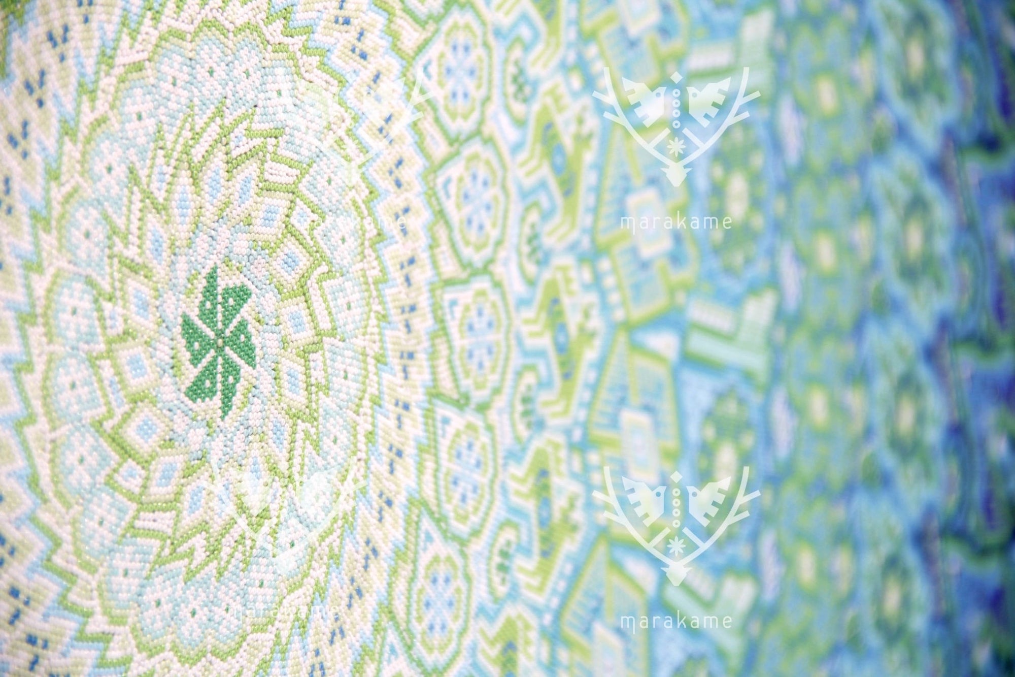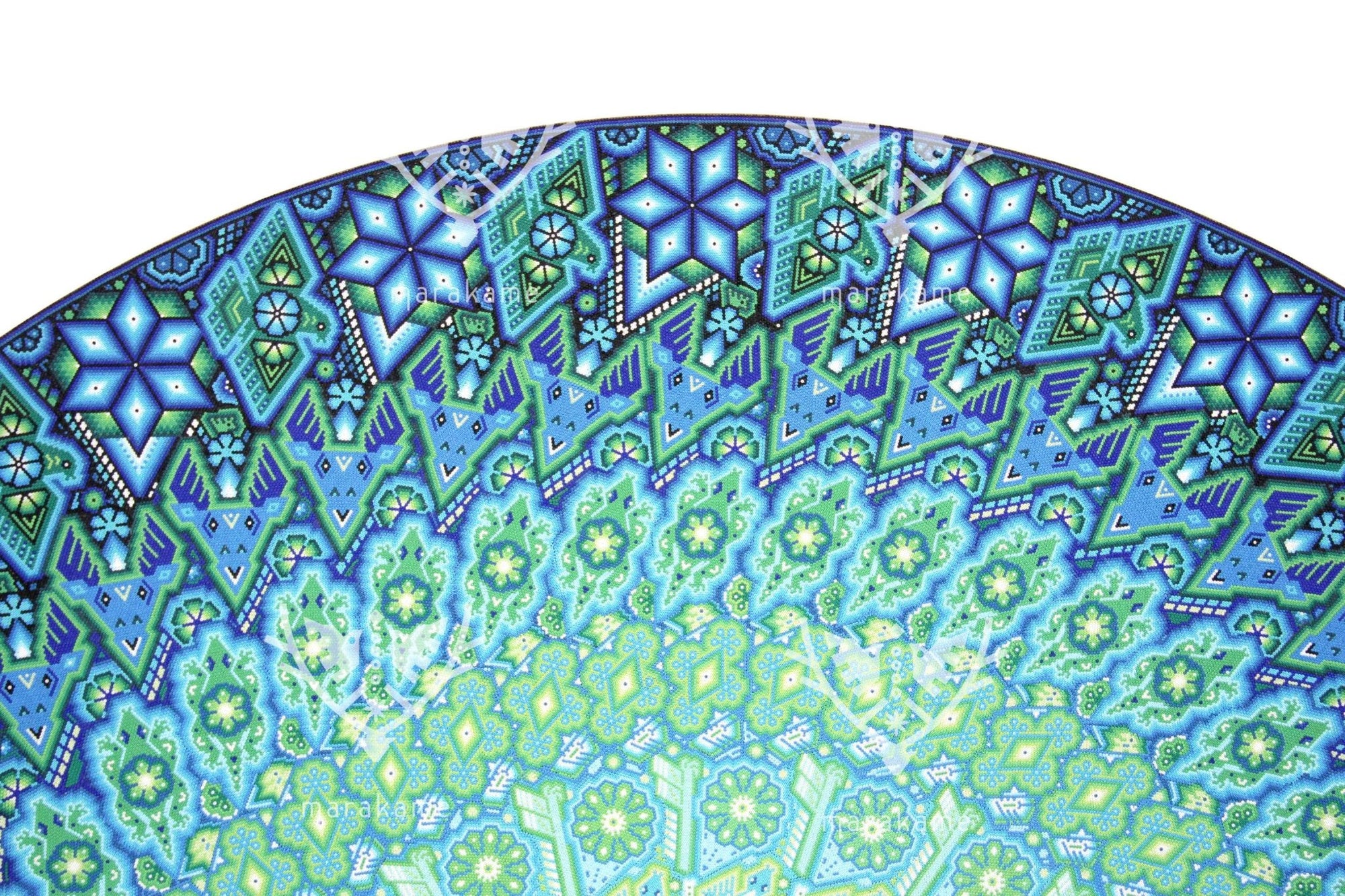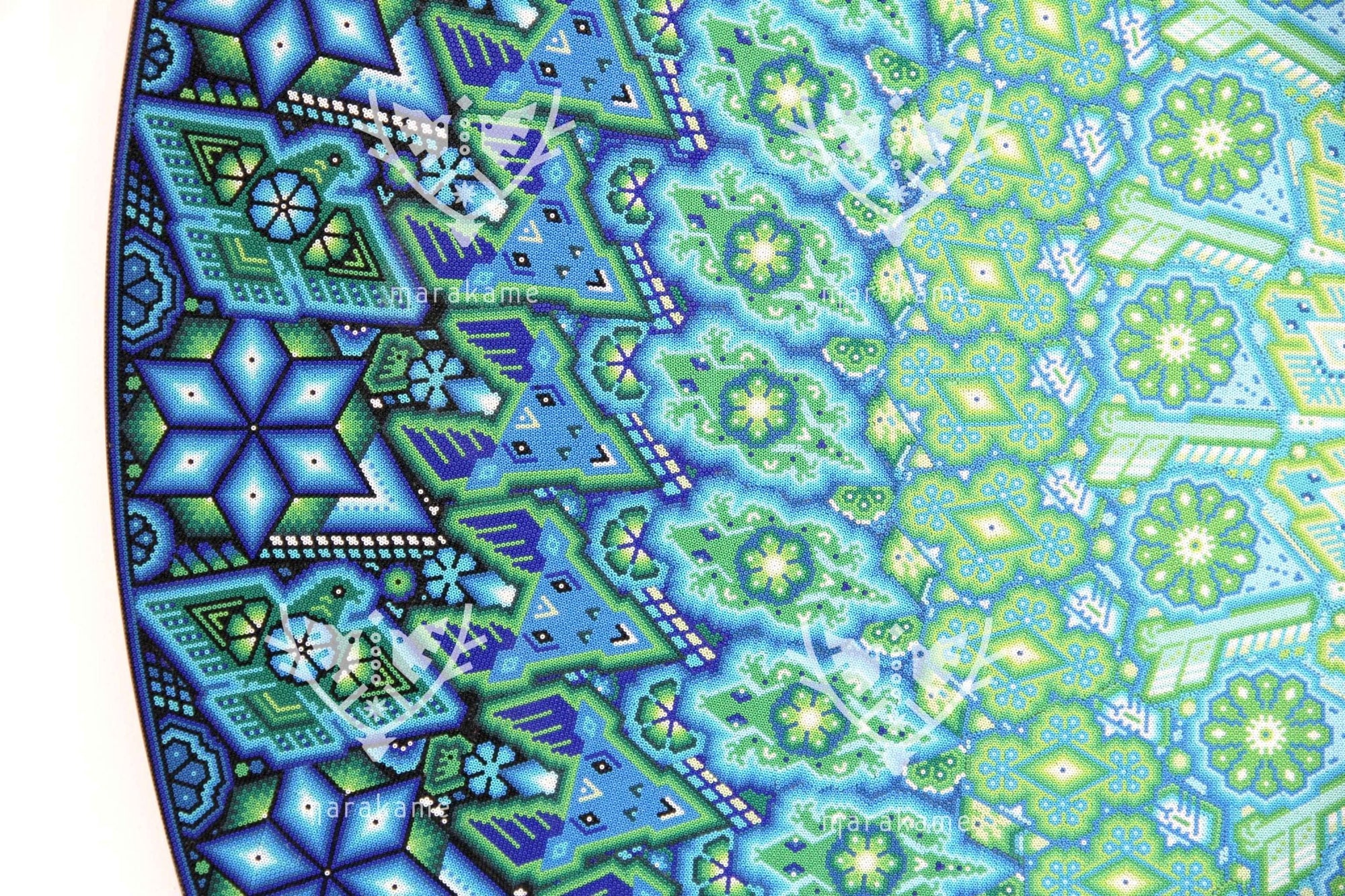 En Marakame trabajamos con artistas Wixárika innovadores que en esta ocasión han realizado un círculo intervenido con la técnica de chaquira. En cualquier caso abordando la narrativa de su costumbre tradicional mediante la simbología más representativa de su cosmovisión.