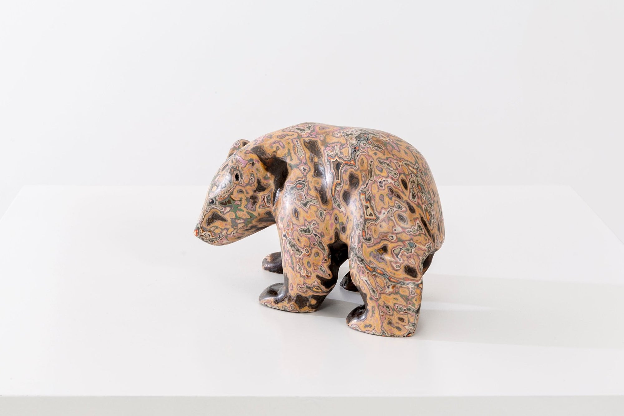 • "Oso con colores interiores" es una escultura que combina la representación animal con un enfoque abstracto y experimental en la superficie. Creada por Taro Tokuyama, esta pieza reimagina al oso como una figura cargada de texturas vibrantes y patrones complejos que evocan la geología y las formaciones naturales.