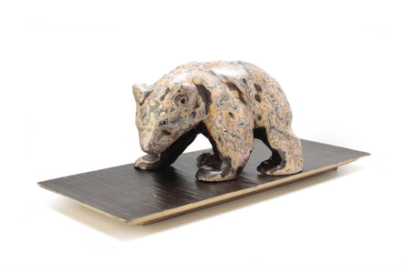 La pieza presenta una rica paleta de colores y líneas orgánicas que parecen fluir y entrelazarse sobre el cuerpo del oso, sugiriendo una conexión simbólica entre la fuerza del animal y los elementos de la tierra. Con acabados brillantes y detalles meticulosos, esta obra logra captar la atención tanto por su forma reconocible como por su intrincada superficie.