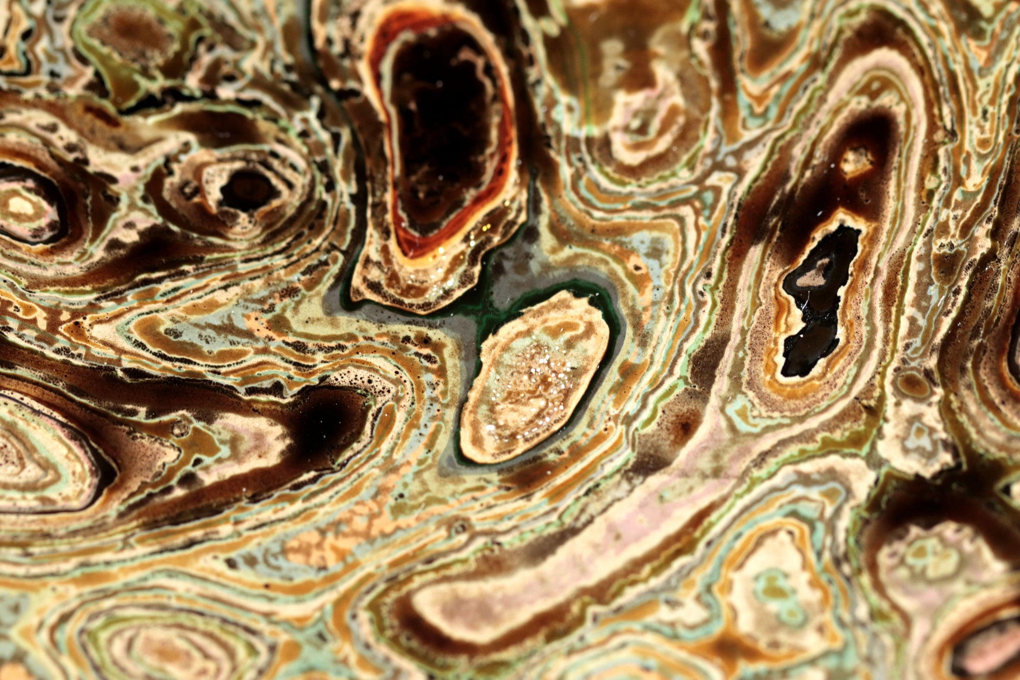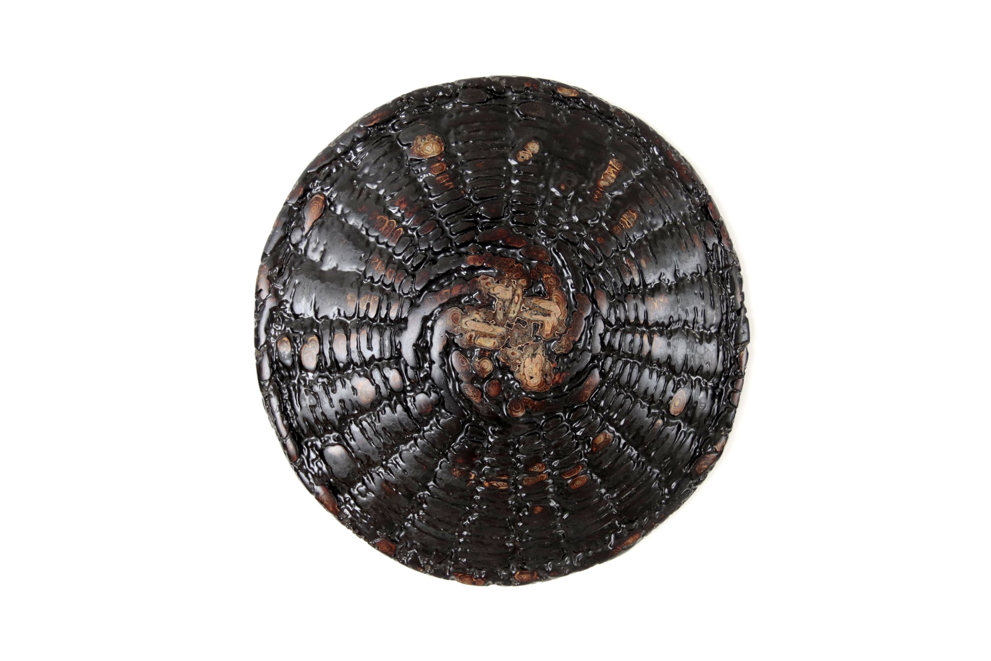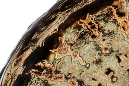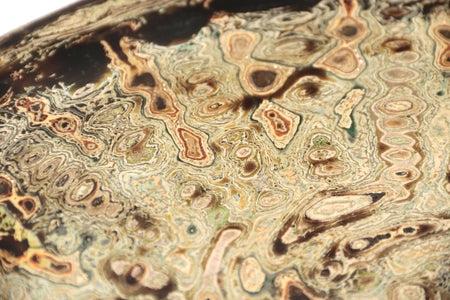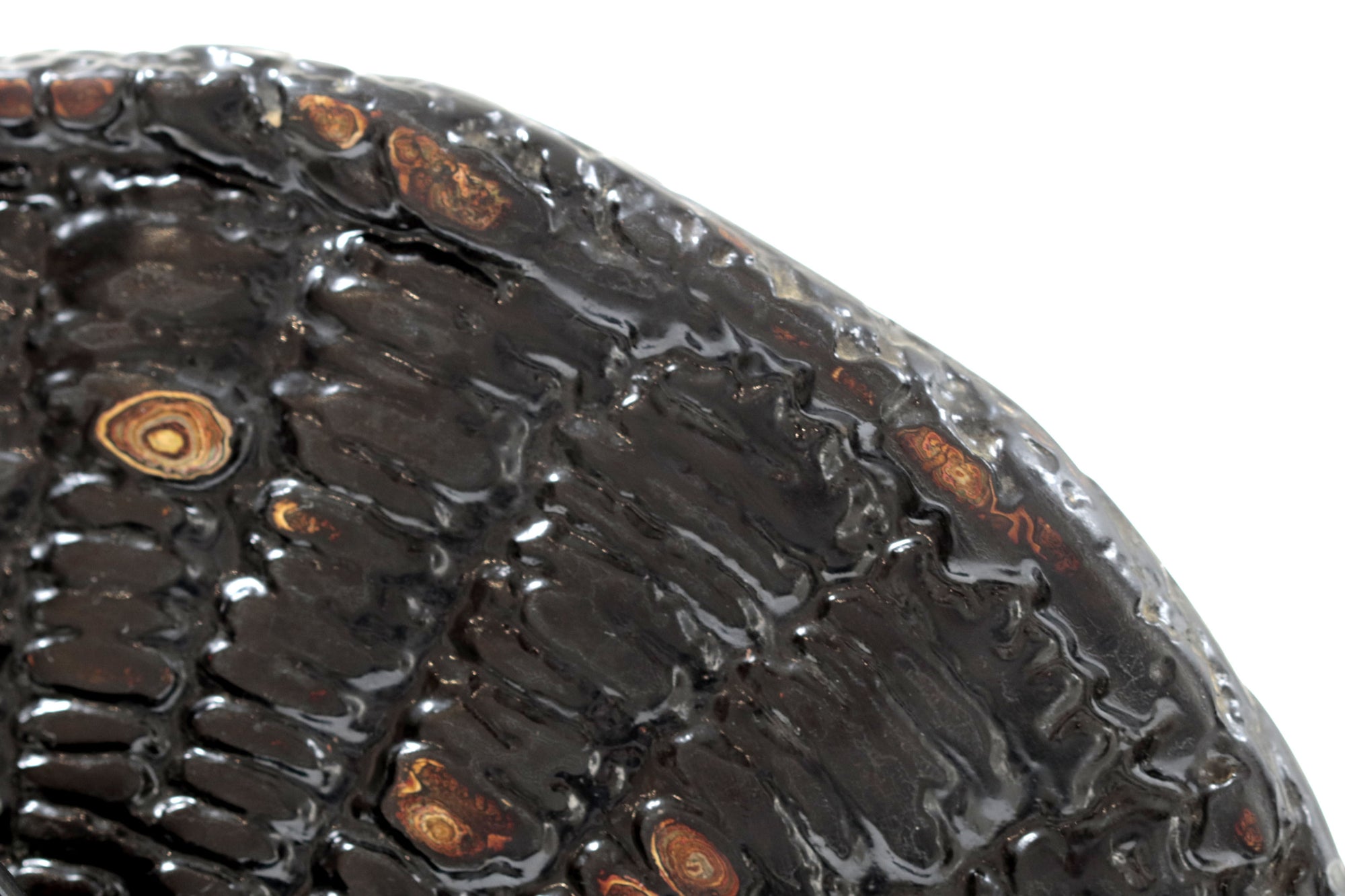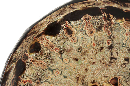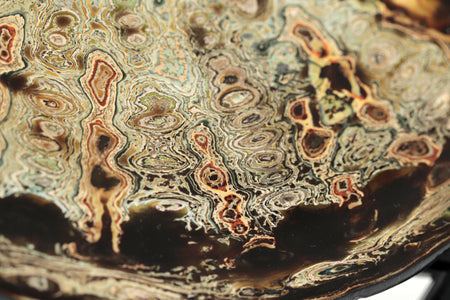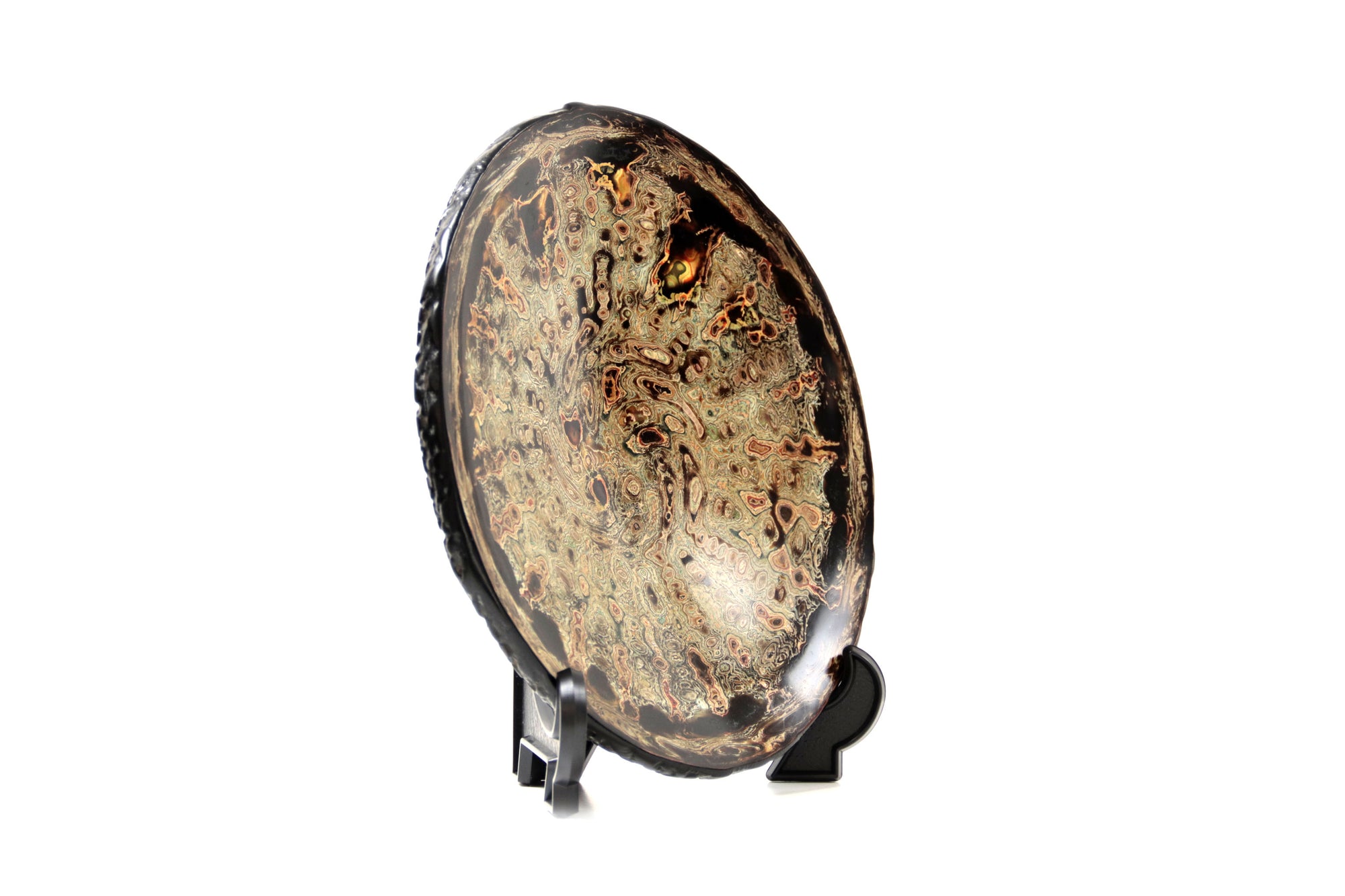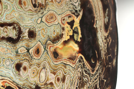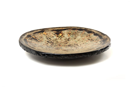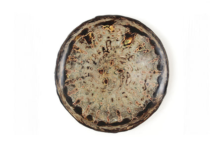 La superficie del plato se presenta como un paisaje en movimiento: una cartografía de remolinos, vetas y profundidades que evocan procesos naturales de erosión y formación. Las capas de pintura y laca japonesa revelan una materia que respira, vibrante, donde el color no se impone sino que emerge. En esta obra, el artista encuentra en el acto de pulir y superponer un ejercicio de contemplación: una búsqueda de armonía entre el gesto humano y la paciencia del tiempo.