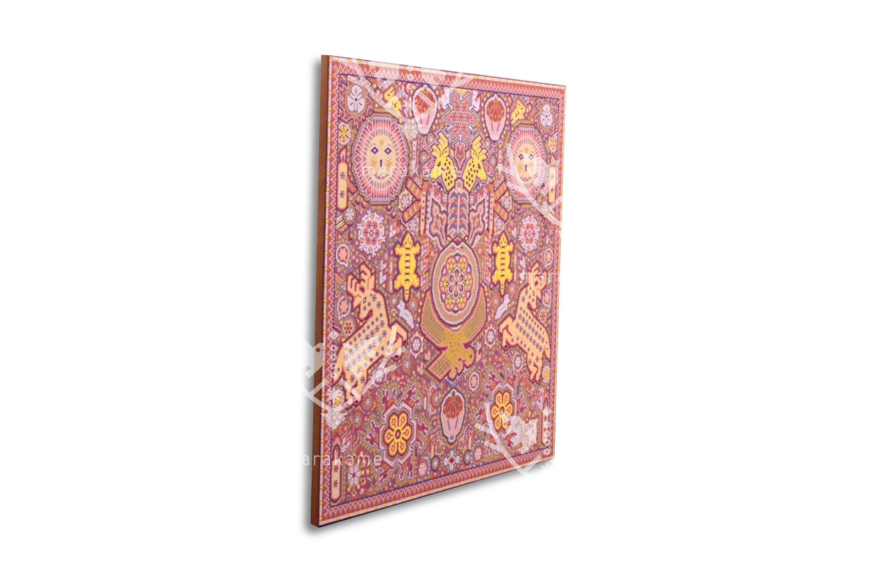 Cada uno de estos círculos o tondos codifica narrativas ceremoniales y espirituales, engarzadas con patrones de figuras y color que caracterizan la cosmovisión wixárika: animales, vegetación, los astros y los dioses que nos hablan las verdades del cosmos.