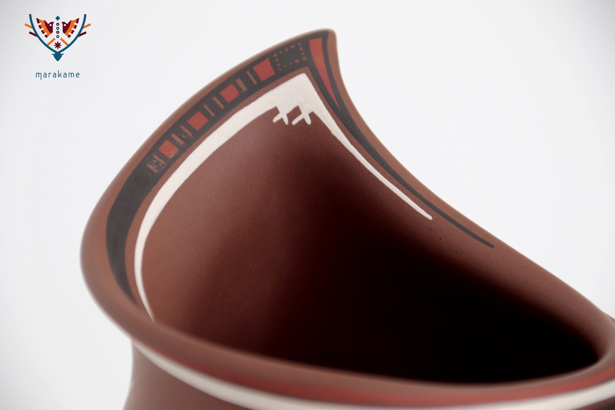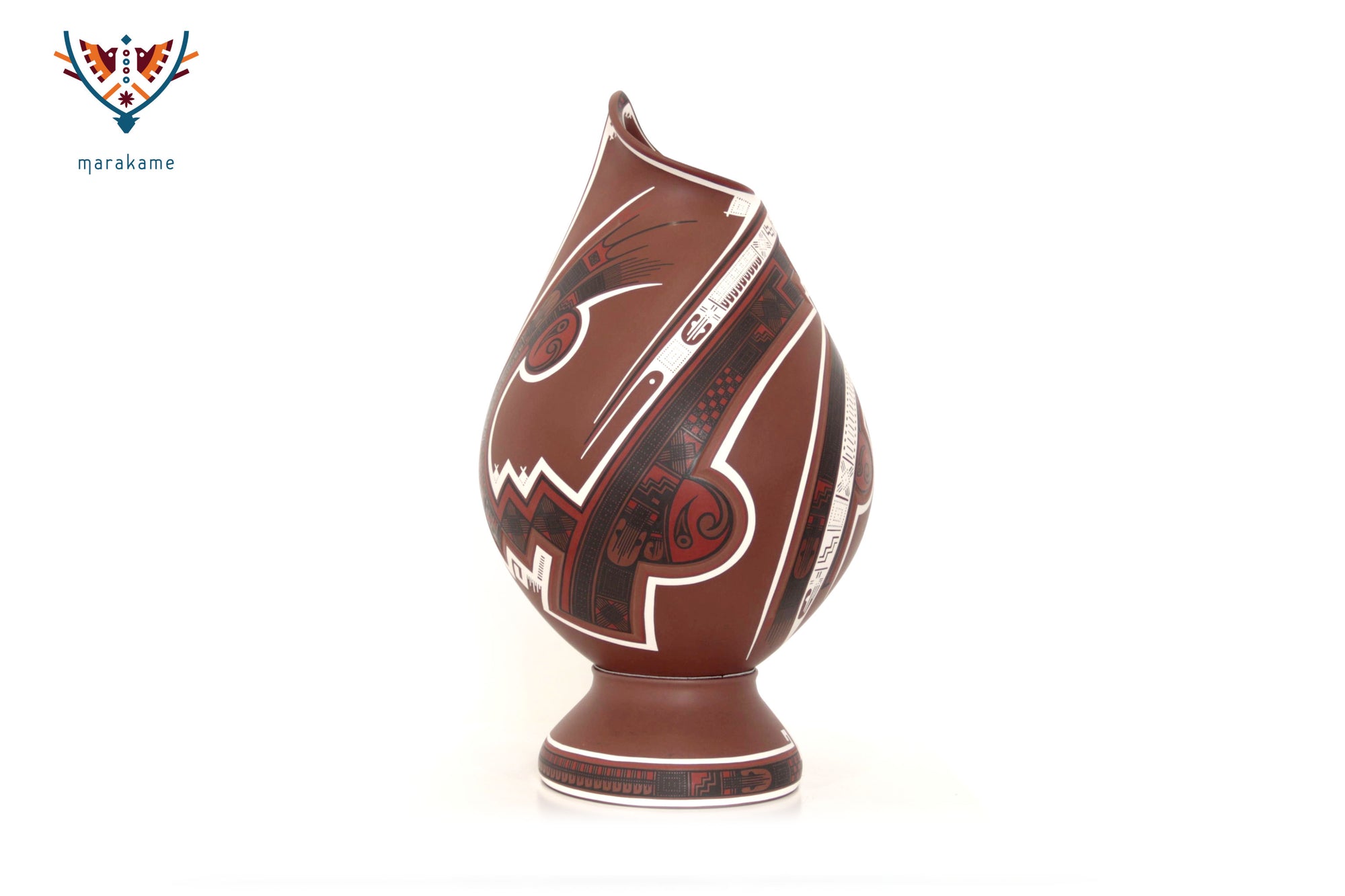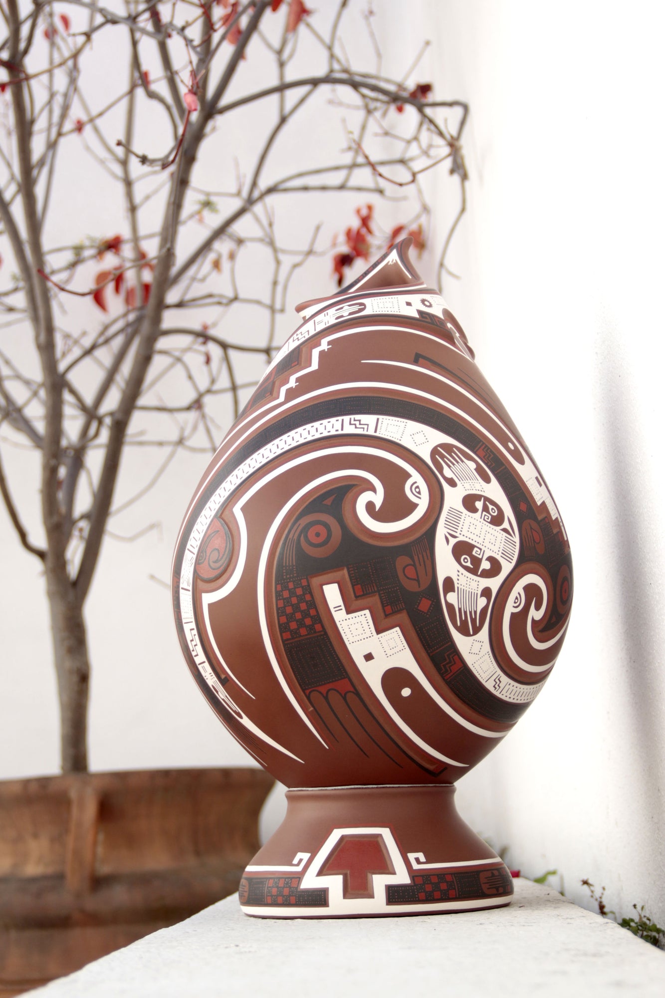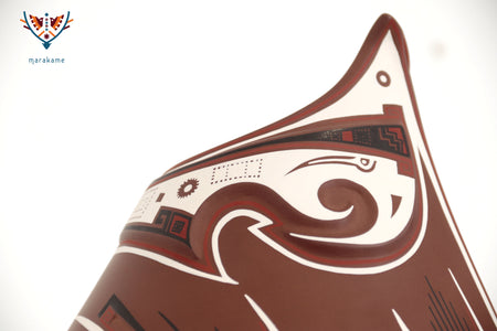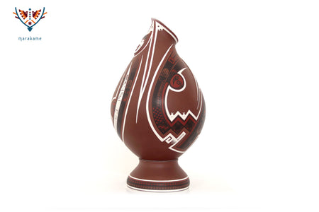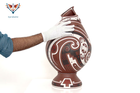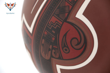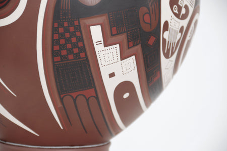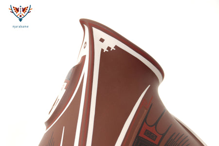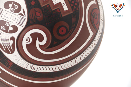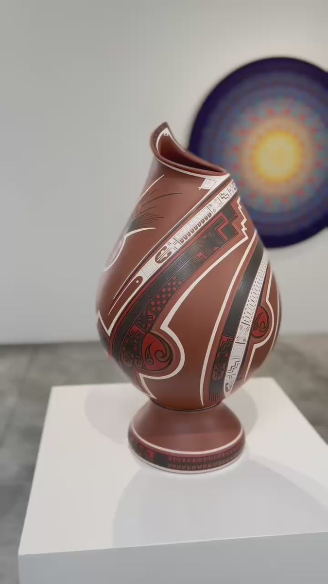 Esta vasija de Mata Ortiz, de elegante forma ascendente y 56 cm. de altura, encarna la armonía entre fuerza y movimiento. Las líneas curvas y los patrones geométricos evocan la energía del viento y el fluir del agua, símbolos esenciales en la iconografía de Paquimé. Su acabado mate y la precisión de los detalles pintados a mano reflejan la maestría técnica de los ceramistas contemporáneos del norte de México, quienes reinterpretan con sutileza el legado ancestral en un lenguaje visual moderno y equilibrado.