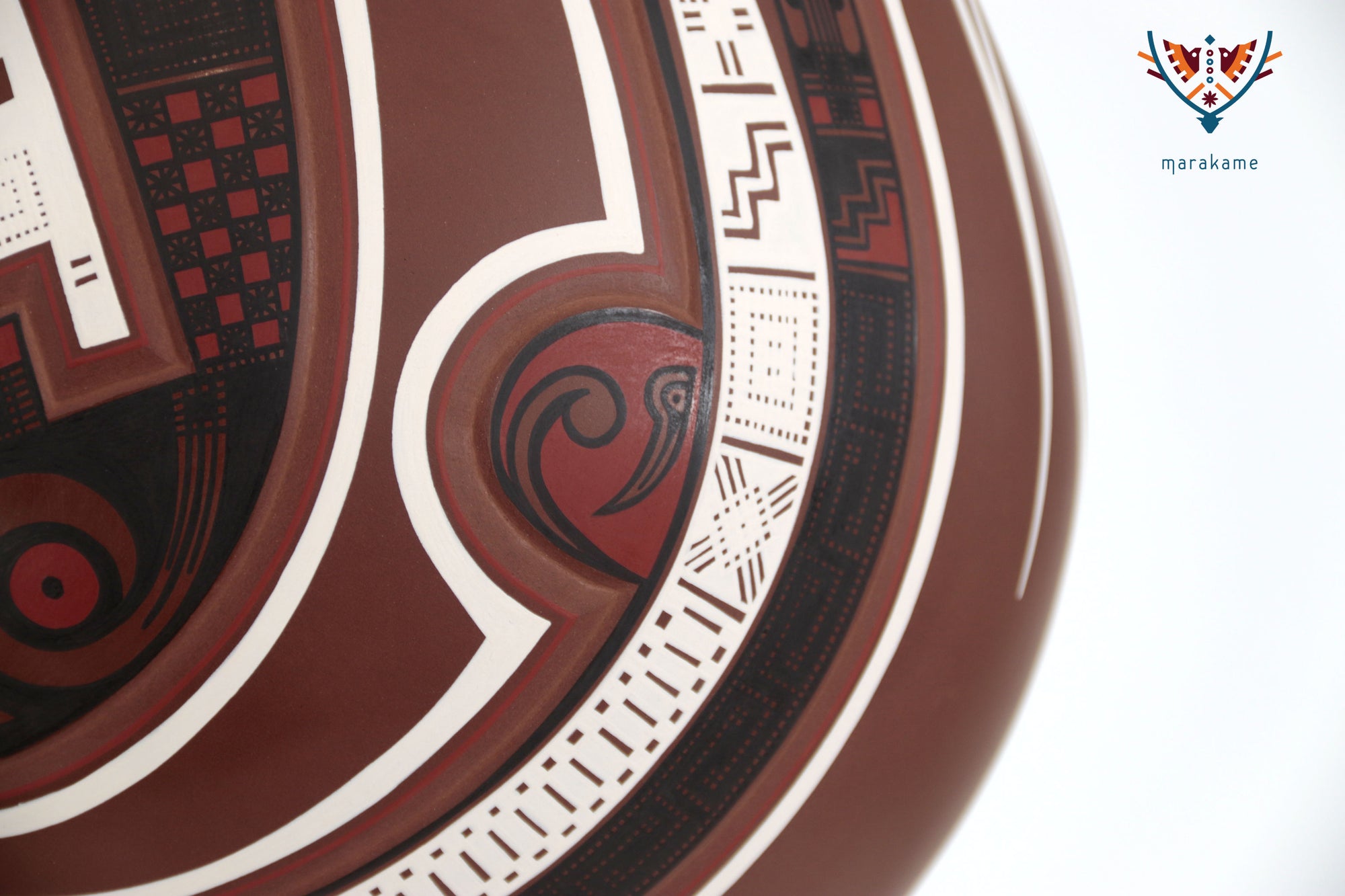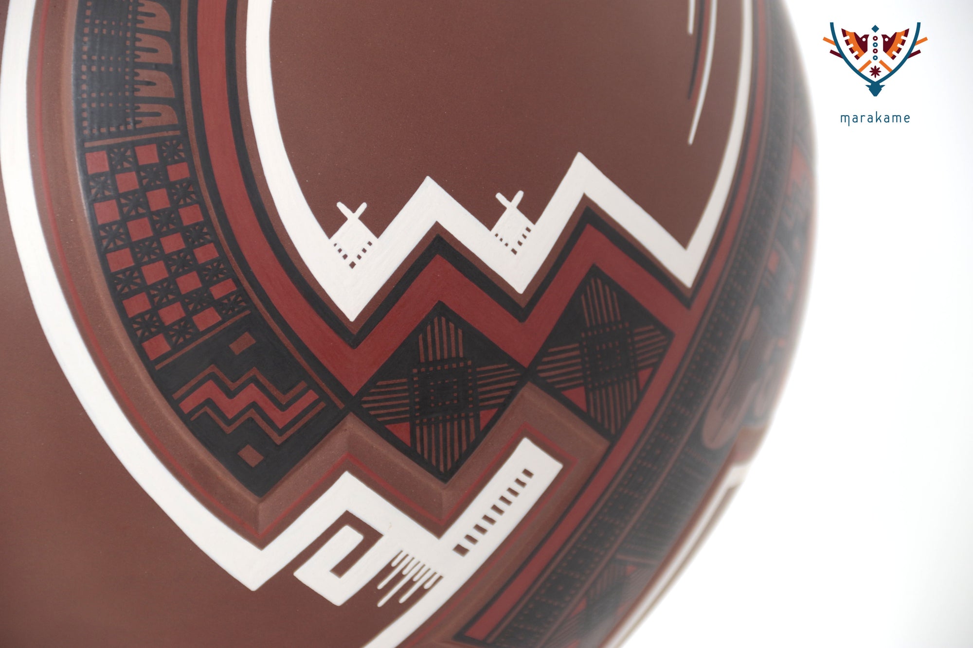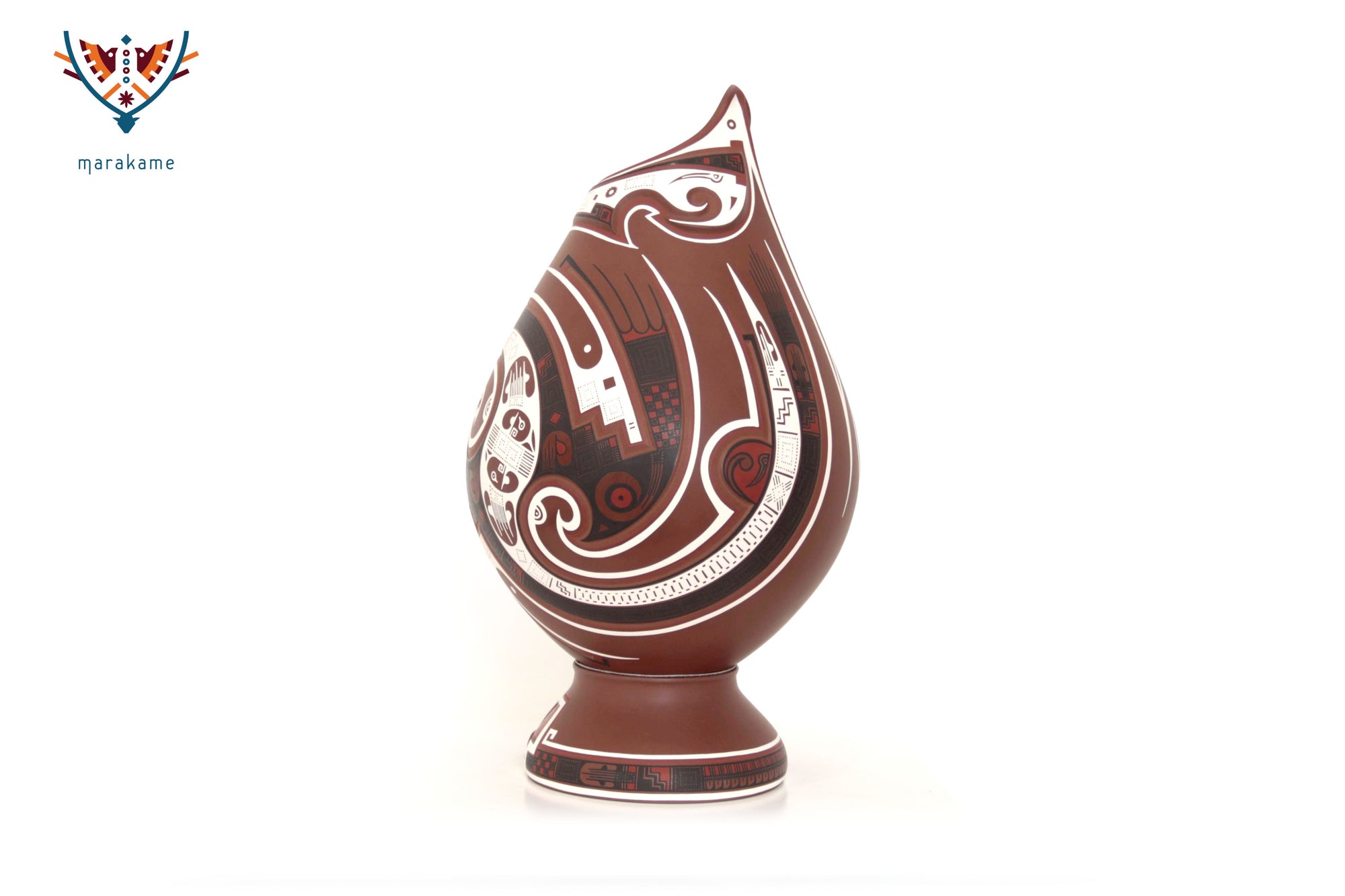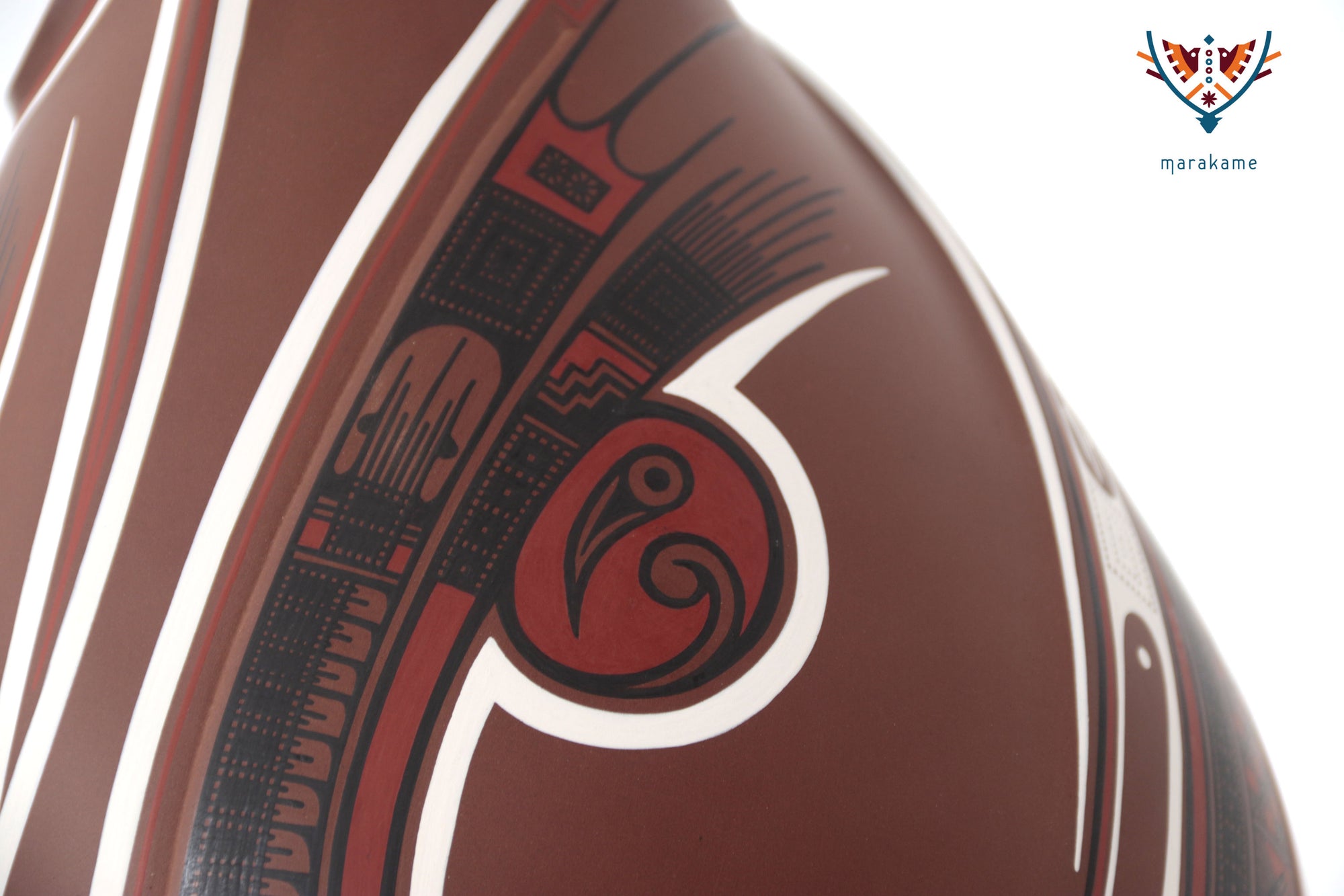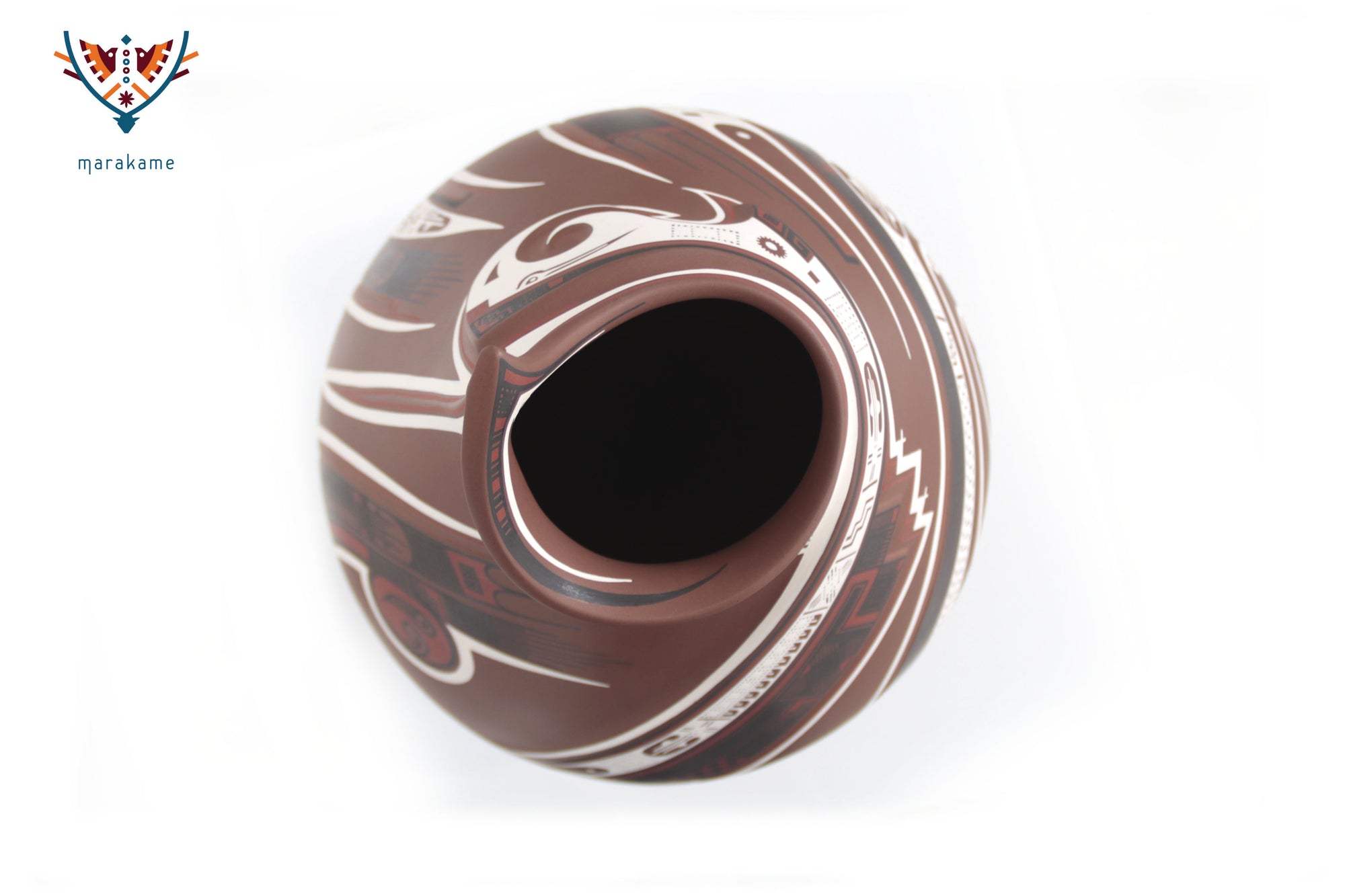 Esta vasija de Mata Ortiz, de elegante forma ascendente y 56 cm. de altura, encarna la armonía entre fuerza y movimiento. Las líneas curvas y los patrones geométricos evocan la energía del viento y el fluir del agua, símbolos esenciales en la iconografía de Paquimé. Su acabado mate y la precisión de los detalles pintados a mano reflejan la maestría técnica de los ceramistas contemporáneos del norte de México, quienes reinterpretan con sutileza el legado ancestral en un lenguaje visual moderno y equilibrado.