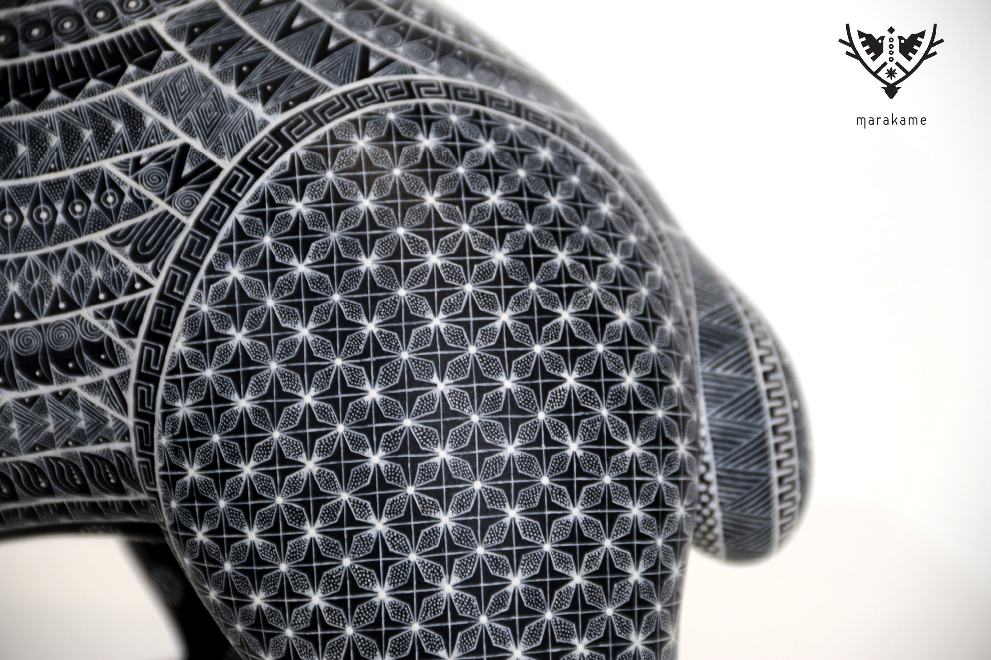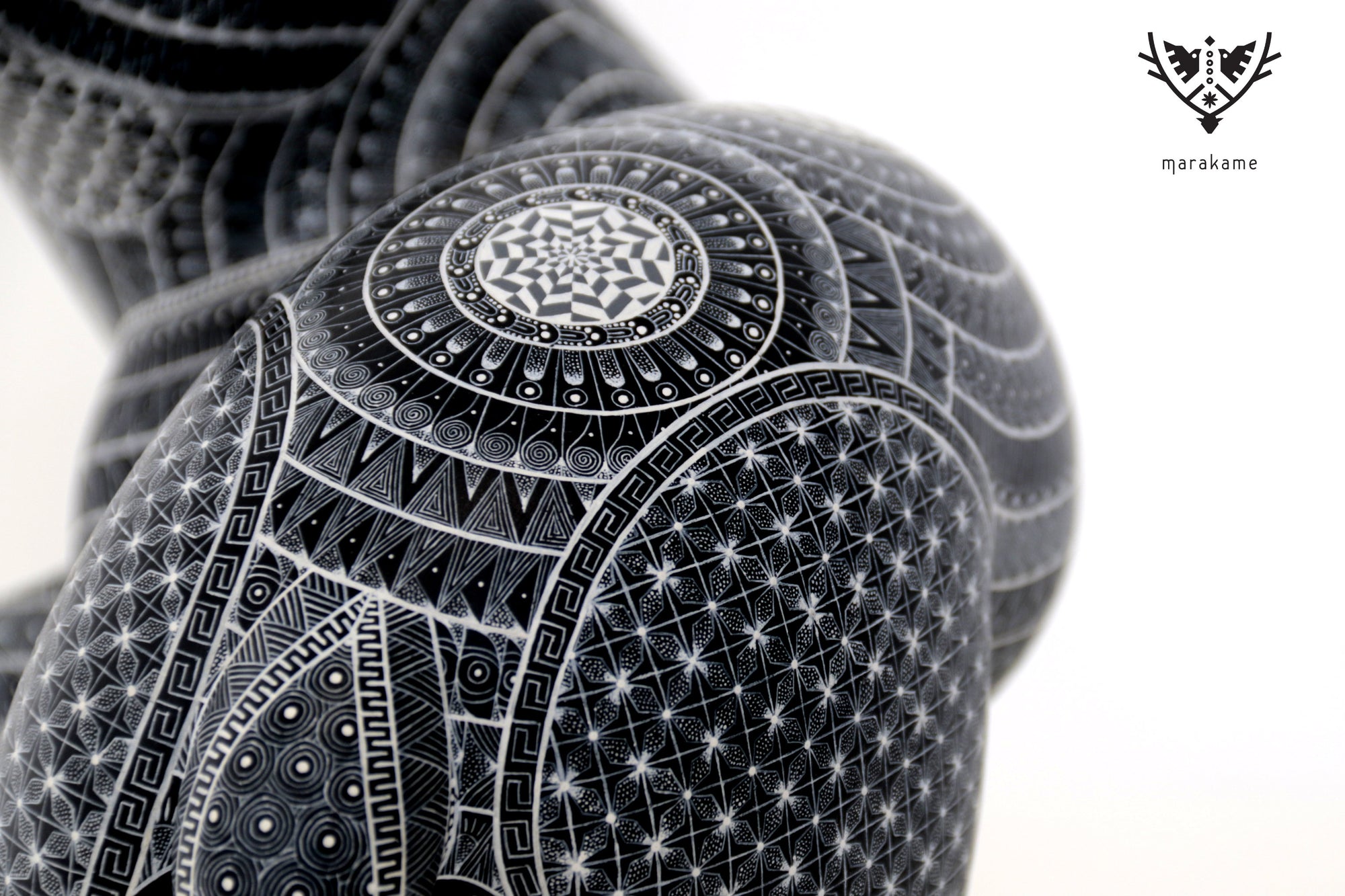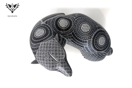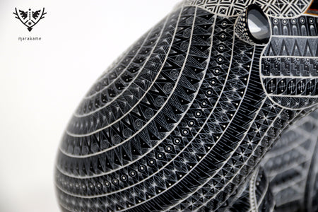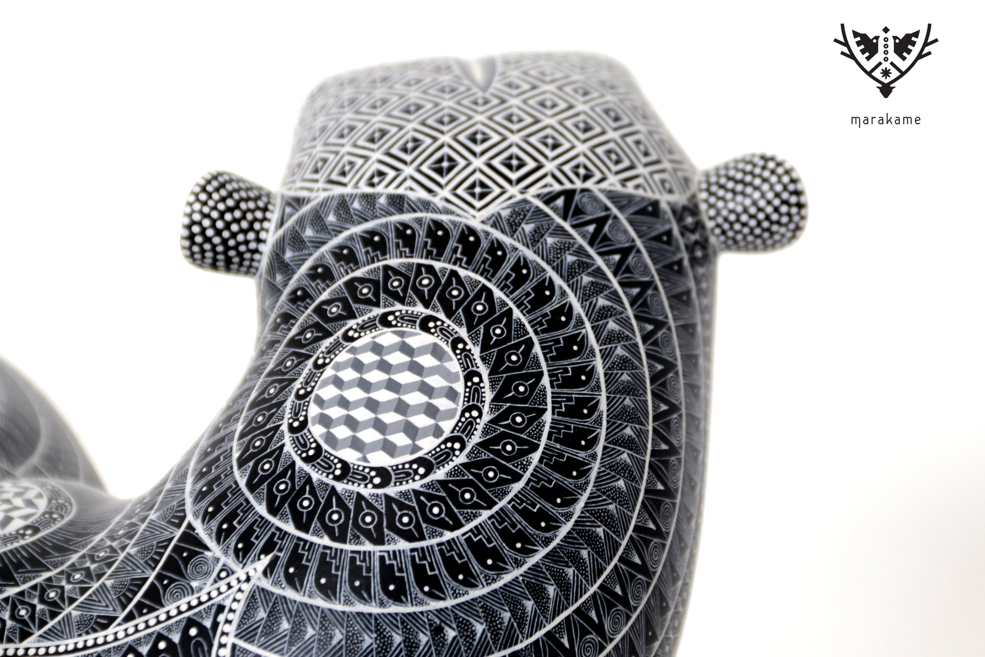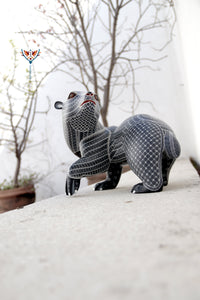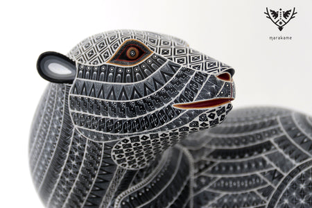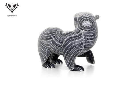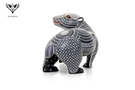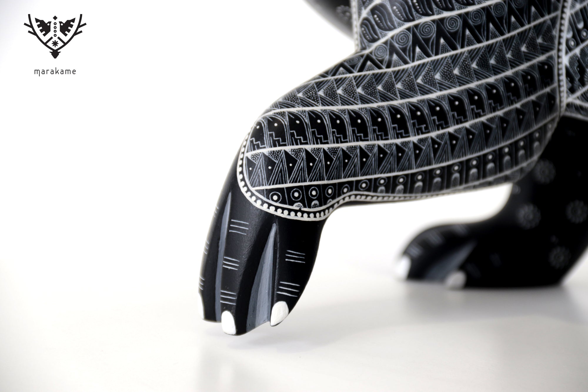 Este alebrije representa al oso como símbolo de fuerza interior, protección y sabiduría ancestral. Su cuerpo robusto y firme expresa arraigo al territorio, mientras que los patrones geométricos en blanco y negro trazados a mano evocan la memoria del tiempo, los ciclos de la naturaleza y el orden del universo.