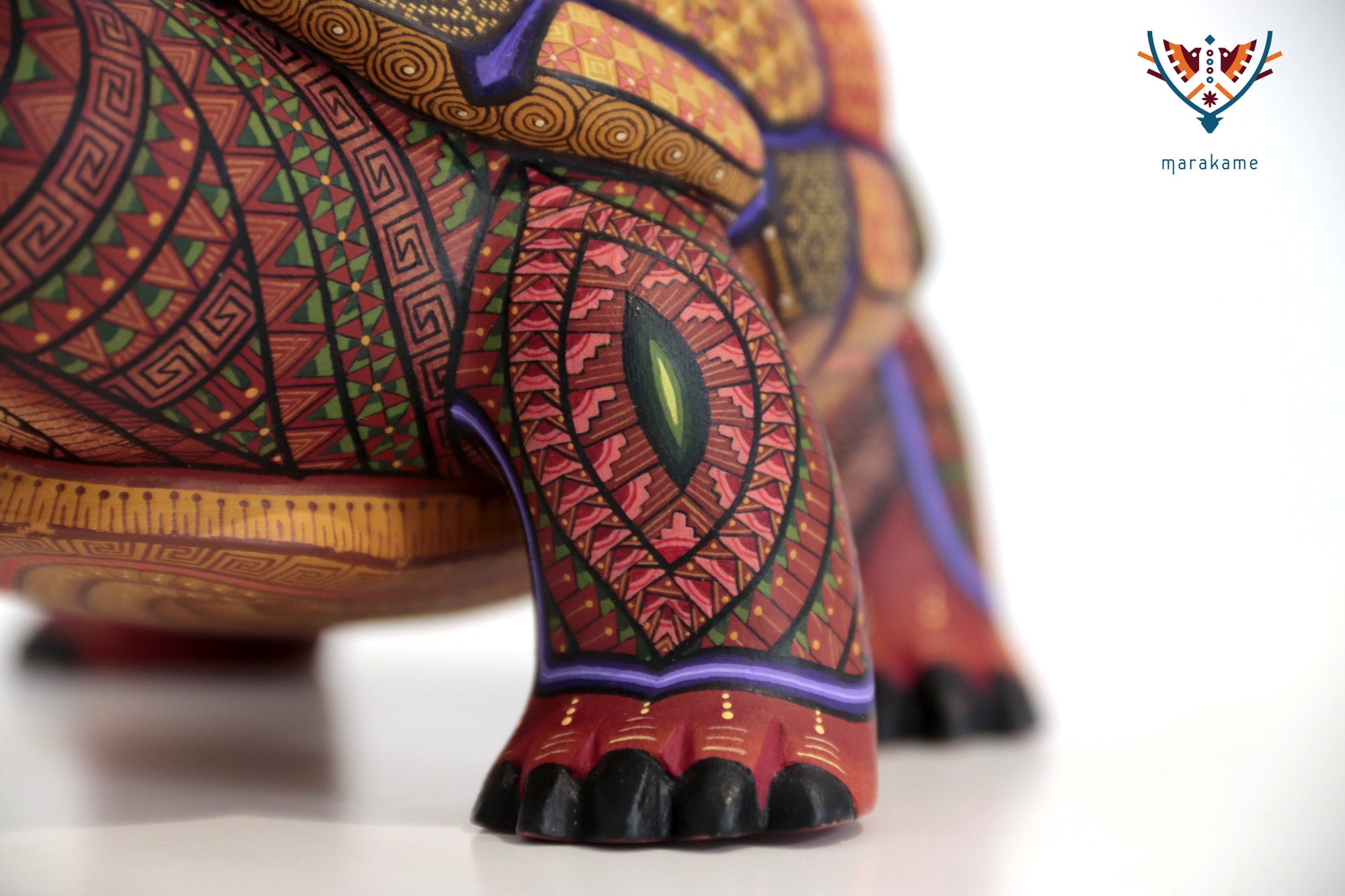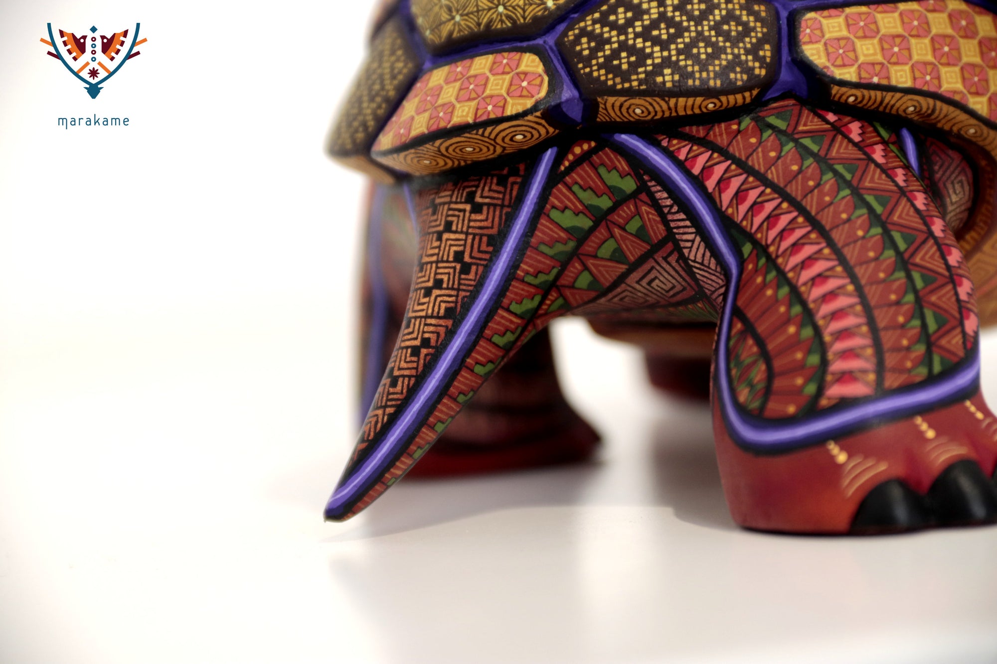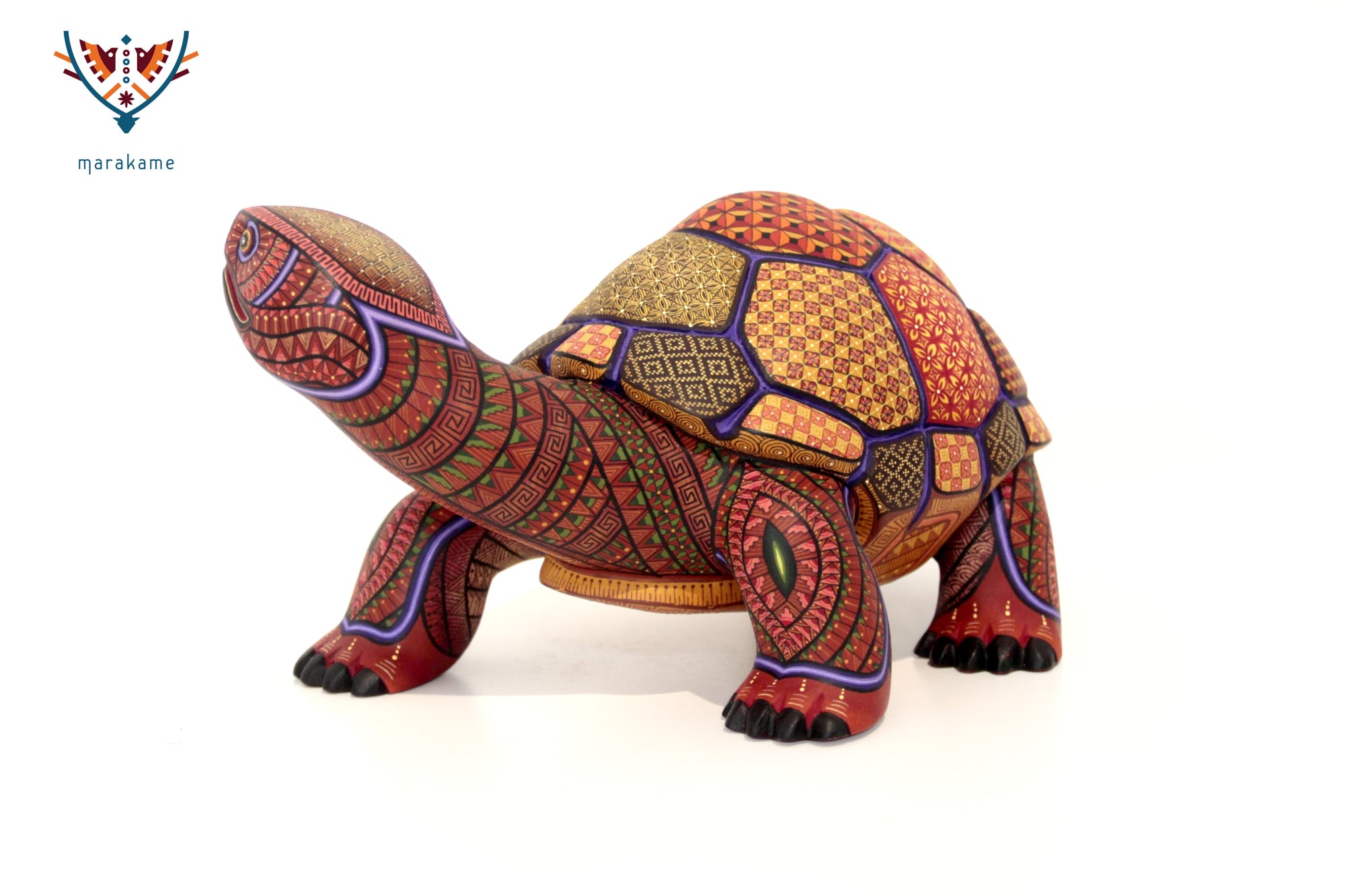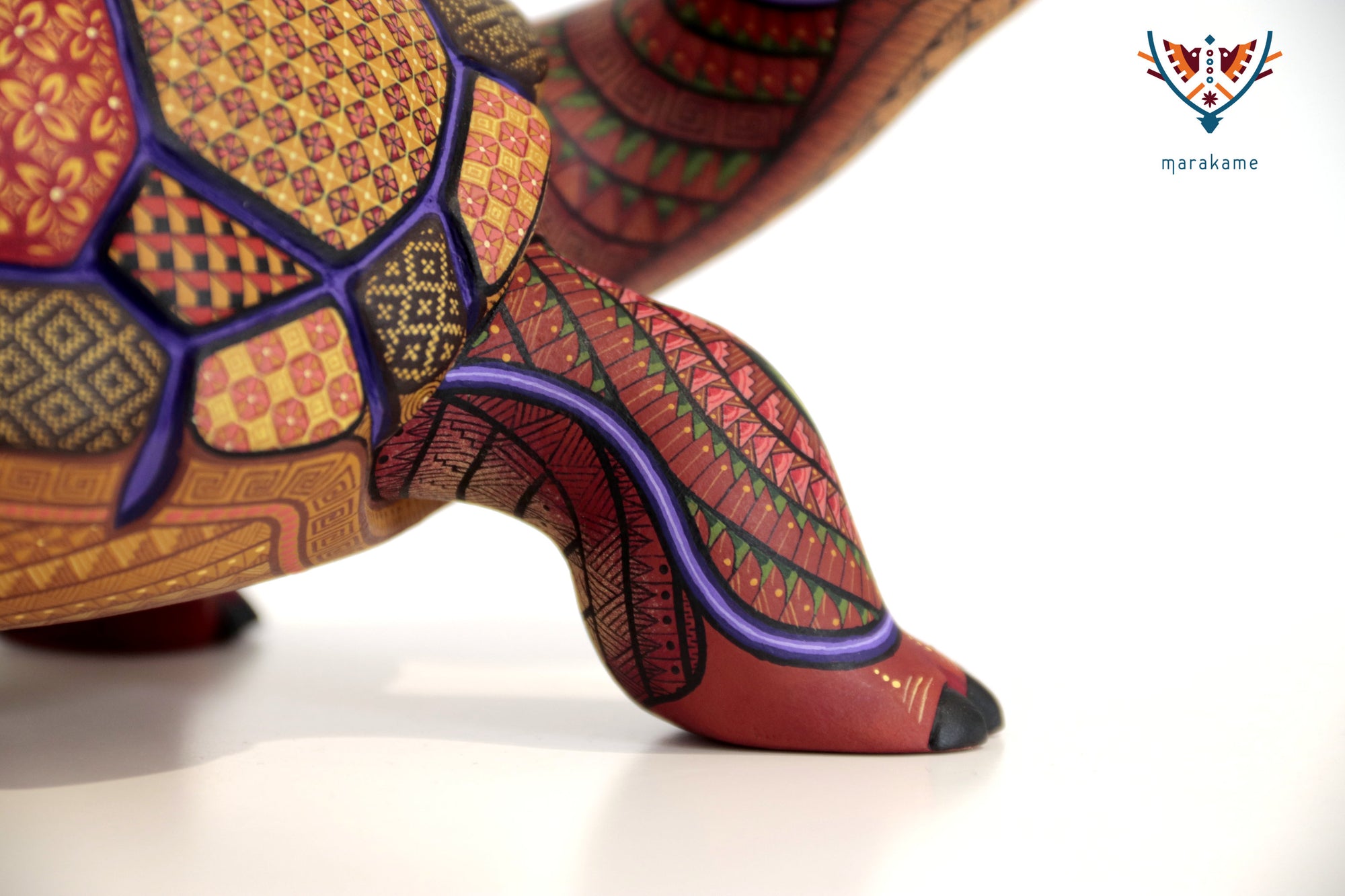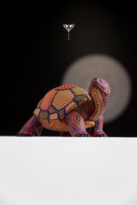 Alebrije artesanal que representa a la tortuga, símbolo ancestral de sabiduría, paciencia y permanencia. Tallada y pintada a mano, esta pieza destaca por su rica paleta en tonos rojos, ocres y dorados, decorada con complejos patrones geométricos que evocan el maíz, la tierra y el pulso del tiempo. Su caparazón, dividido en formas precisas y rítmicas, convierte a esta tortuga en una escultura poderosa y serena, ideal como pieza central de colección o decoración.