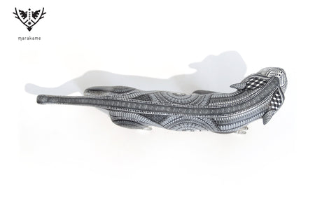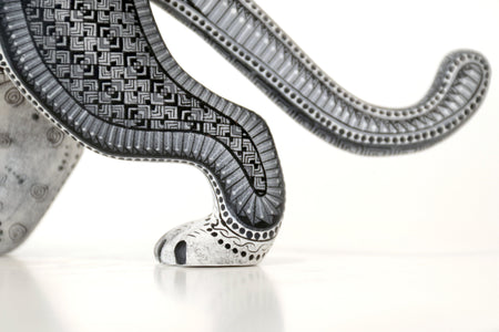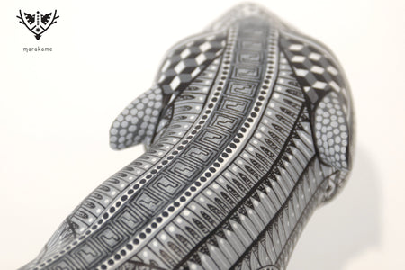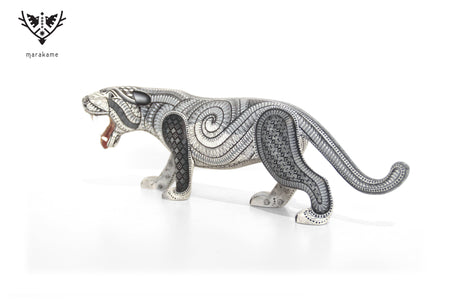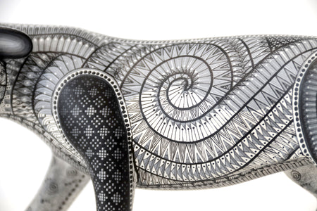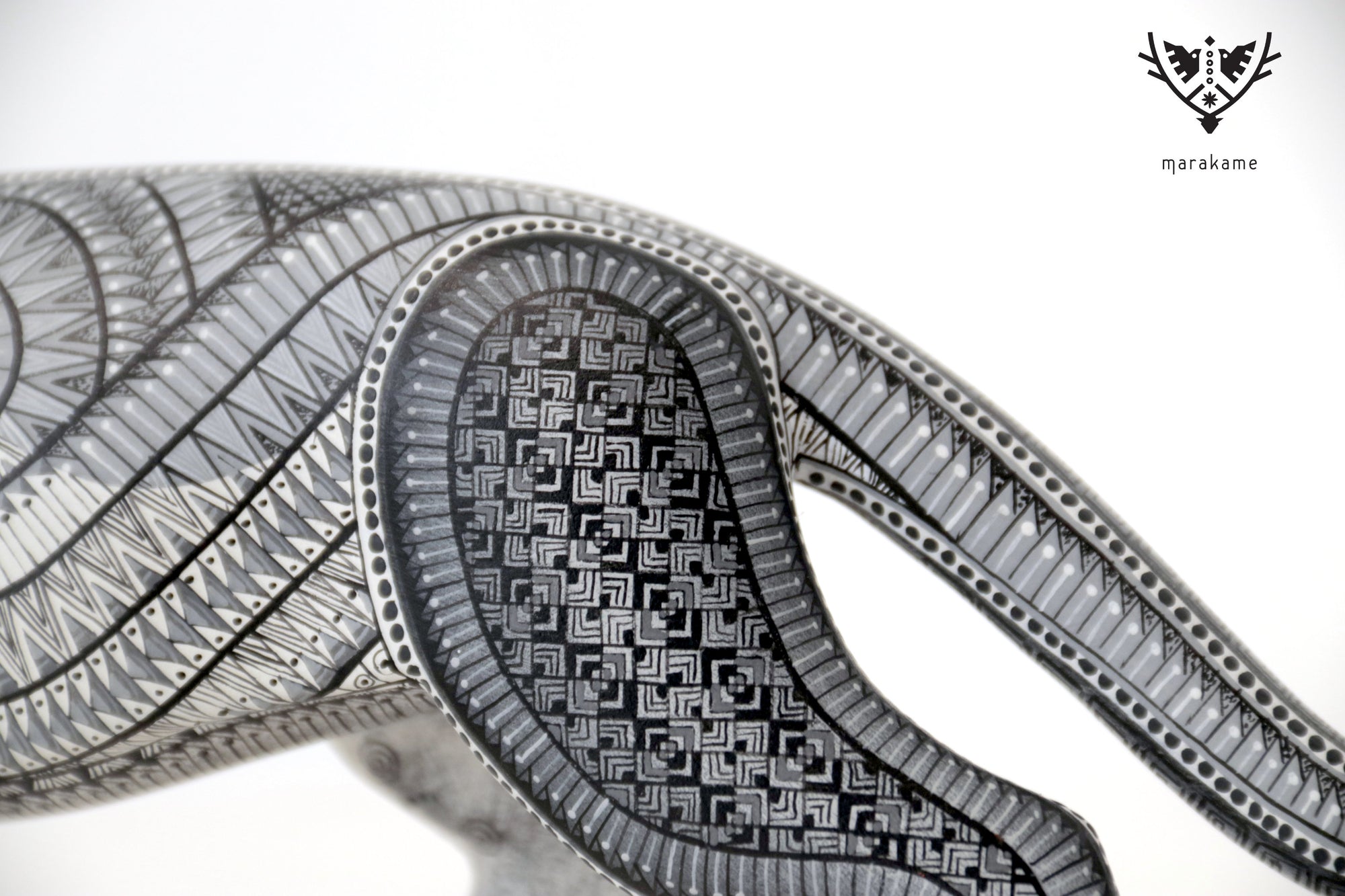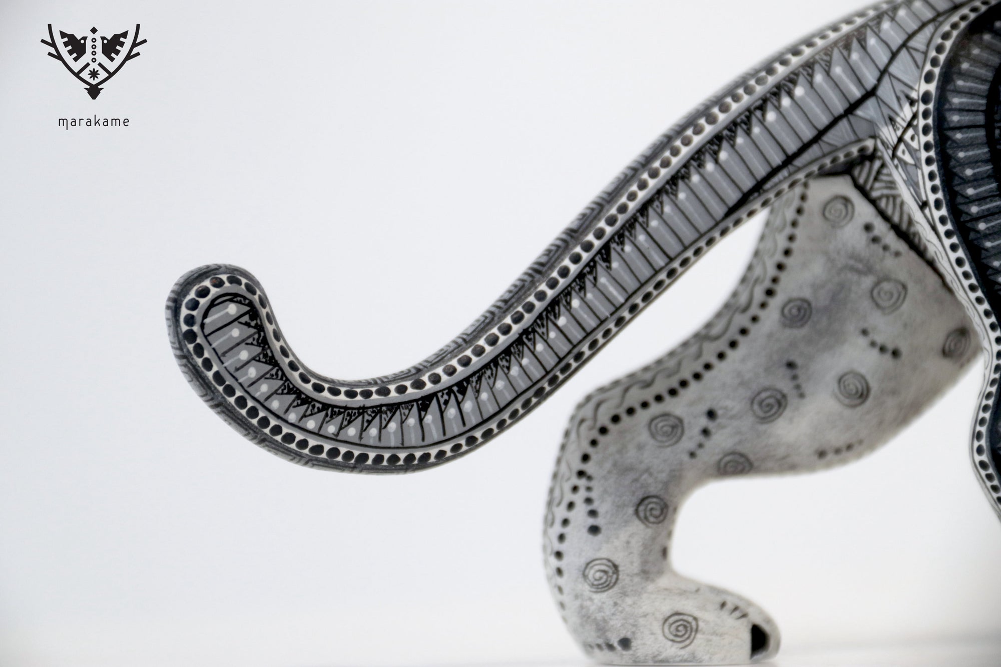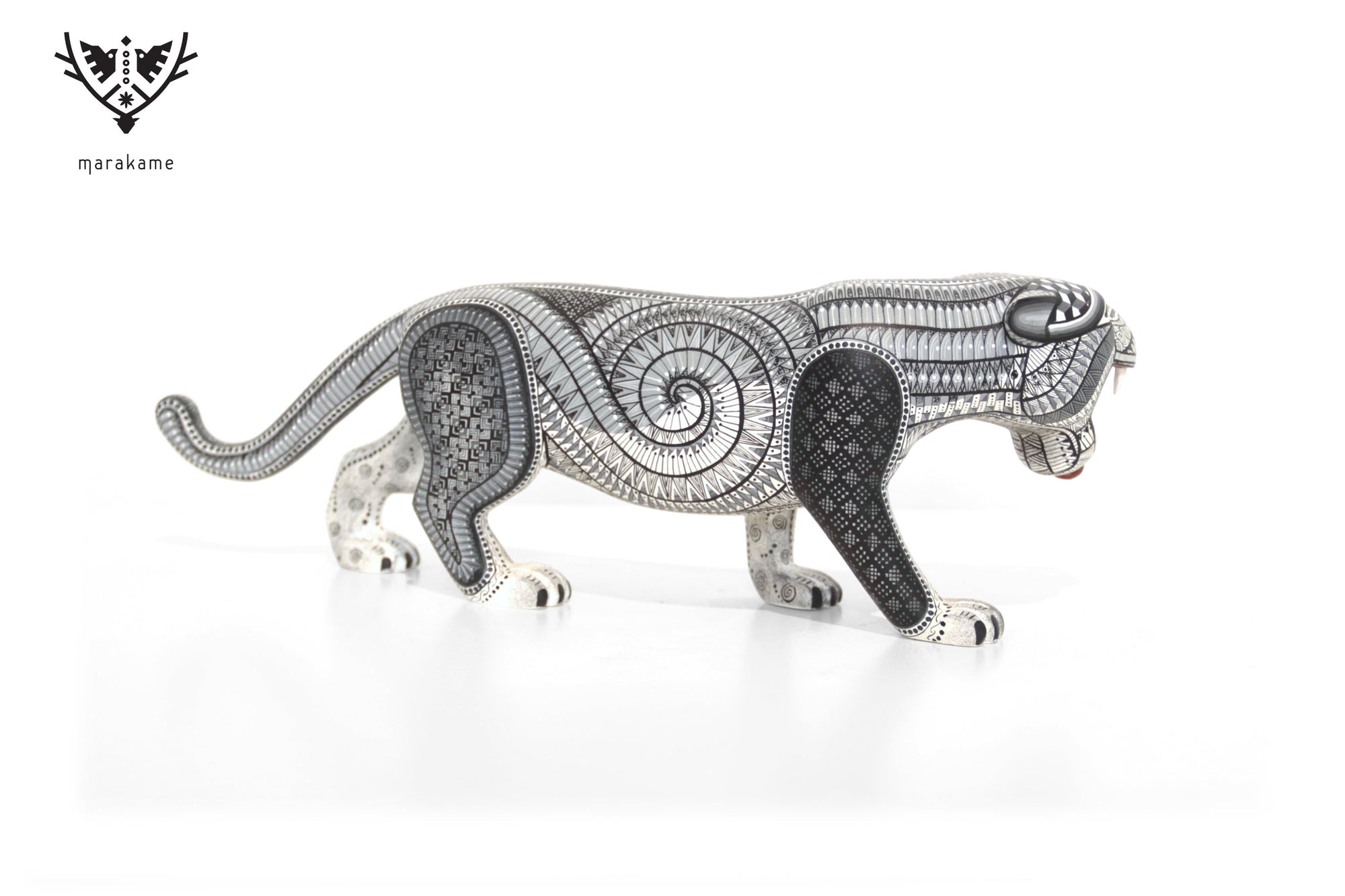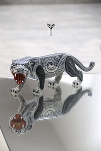 Este jaguar tallado en madera y decorado a mano en una paleta monocromática de blancos, grises y negros refleja una fuerza serena y ancestral. Los patrones meticulosos —espirales, grecas y símbolos que evocan movimiento y energía— recorren su cuerpo como un mapa ritual.