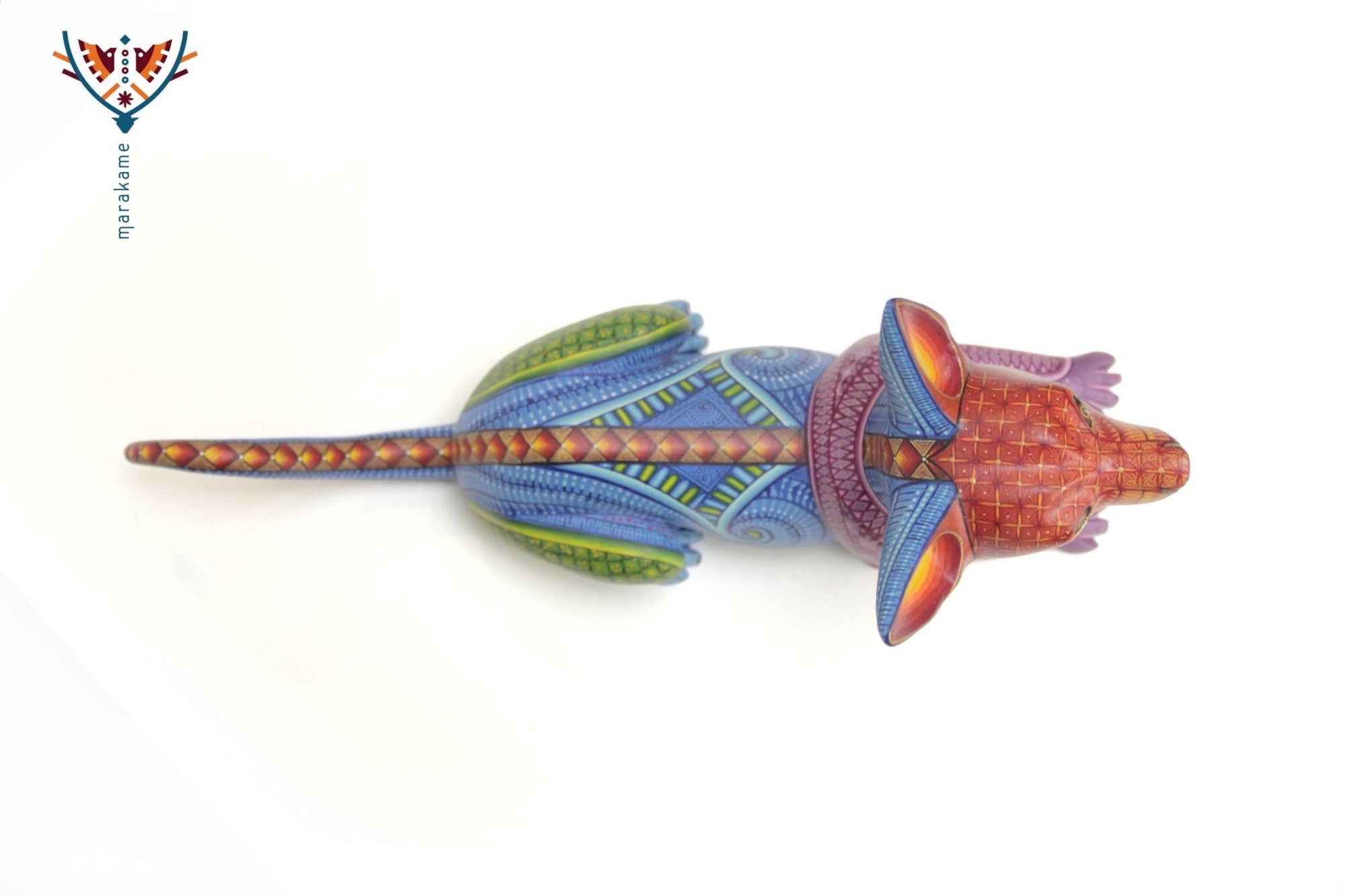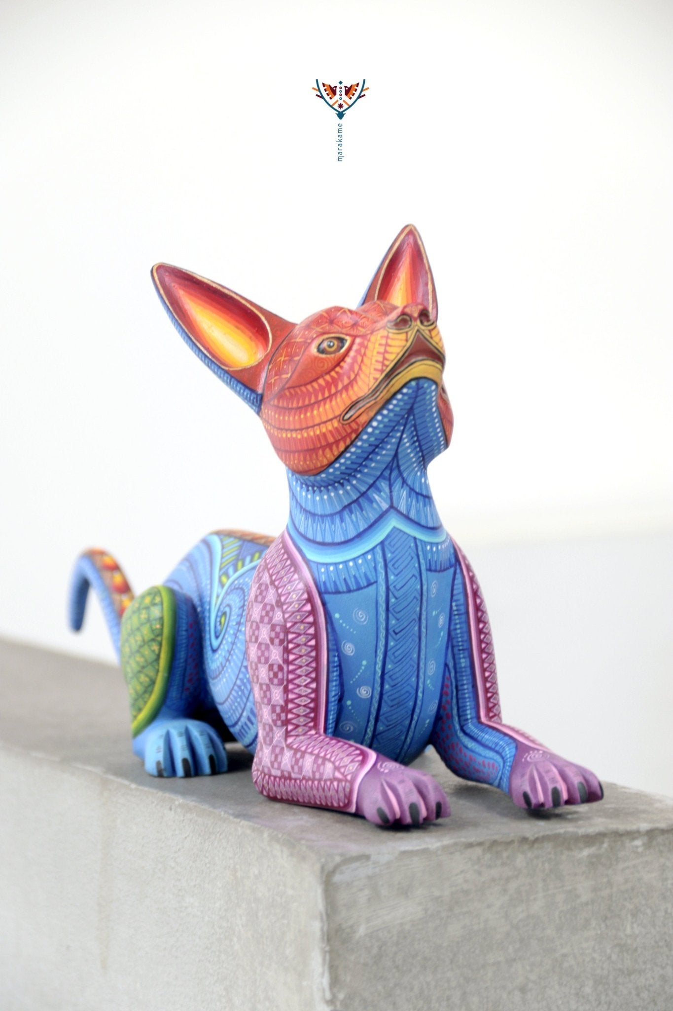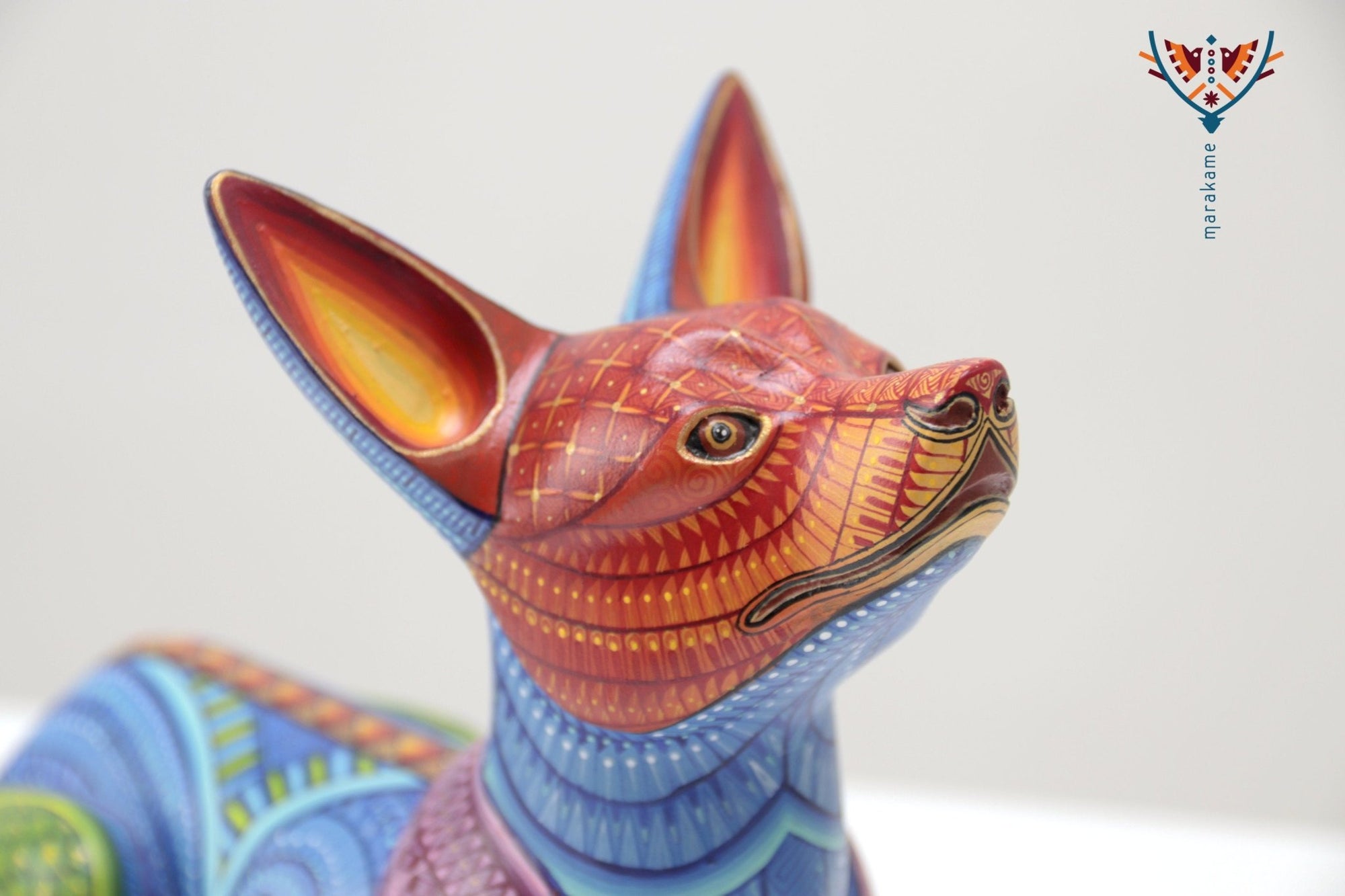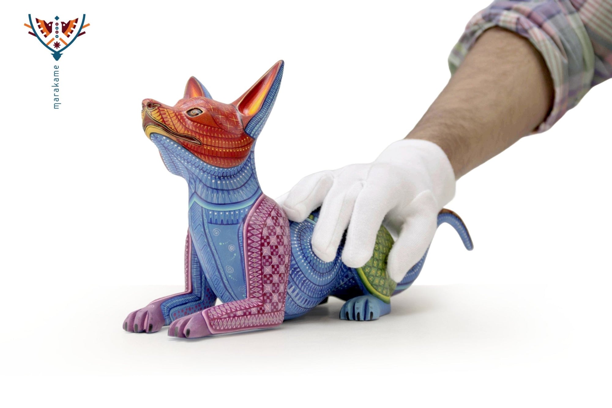 Esta selección especial de Alebrije oaxaqueño comisionada por Marakame a los mejores autores de alebrije moderno, es pintado a mano sobre talla en madera del árbol de copal (Bursera, spp), el cual crece a los alrededores de las comunidades de San Martín Tilcajete y San Antonio Arrazola, localidades de la región Zapoteca del Estado de Oaxaca, en el Sur de México. También se utiliza de forma común la talla en madera de cedro por las características de esta madera.