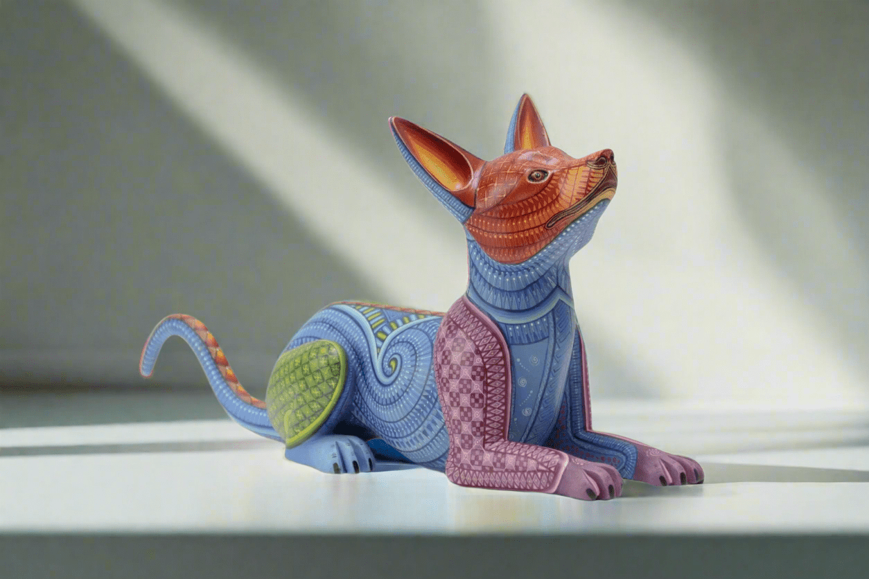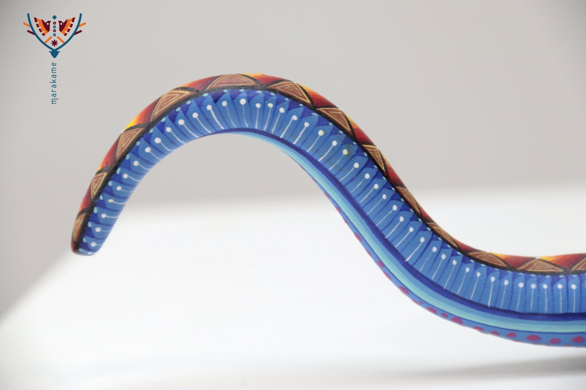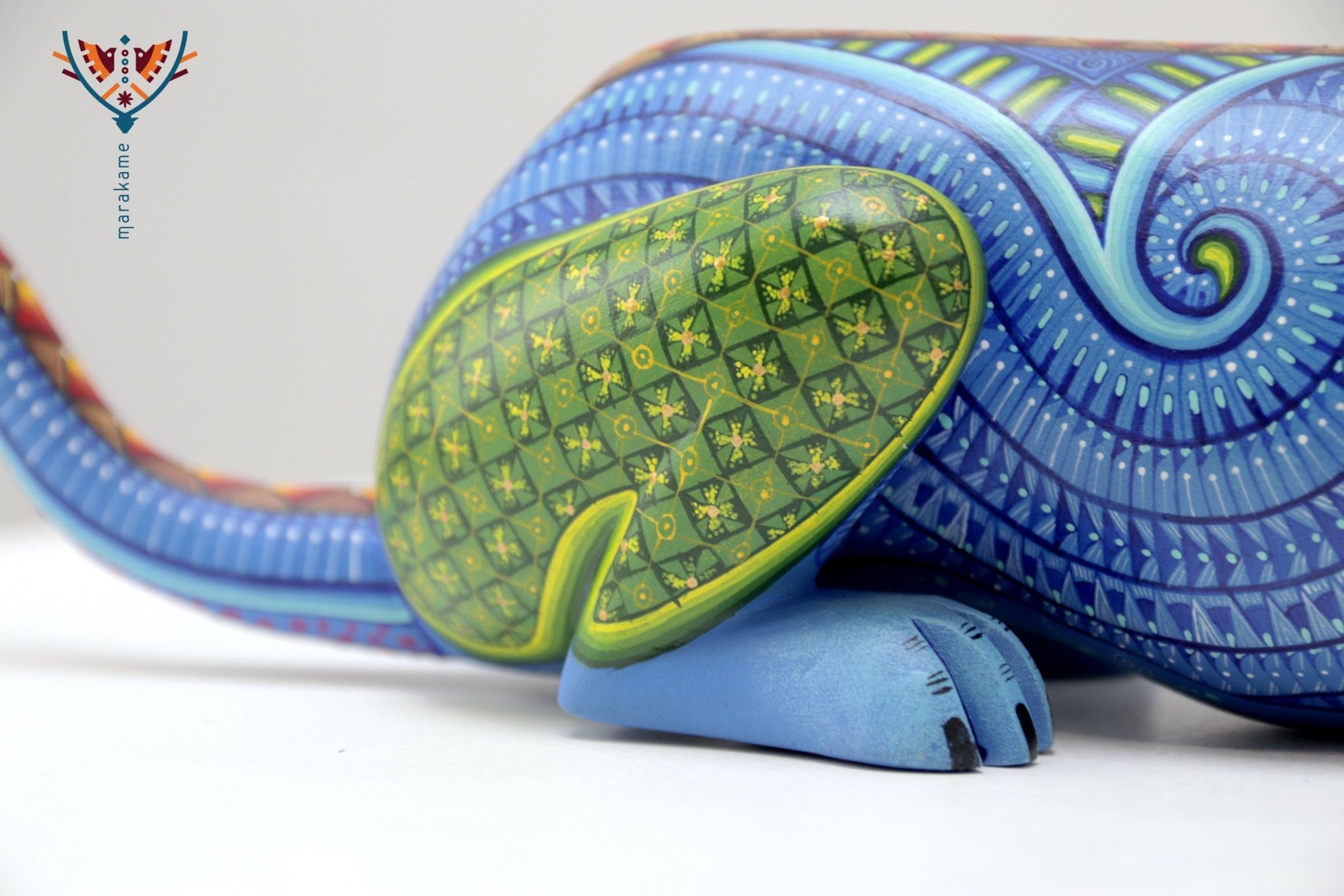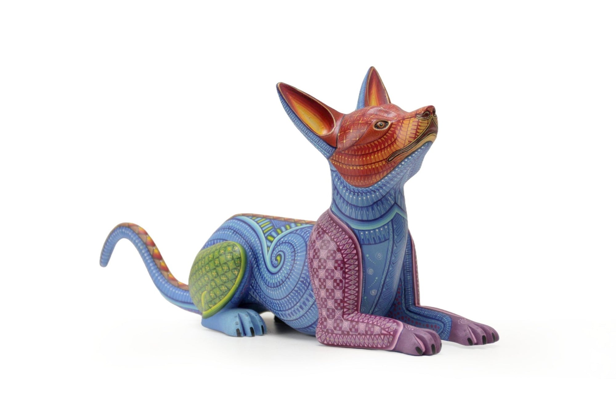 Esta selección especial de Alebrije oaxaqueño comisionada por Marakame a los mejores autores de alebrije moderno, es pintado a mano sobre talla en madera del árbol de copal (Bursera, spp), el cual crece a los alrededores de las comunidades de San Martín Tilcajete y San Antonio Arrazola, localidades de la región Zapoteca del Estado de Oaxaca, en el Sur de México. También se utiliza de forma común la talla en madera de cedro por las características de esta madera.