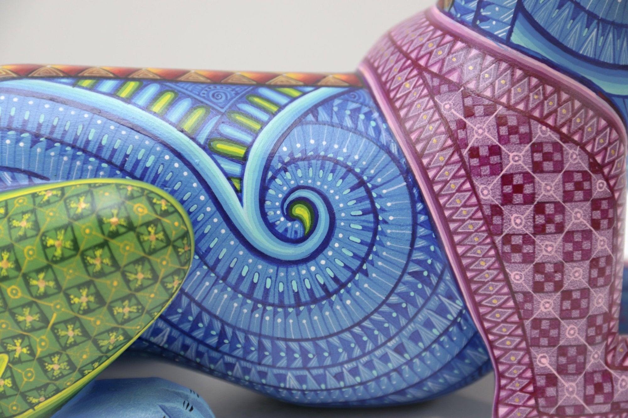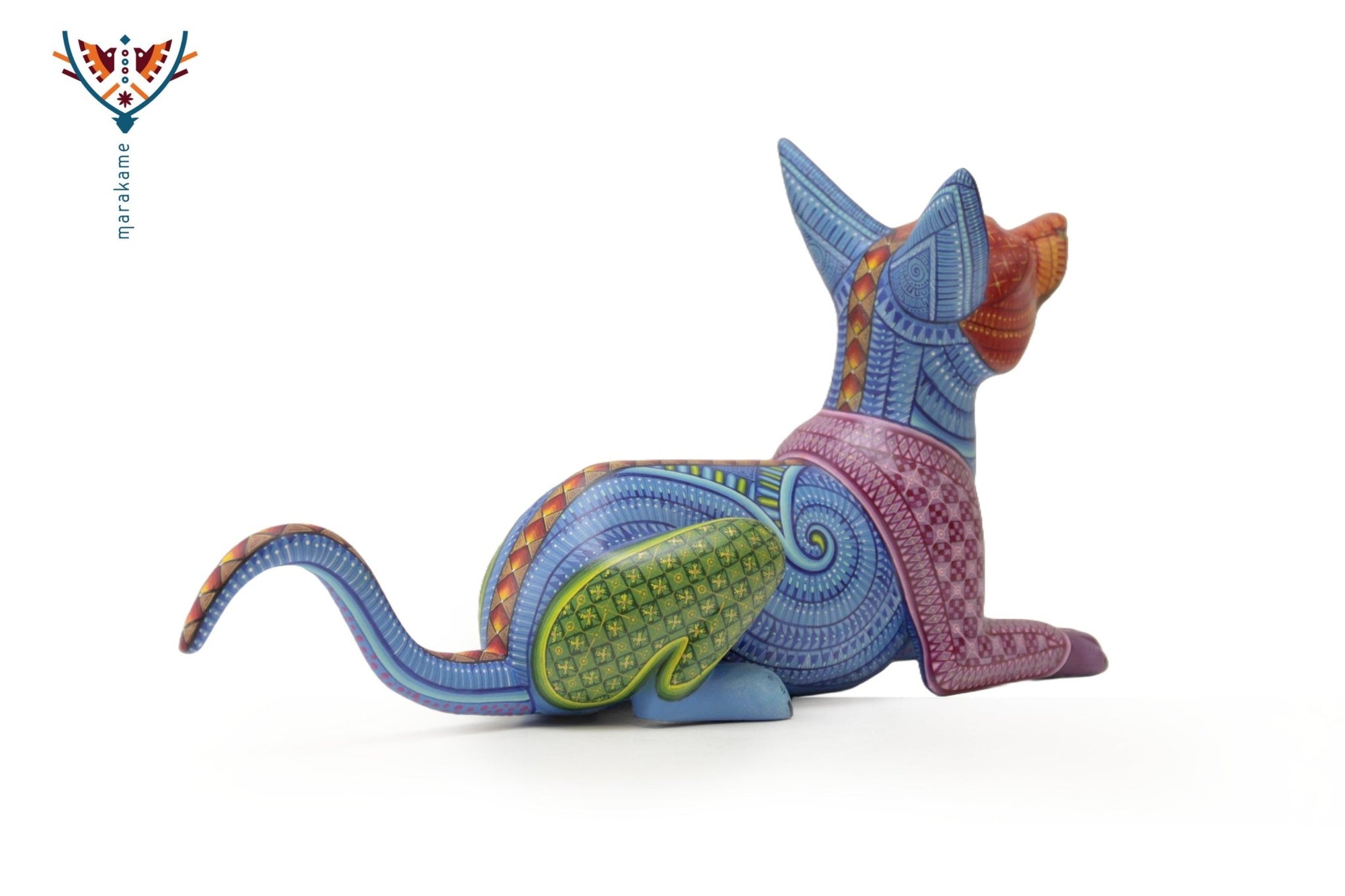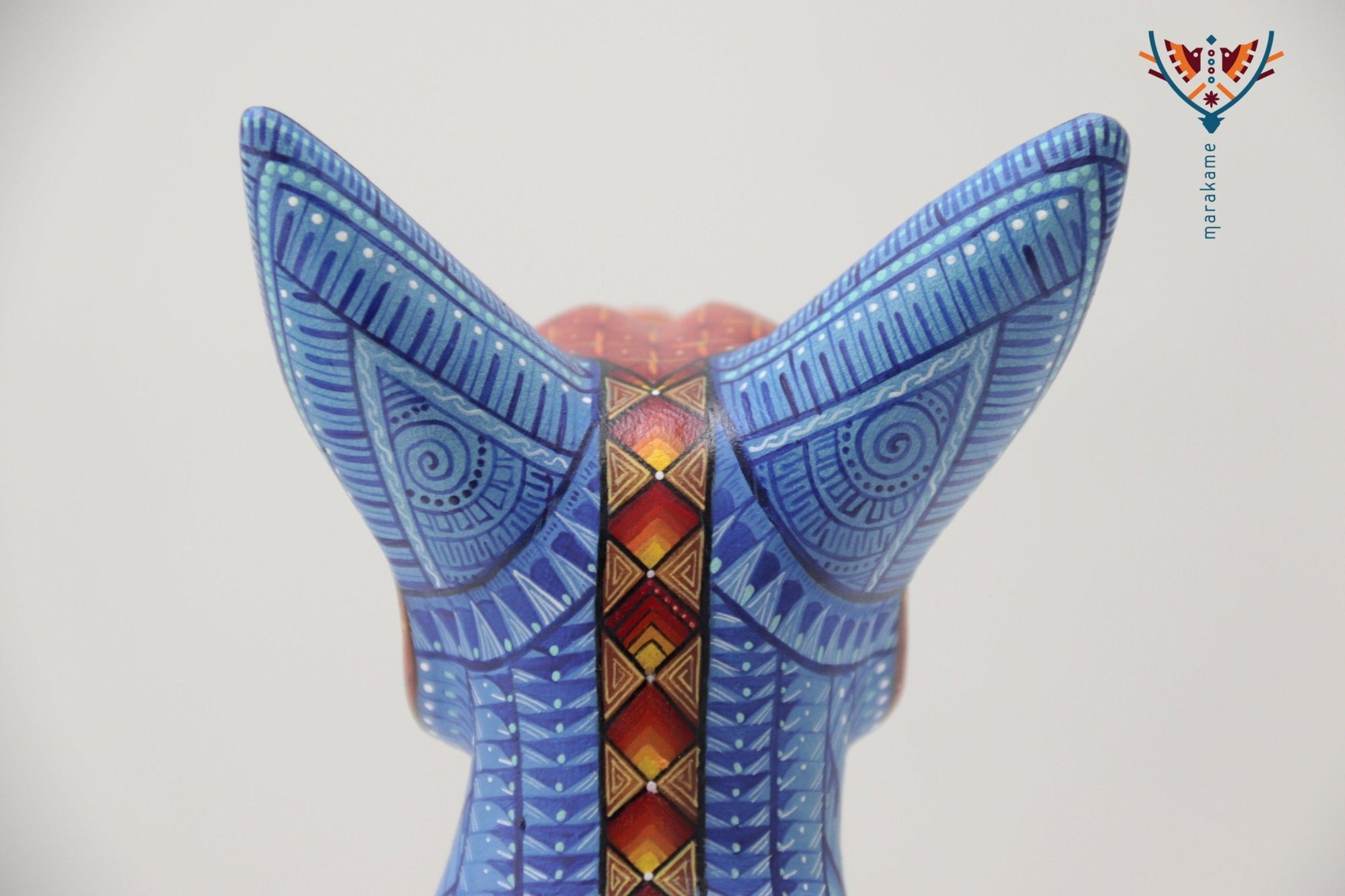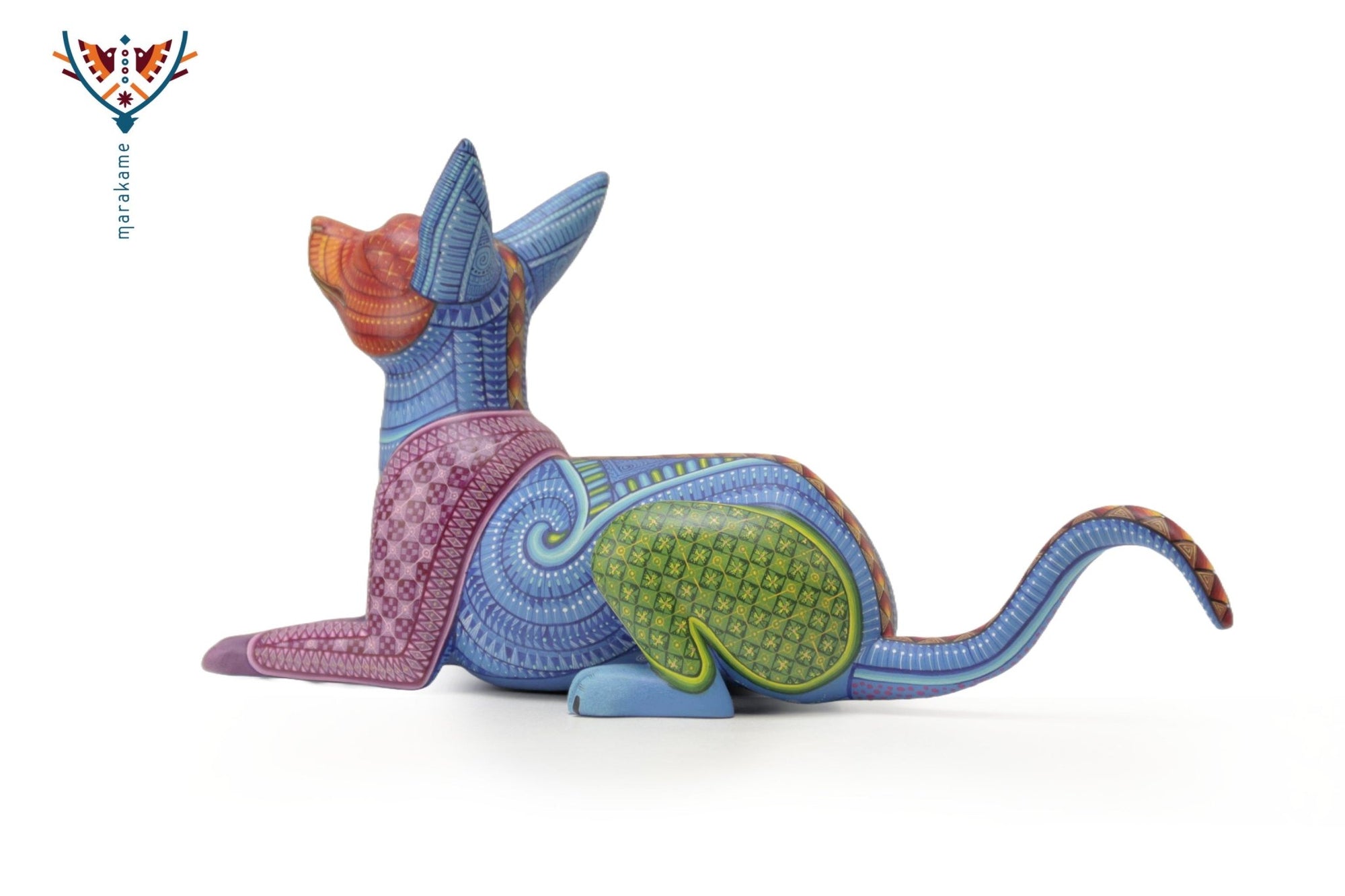 En este pequeño alebrije, un Xoloitzcuintle estirándose revela su elegancia y gracia. El azul brillante cubre la mayoría de su cuerpo, mientras que las patas y la frente se destacan con un toques morados y naranjas vibrantes.