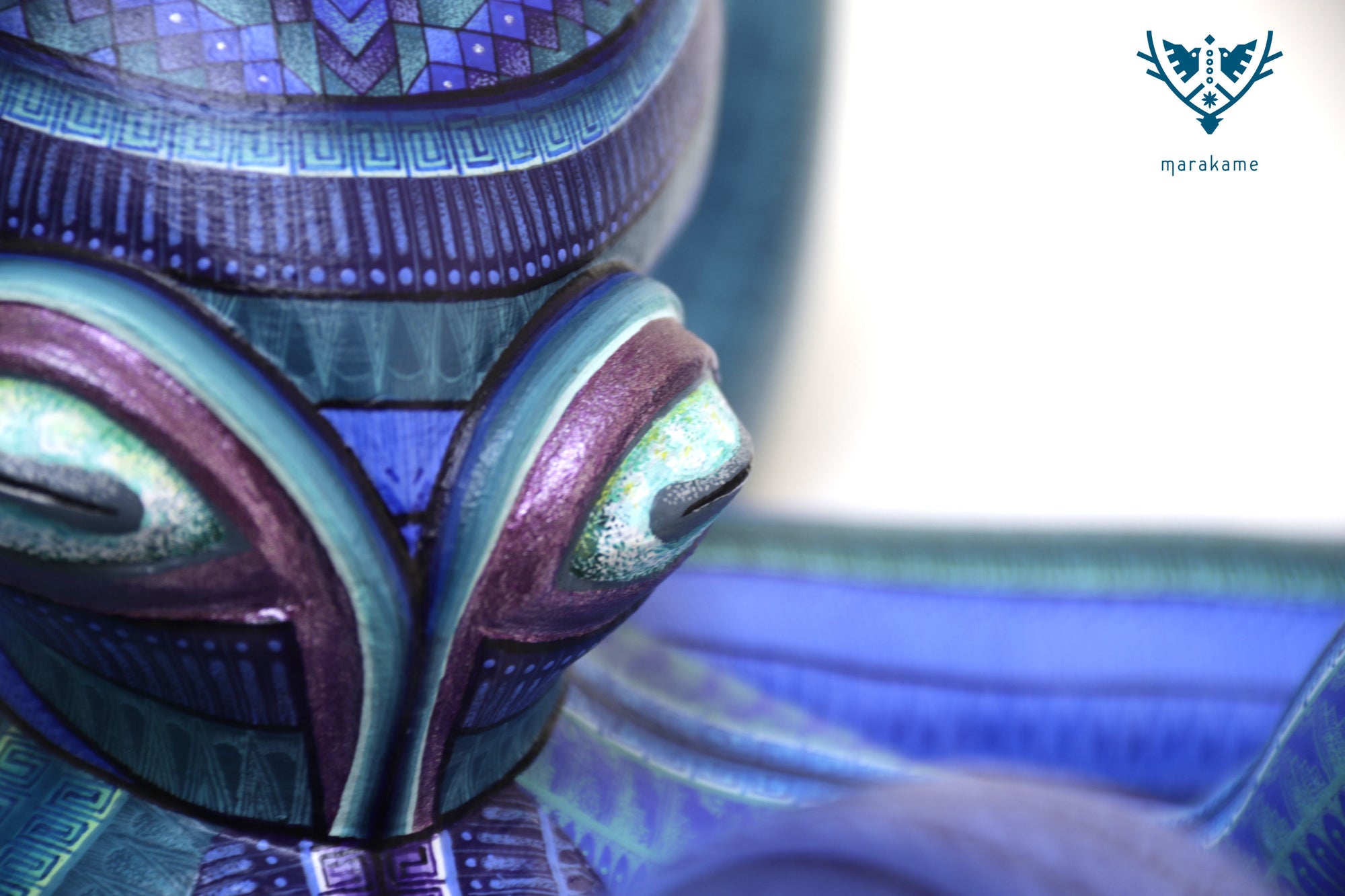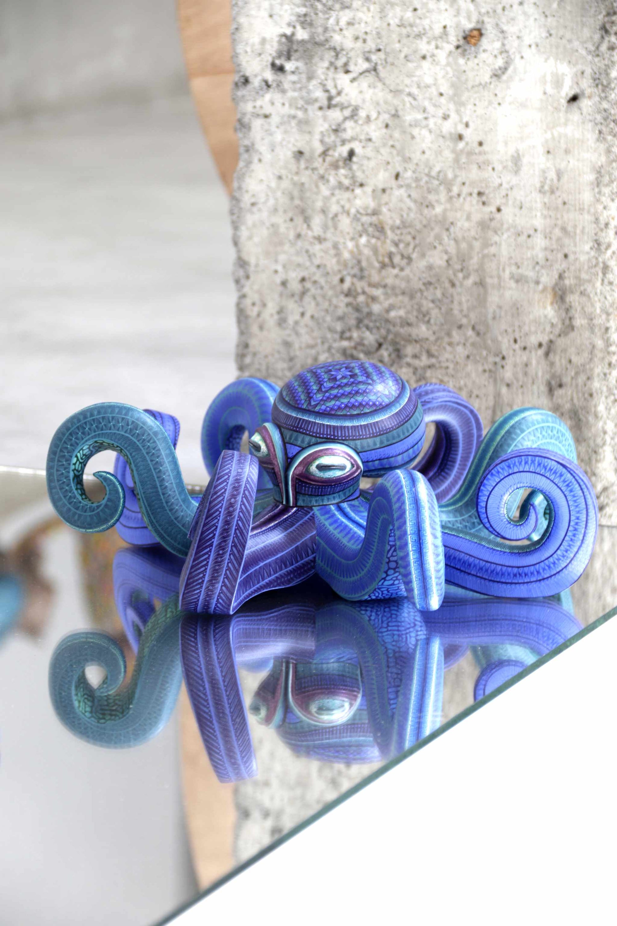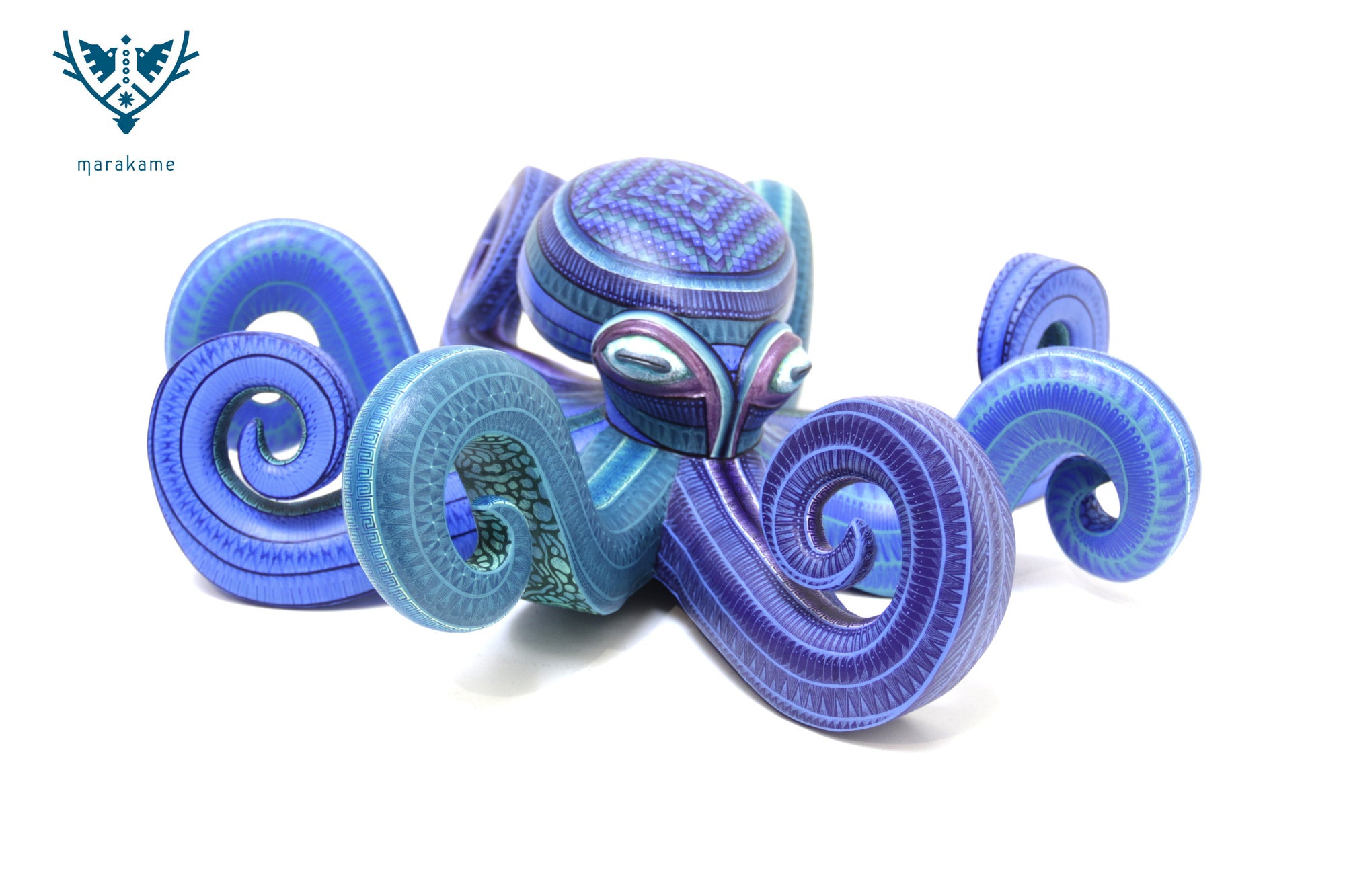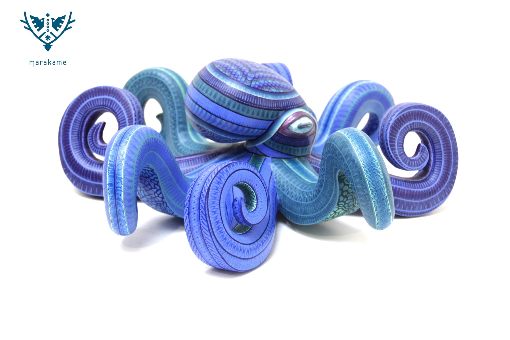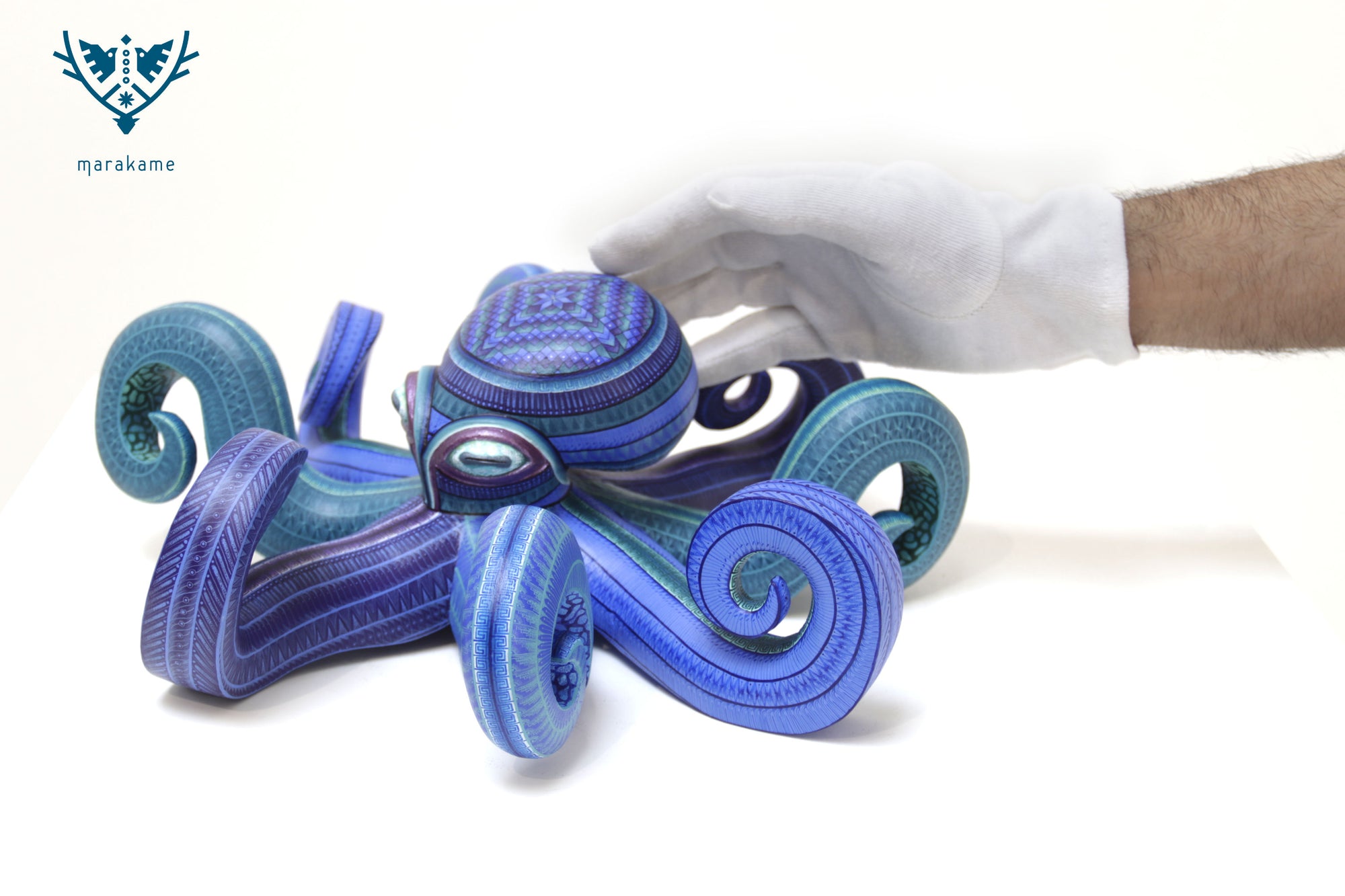 Esta impresionante escultura de pulpo ha sido tallada y pintada a mano con exquisita precisión, fusionando tonos azules y violetas que evocan el misterio de las profundidades marinas. Sus tentáculos dinámicamente curvados y su patrón geométrico detallado revelan la maestría artesanal de Oaxaca. Ideal como pieza central decorativa, esta obra es una muestra del arte popular contemporáneo llevado a un nivel excepcional.