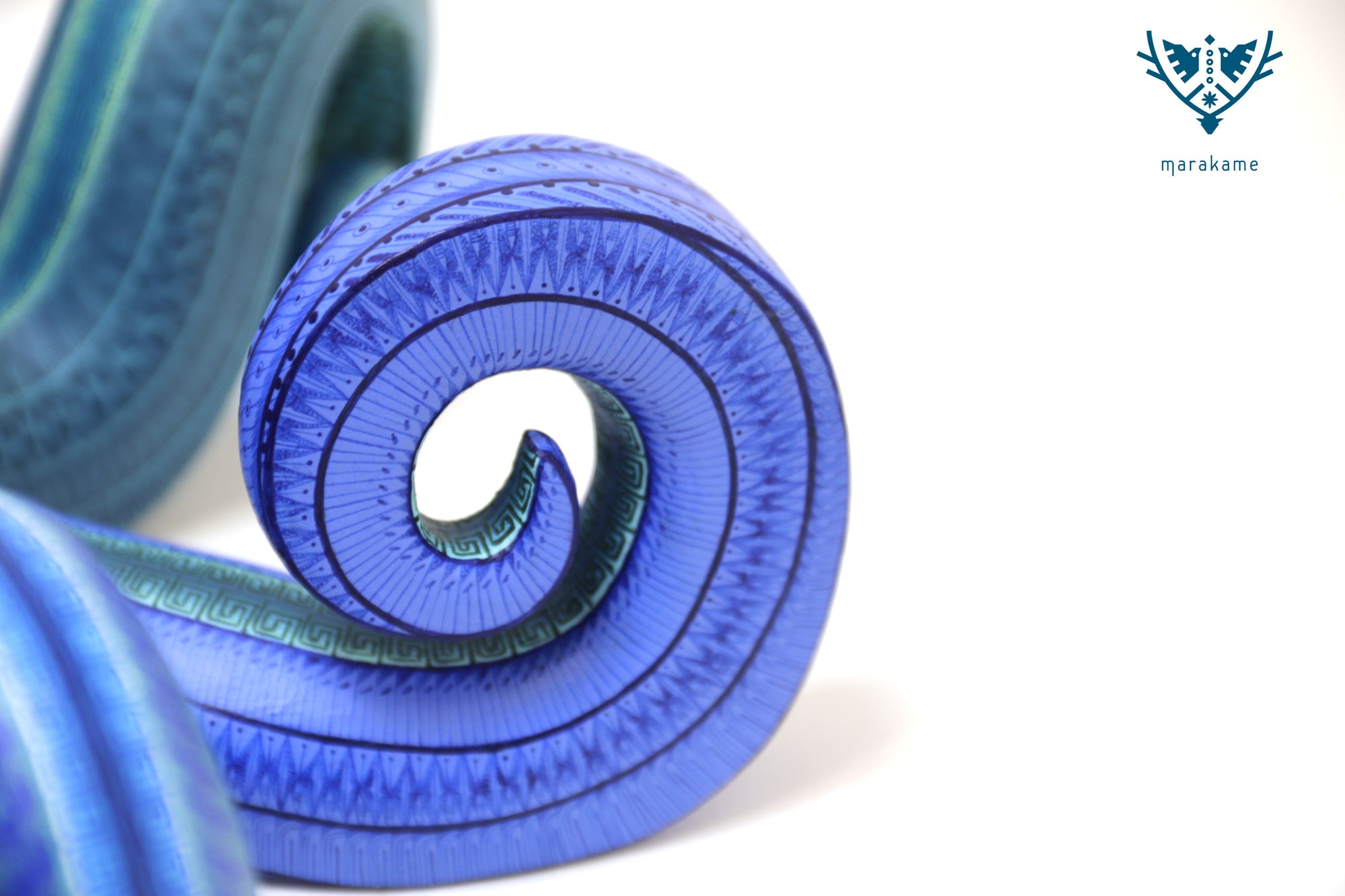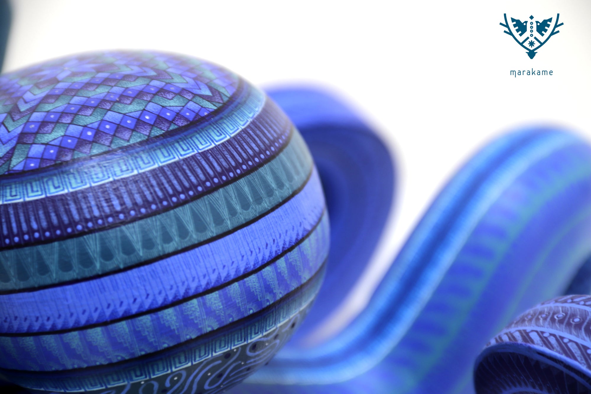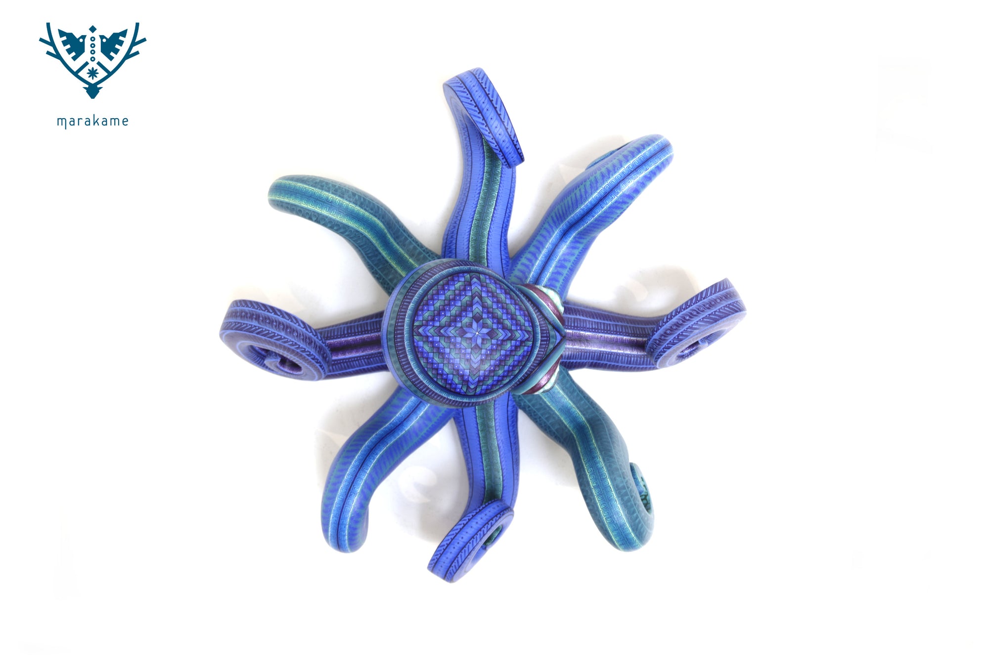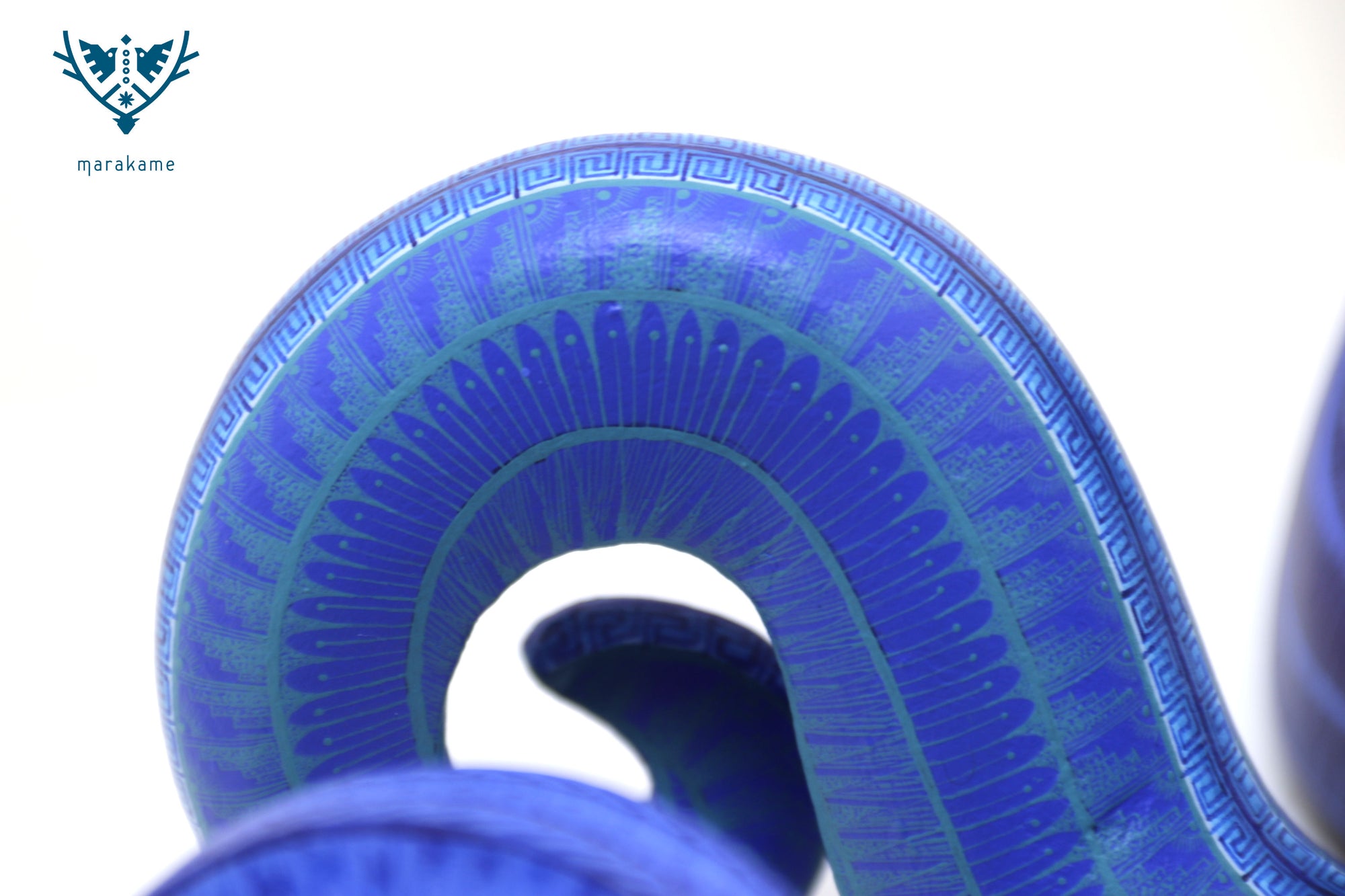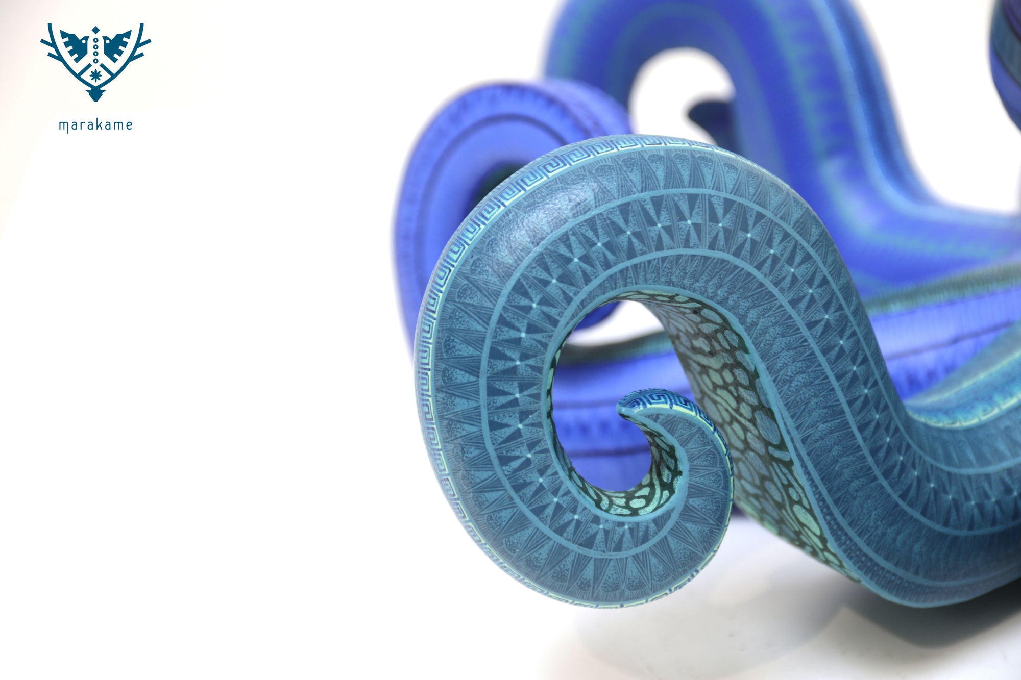 Esta impresionante escultura de pulpo ha sido tallada y pintada a mano con exquisita precisión, fusionando tonos azules y violetas que evocan el misterio de las profundidades marinas. Sus tentáculos dinámicamente curvados y su patrón geométrico detallado revelan la maestría artesanal de Oaxaca. Ideal como pieza central decorativa, esta obra es una muestra del arte popular contemporáneo llevado a un nivel excepcional.