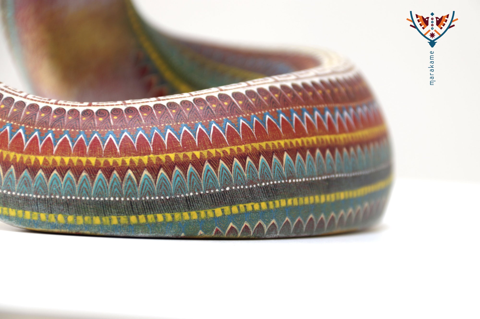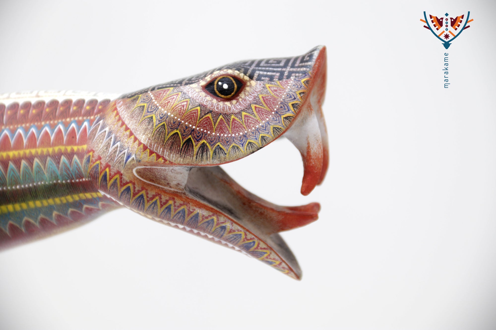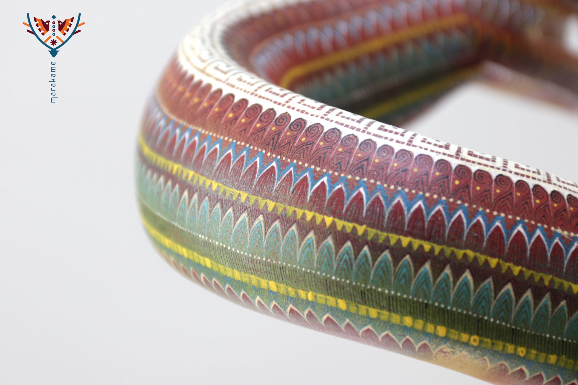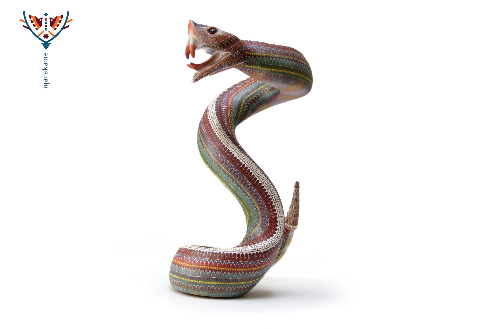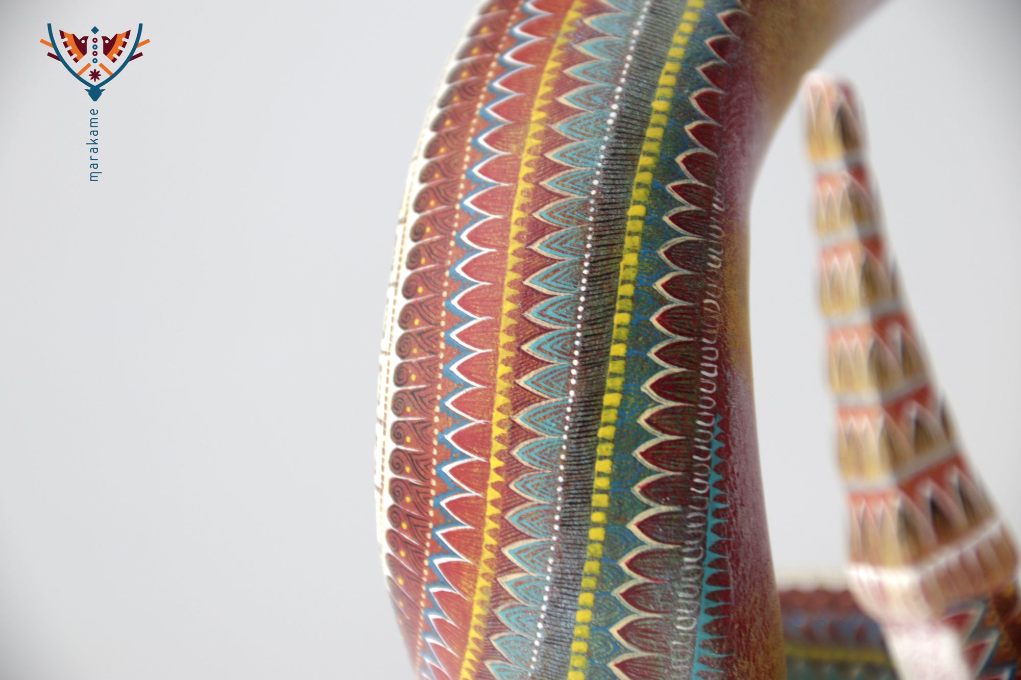 La serpiente parece moverse en el aire, como si estuviera animada por la energía que la rodea. Es un verdadero tesoro artístico, elaborado a mano con precisión y dedicación que reflejan la riqueza cultural y tradicional de la región.