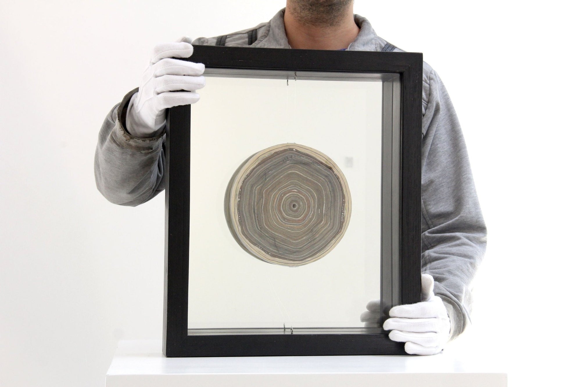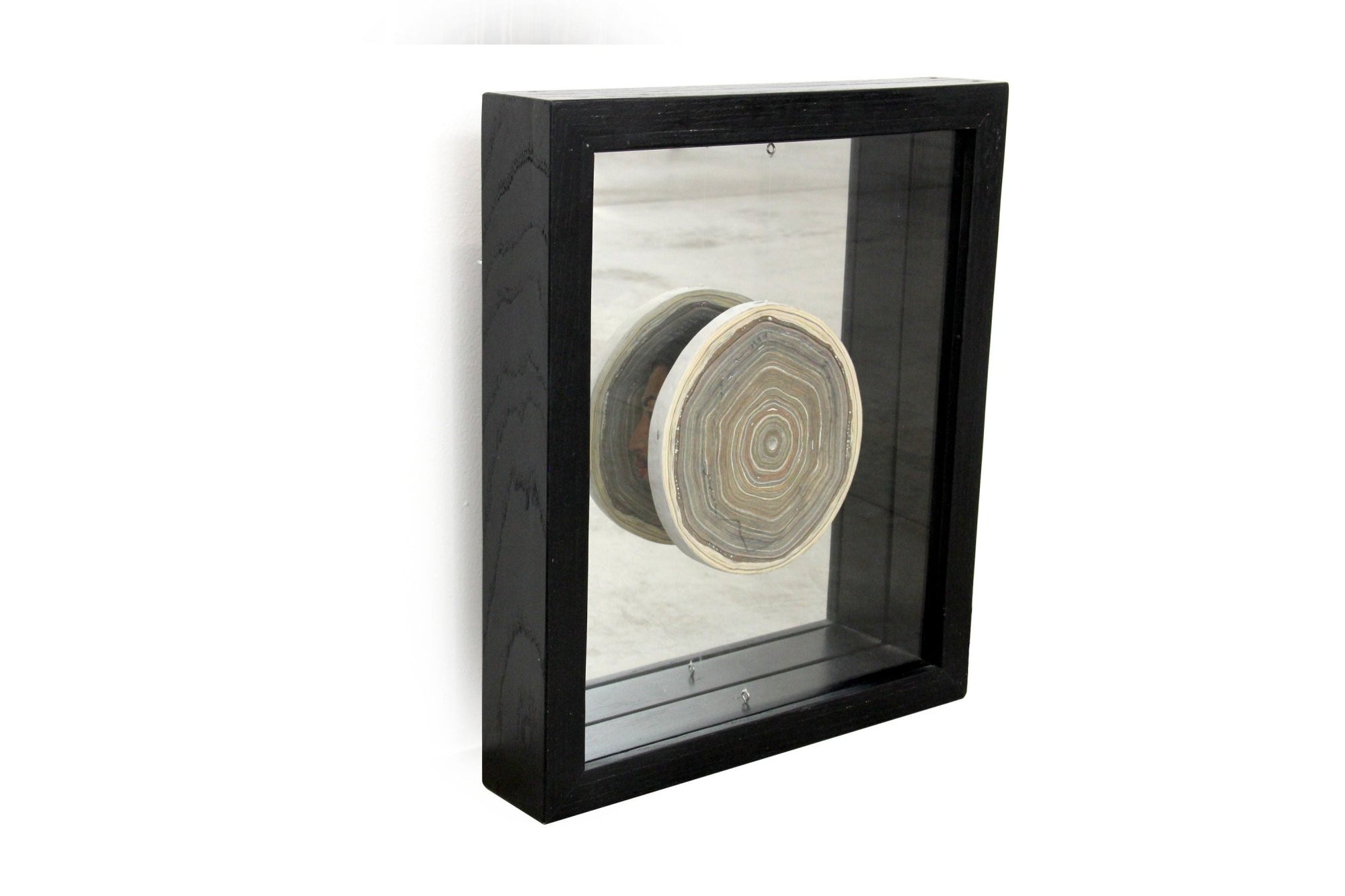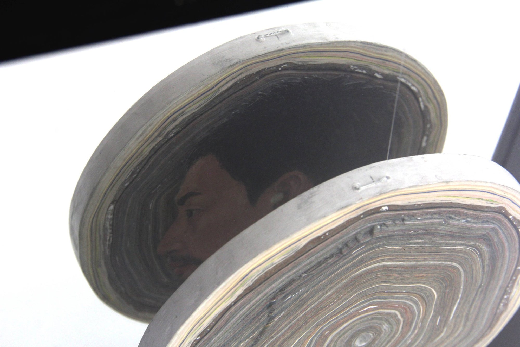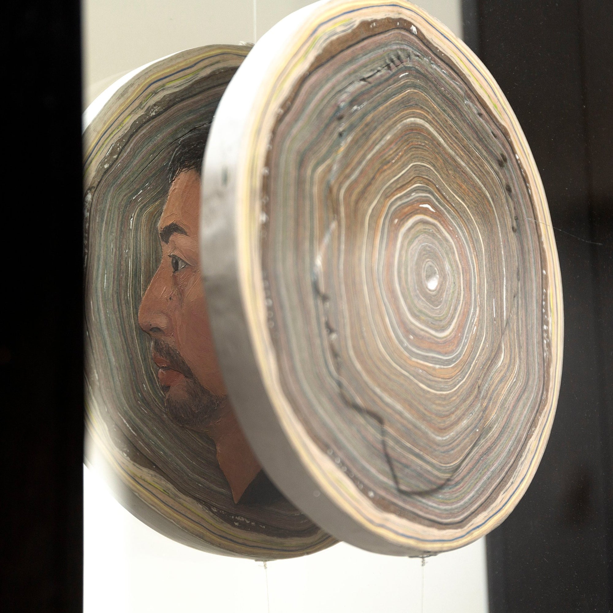 • Esta obra de Taro Tokuyama explora la identidad y la introspección a través de una fusión entre pintura y escultura suspendida en un marco de cristal. El retrato, elaborado con capas de papel pintadas al óleo, se asemeja a los anillos de crecimiento de un árbol, simbolizando el paso del tiempo y la acumulación de experiencias en la vida de una persona. Desde un ángulo, la pieza revela una abstracción concéntrica, mientras que desde otro punto de vista emerge un retrato hiperrealista del propio artista, reflejando el concepto de la dualidad y la percepción cambiante del ser.