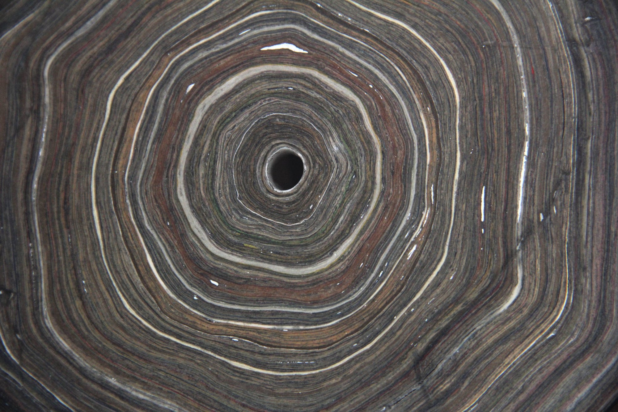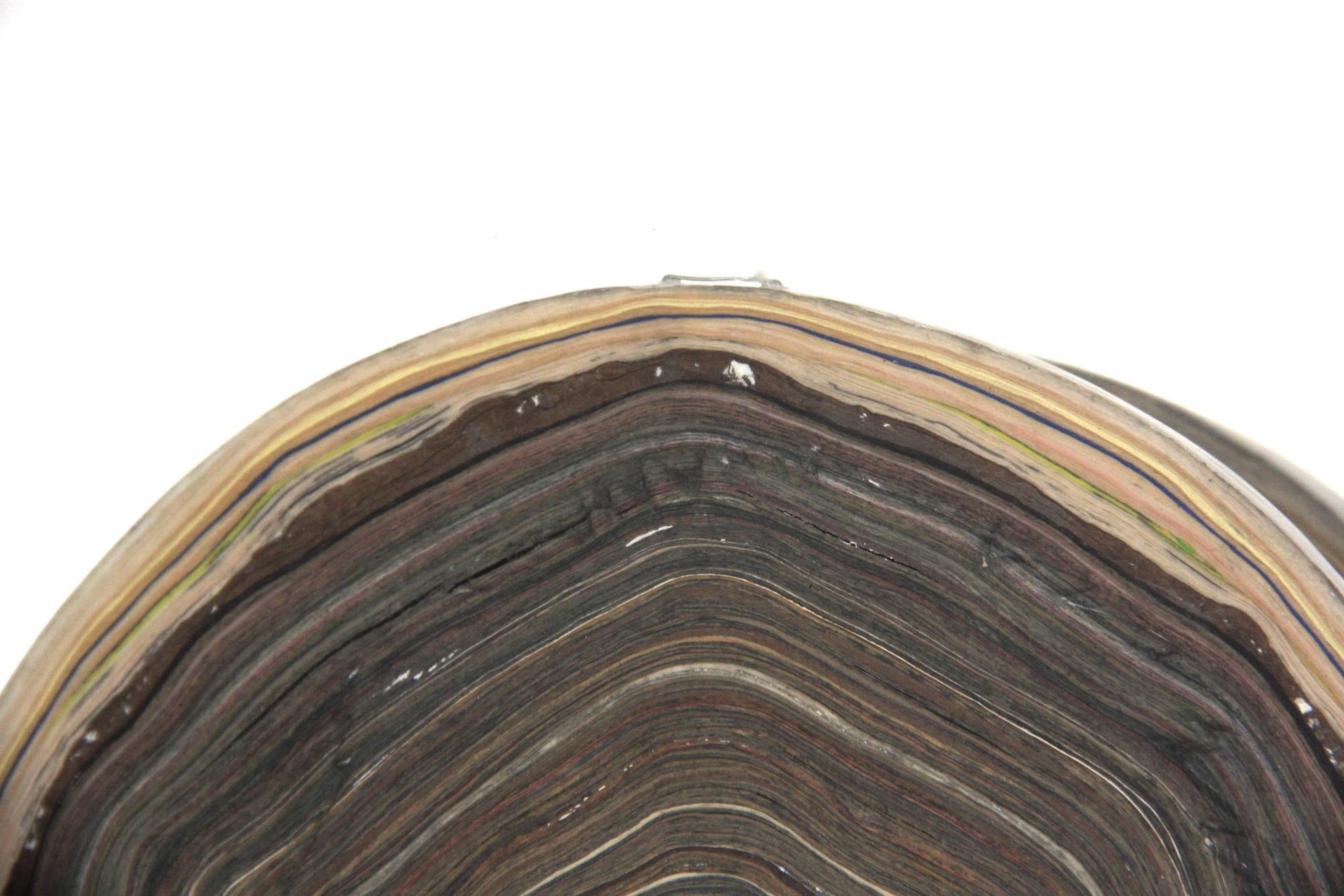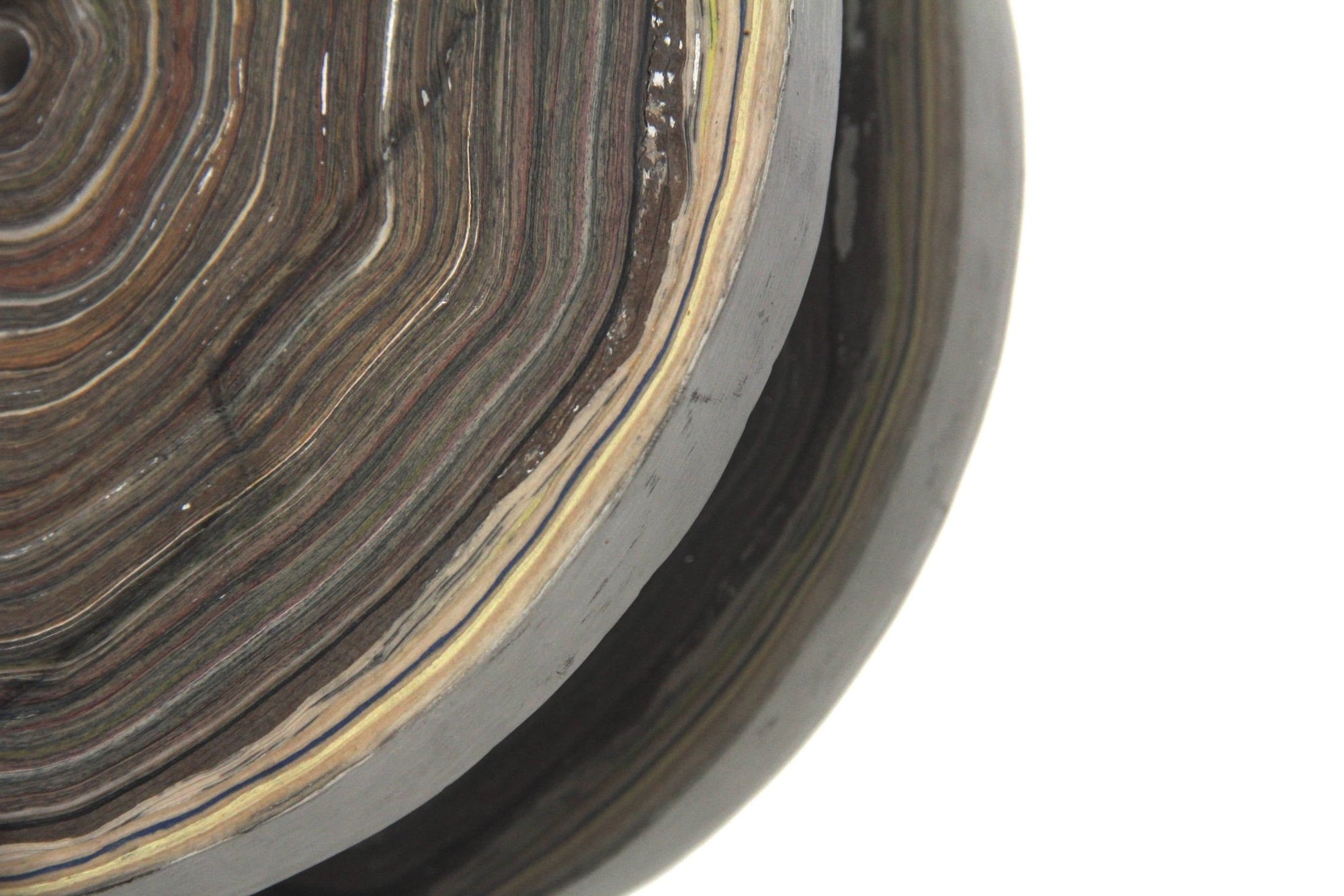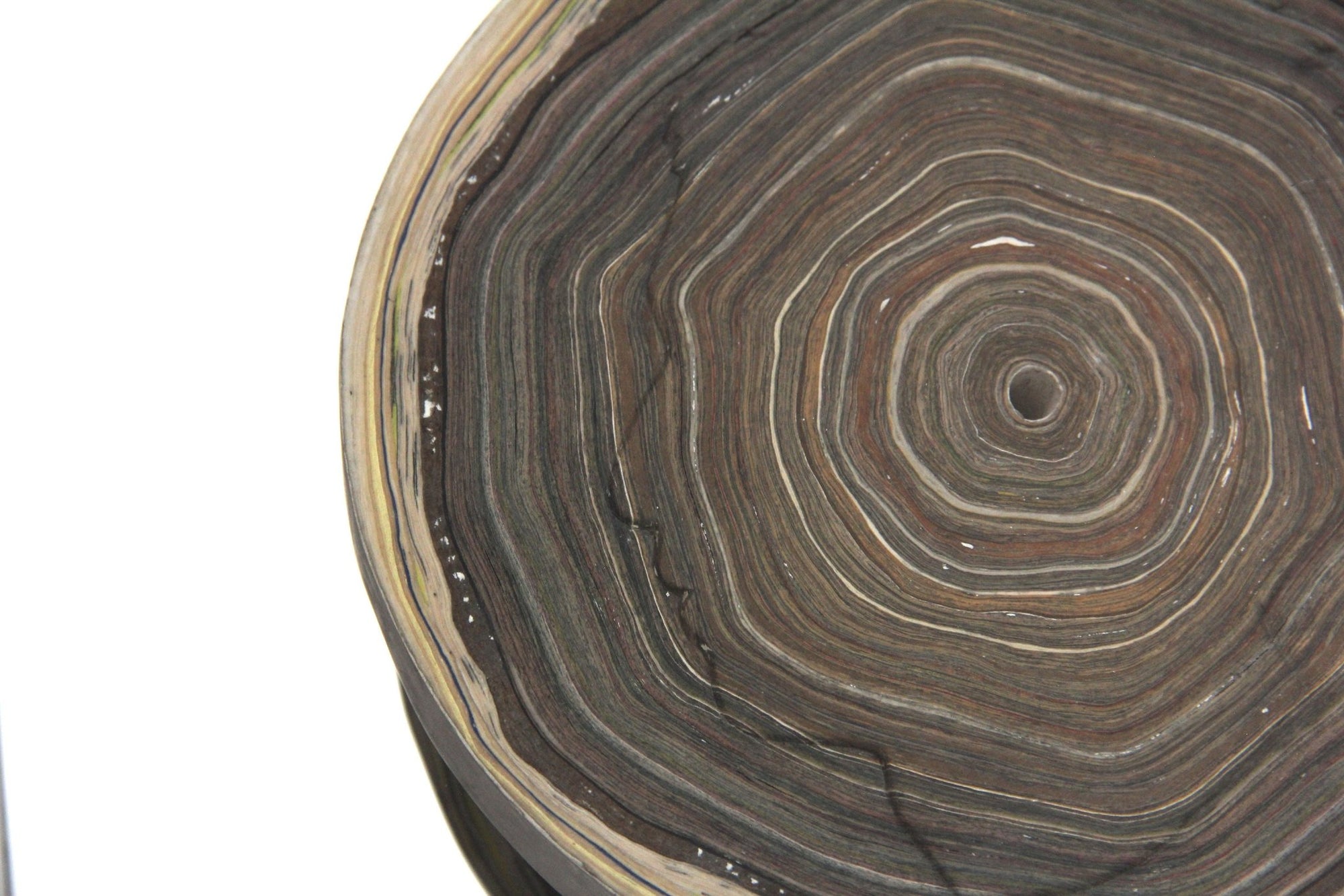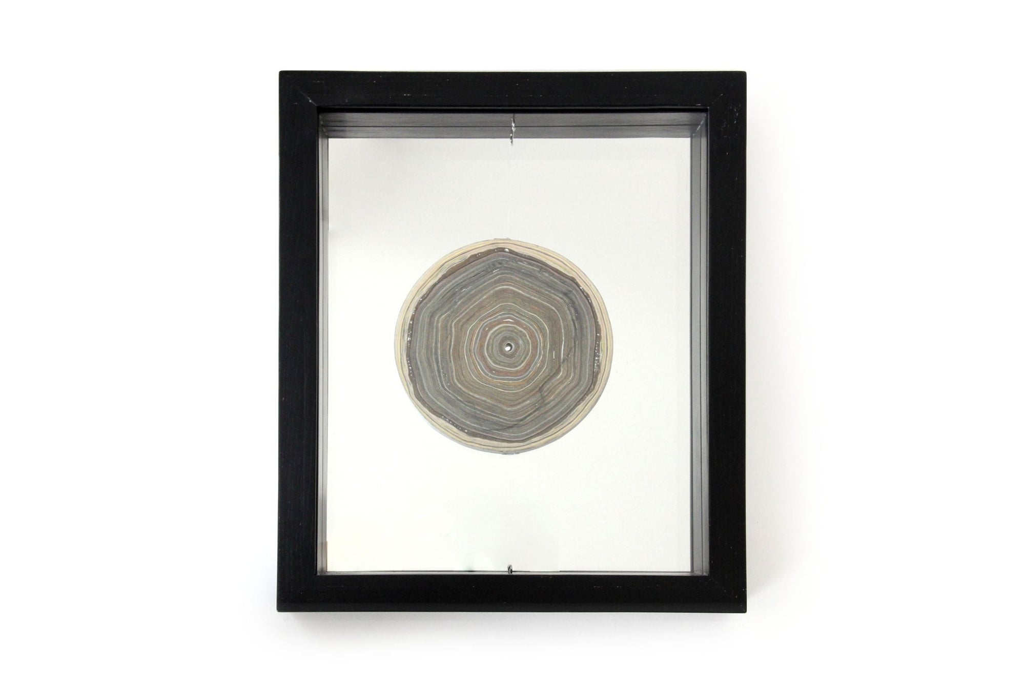 • Esta obra de Taro Tokuyama explora la identidad y la introspección a través de una fusión entre pintura y escultura suspendida en un marco de cristal. El retrato, elaborado con capas de papel pintadas al óleo, se asemeja a los anillos de crecimiento de un árbol, simbolizando el paso del tiempo y la acumulación de experiencias en la vida de una persona. Desde un ángulo, la pieza revela una abstracción concéntrica, mientras que desde otro punto de vista emerge un retrato hiperrealista del propio artista, reflejando el concepto de la dualidad y la percepción cambiante del ser.