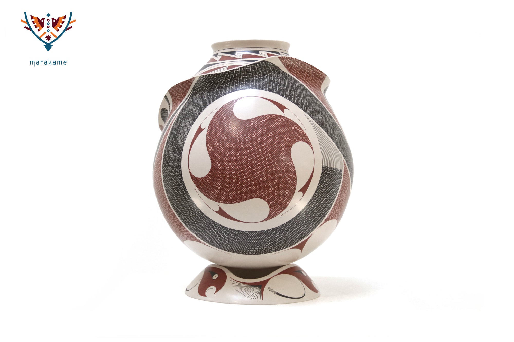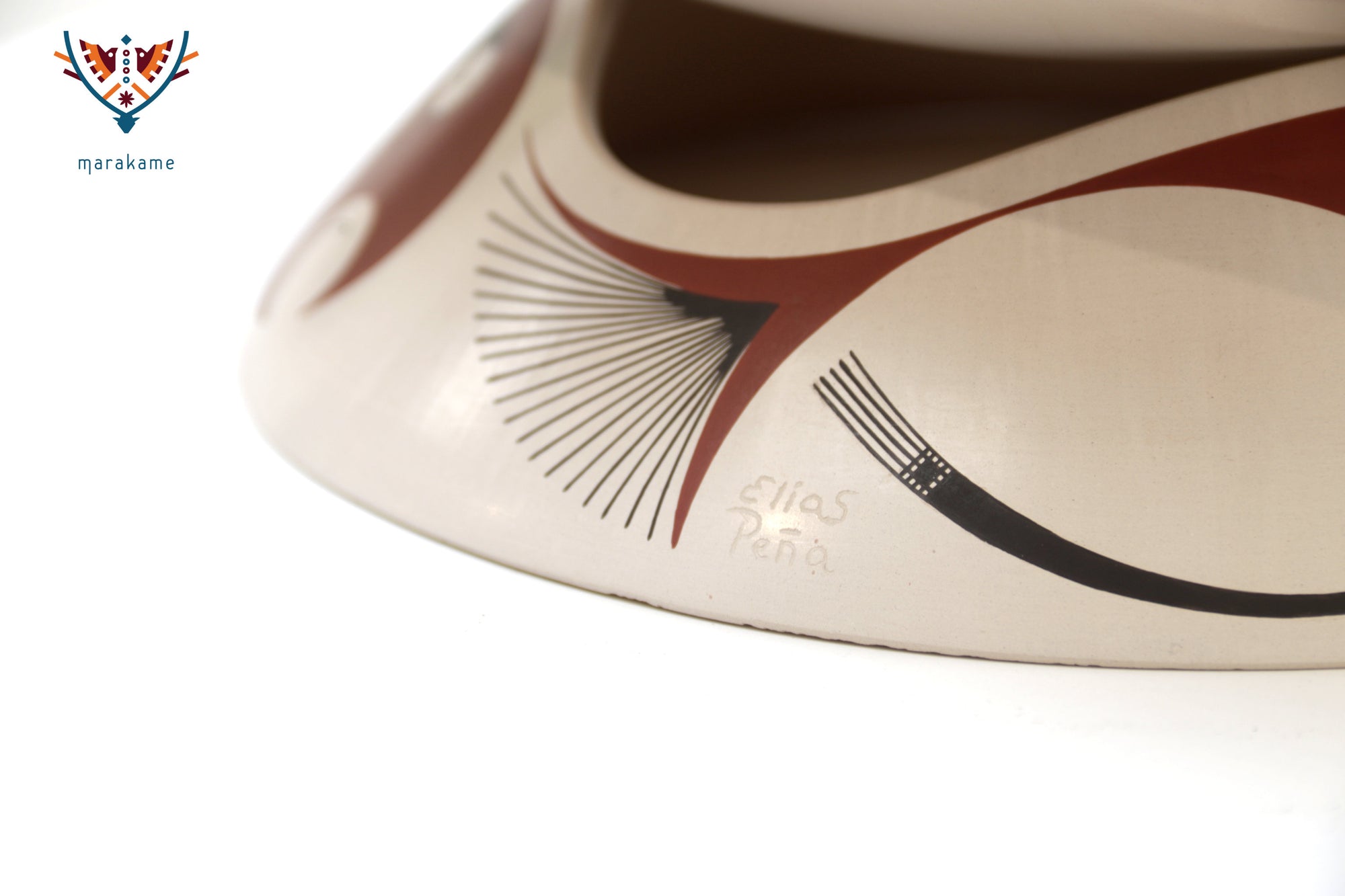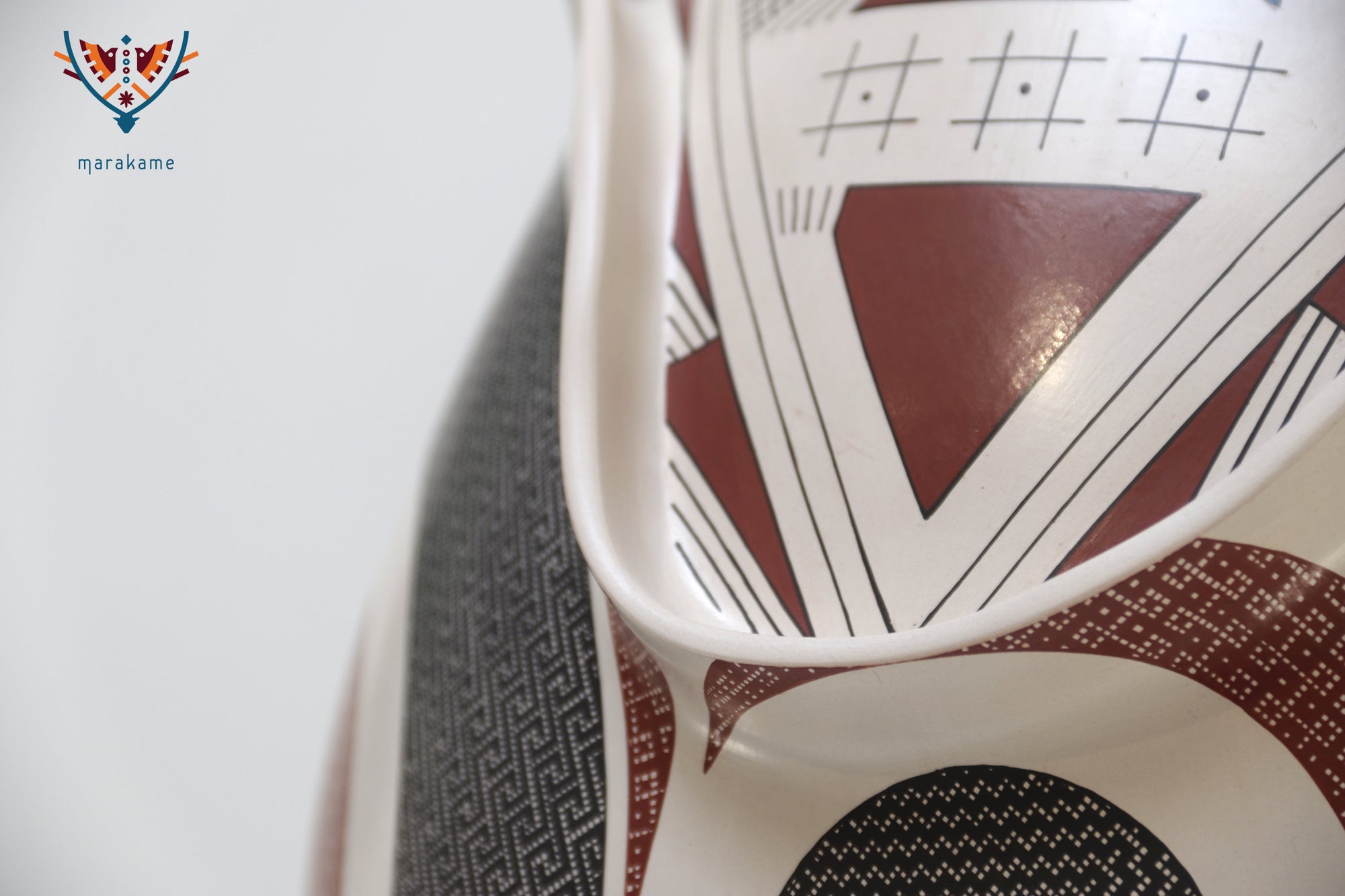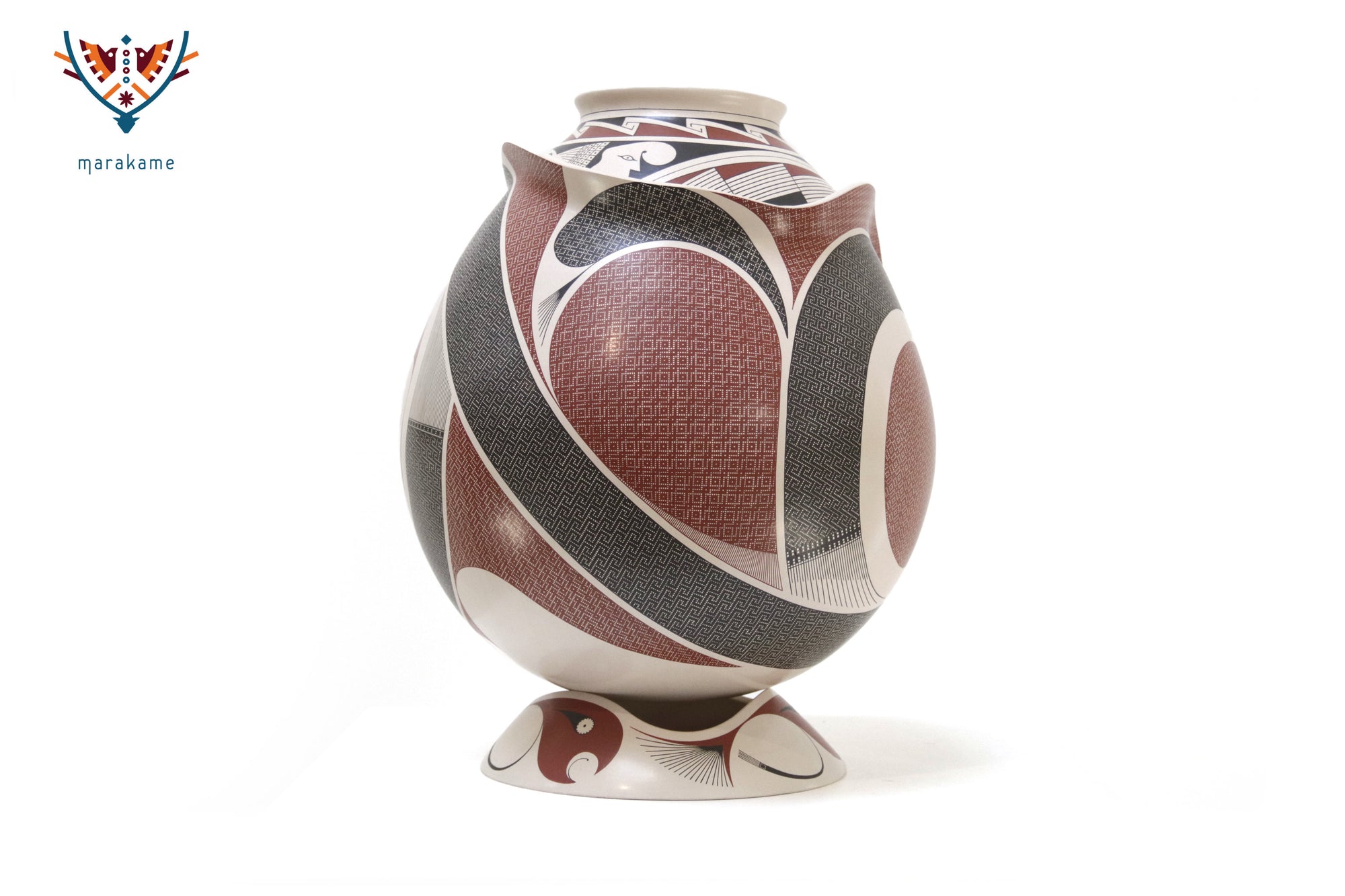 Obra maestra del reconocido ceramista Elías Peña, este jarrón de Mata Ortiz titulado “Descubriendo mis orígenes” fusiona formas contemporáneas con patrones ancestrales inspirados en la iconografía de Paquimé. La pieza destaca por su elegante diseño curvilíneo, detalles geométricos pintados a mano en tonos tierra y un refinado equilibrio entre simetría y expresión artística. Cada trazo cuenta una historia de identidad y pertenencia, convirtiendo este jarrón en una pieza de colección con profunda carga simbólica.