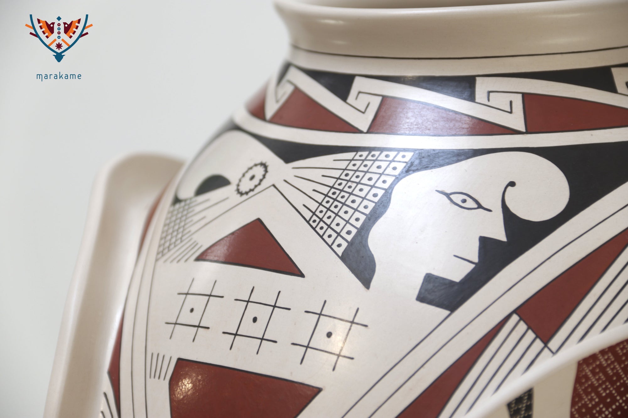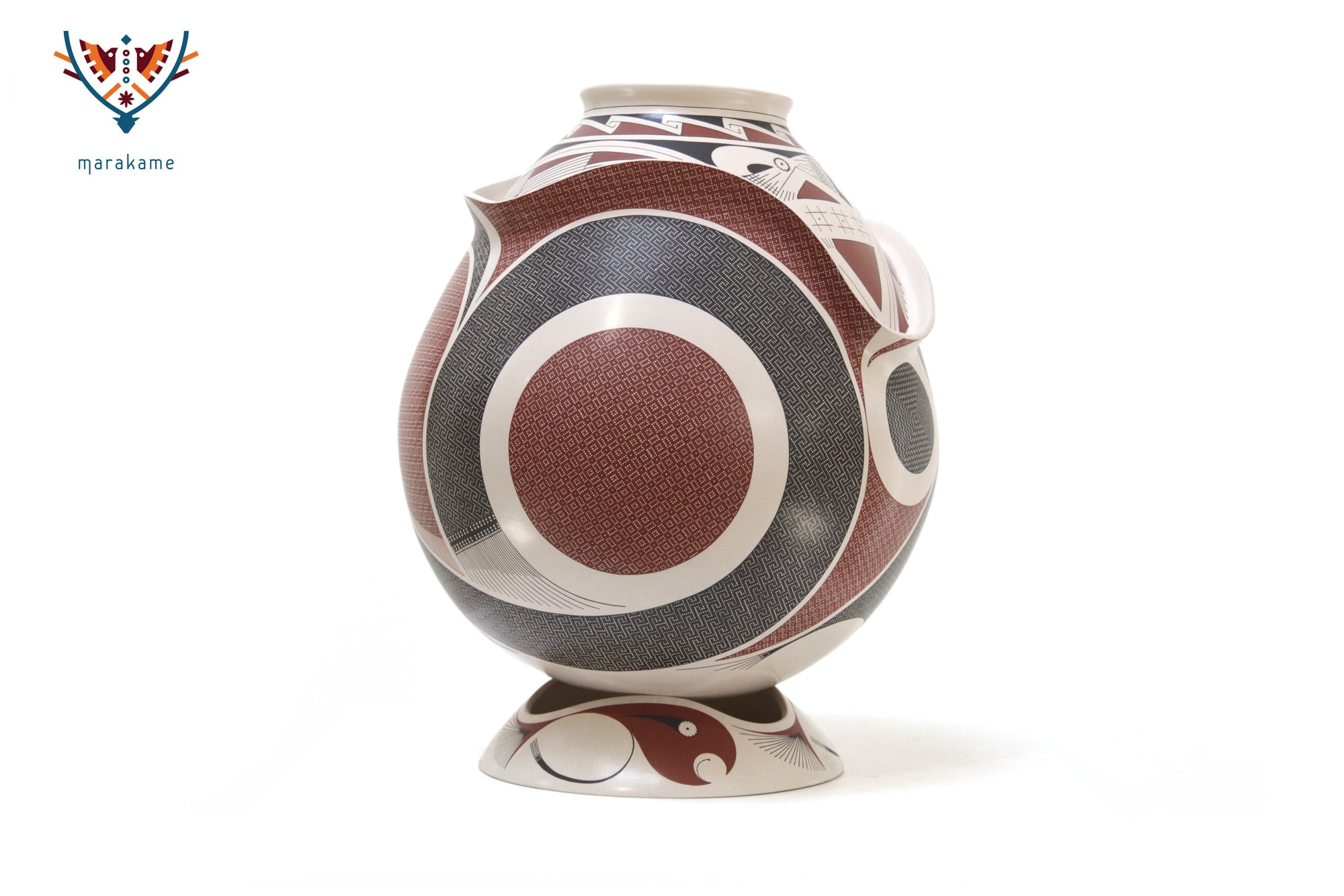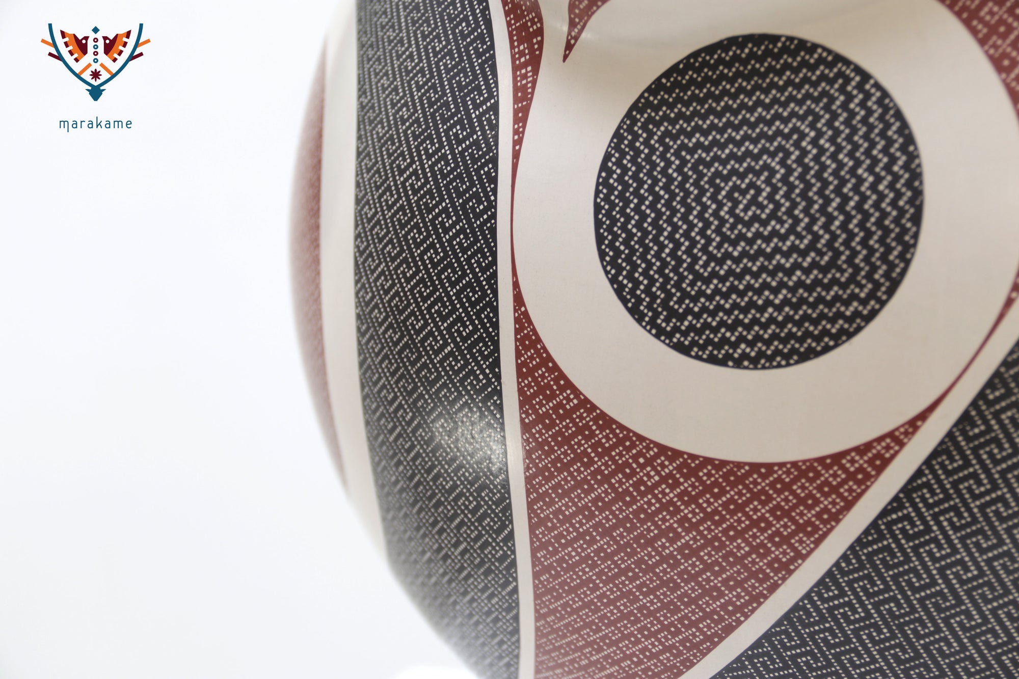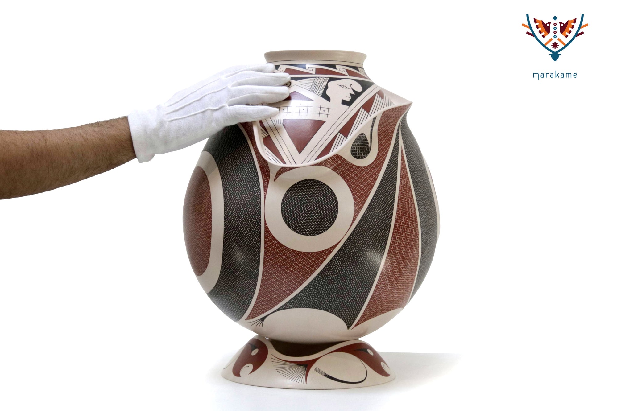 Obra maestra del reconocido ceramista Elías Peña, este jarrón de Mata Ortiz titulado “Descubriendo mis orígenes” fusiona formas contemporáneas con patrones ancestrales inspirados en la iconografía de Paquimé. La pieza destaca por su elegante diseño curvilíneo, detalles geométricos pintados a mano en tonos tierra y un refinado equilibrio entre simetría y expresión artística. Cada trazo cuenta una historia de identidad y pertenencia, convirtiendo este jarrón en una pieza de colección con profunda carga simbólica.