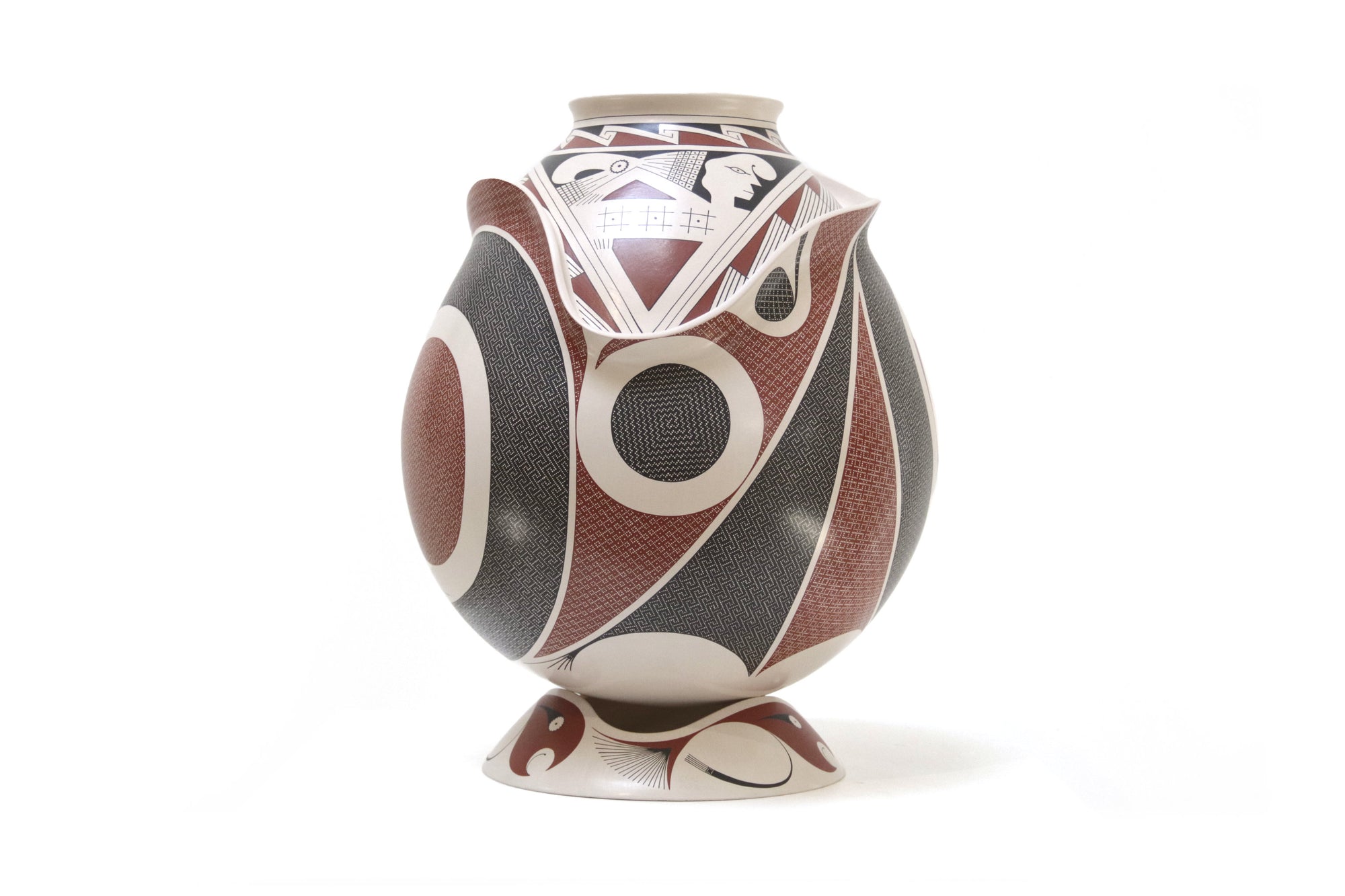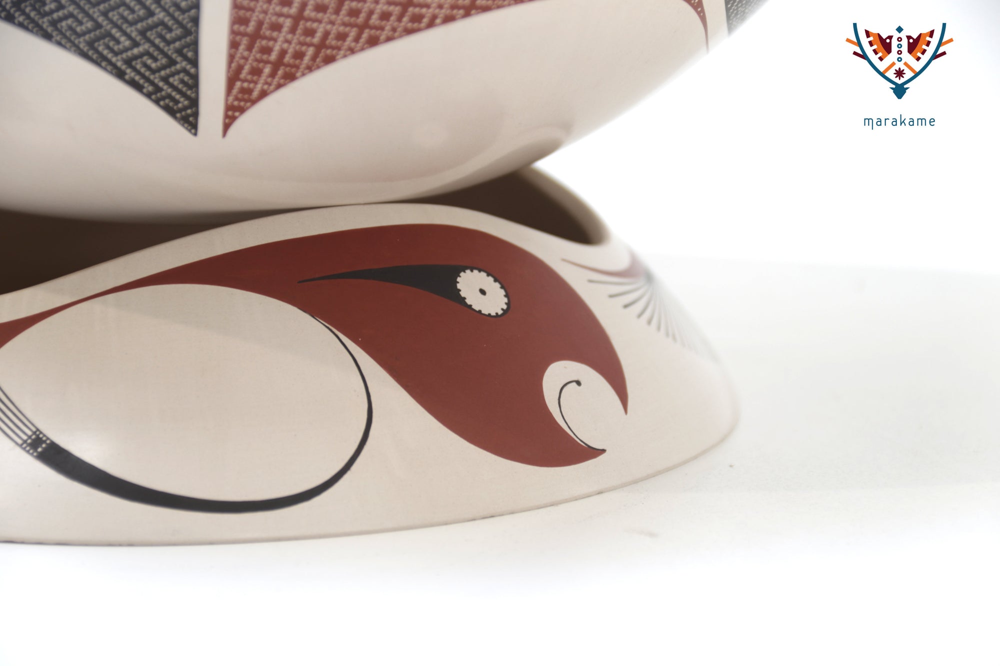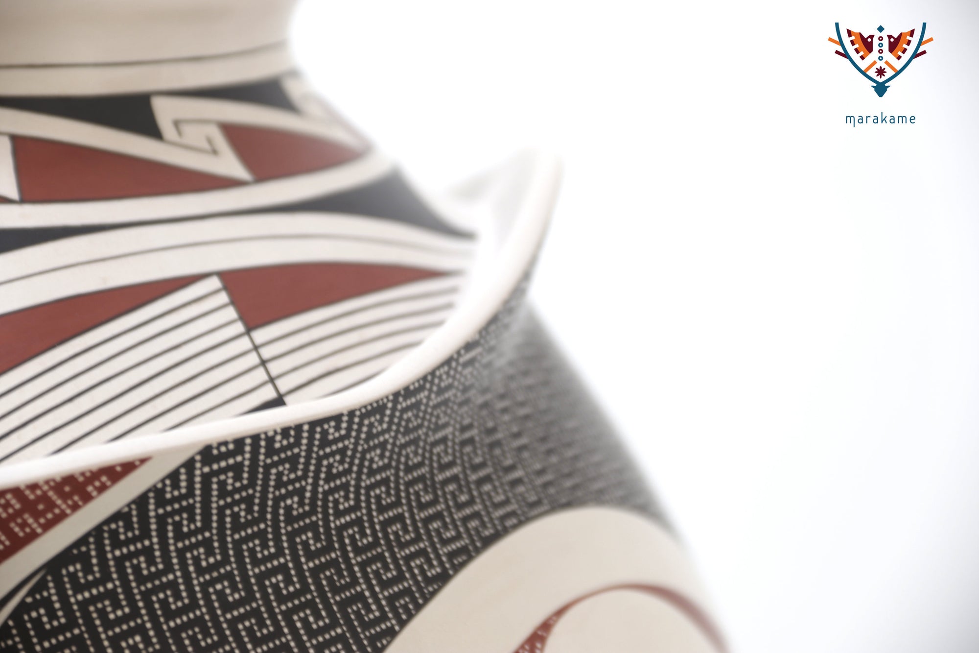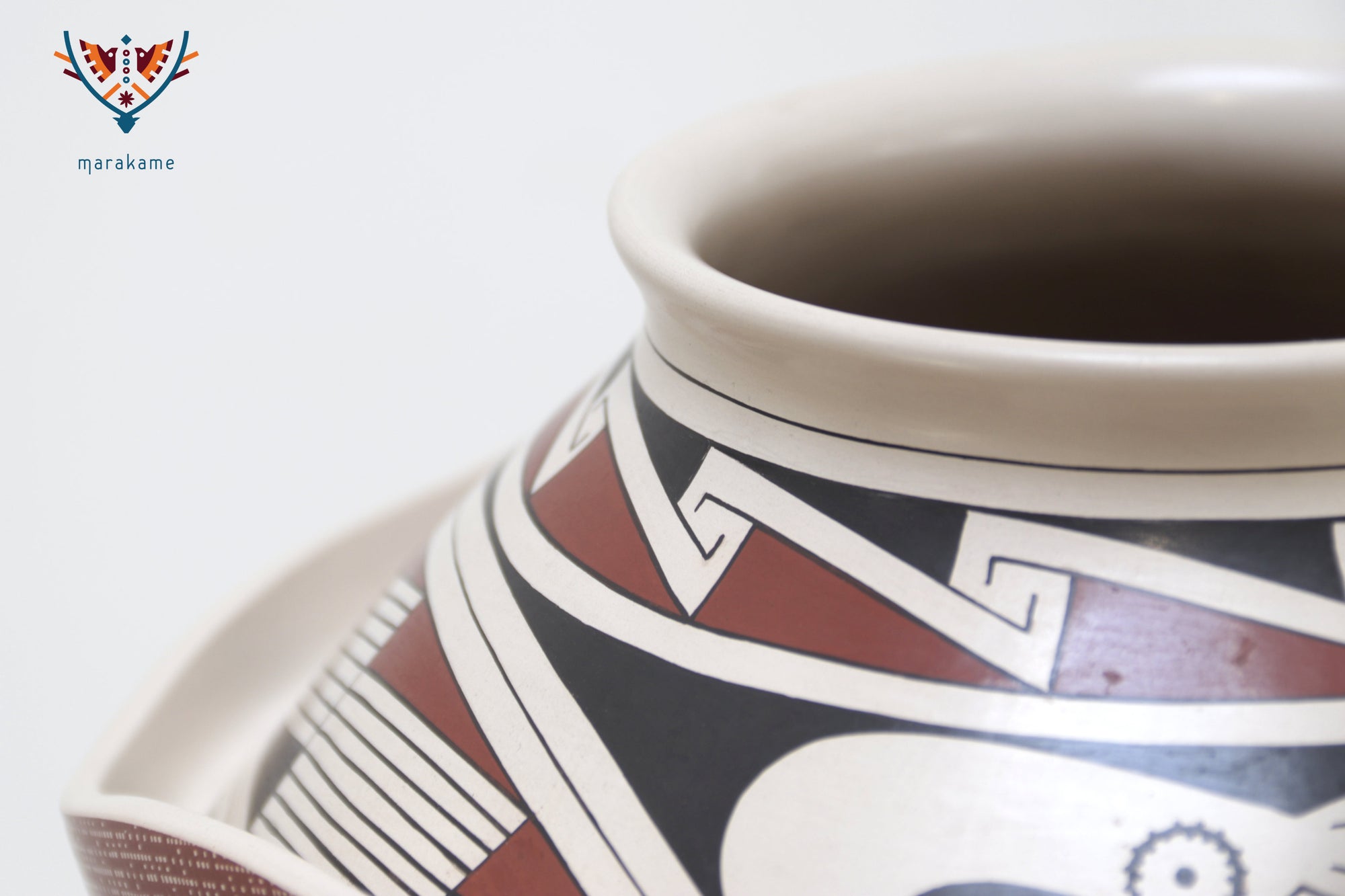 Obra maestra del reconocido ceramista Elías Peña, este jarrón de Mata Ortiz titulado “Descubriendo mis orígenes” fusiona formas contemporáneas con patrones ancestrales inspirados en la iconografía de Paquimé. La pieza destaca por su elegante diseño curvilíneo, detalles geométricos pintados a mano en tonos tierra y un refinado equilibrio entre simetría y expresión artística. Cada trazo cuenta una historia de identidad y pertenencia, convirtiendo este jarrón en una pieza de colección con profunda carga simbólica.