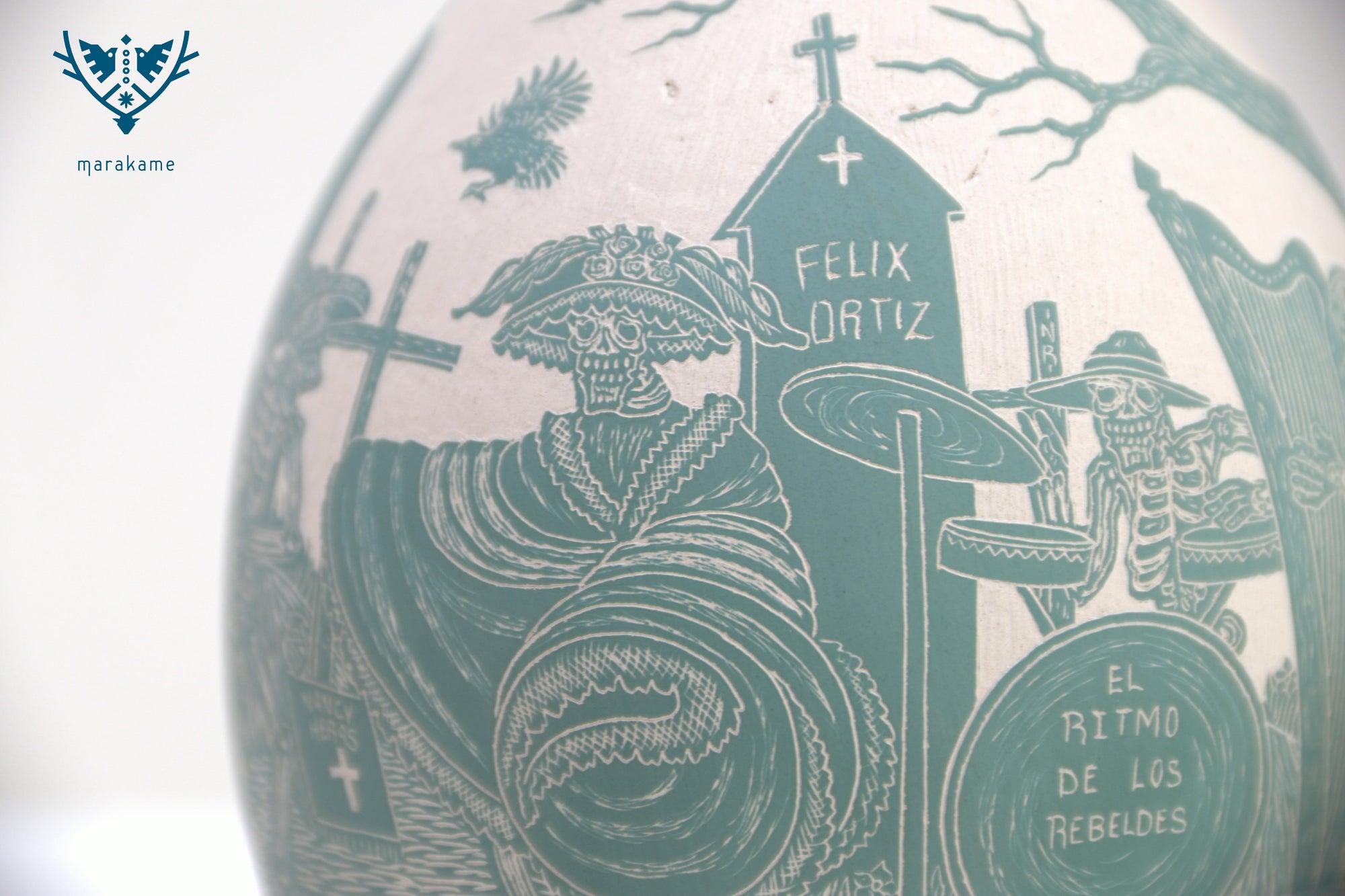 Esta magnifica pieza de cerámica de Mata Ortiz es un homenaje a la tradición y el arte mexicano, en particular al Día de Muertos. Confeccionada en cerámica fina y decorada cuidadosamente a mano, presenta imágenes talladas de Catrines, figuras emblemáticas de la celebración, interactuando en sus vidas cotidianas. Los Catrines tocan instrumentos musicales, disfrutan de una comida romántica o simplemente se relajan en un patio, mostrando que incluso en la muerte, la vida sigue siendo llena de alegría y pasión.