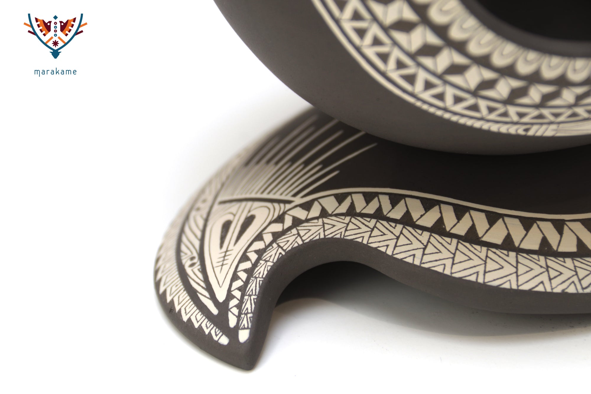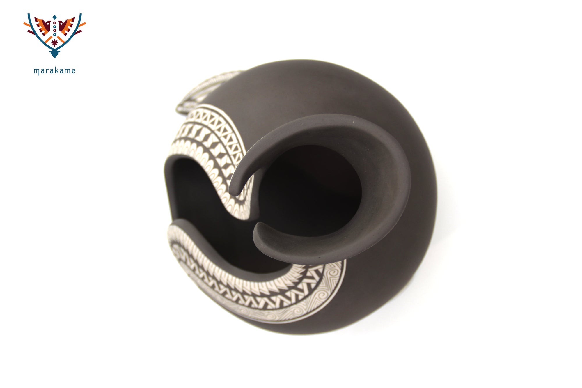 Esta pequeña pieza de cerámica de Mata Ortiz es una obra artesanal que encapsula la elegancia y el simbolismo de la tradición alfarera mexicana. Hecha de cerámica fina y pintada a mano con delicadeza, cada diseño geométrico y línea está inspirado en el arte prehispánico, reflejando la belleza y precisión de las antiguas técnicas prehispánicas. Compacta pero impactante, es ideal para decorar pequeños espacios, añadir un toque de autenticidad a cualquier rincón de tu hogar, o bien como un detalle especial que encantará a quienes aprecian el arte artesanal.