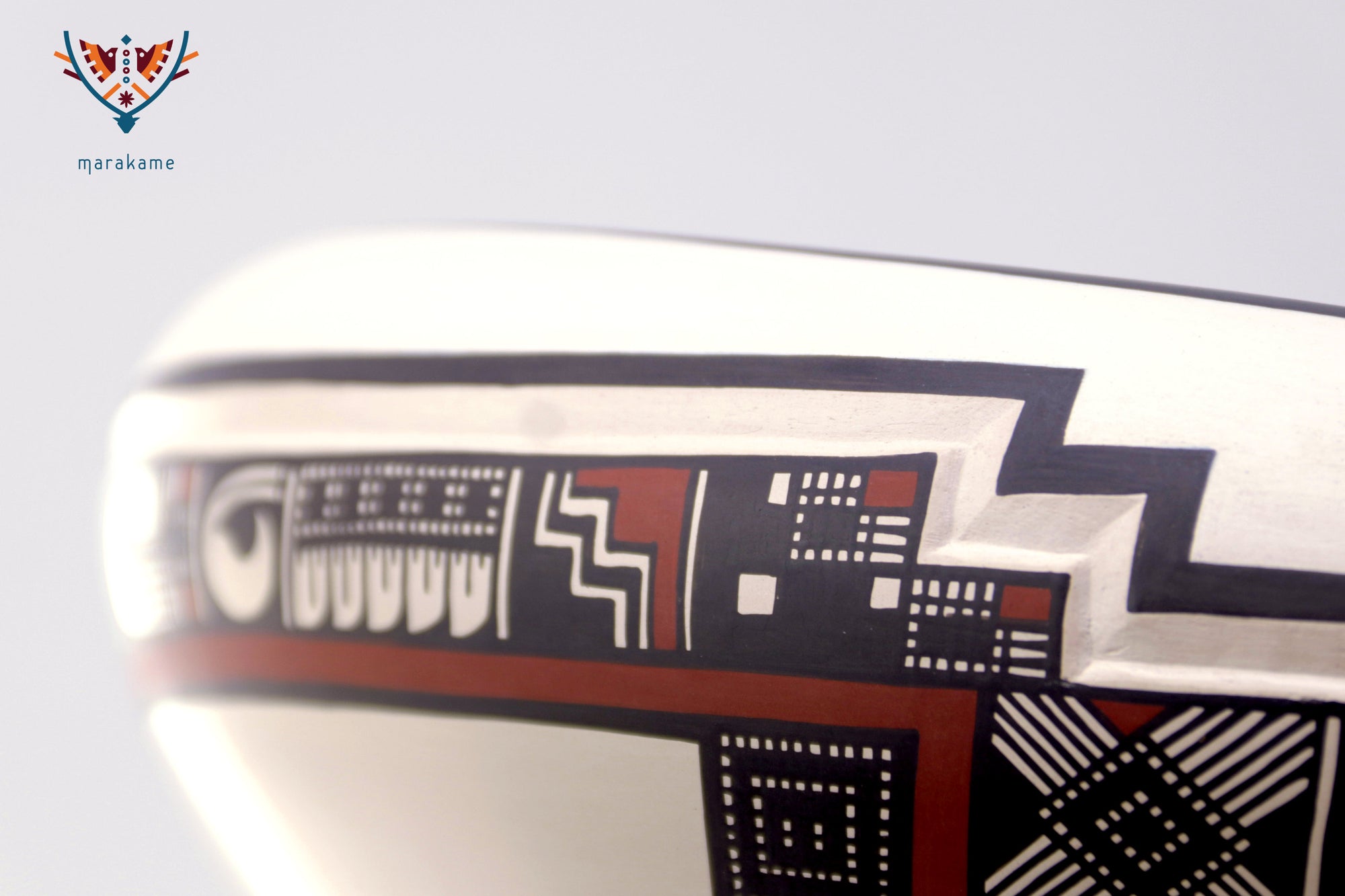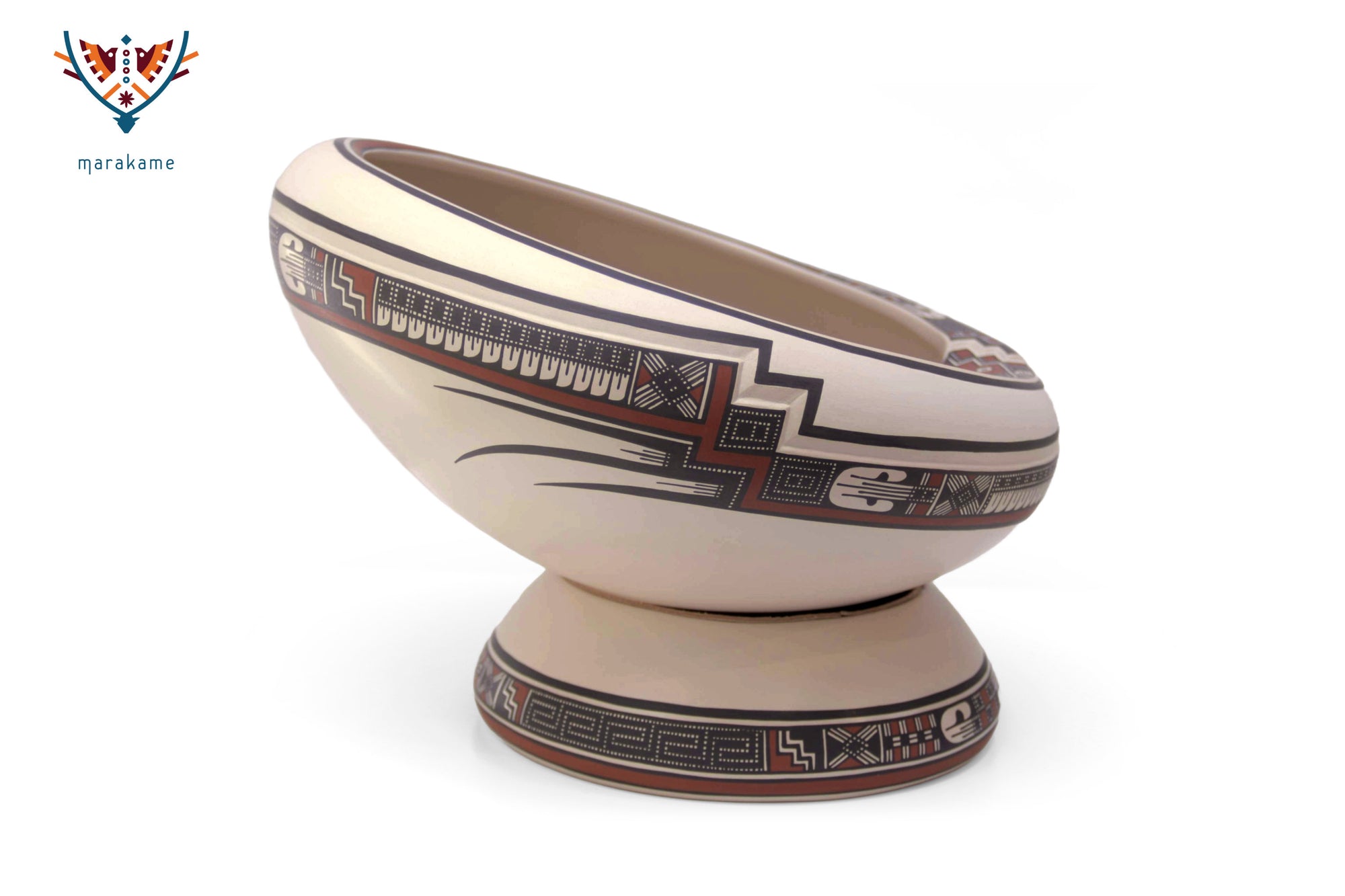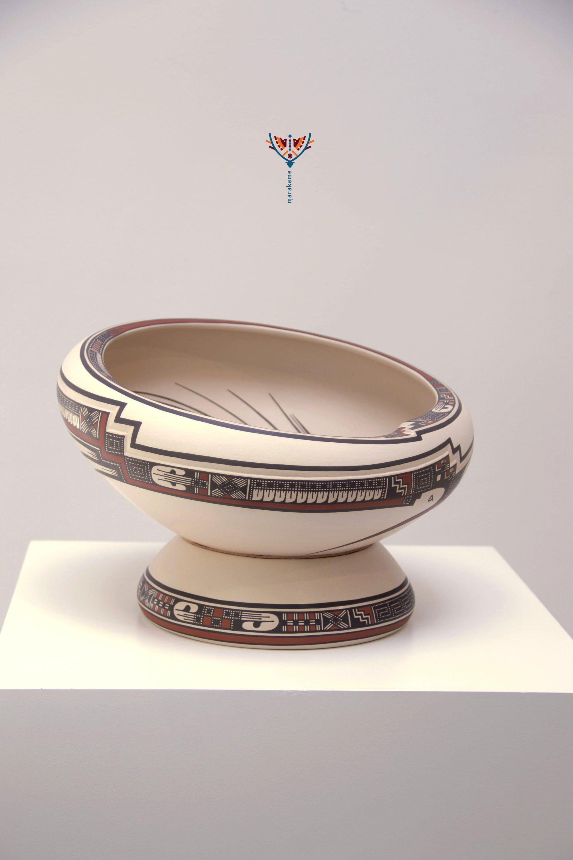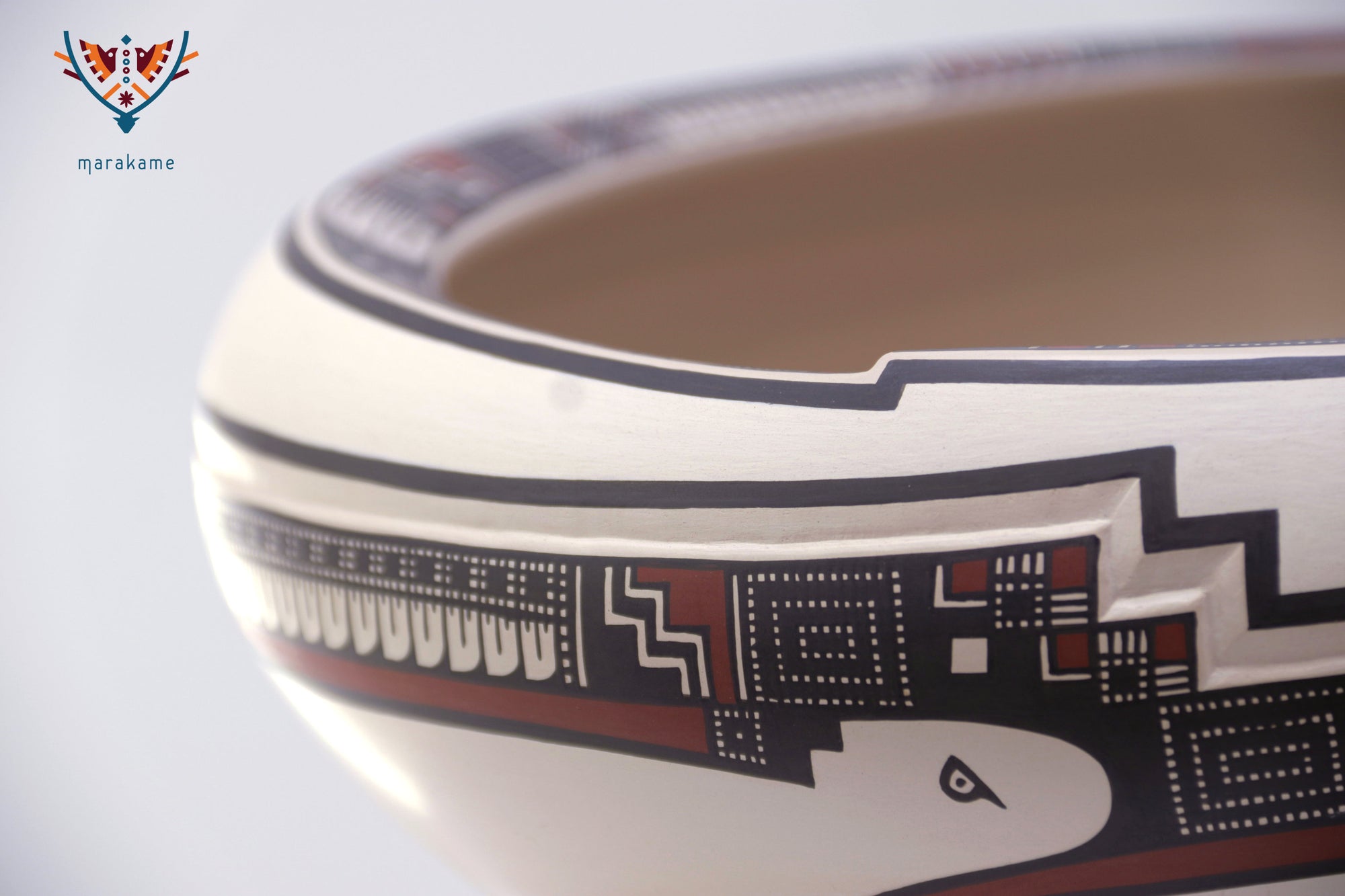 El interior está decorado con precisión milimétrica, mientras que el exterior integra un patrón continuo que remite a los códices visuales de Paquimé. Su presentación inclinada sugiere un objeto tanto funcional como simbólico, ideal para exhibición.