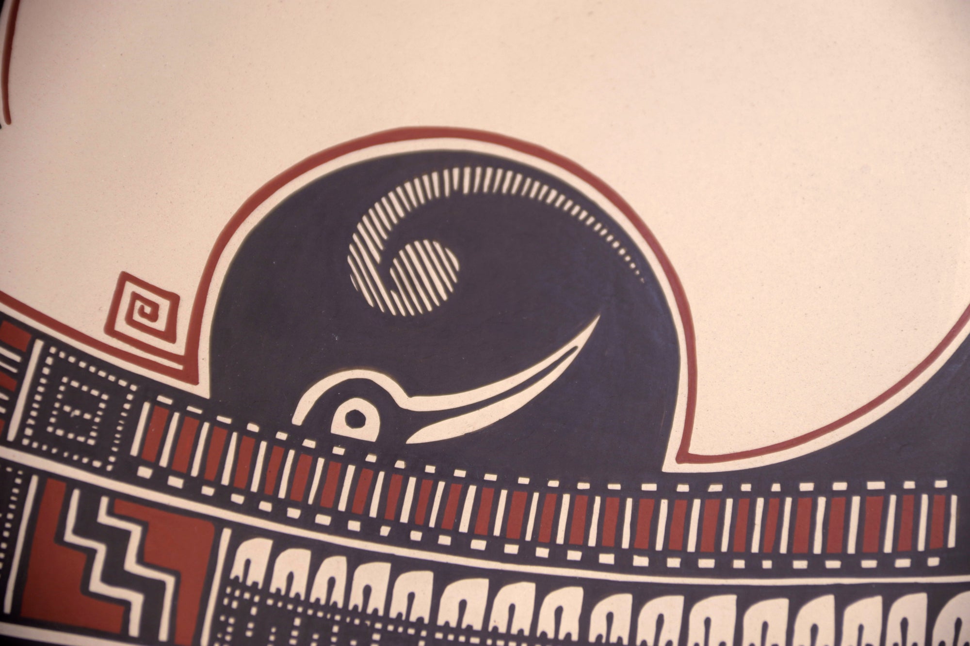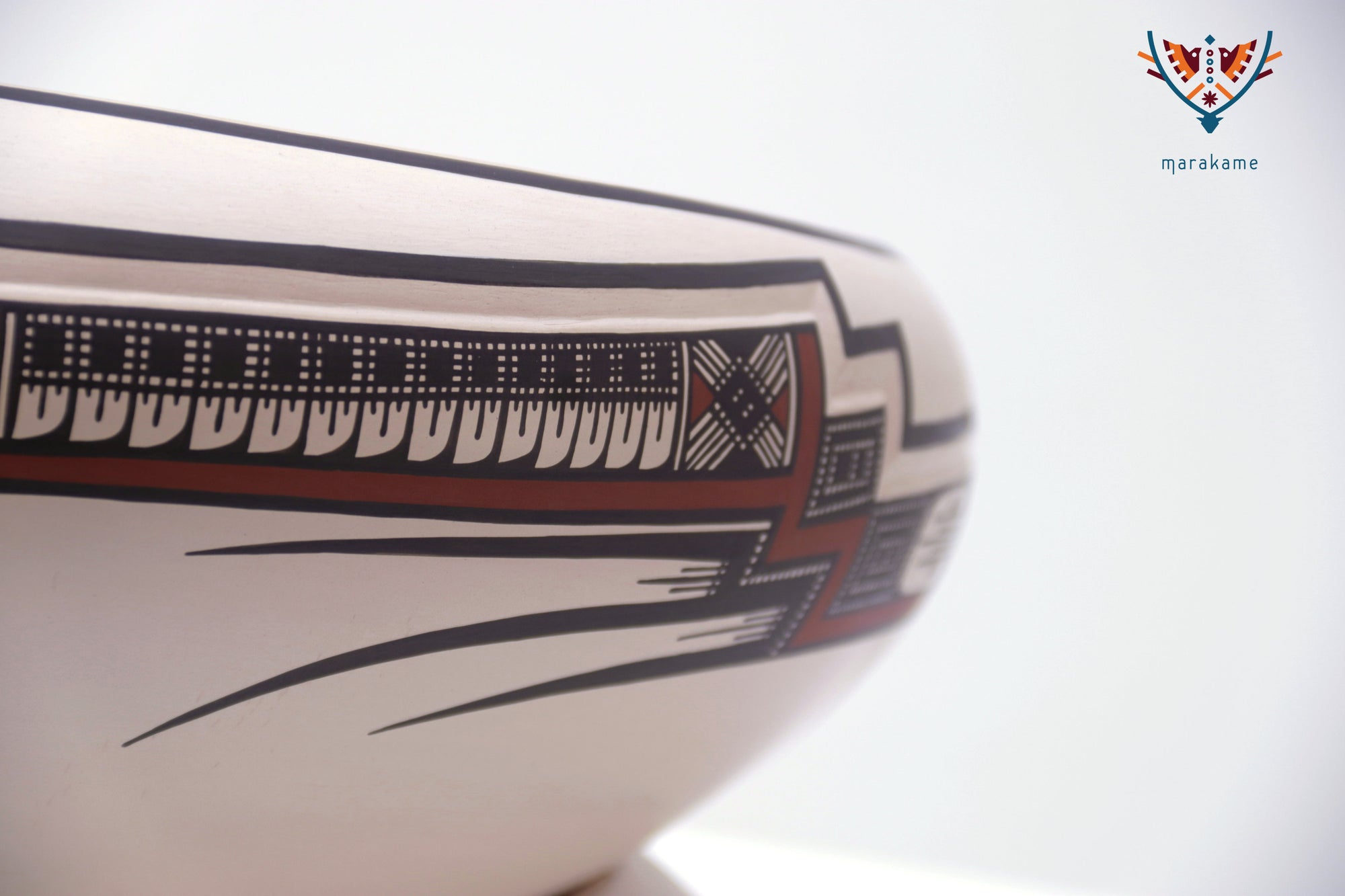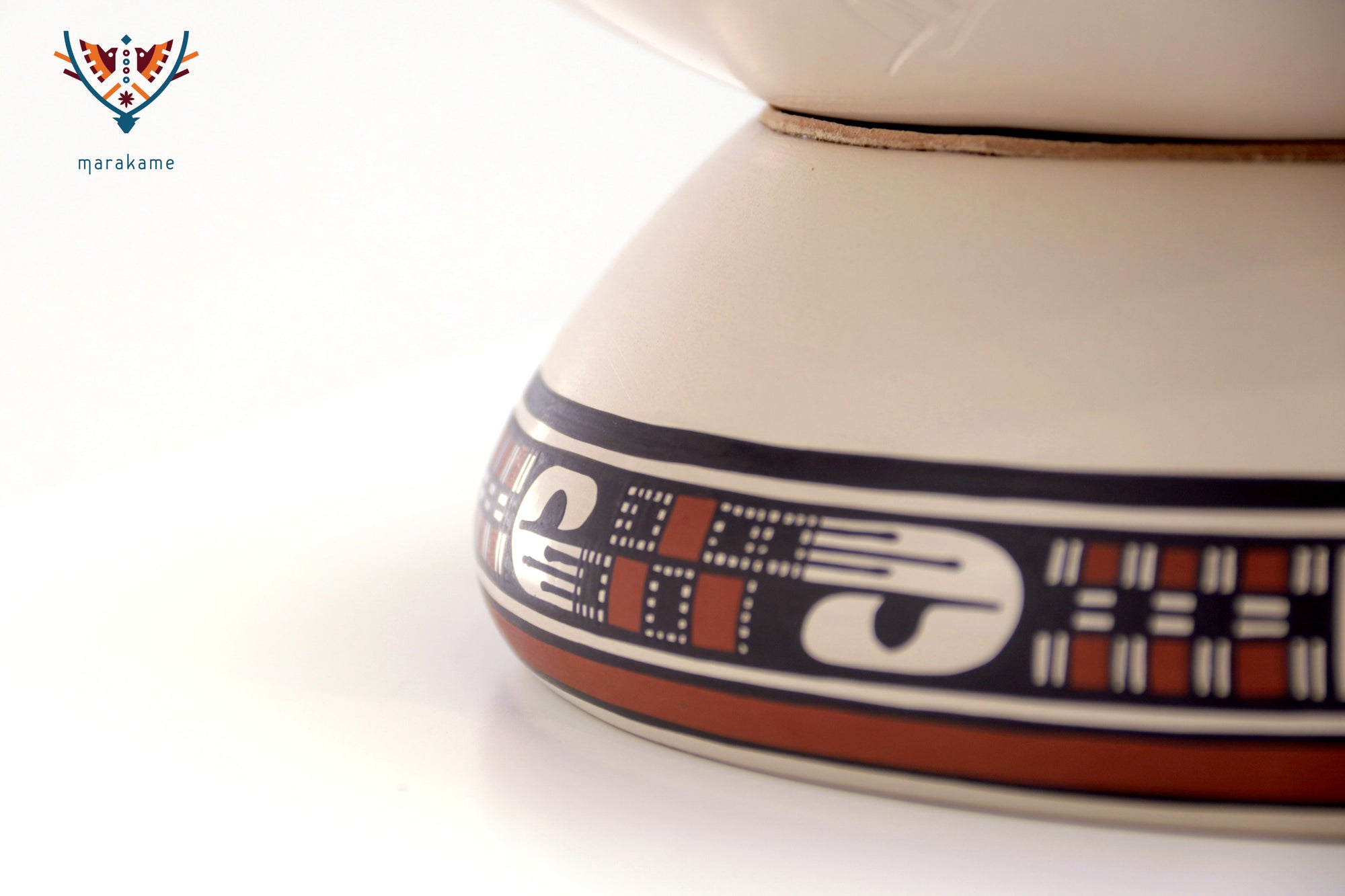 El interior está decorado con precisión milimétrica, mientras que el exterior integra un patrón continuo que remite a los códices visuales de Paquimé. Su presentación inclinada sugiere un objeto tanto funcional como simbólico, ideal para exhibición.
