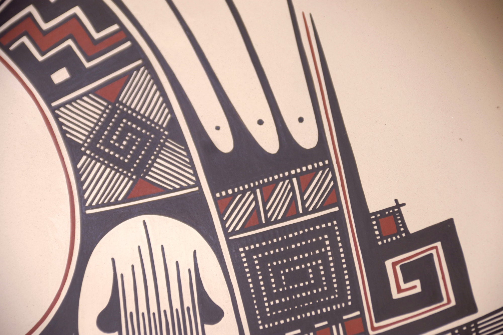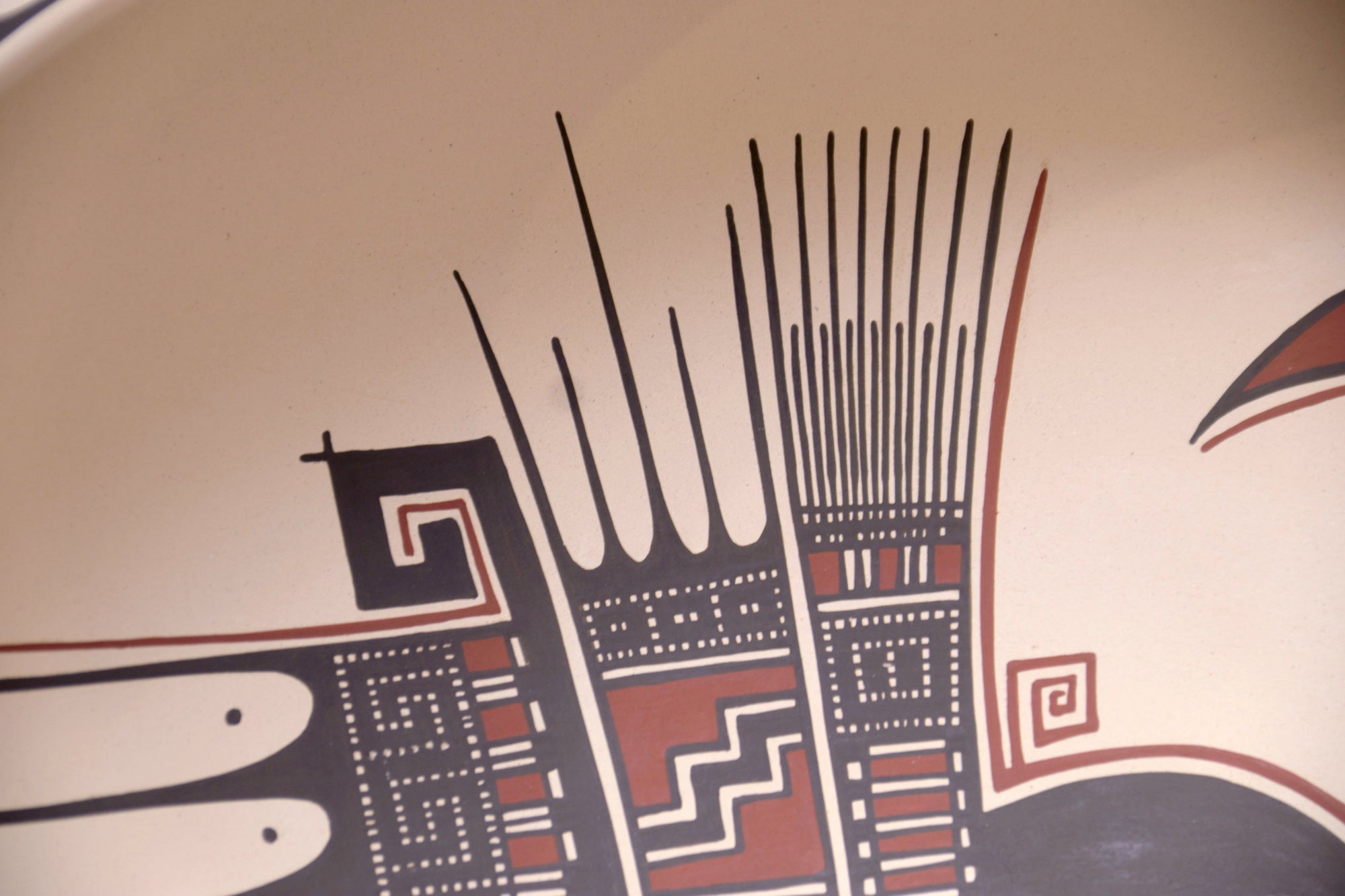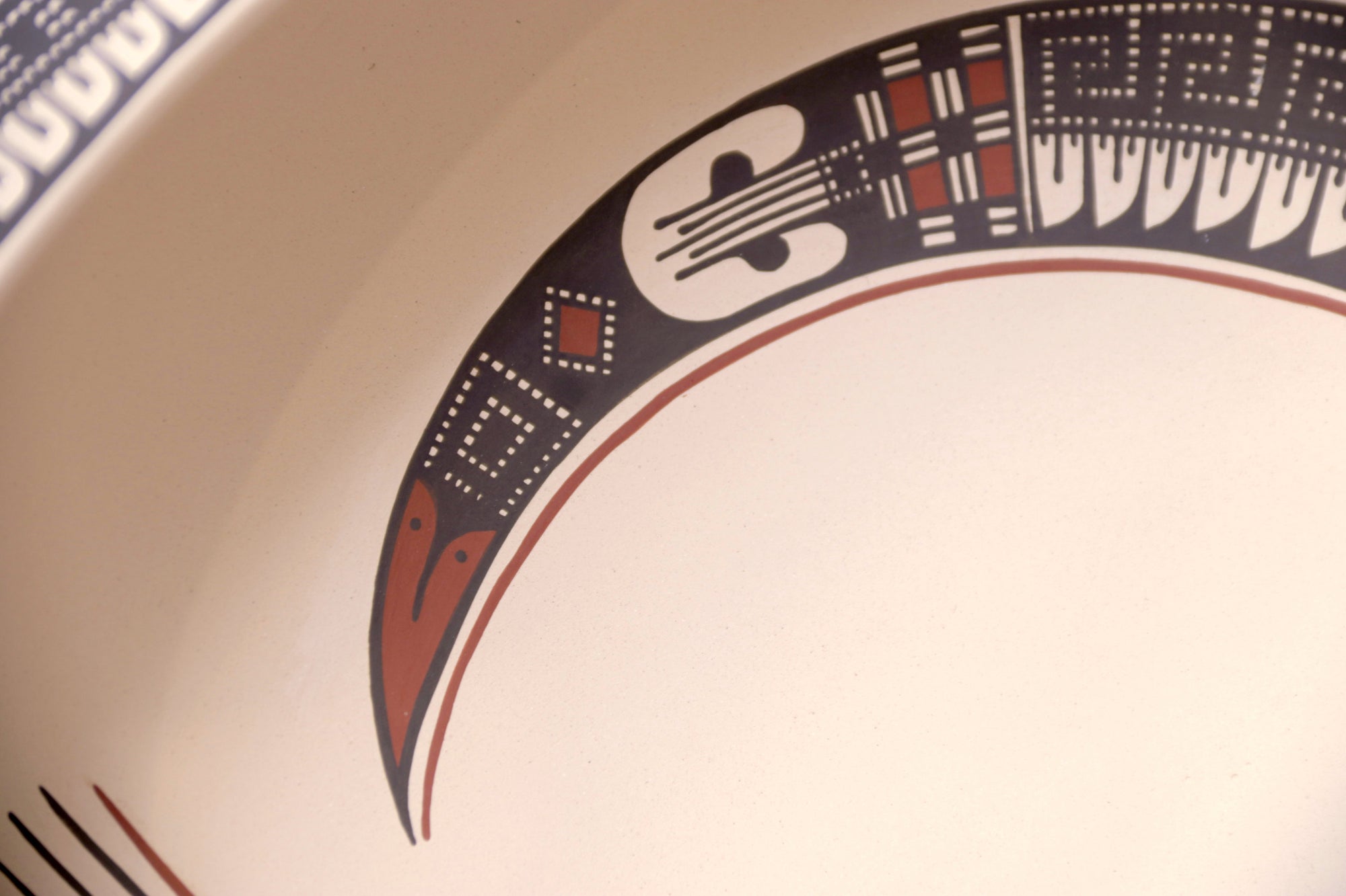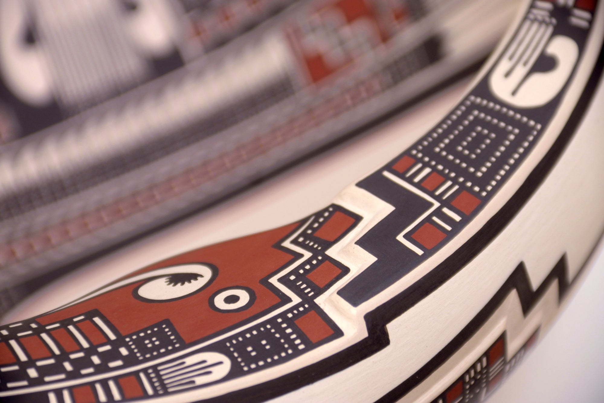 El interior está decorado con precisión milimétrica, mientras que el exterior integra un patrón continuo que remite a los códices visuales de Paquimé. Su presentación inclinada sugiere un objeto tanto funcional como simbólico, ideal para exhibición.