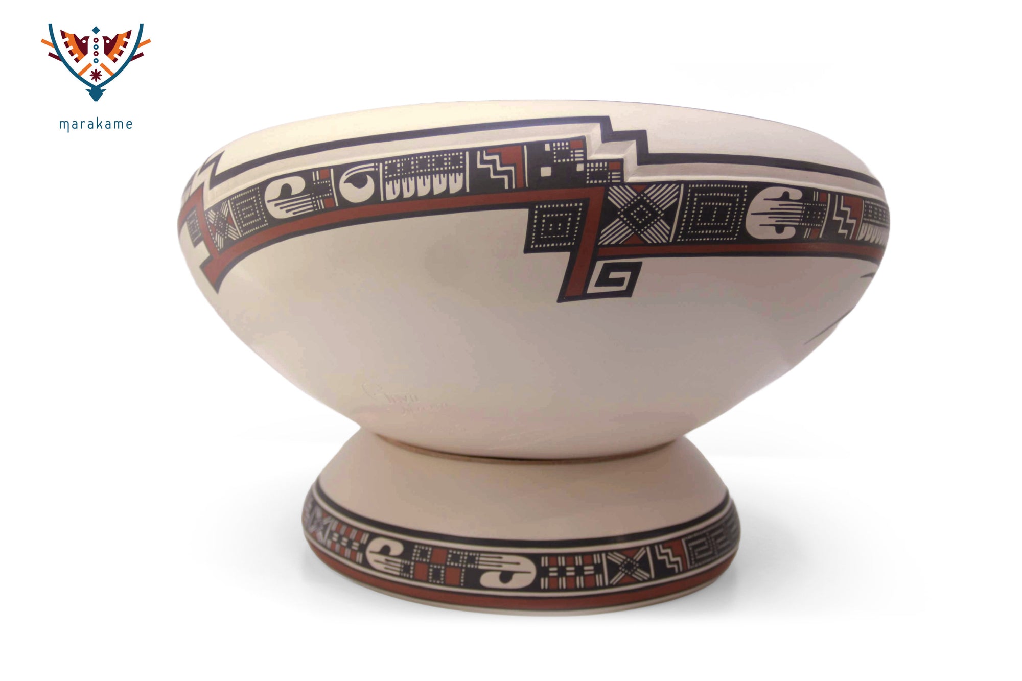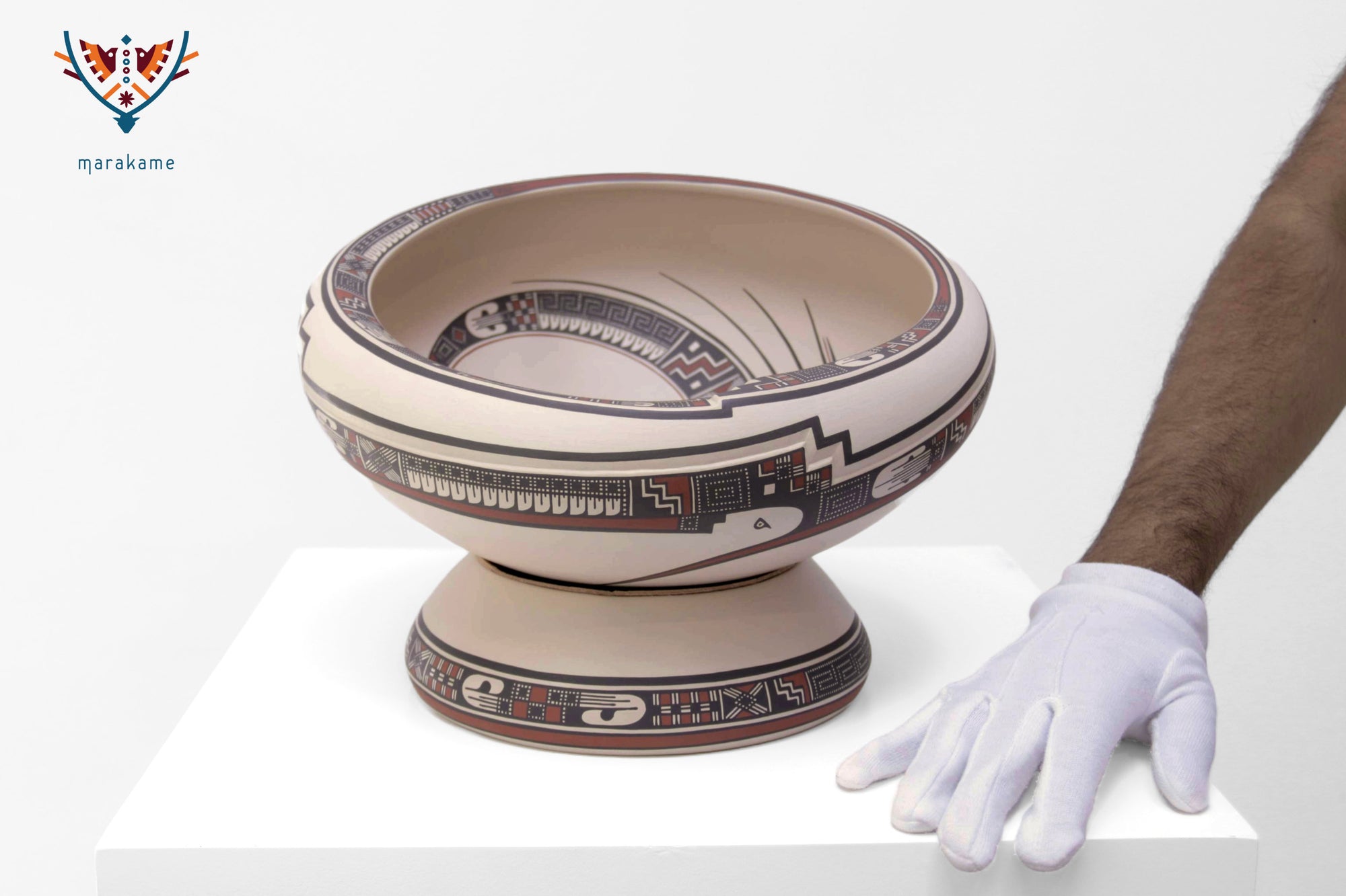 Esta pieza única representa la maestría de la cerámica de Mata Ortiz. Se trata de un plato ceremonial montado sobre pedestal, con forma perfectamente equilibrada y acabado pulido en tonos crema, negro y rojo óxido. Su decoración combina elementos geométricos tradicionales con manos estilizadas, líneas zigzagueantes, grecas y motivos abstractos que evocan la cosmovisión de los antiguos pueblos del norte de México.