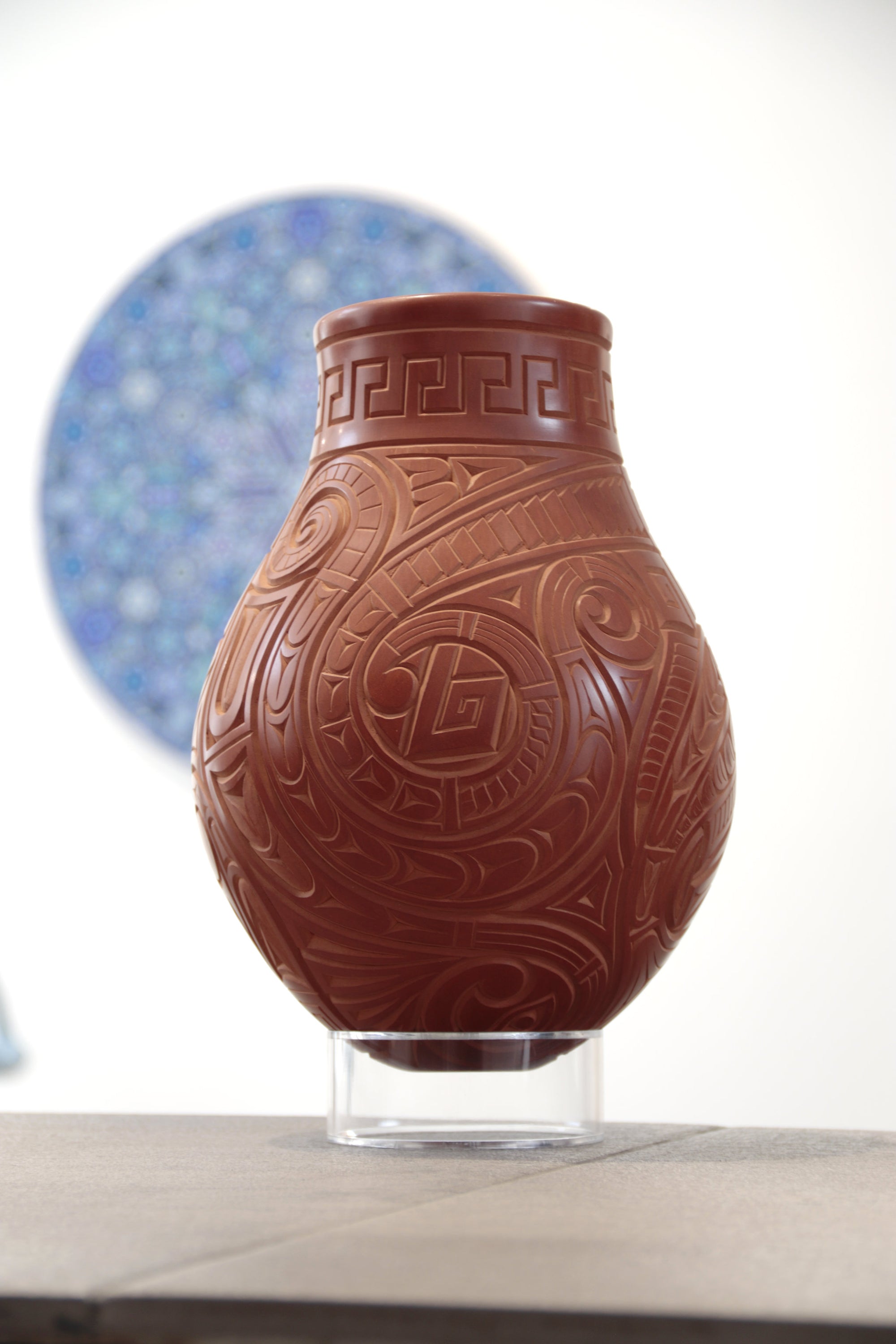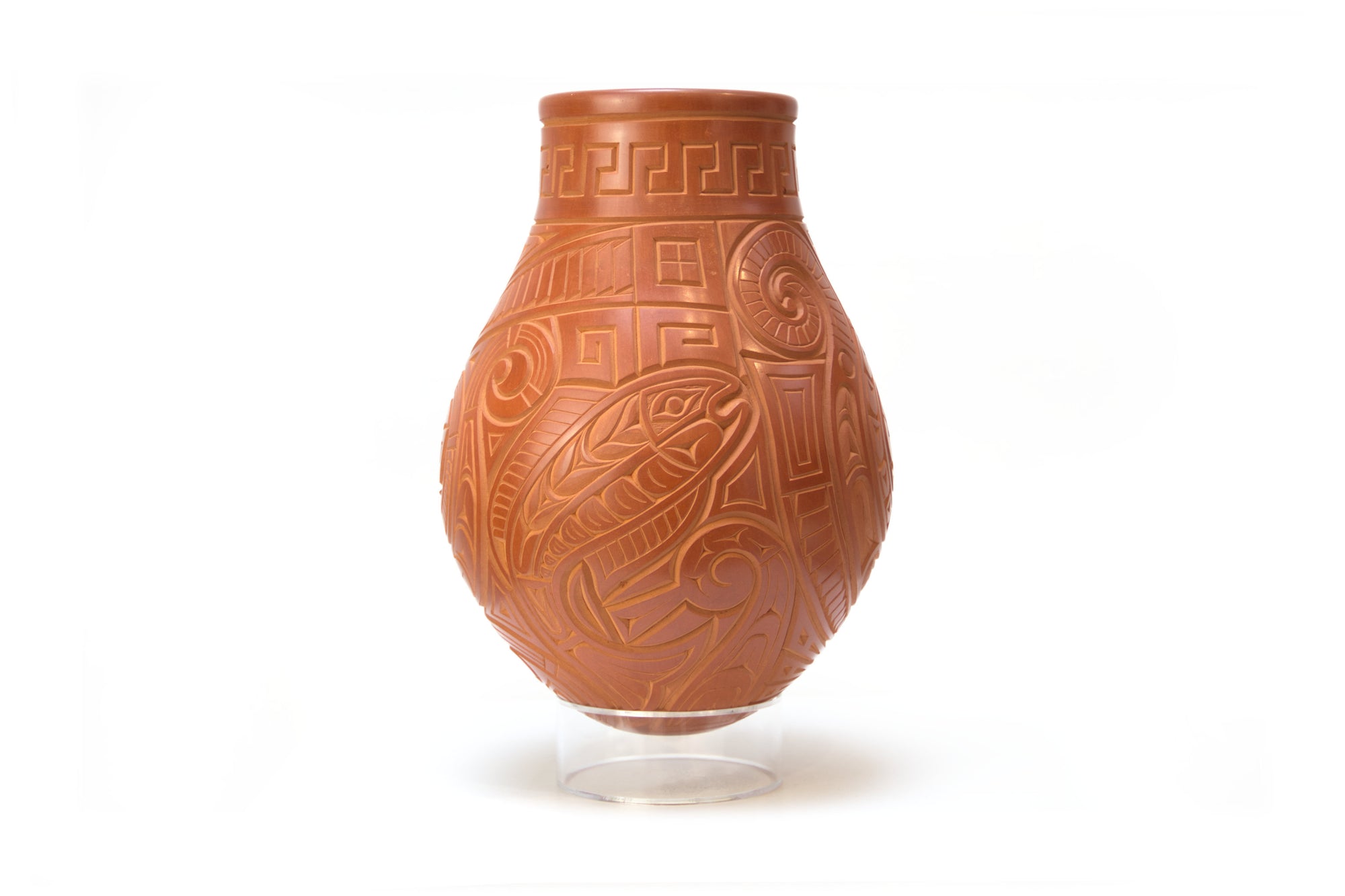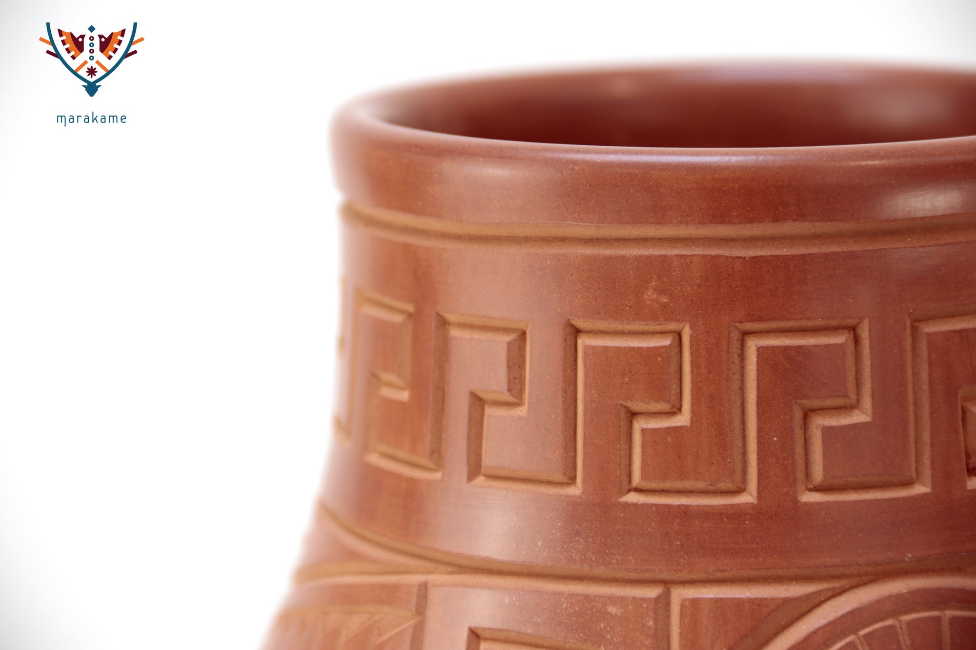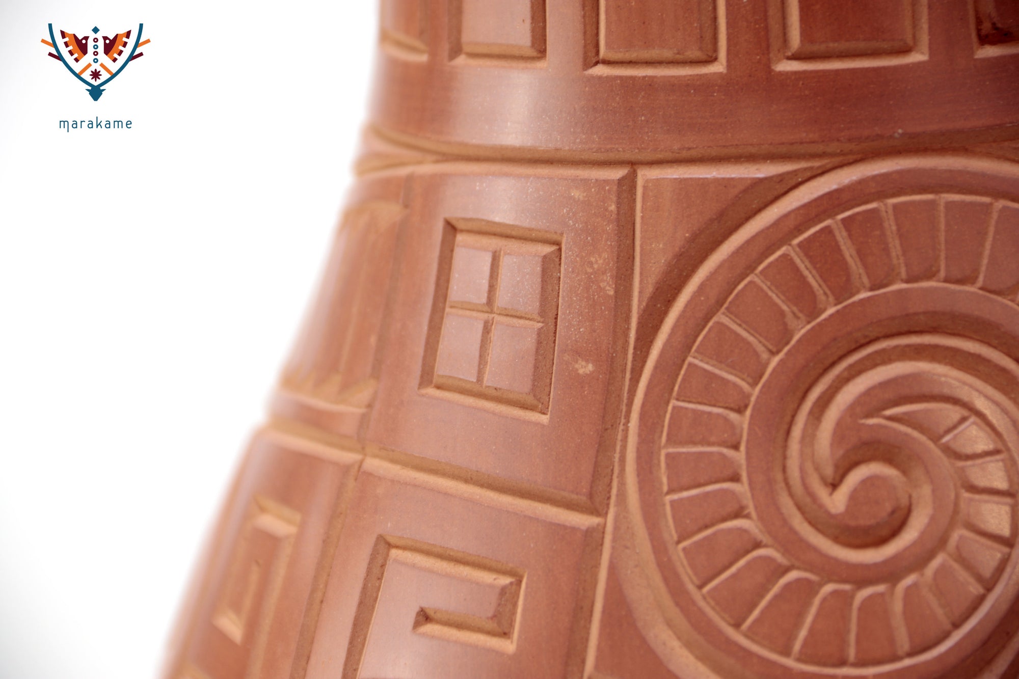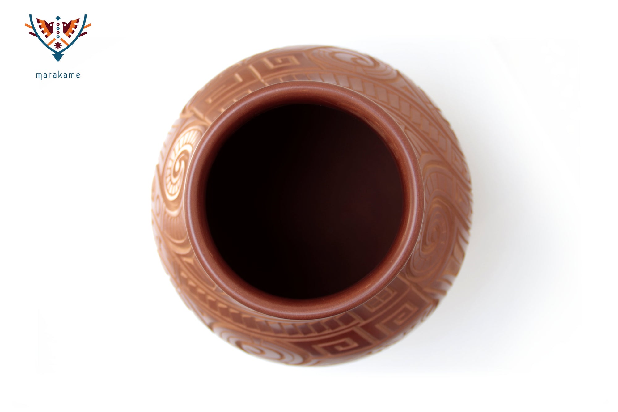 Este jarrón representa la maestría escultórica de Mata Ortiz en una pieza de barro pulido y tallado a mano con excepcional precisión. Su acabado en tonos naranja cálido remite al color natural del desierto de Chihuahua, mientras que los patrones geométricos y el pez central evocan una narrativa simbólica profundamente ligada al agua como fuente de vida y transformación.