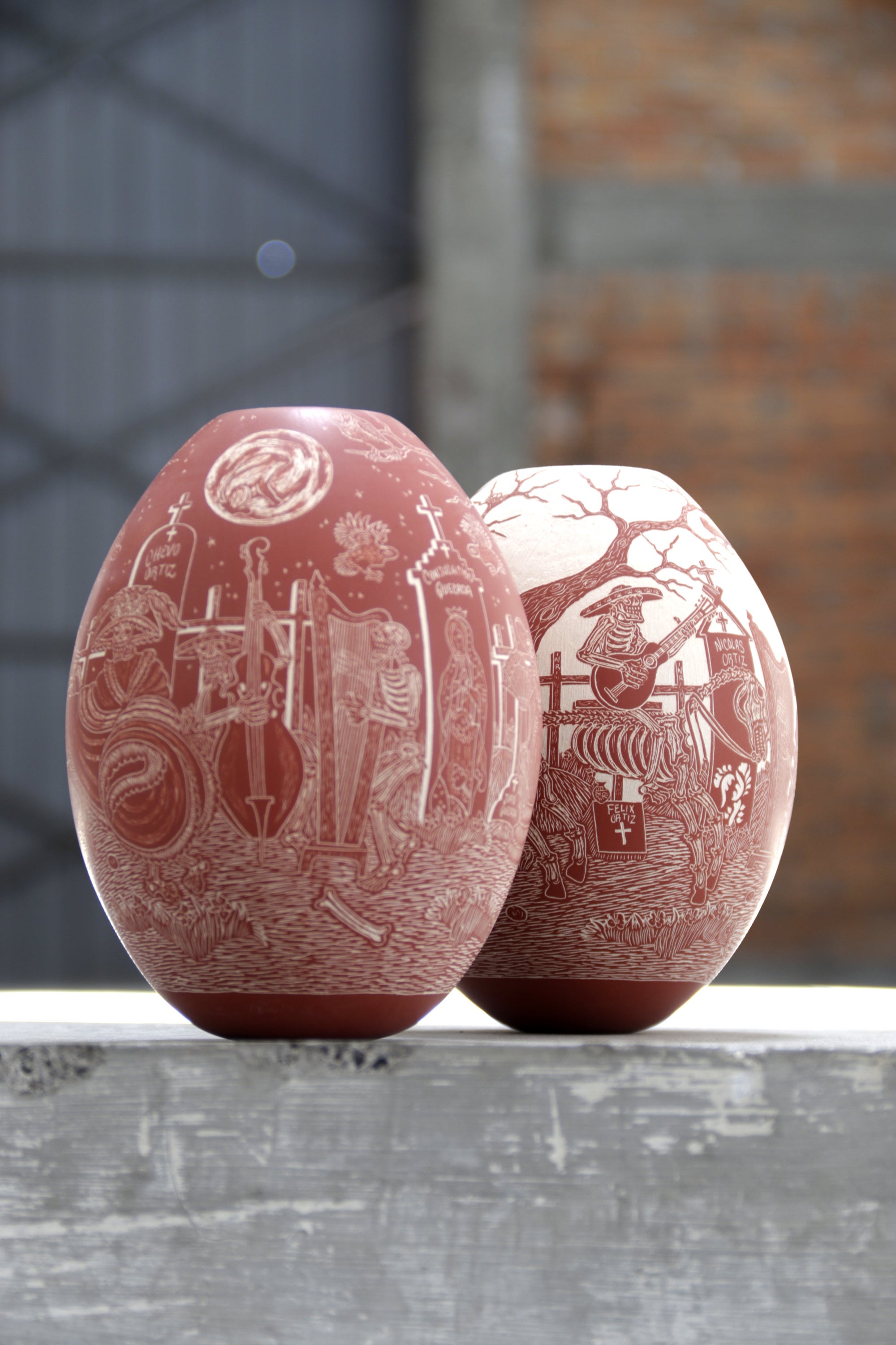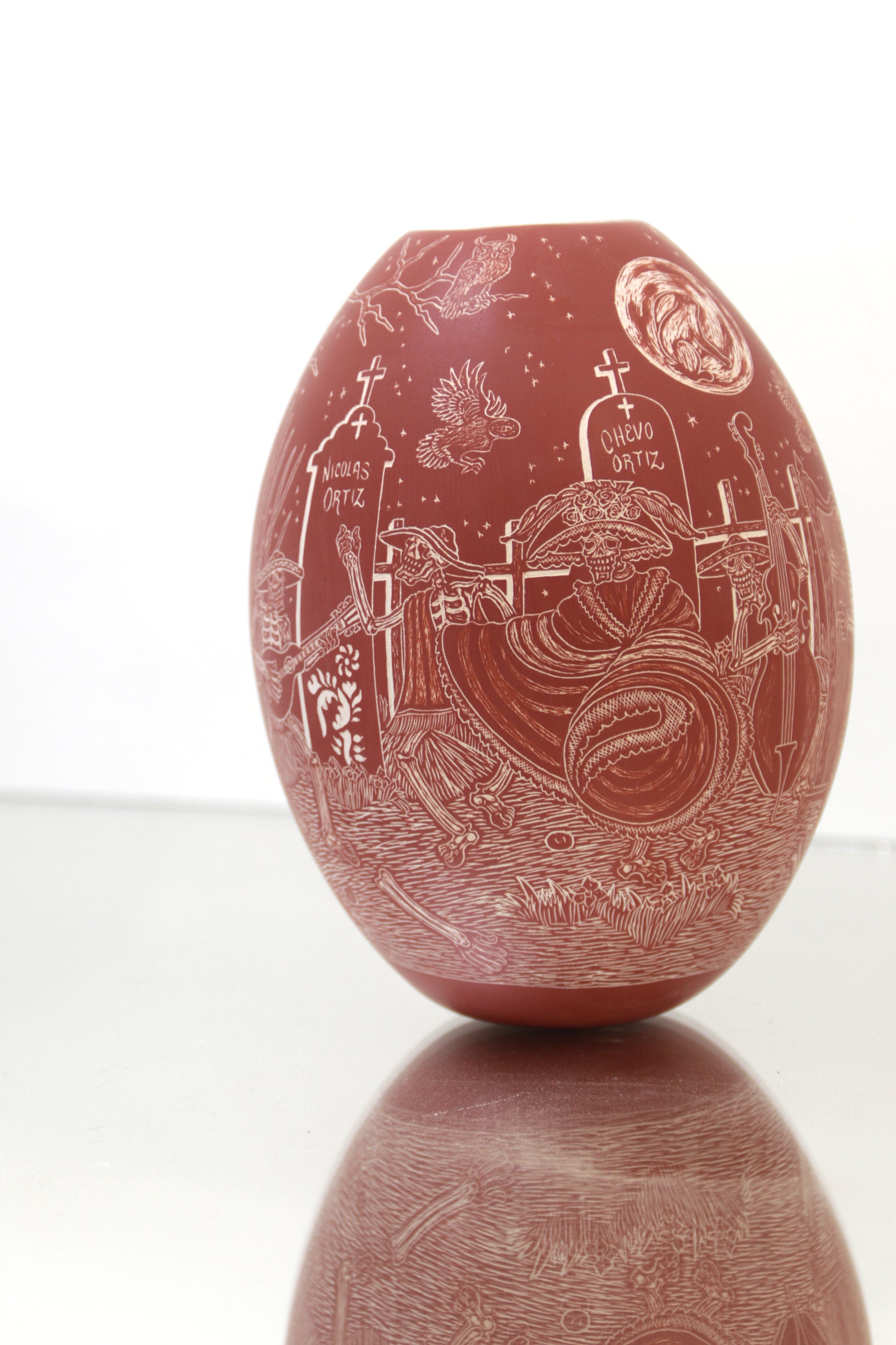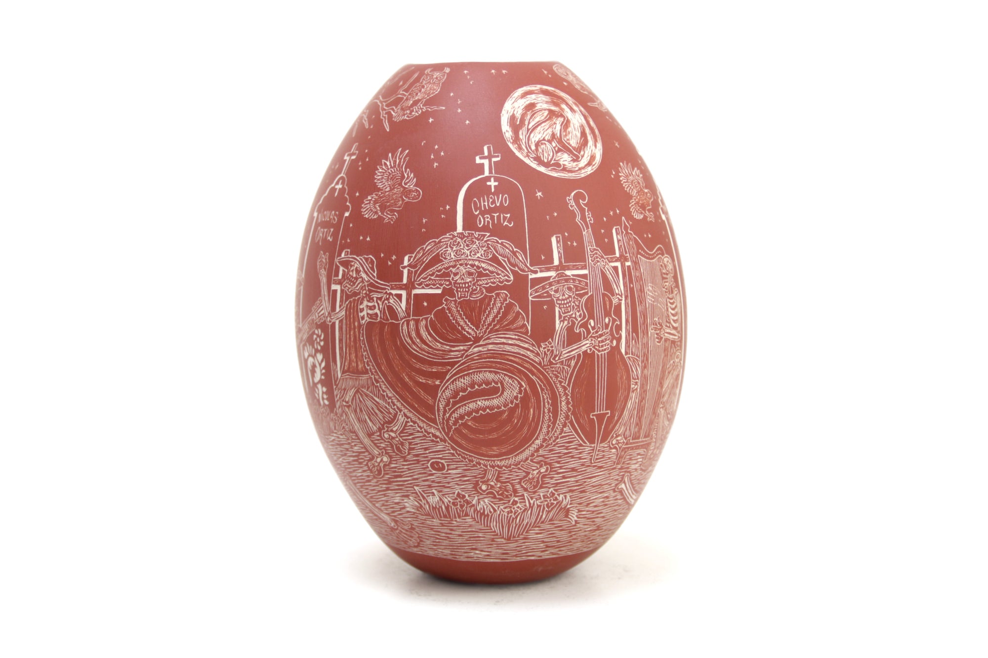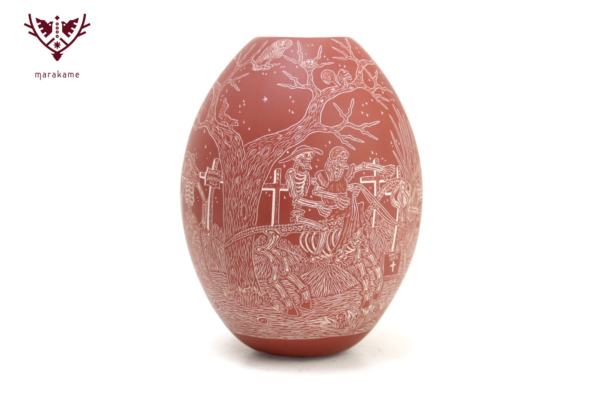 Esta magnifica pieza de cerámica de Mata Ortiz es un homenaje a la tradición y el arte mexicano, en particular al Día de Muertos. Confeccionada en cerámica fina y decorada cuidadosamente a mano, presenta imágenes talladas de Catrines, figuras emblemáticas de la celebración, interactuando en sus vidas cotidianas. Los Catrines tocan instrumentos musicales, disfrutan de una comida romántica o simplemente se relajan en un patio, mostrando que incluso en la muerte, la vida sigue siendo llena de alegría y pasión.