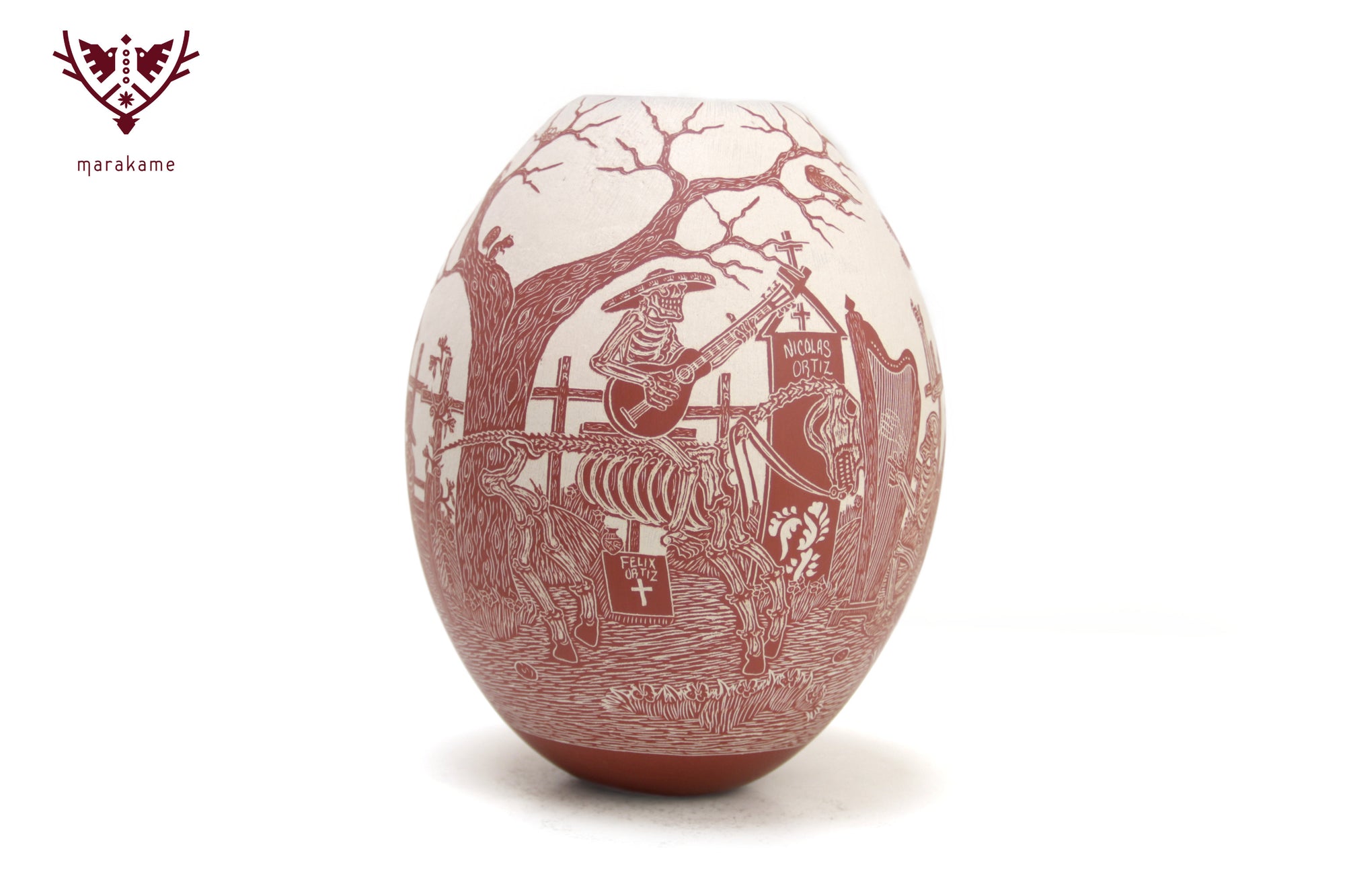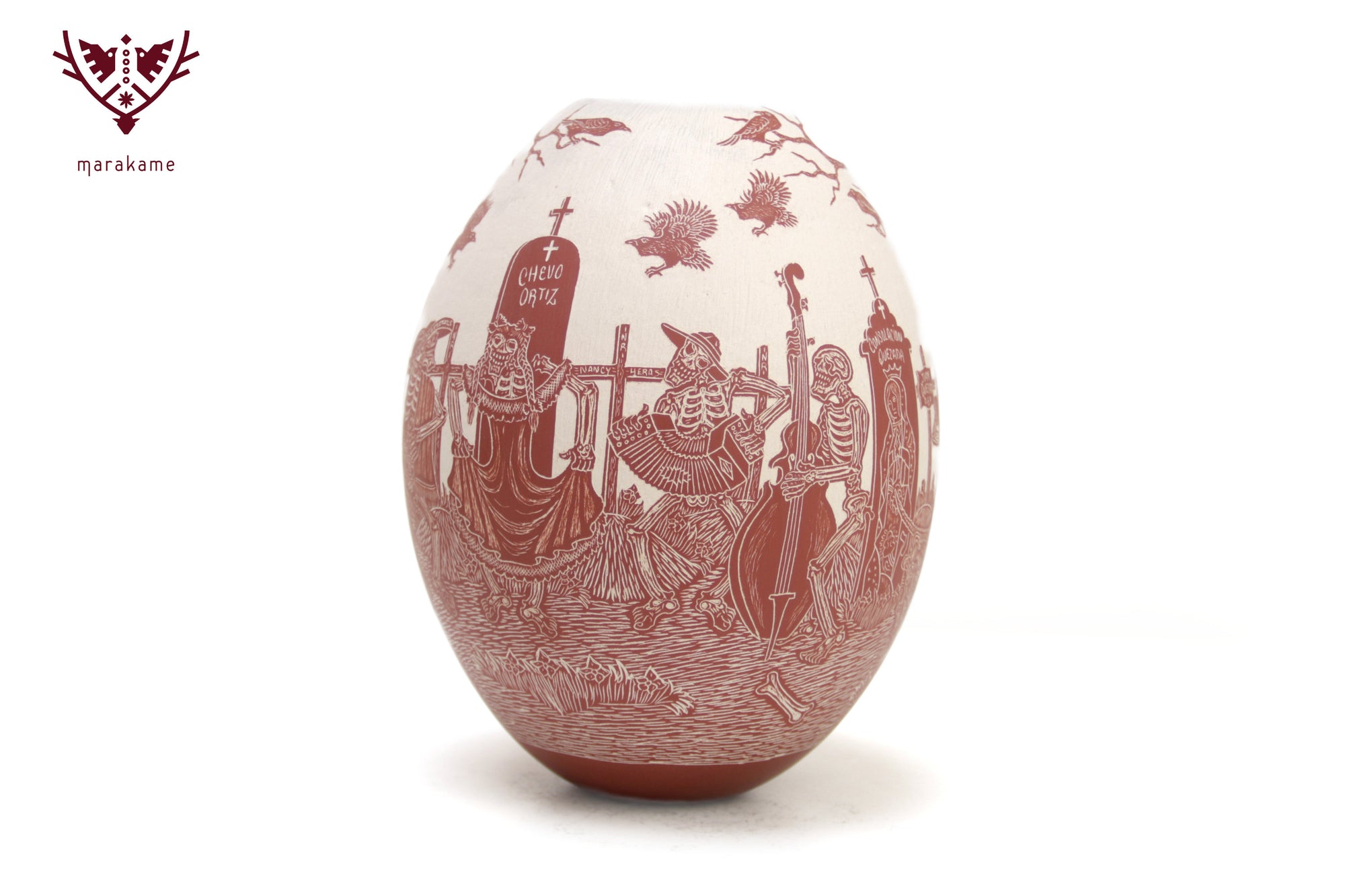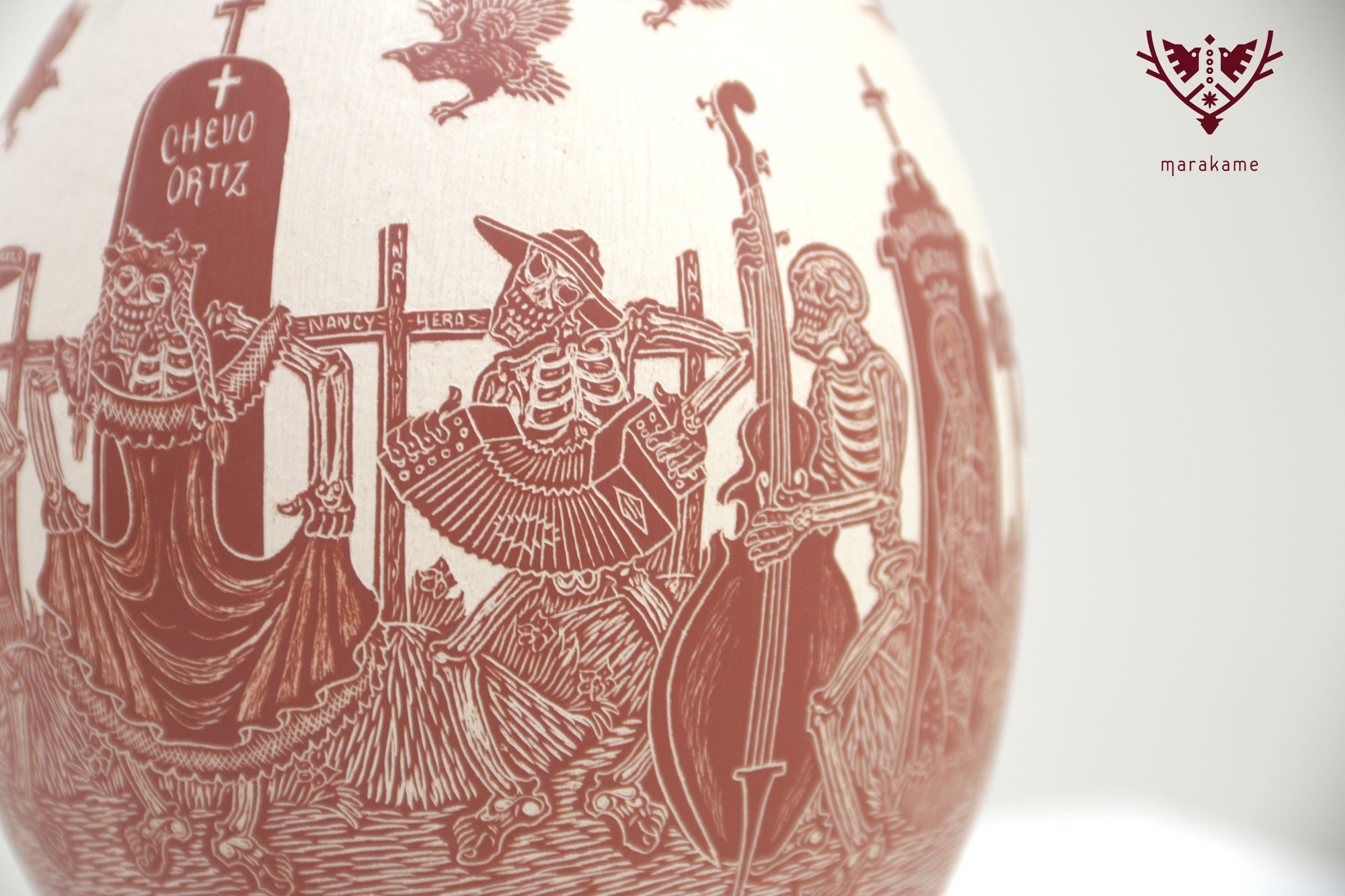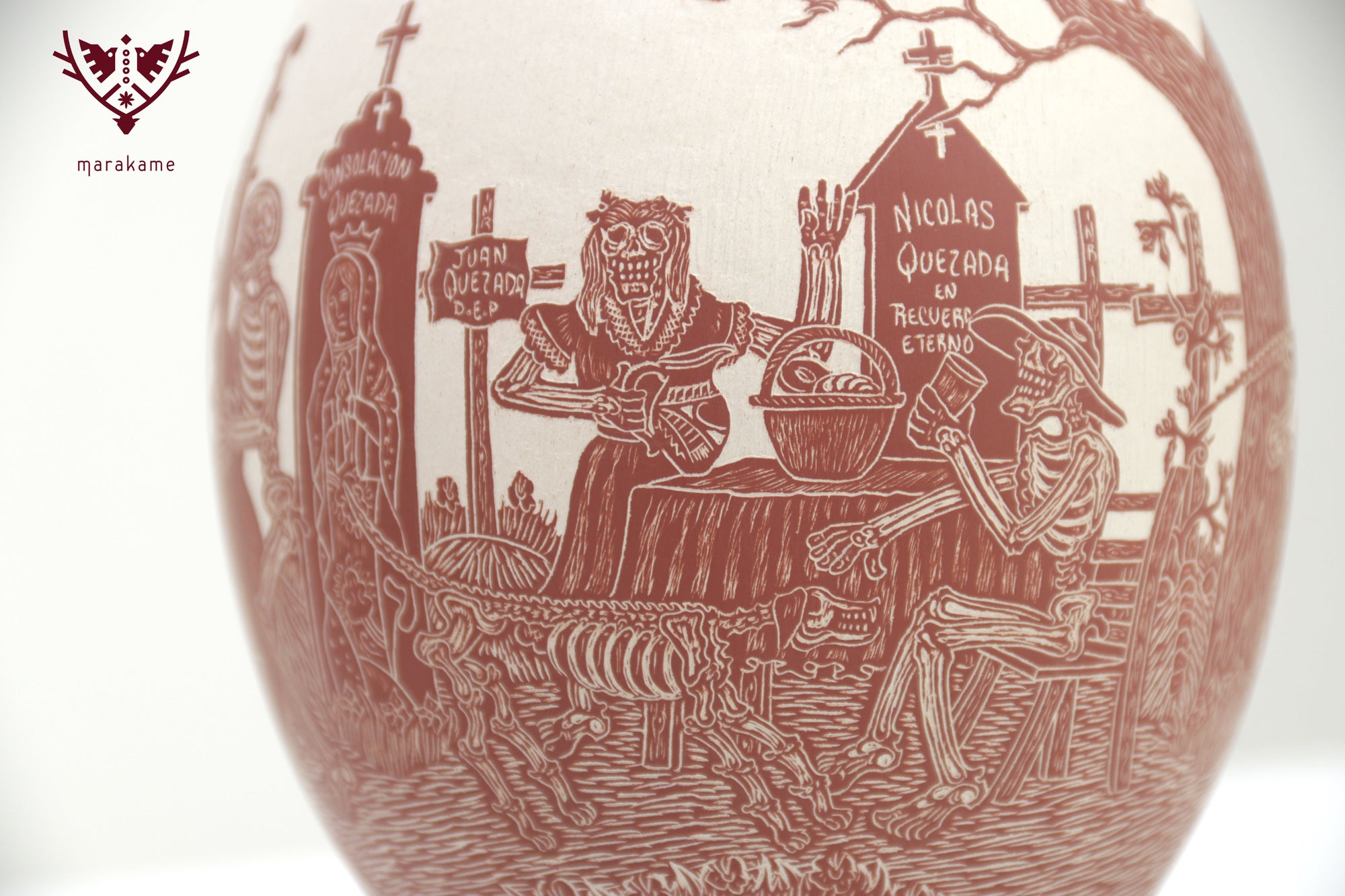Esta magnifica pieza de cerámica de Mata Ortiz es un homenaje a la tradición y el arte mexicano, en particular al Día de Muertos. Confeccionada en cerámica fina y decorada cuidadosamente a mano, presenta imágenes talladas de Catrines, figuras emblemáticas de la celebración, interactuando en sus vidas cotidianas. Los Catrines tocan instrumentos musicales, disfrutan de una comida romántica o simplemente se relajan en un patio, mostrando que incluso en la muerte, la vida sigue siendo llena de alegría y pasión.