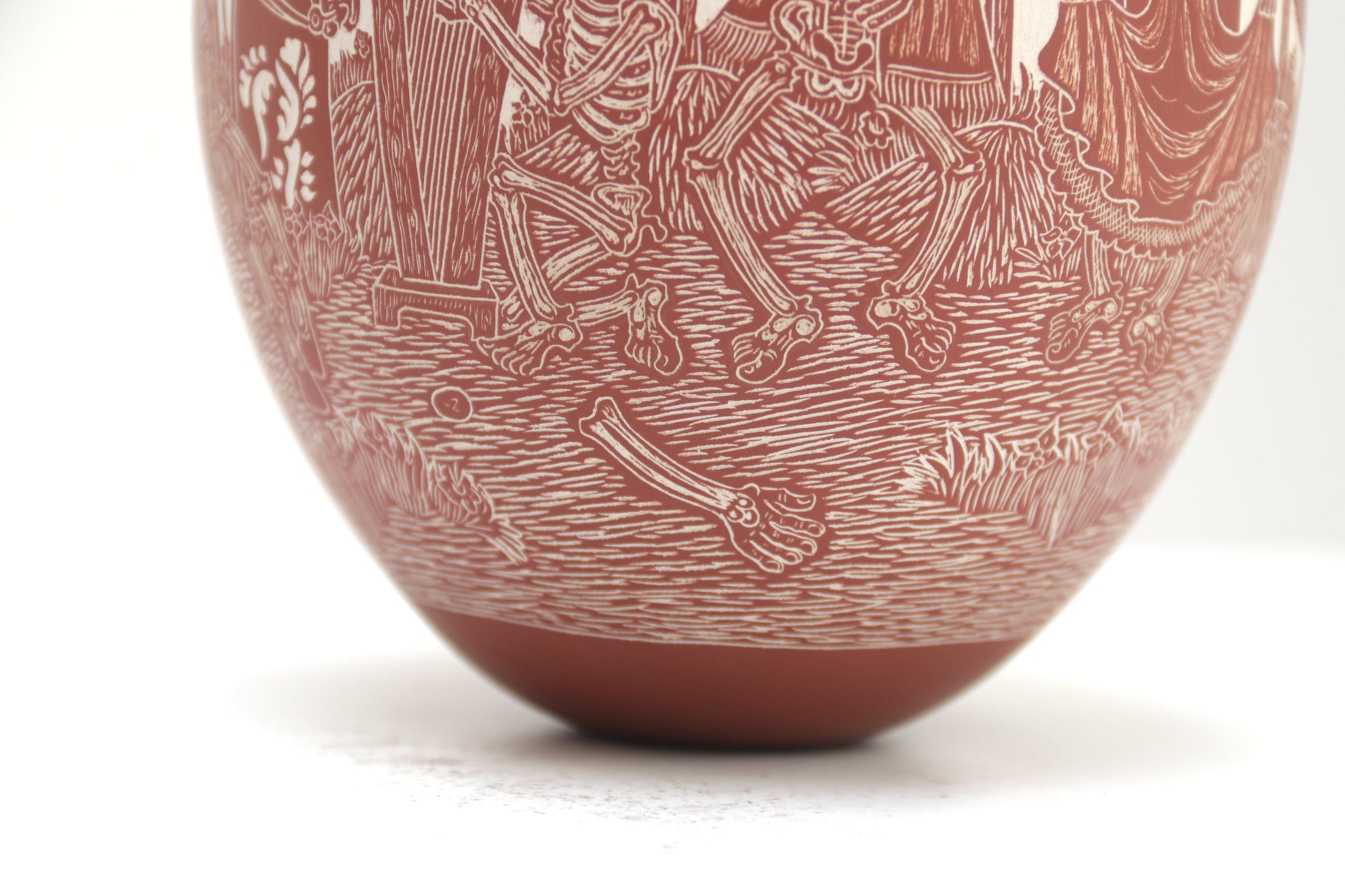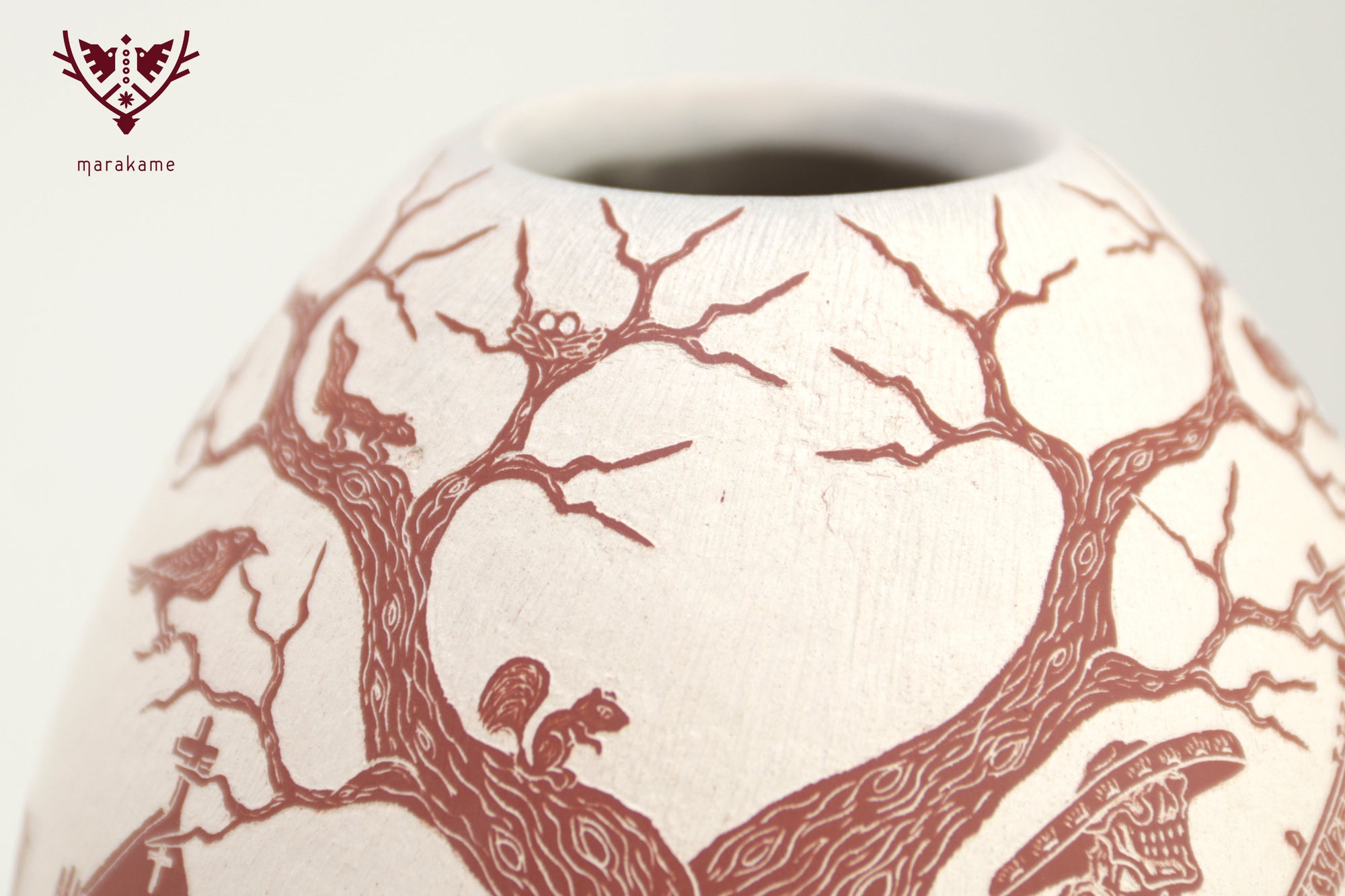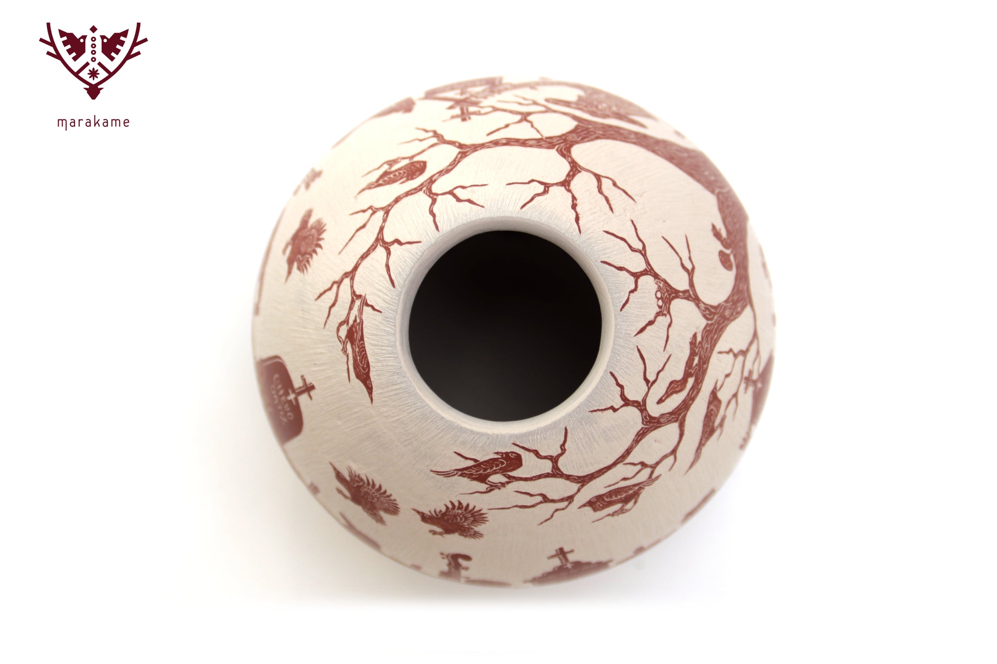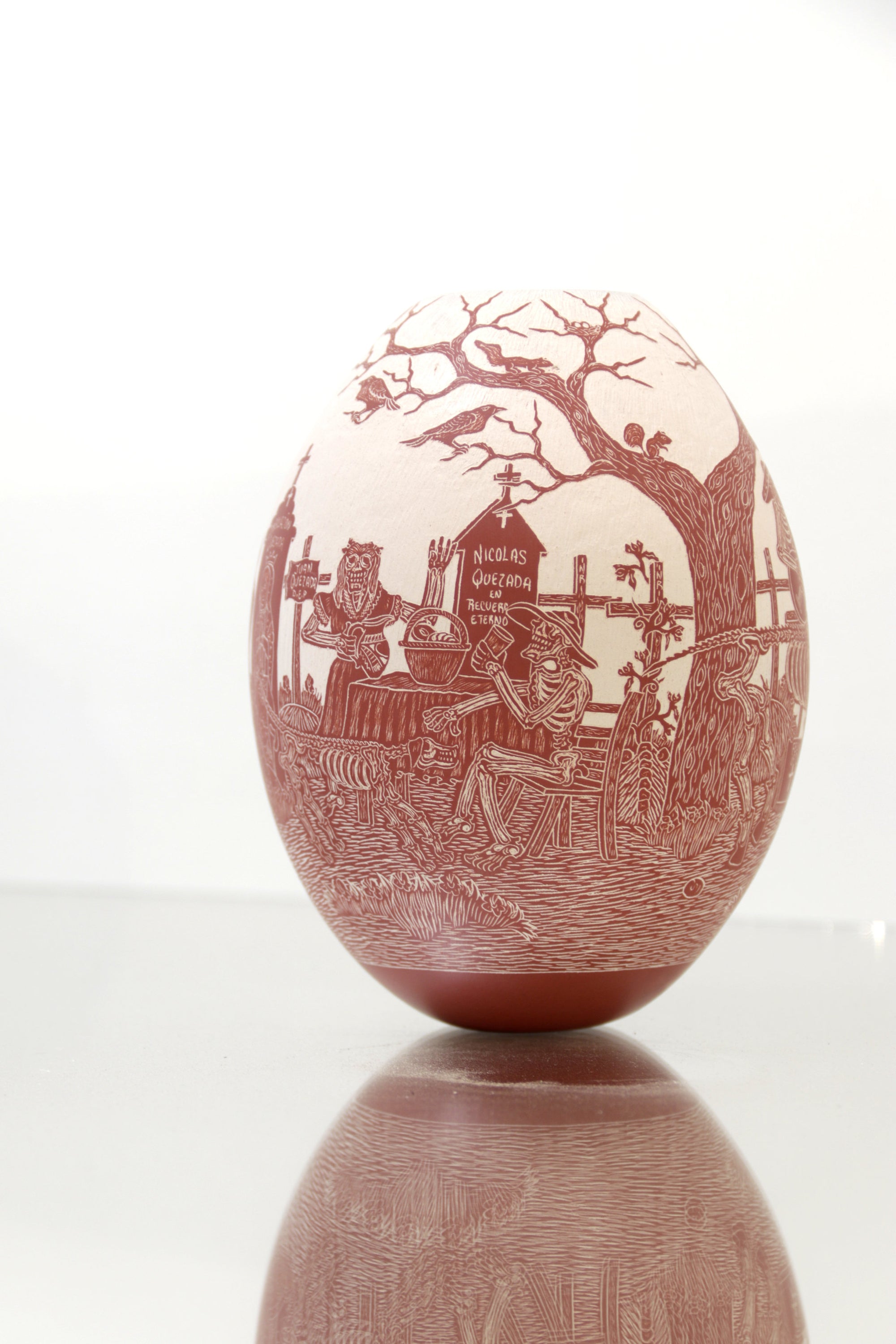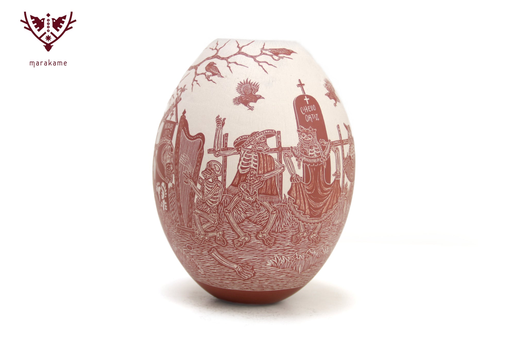 Esta magnifica pieza de cerámica de Mata Ortiz es un homenaje a la tradición y el arte mexicano, en particular al Día de Muertos. Confeccionada en cerámica fina y decorada cuidadosamente a mano, presenta imágenes talladas de Catrines, figuras emblemáticas de la celebración, interactuando en sus vidas cotidianas. Los Catrines tocan instrumentos musicales, disfrutan de una comida romántica o simplemente se relajan en un patio, mostrando que incluso en la muerte, la vida sigue siendo llena de alegría y pasión.