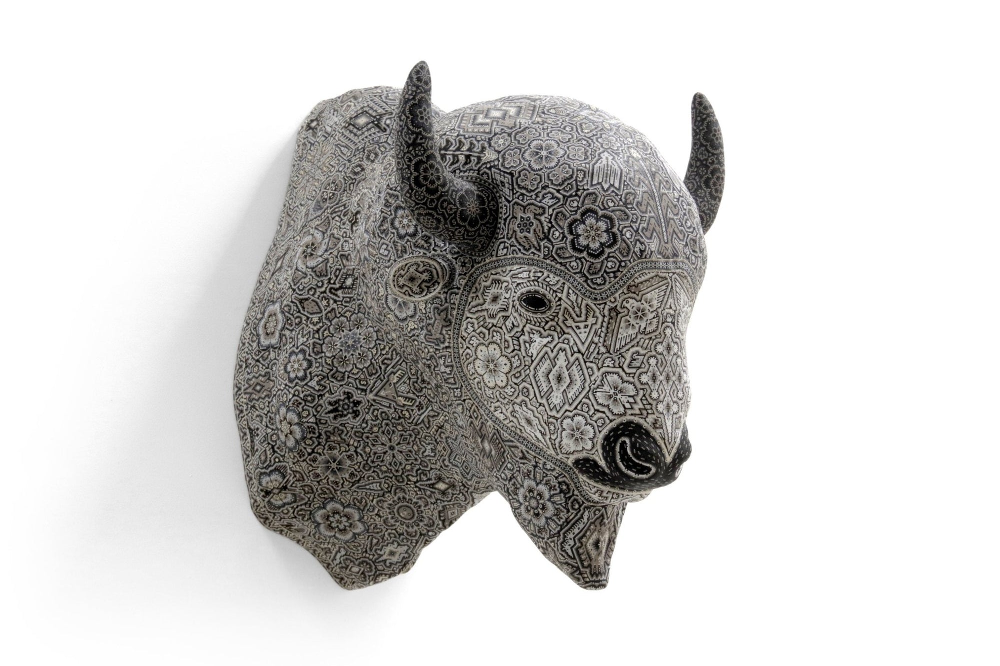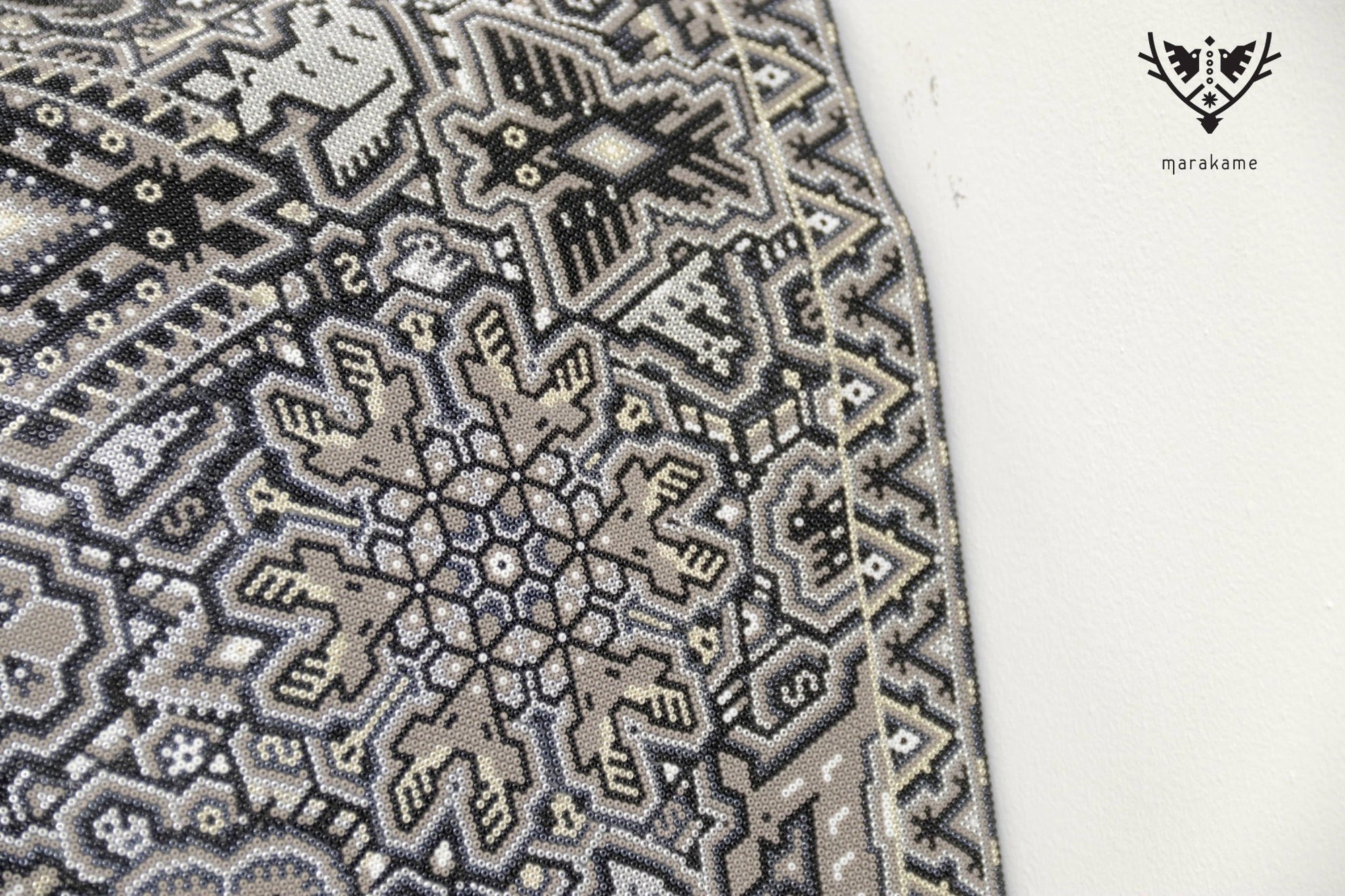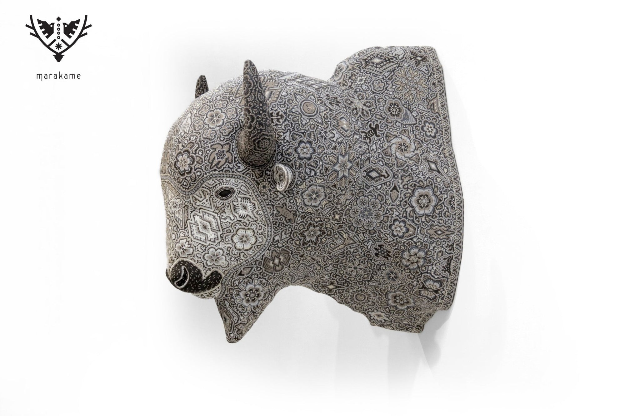 El bisonte, guardián espiritual de muchos pueblos de Norteamérica, se convierte en este caso en un mensajero de la visión wixárika, en donde los patrones geométricos, los ojos de Dios y los caminos de híkuri tejen un relato de protección, fuerza y equilibrio con la naturaleza.
