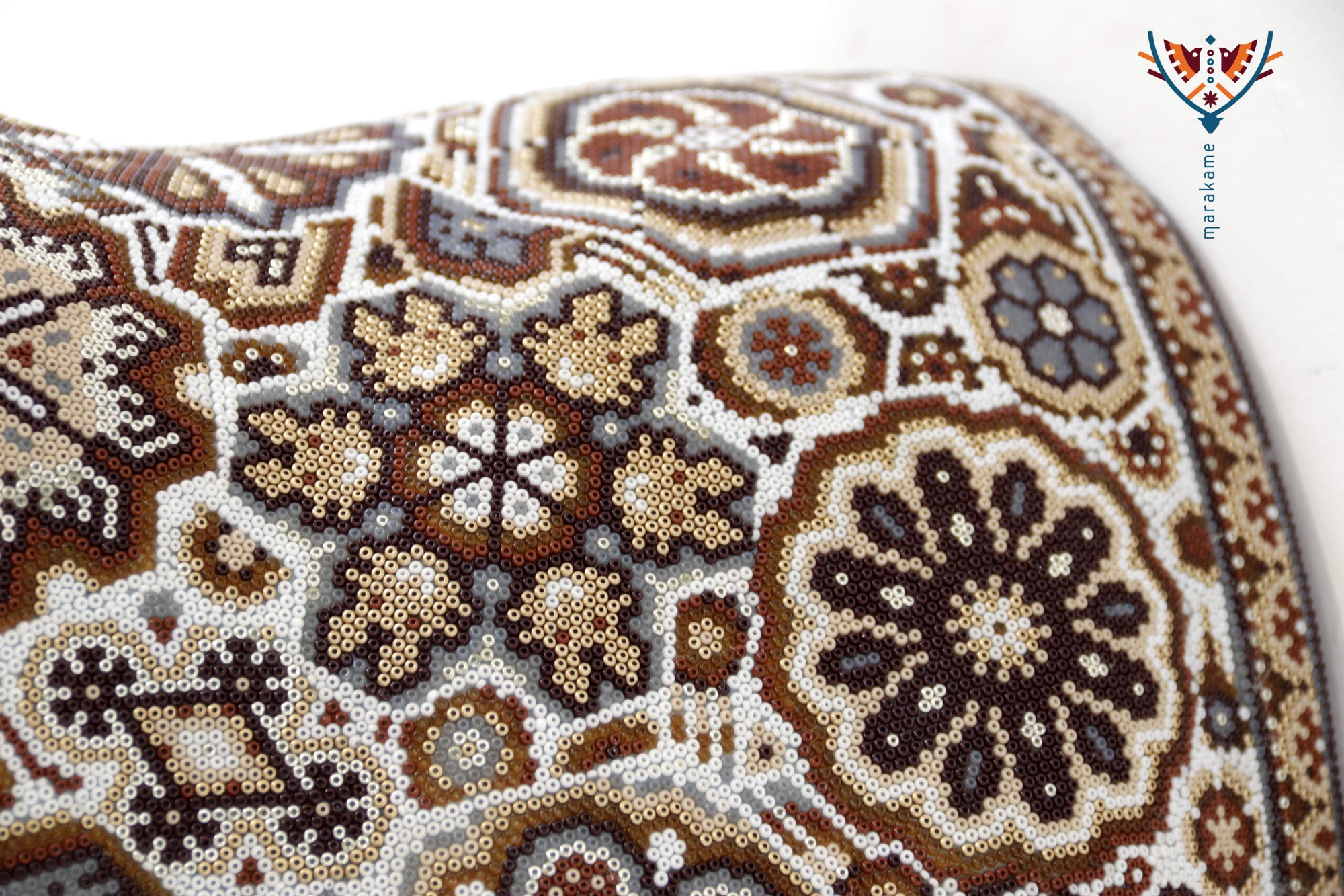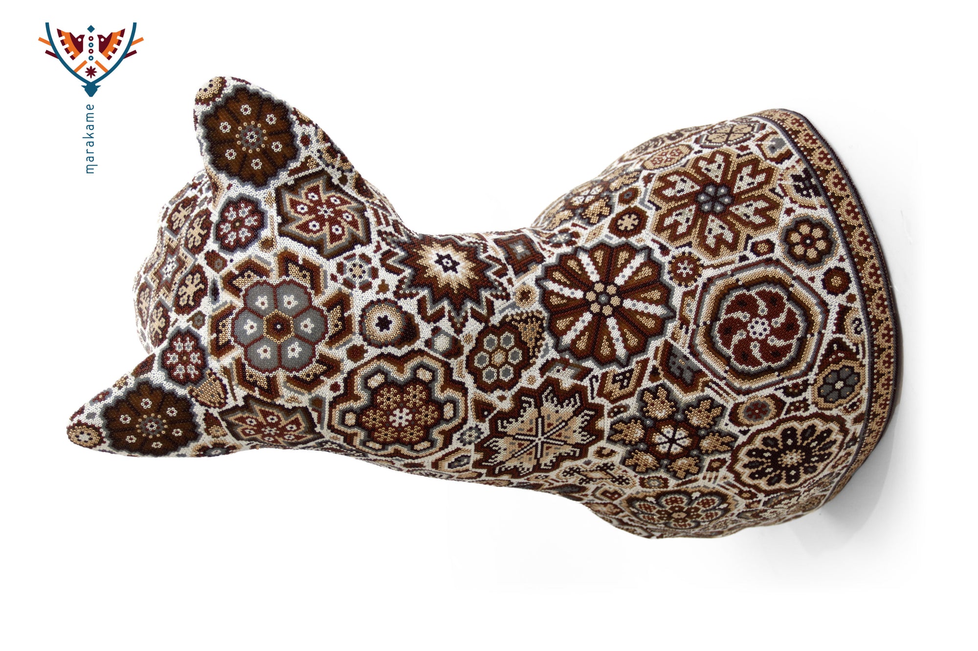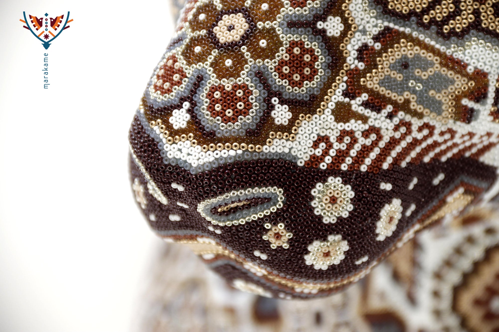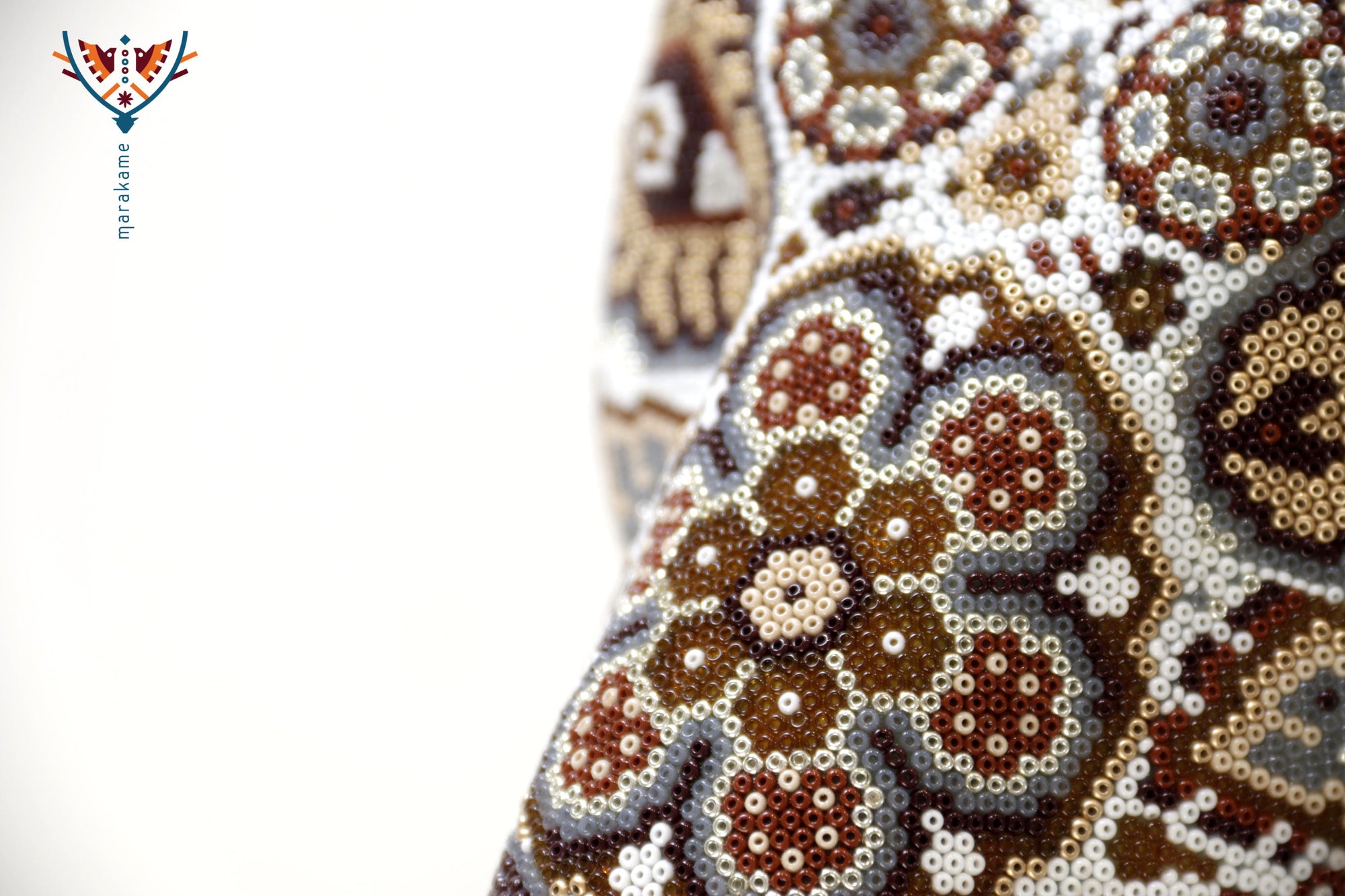 Esta escultura en forma de busto, diseñada por Arte Marakame, fue realizada en México y revestida con chaquira de cristal checoslovaca por la artista visionaria wixárika Ramona de la Cruz, originaria de Tatei Kié, San Andrés Cohamiata, Jalisco. El diseño cromático, inusualmente basado en un fondo blanco, confiere a la pieza una luminosidad sobria, limpia, casi ritual. Sobre esa base, se desarrollan patrones simbólicos en tonos terrosos, cafés, vino y negro, evocando la tierra, la noche, y el fuego contenido.
