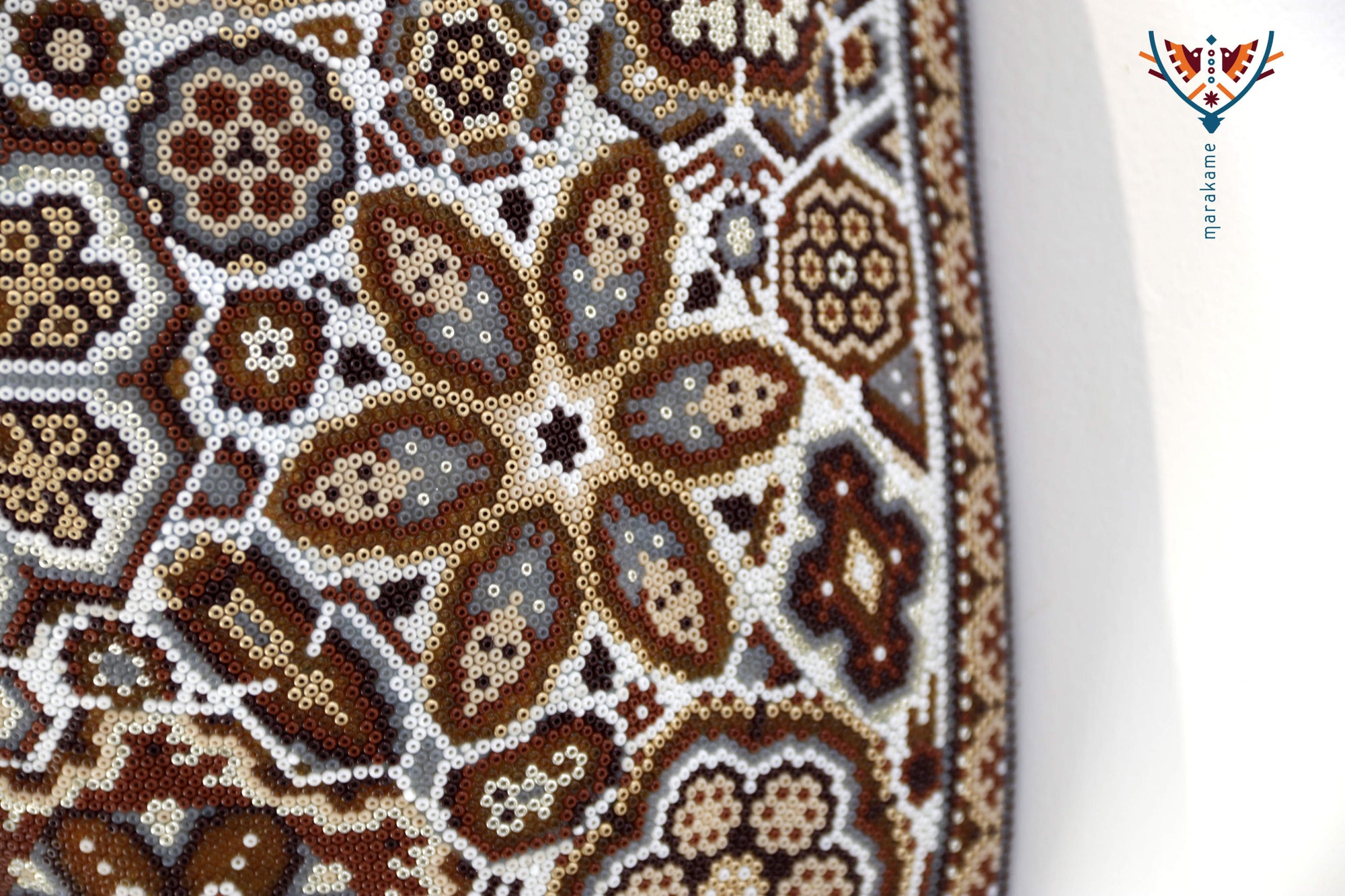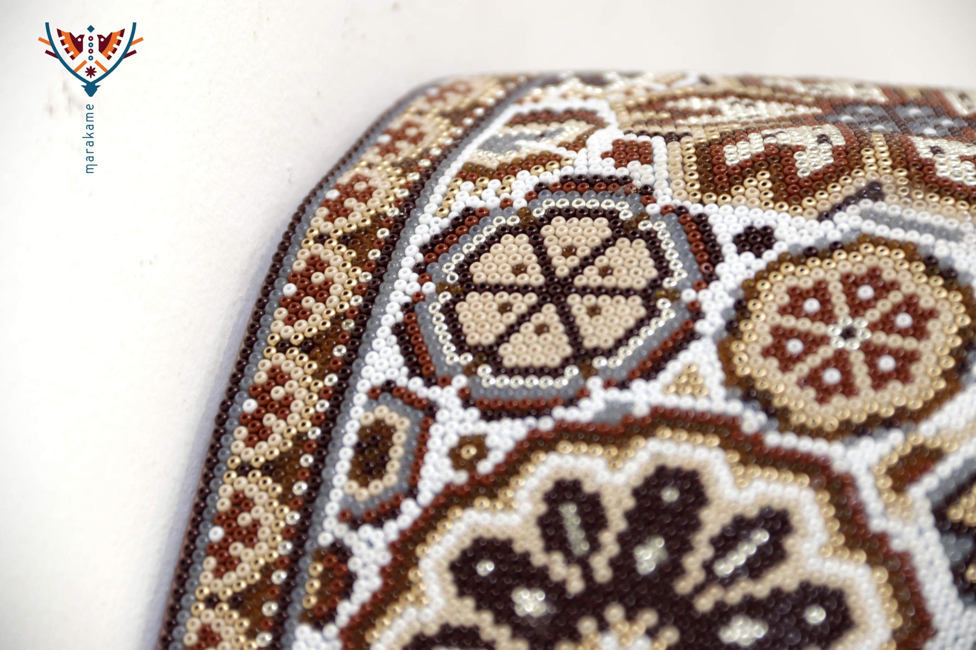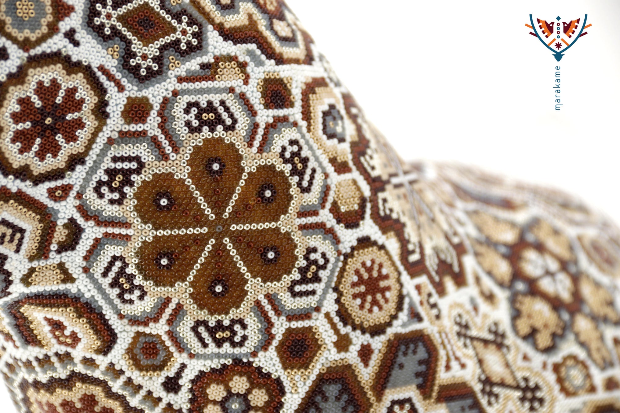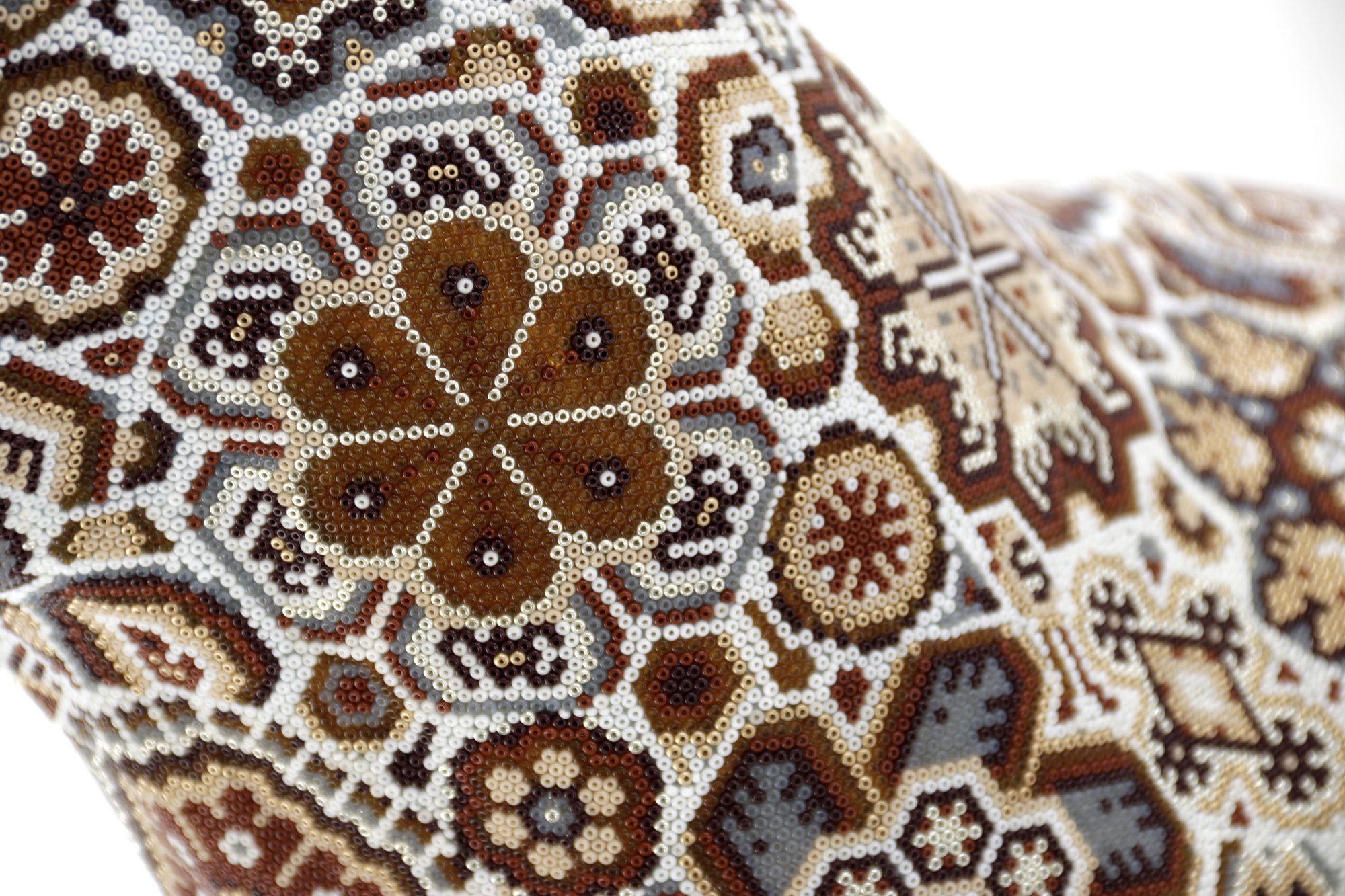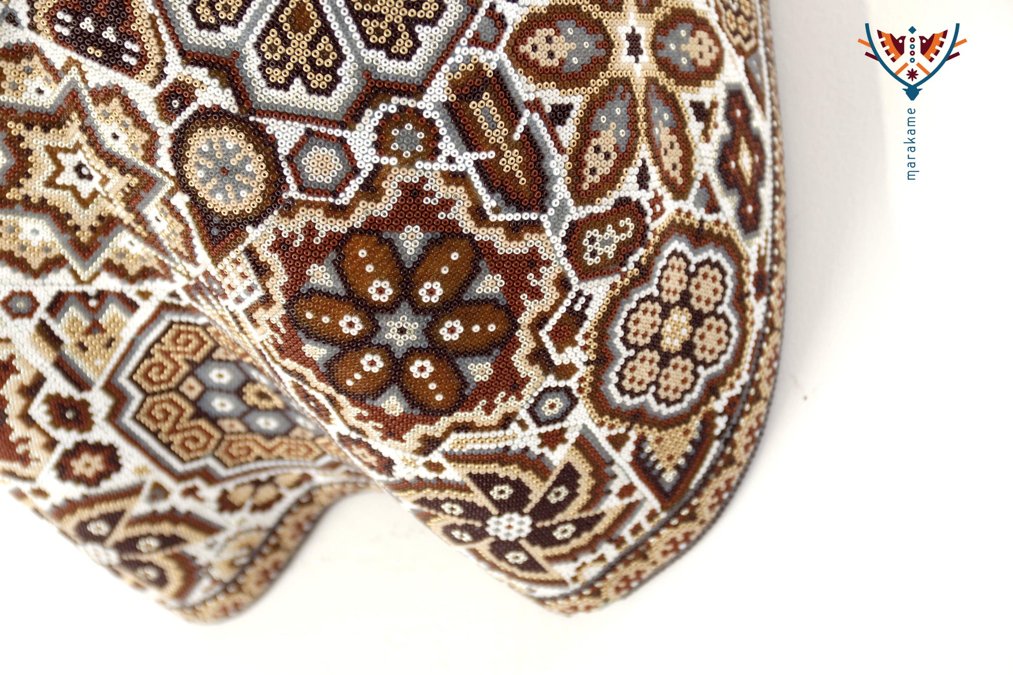 Esta escultura en forma de busto, diseñada por Arte Marakame, fue realizada en México y revestida con chaquira de cristal checoslovaca por la artista visionaria wixárika Ramona de la Cruz, originaria de Tatei Kié, San Andrés Cohamiata, Jalisco. El diseño cromático, inusualmente basado en un fondo blanco, confiere a la pieza una luminosidad sobria, limpia, casi ritual. Sobre esa base, se desarrollan patrones simbólicos en tonos terrosos, cafés, vino y negro, evocando la tierra, la noche, y el fuego contenido.