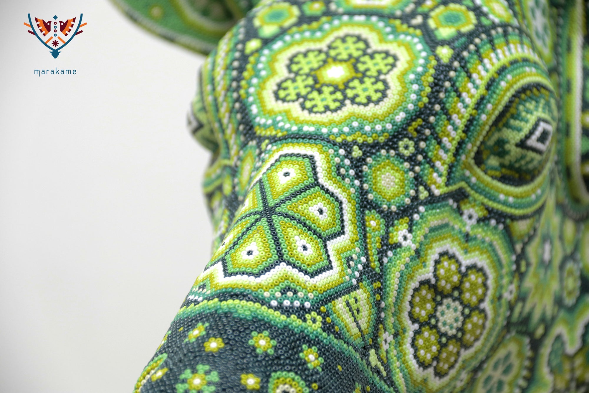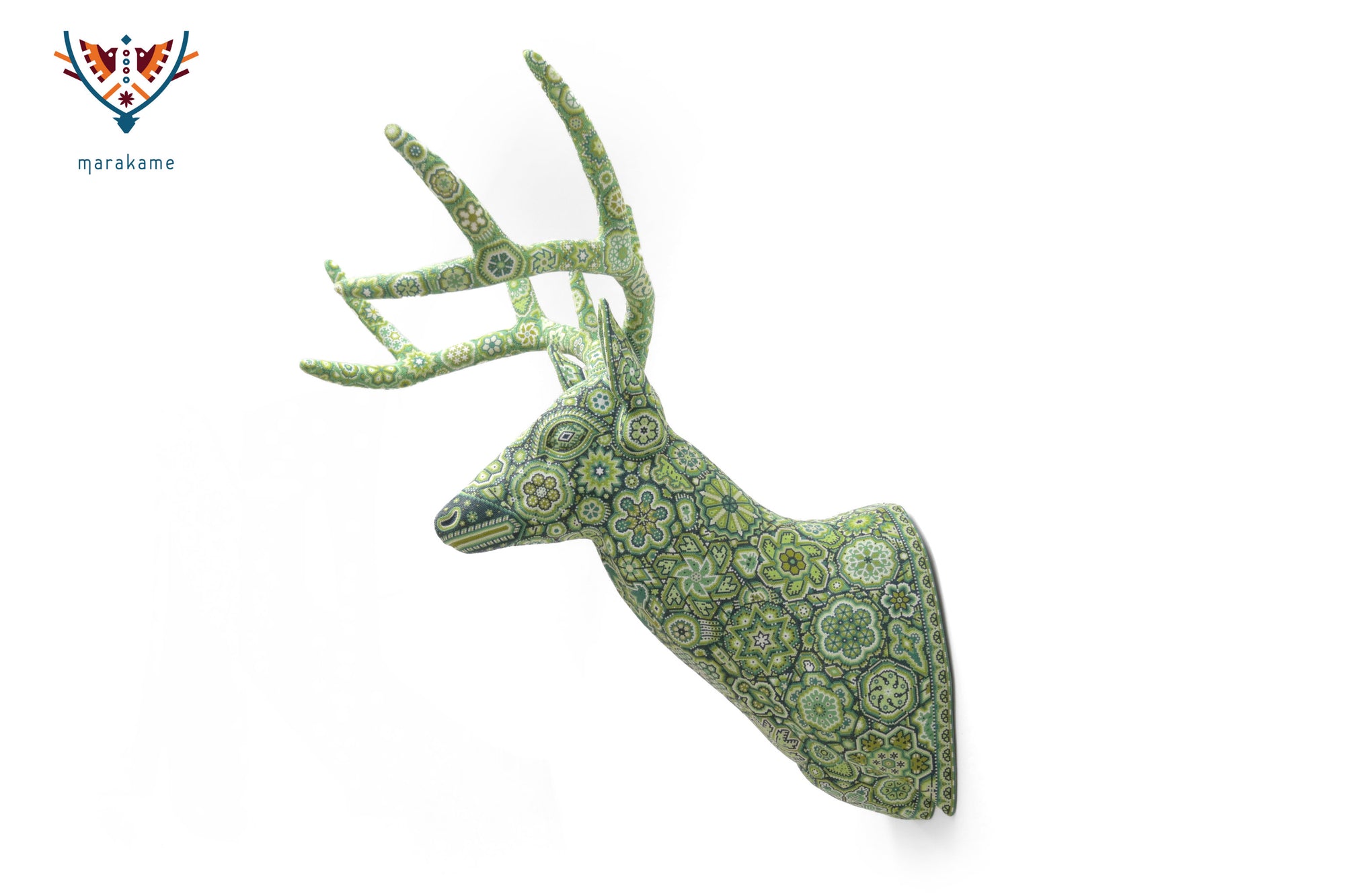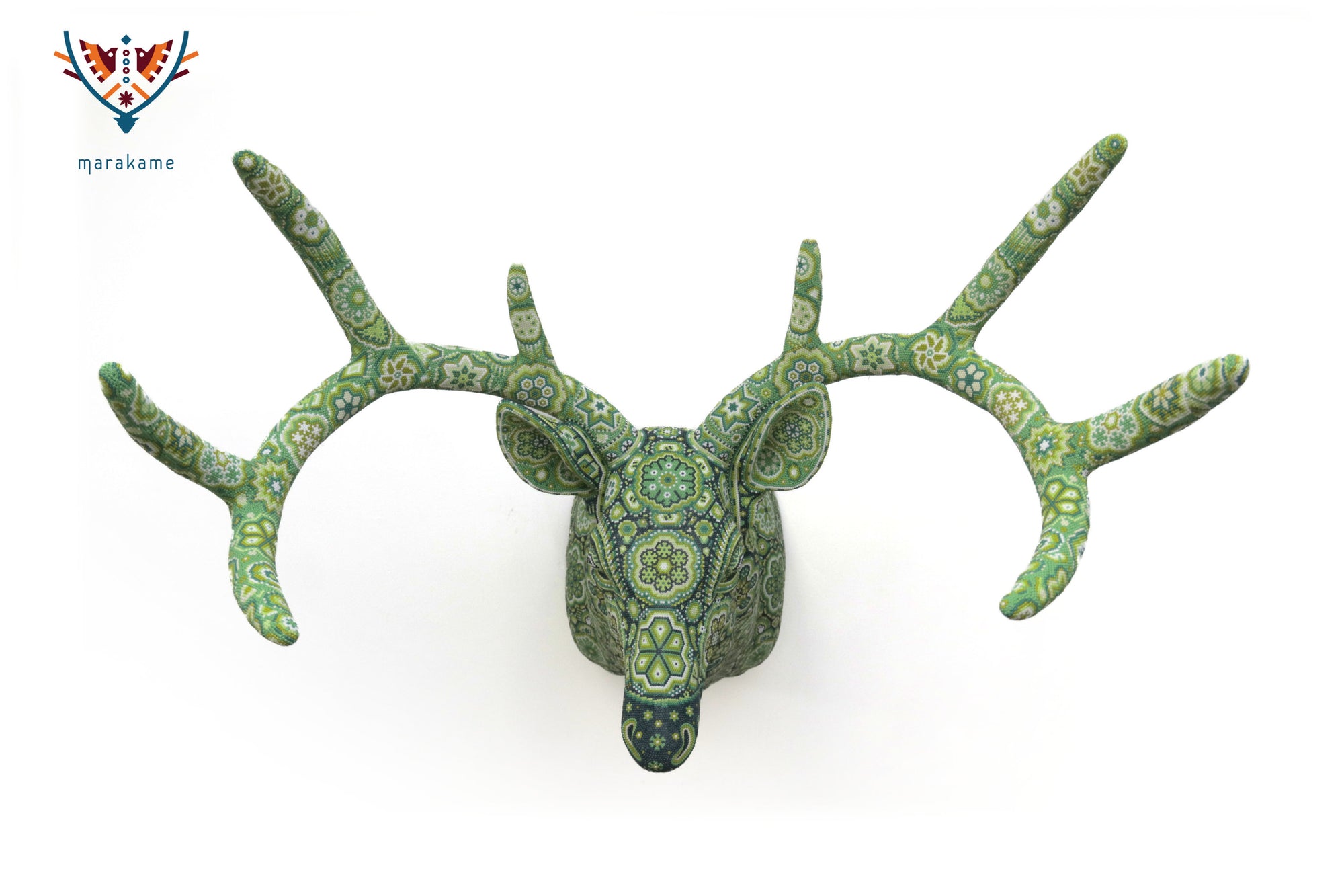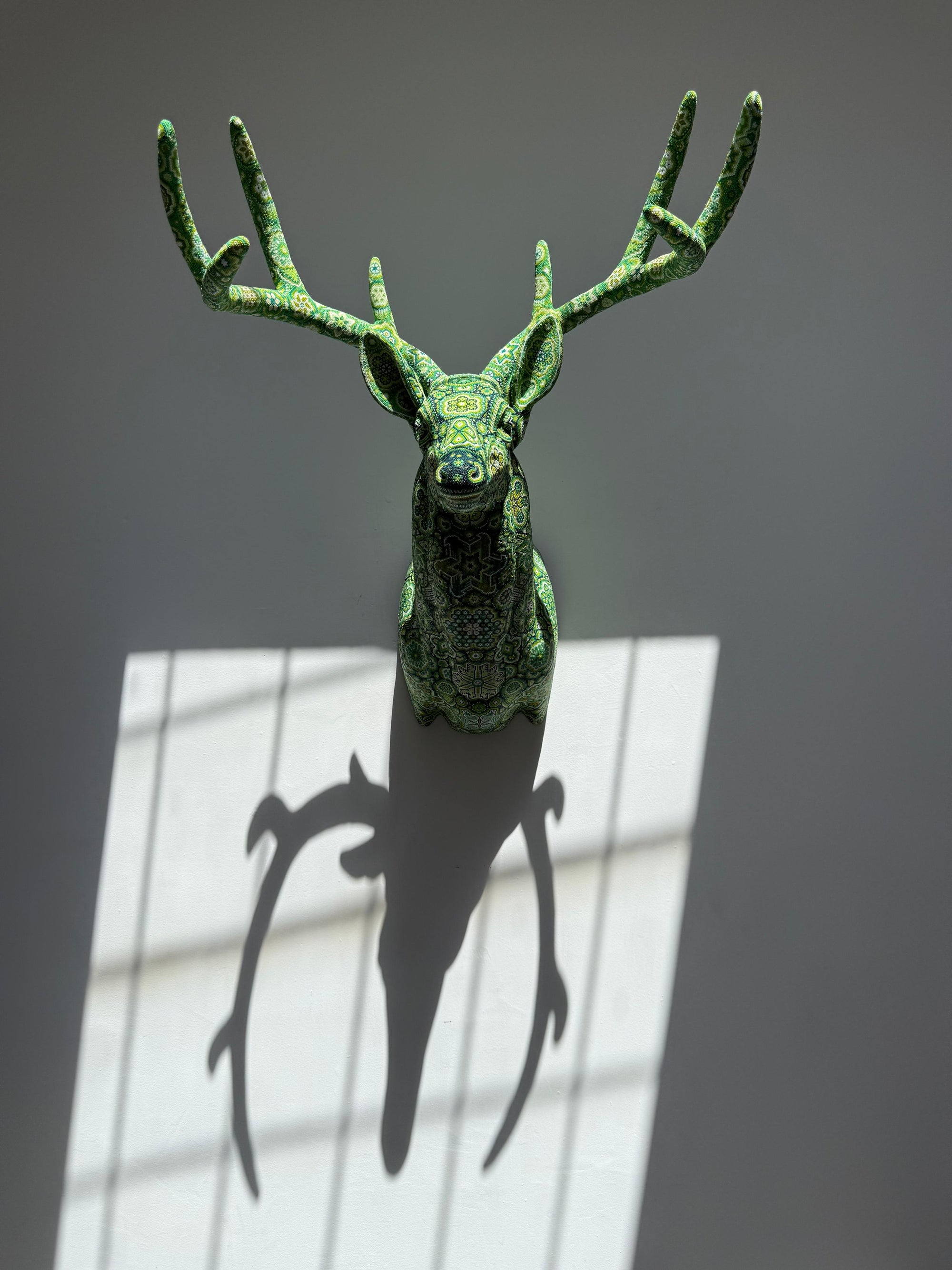 El espíritu del venado sagrado cobra vida en este busto de resina, revestido en microchaquira de cristal en tonos verdes que vibran con la esencia de la naturaleza. Vavaasári, mensajero divino, emerge de la pared como si cruzara el umbral entre los mundos, portando en su ser la sabiduría de la cosmovisión wixárika.