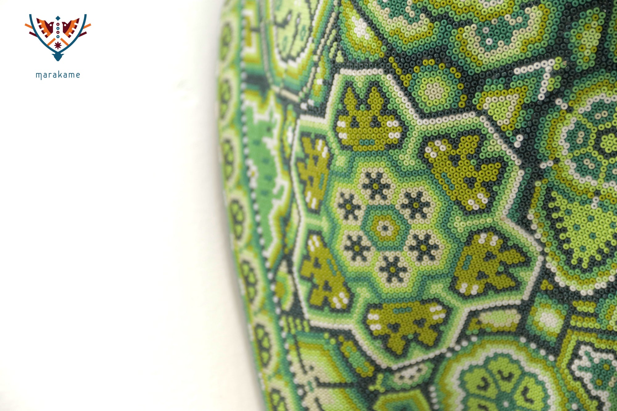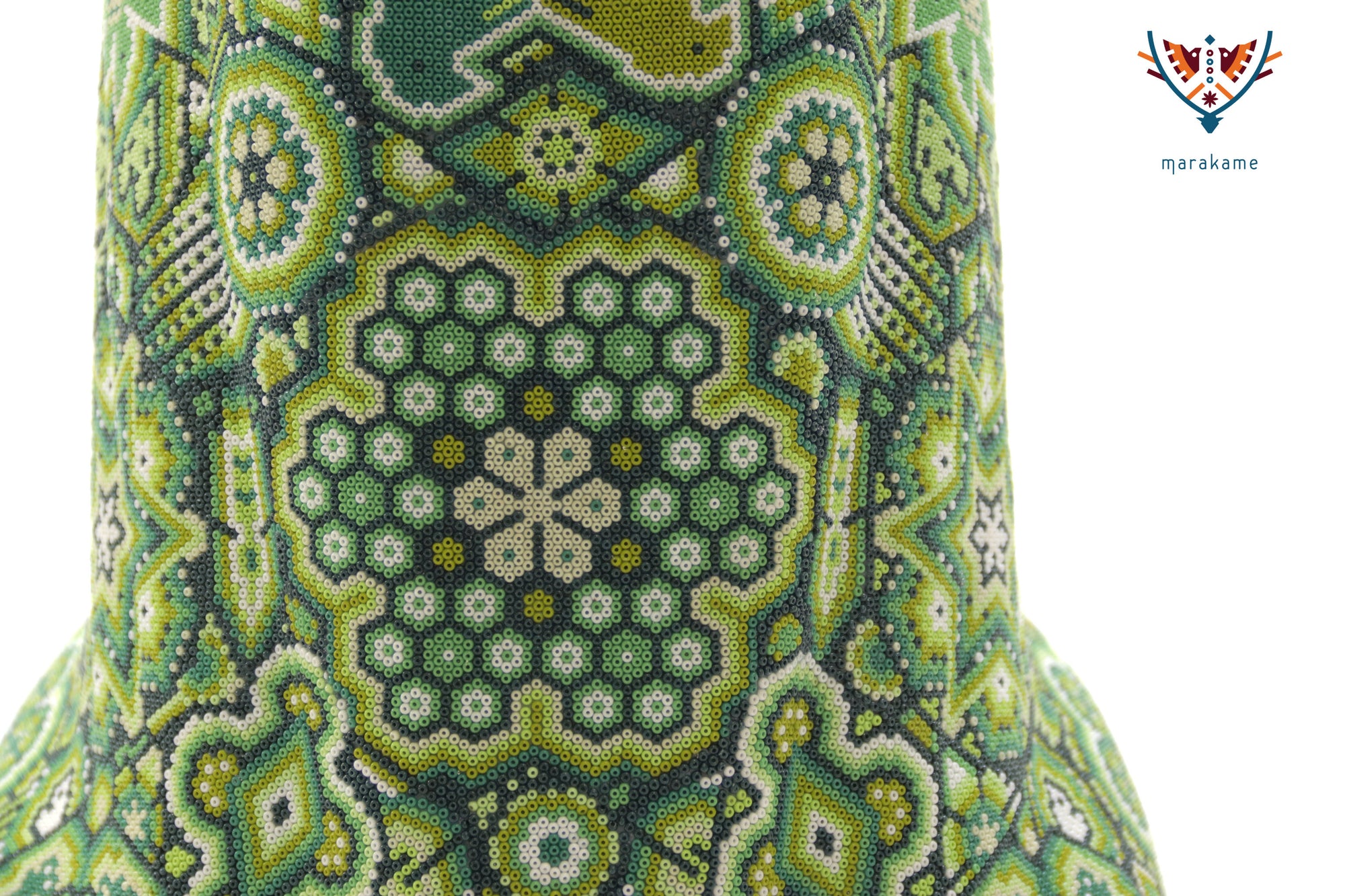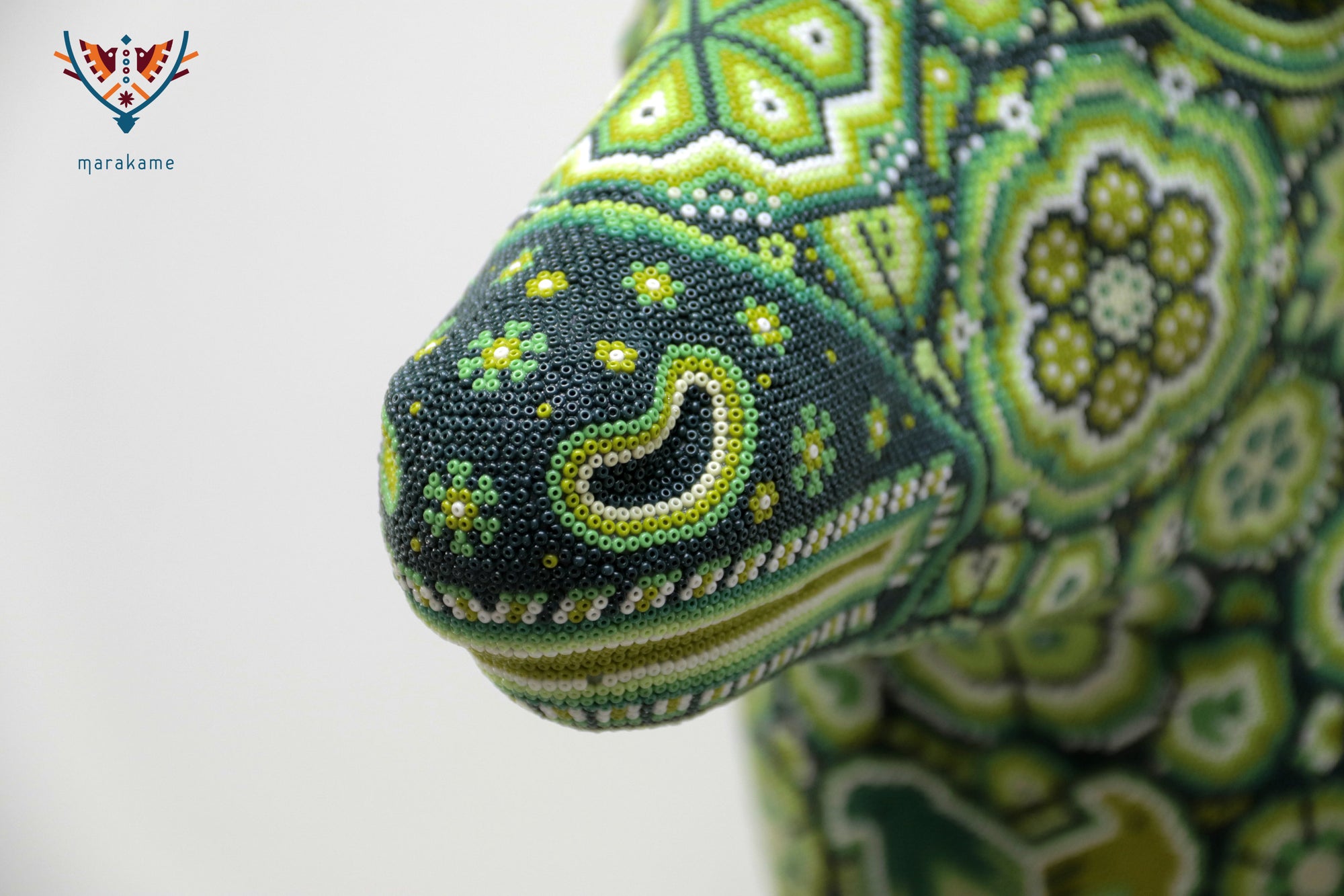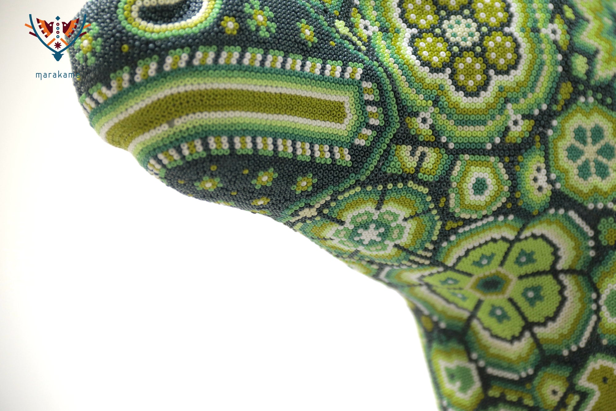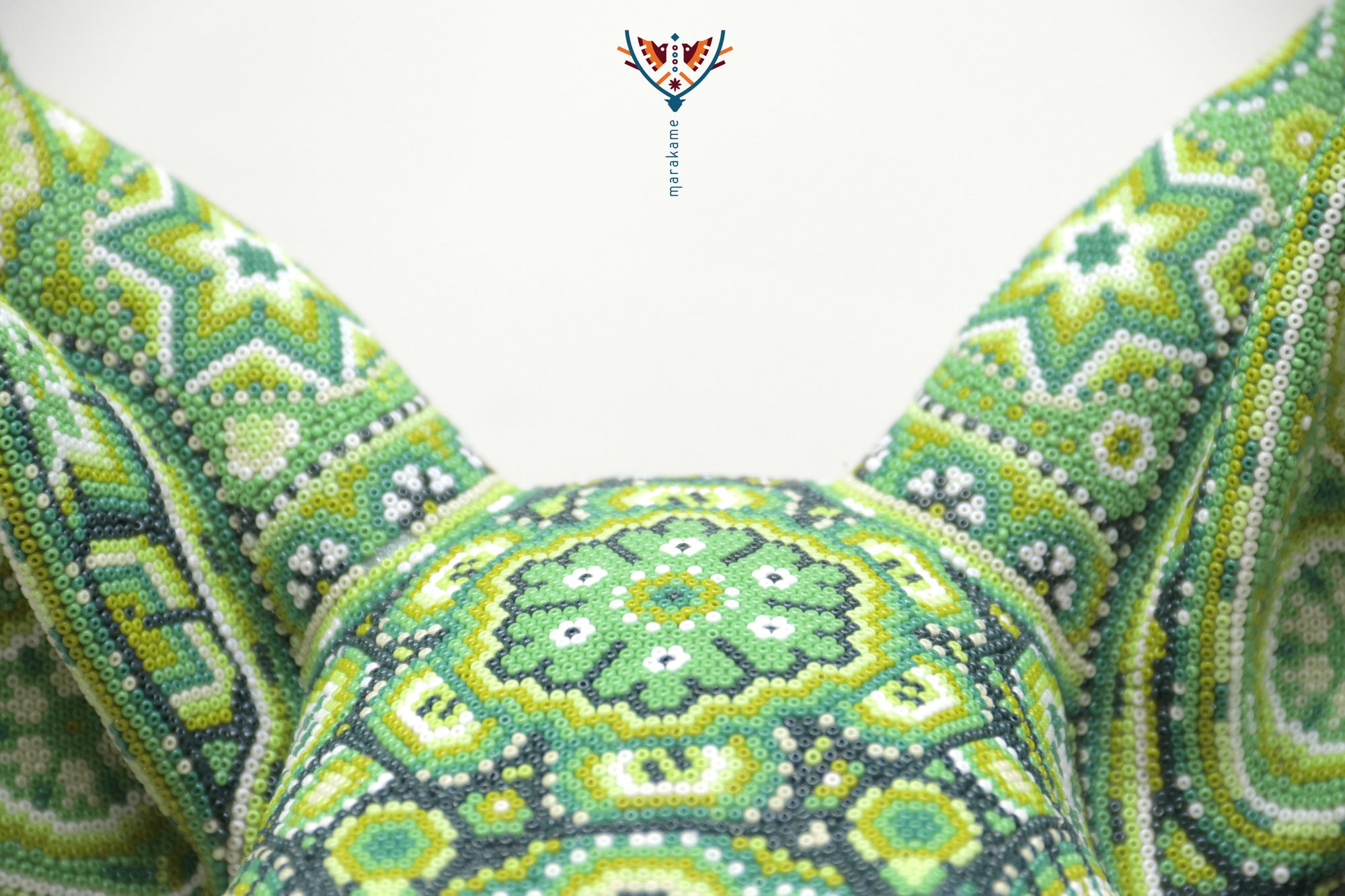 El espíritu del venado sagrado cobra vida en este busto de resina, revestido en microchaquira de cristal en tonos verdes que vibran con la esencia de la naturaleza. Vavaasári, mensajero divino, emerge de la pared como si cruzara el umbral entre los mundos, portando en su ser la sabiduría de la cosmovisión wixárika.
