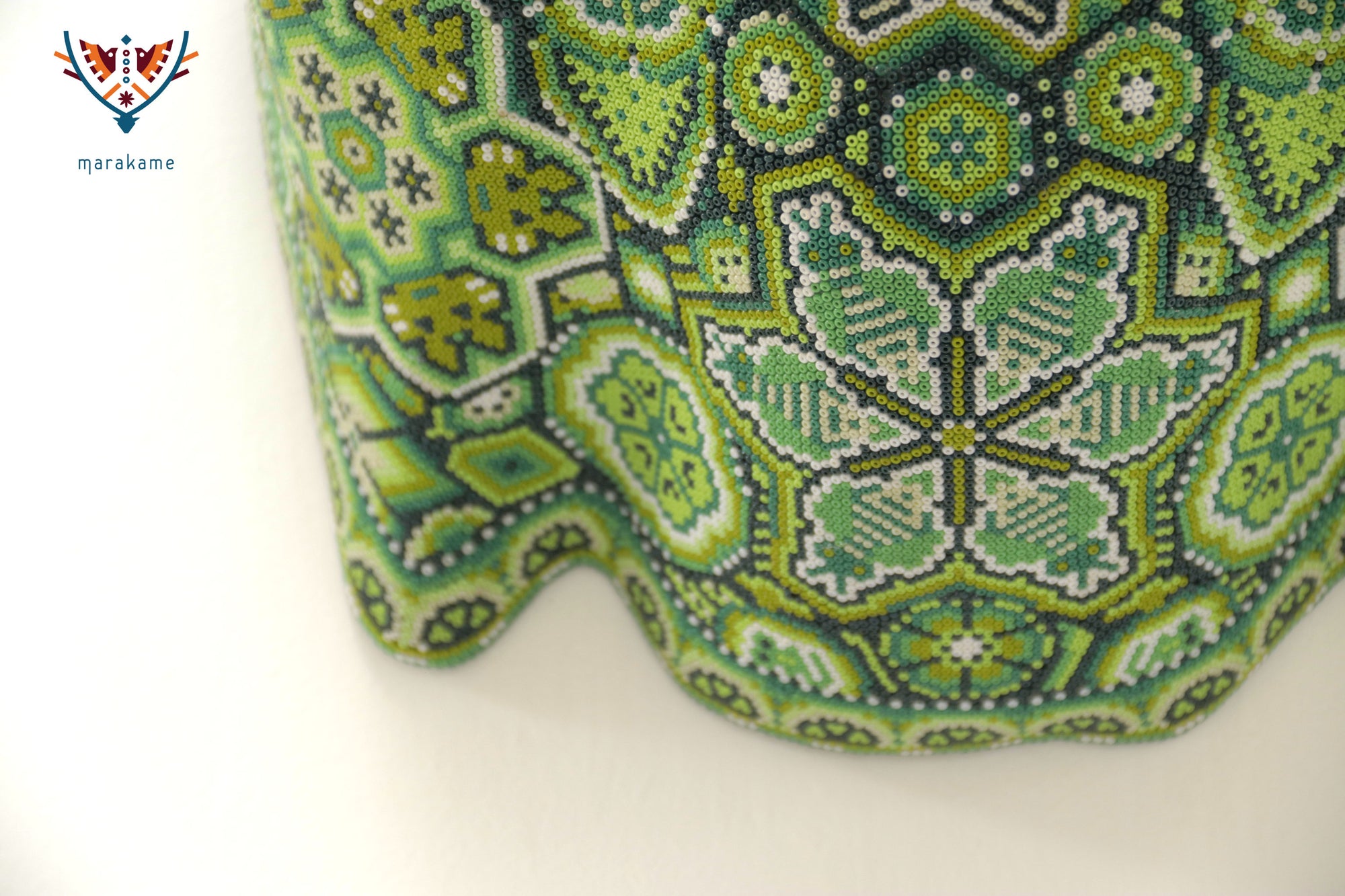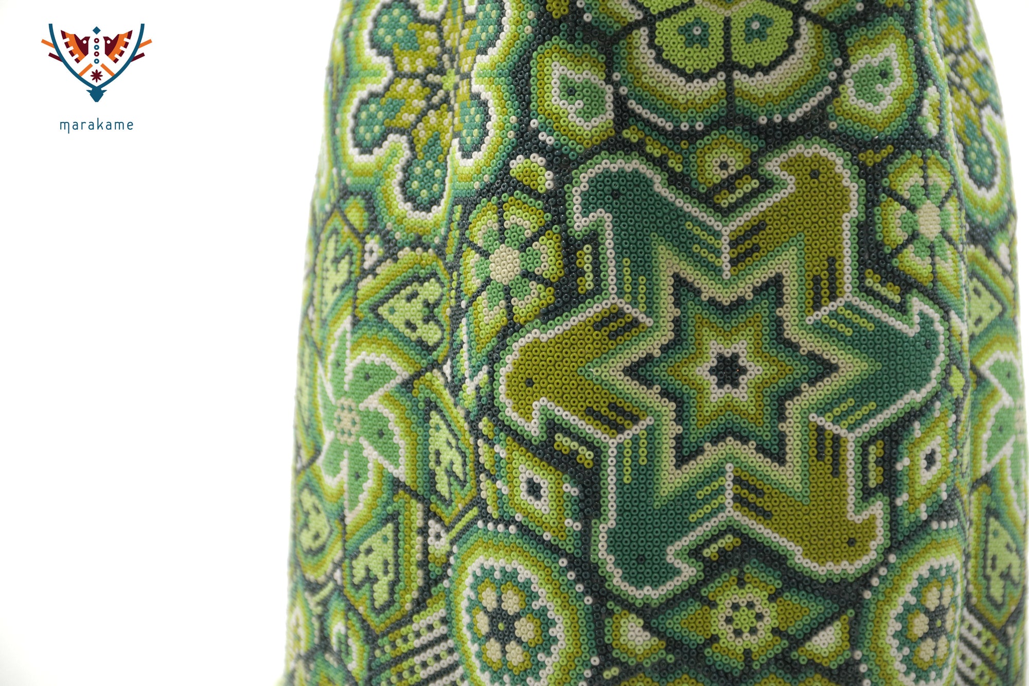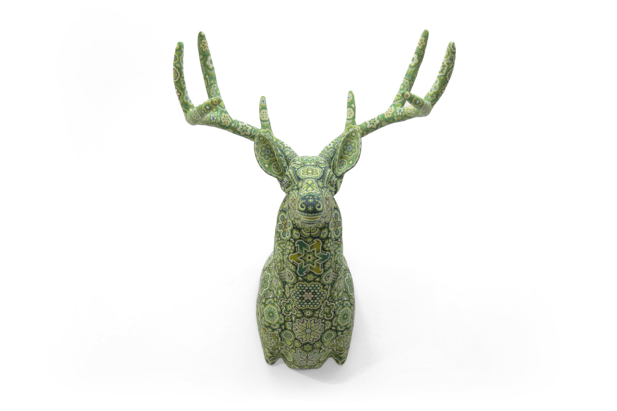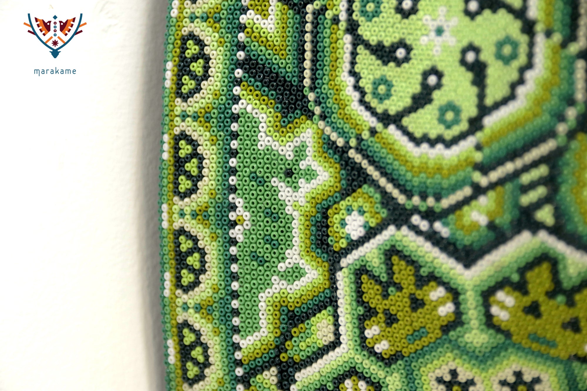 El espíritu del venado sagrado cobra vida en este busto de resina, revestido en microchaquira de cristal en tonos verdes que vibran con la esencia de la naturaleza. Vavaasári, mensajero divino, emerge de la pared como si cruzara el umbral entre los mundos, portando en su ser la sabiduría de la cosmovisión wixárika.