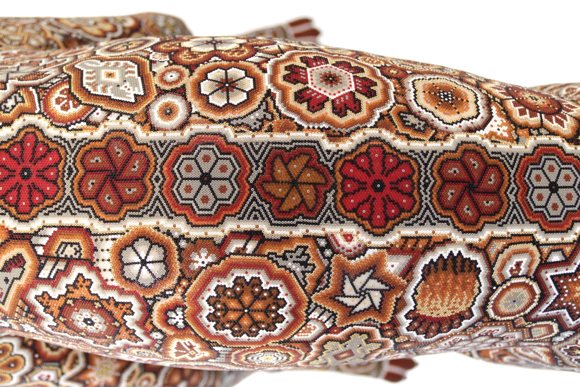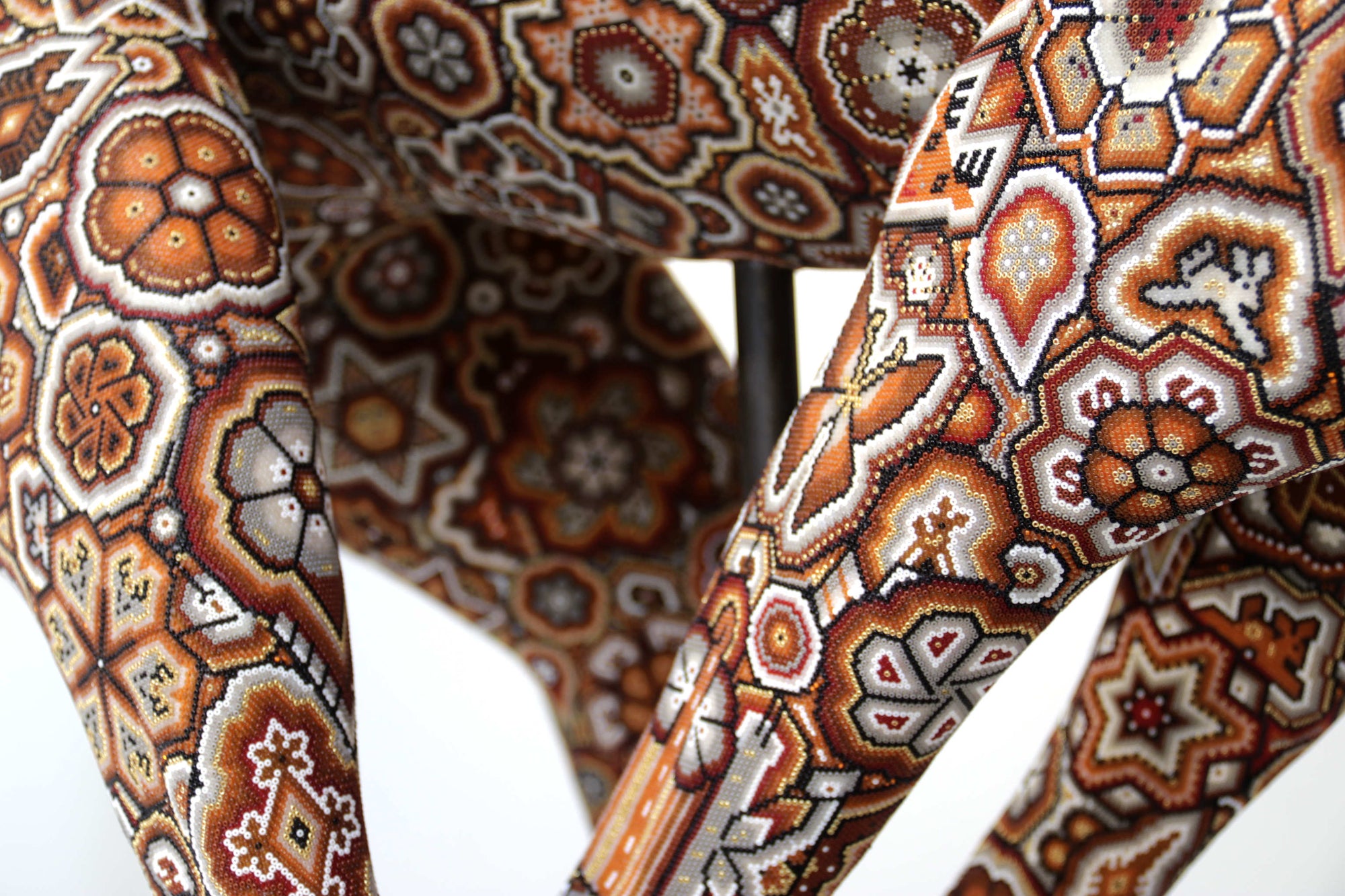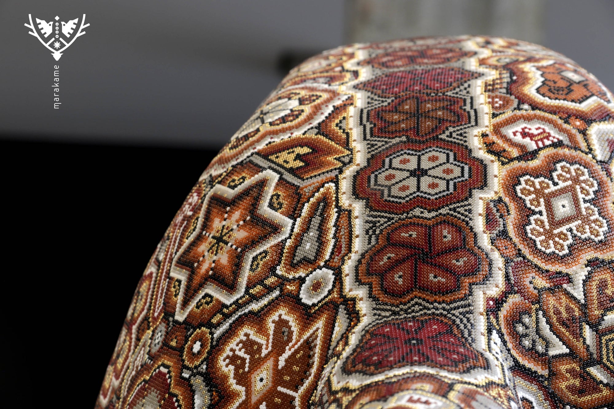 La complejidad de su superficie —tejida con miles de microesferas de cristal aplicadas con precisión ritual— no busca ornamento, sino resonancia. Cada patrón evoca un lenguaje antiguo, codificado en símbolos que han viajado a través de generaciones para encontrar aquí una nueva forma de ser leídos.