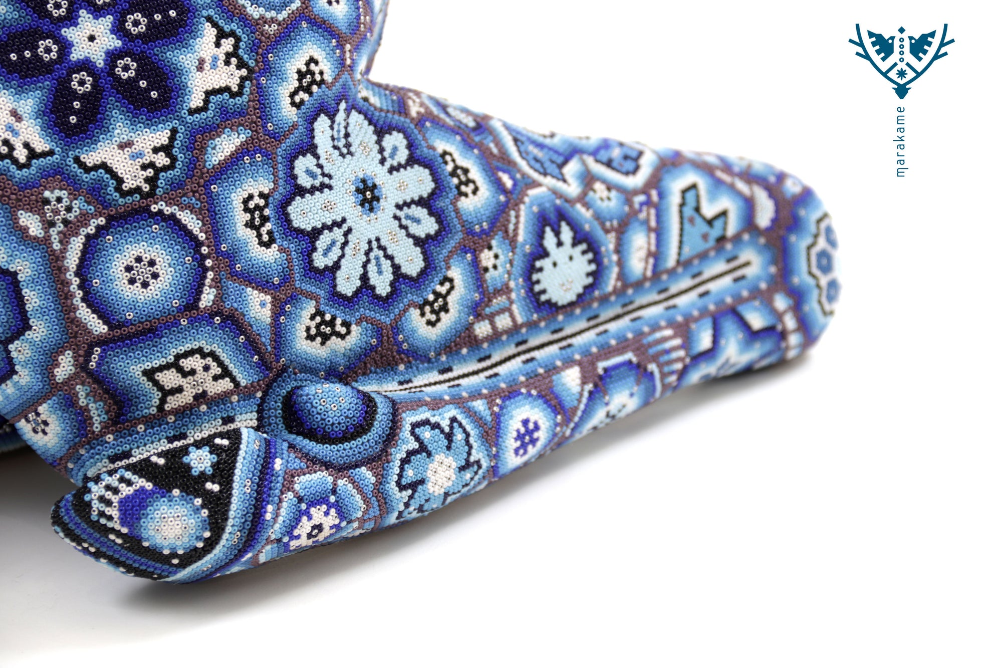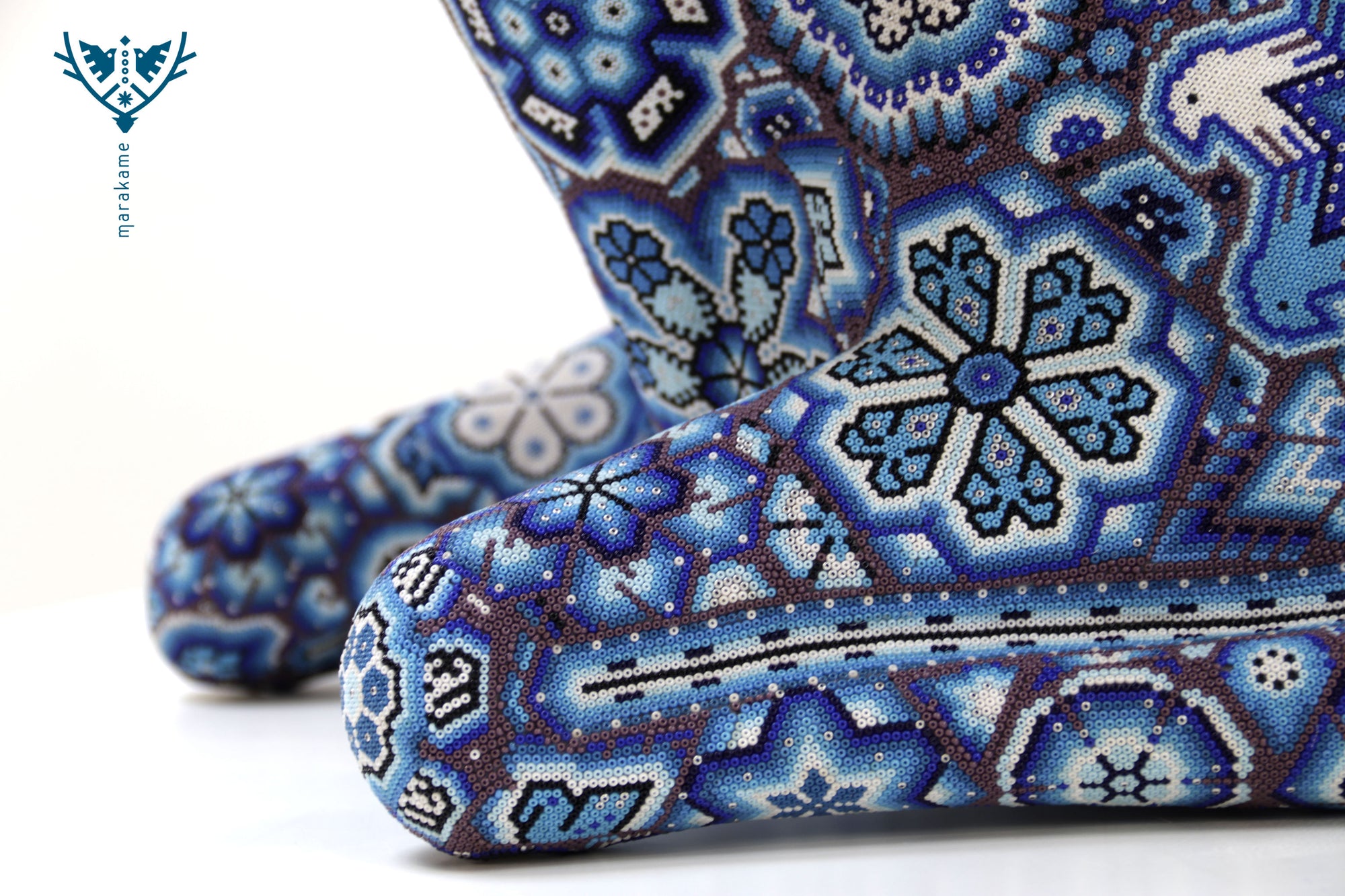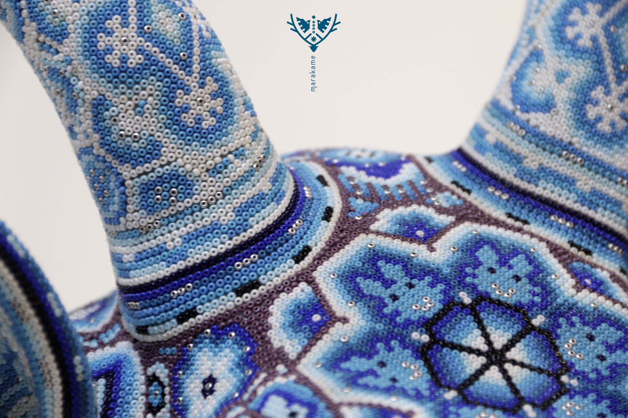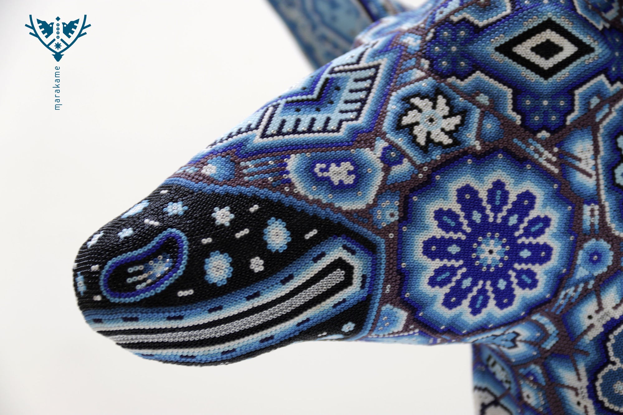 Esta escultura es resultado de una colaboración creativa entre el taller escultórico de Arte Marakame y la sensibilidad ceremonial de María Elena de la Cruz. Cada cuenta de chaquira de cristal checoslovaca fue aplicada a mano con la precisión de quien no sólo decora, sino invoca. La paleta de azules —desde el añil profundo hasta los tonos hielo y cielo— envuelve a Kauyumarie en un aura lunar, oceánica, serena.