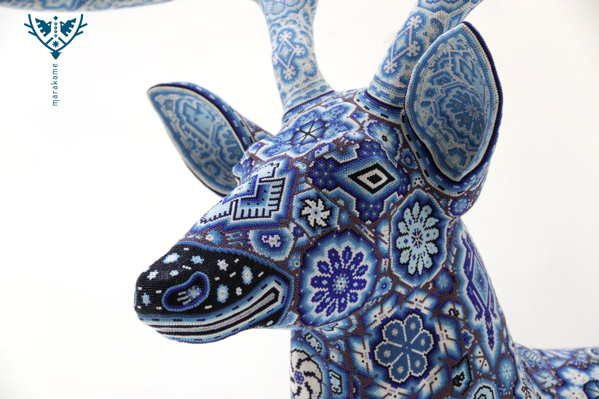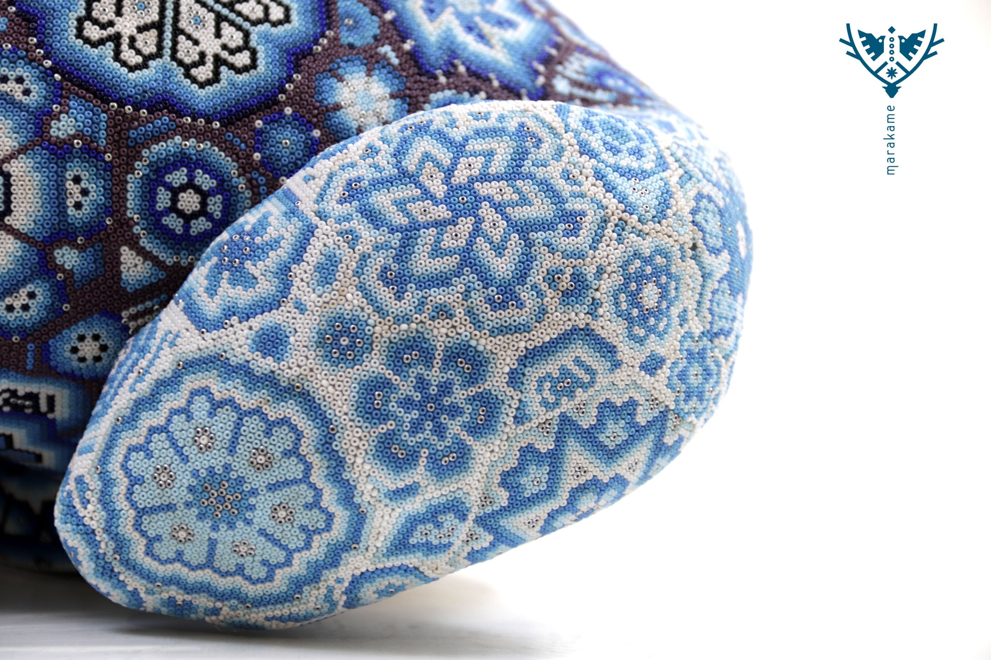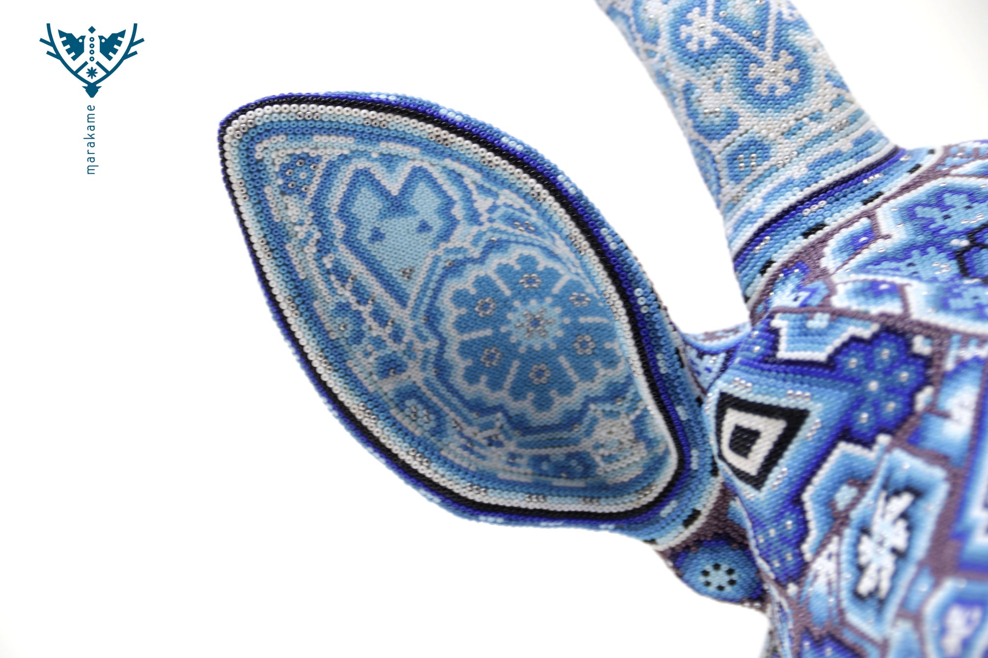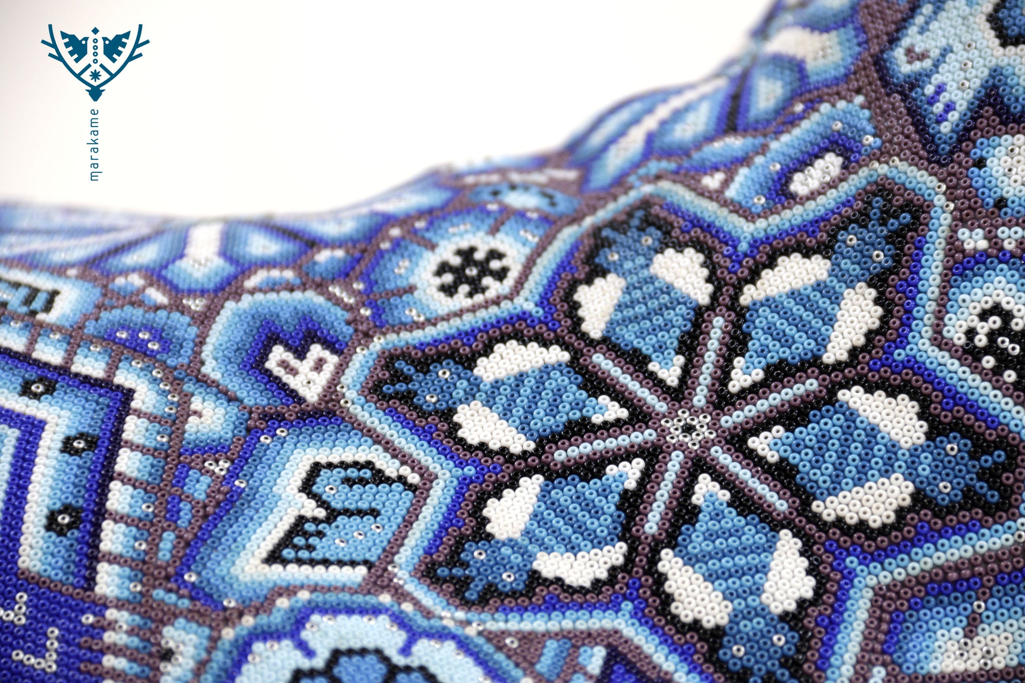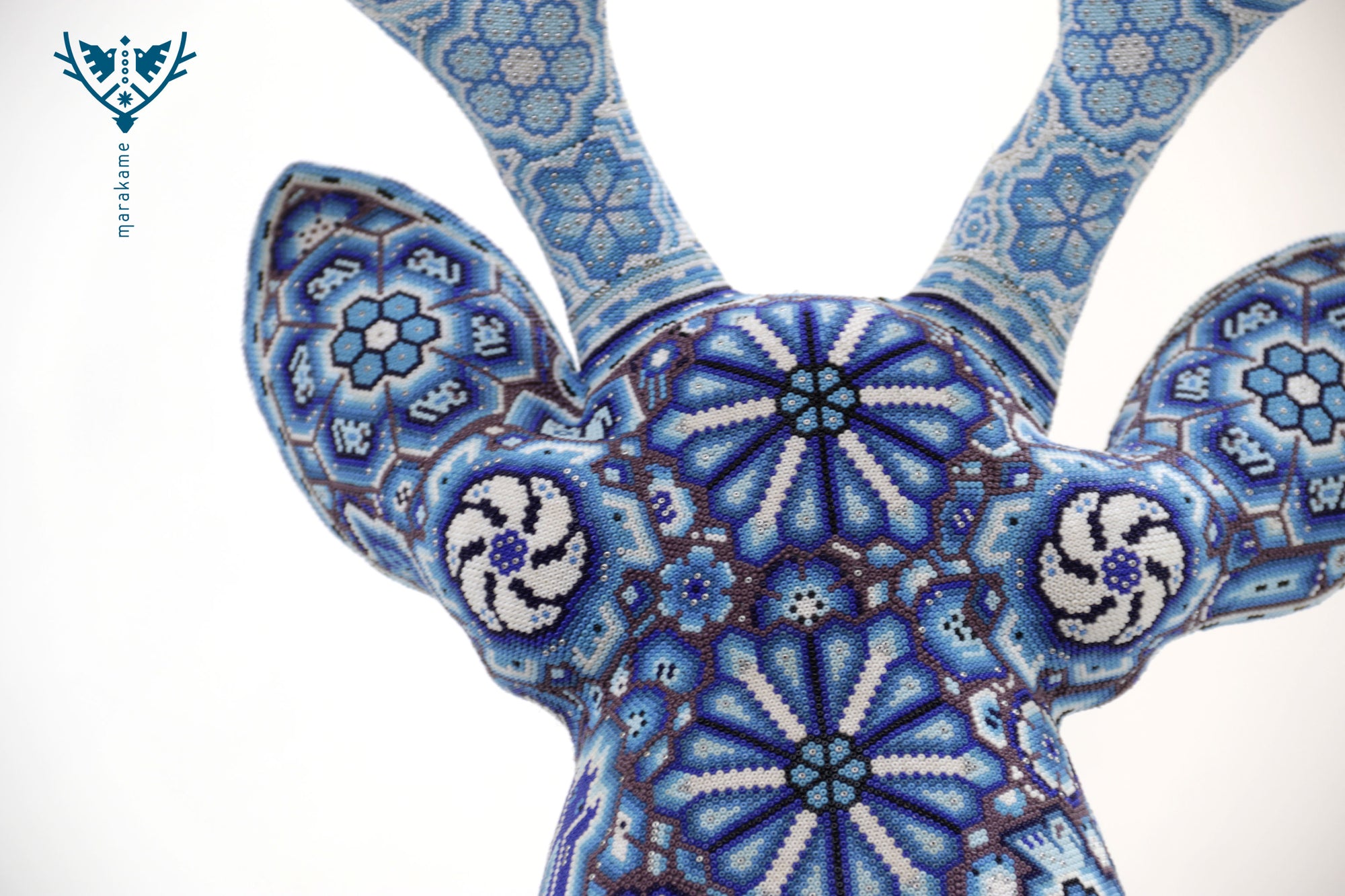 Esta escultura es resultado de una colaboración creativa entre el taller escultórico de Arte Marakame y la sensibilidad ceremonial de María Elena de la Cruz. Cada cuenta de chaquira de cristal checoslovaca fue aplicada a mano con la precisión de quien no sólo decora, sino invoca. La paleta de azules —desde el añil profundo hasta los tonos hielo y cielo— envuelve a Kauyumarie en un aura lunar, oceánica, serena.
