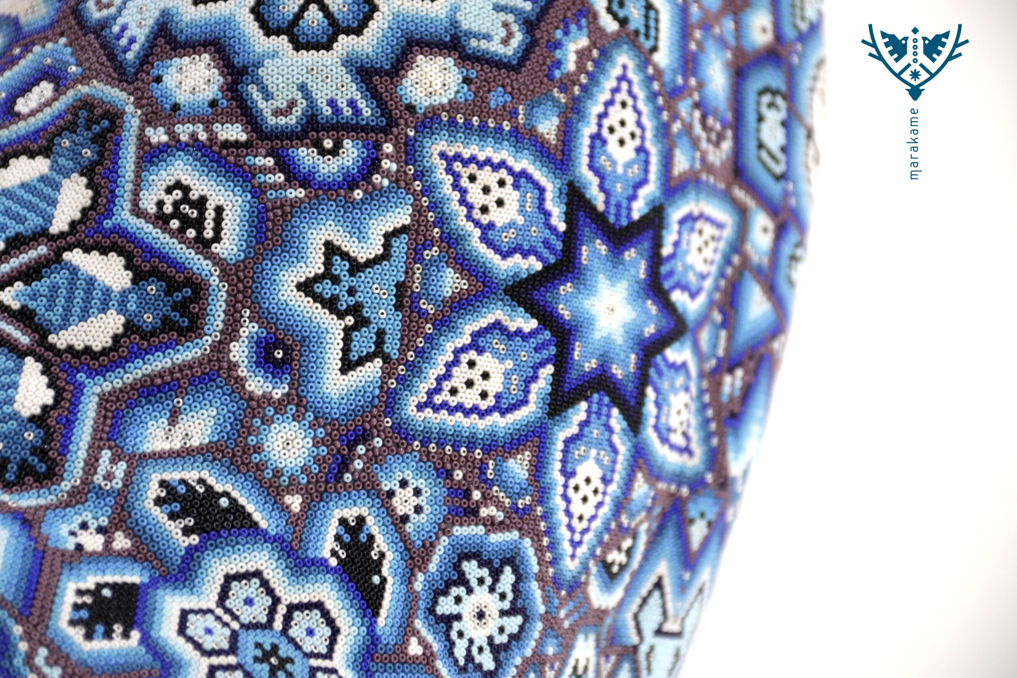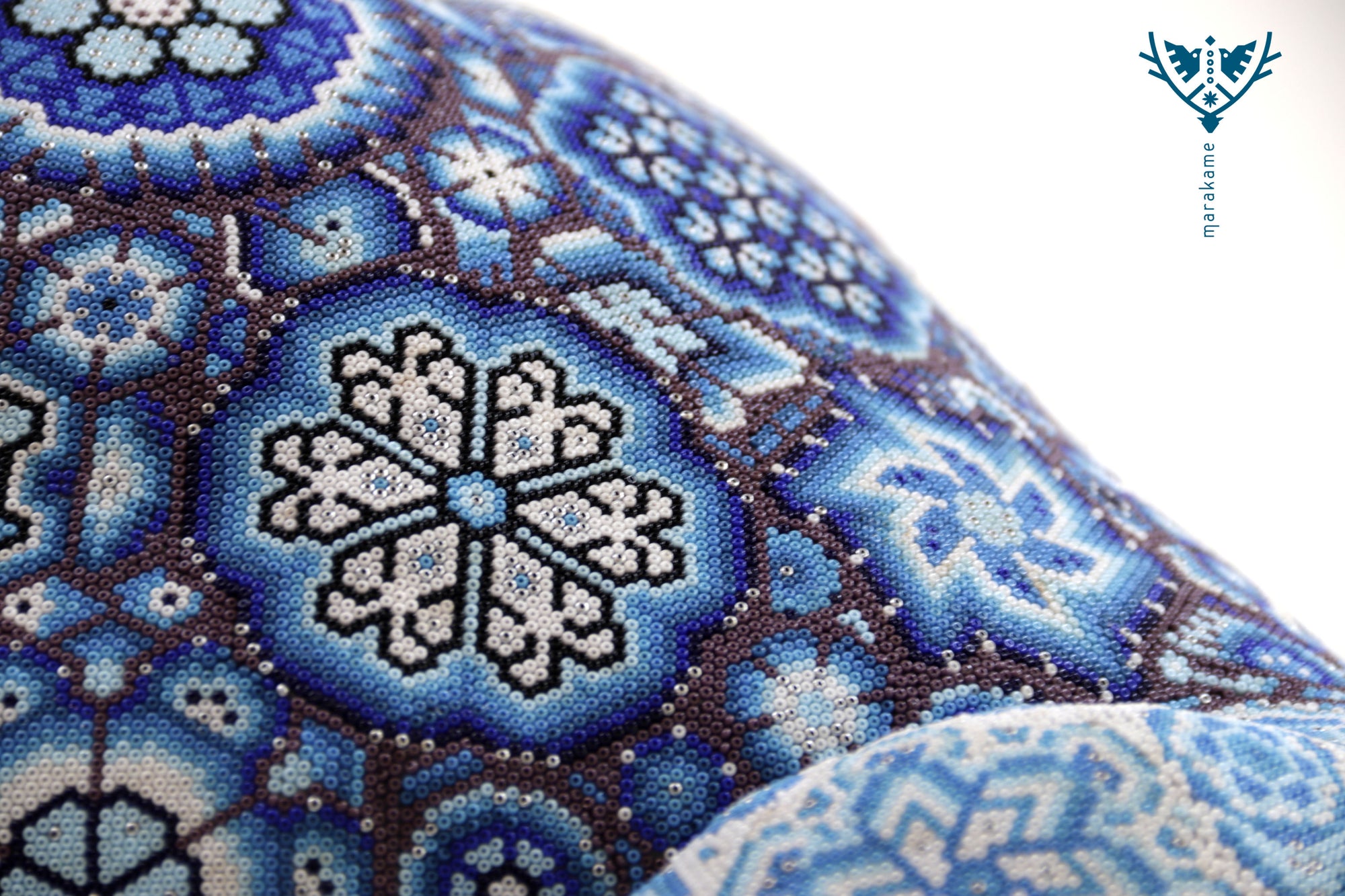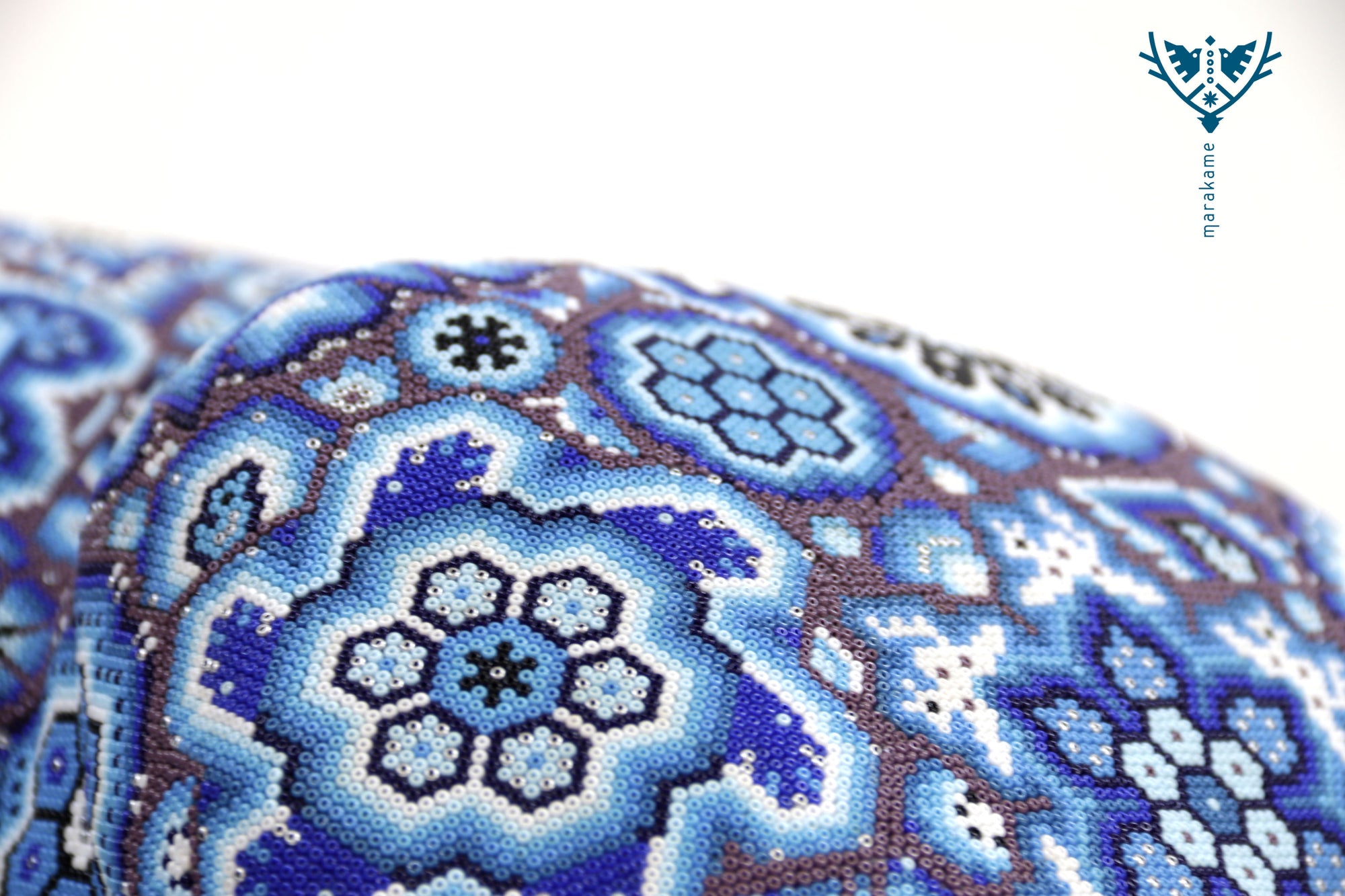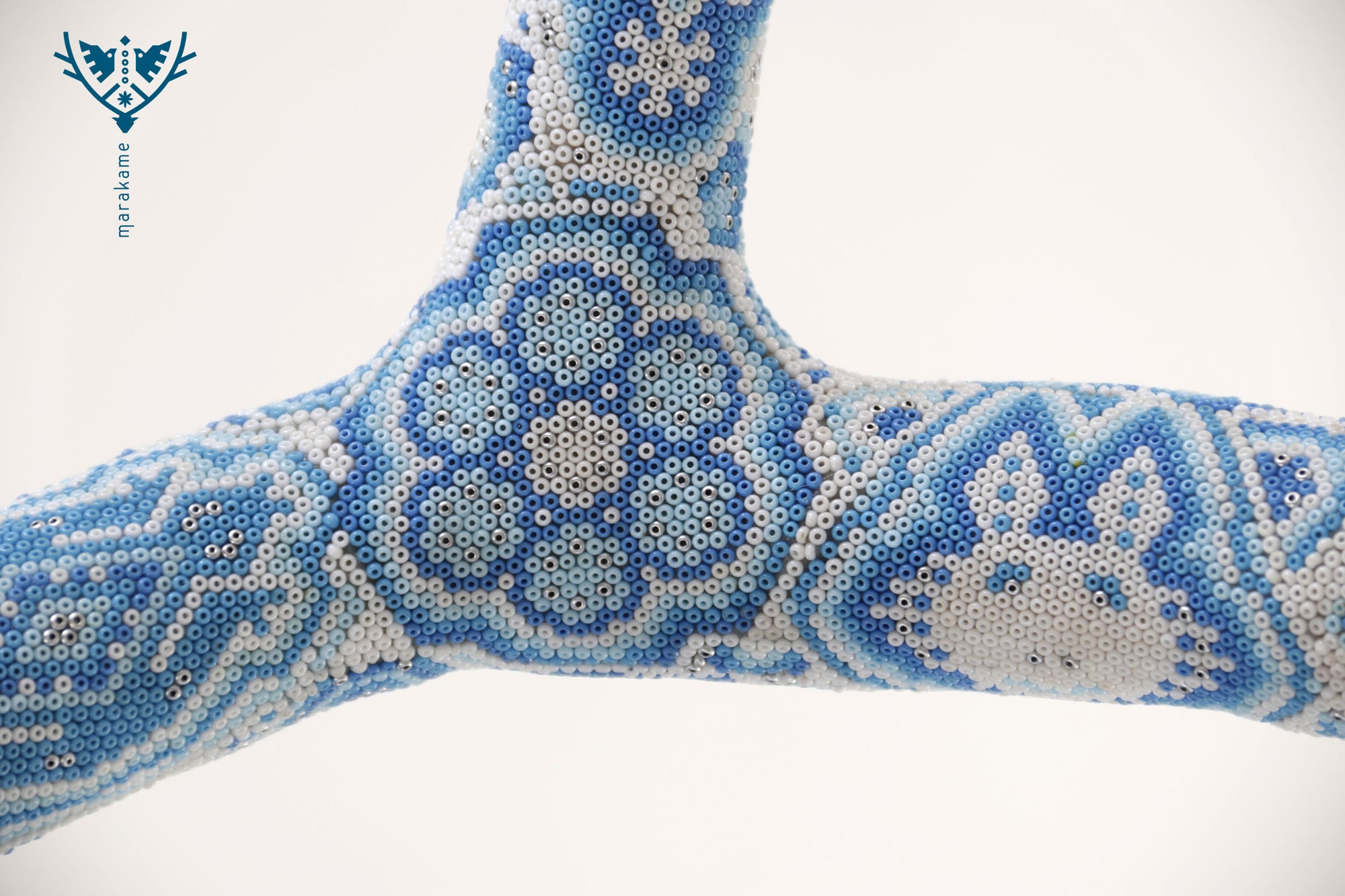 Esta escultura es resultado de una colaboración creativa entre el taller escultórico de Arte Marakame y la sensibilidad ceremonial de María Elena de la Cruz. Cada cuenta de chaquira de cristal checoslovaca fue aplicada a mano con la precisión de quien no sólo decora, sino invoca. La paleta de azules —desde el añil profundo hasta los tonos hielo y cielo— envuelve a Kauyumarie en un aura lunar, oceánica, serena.