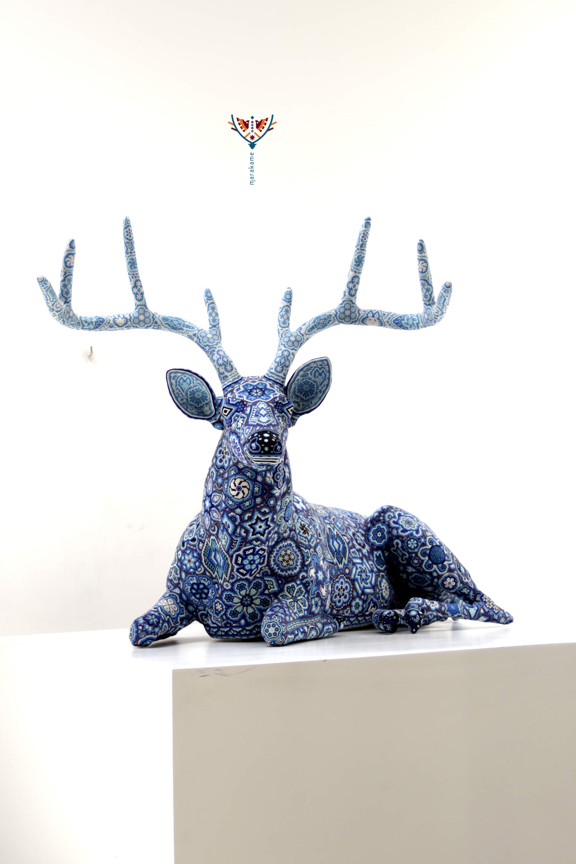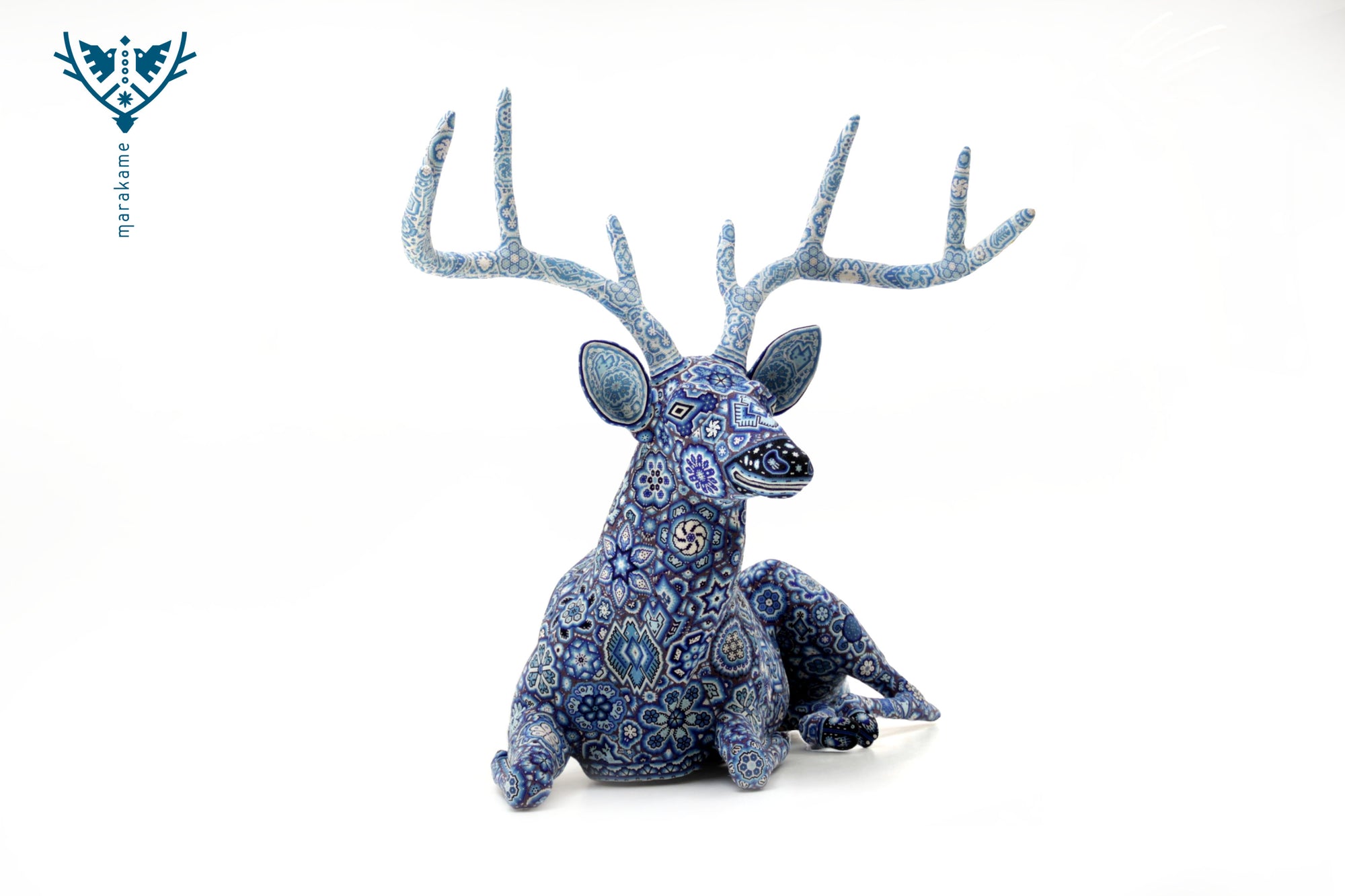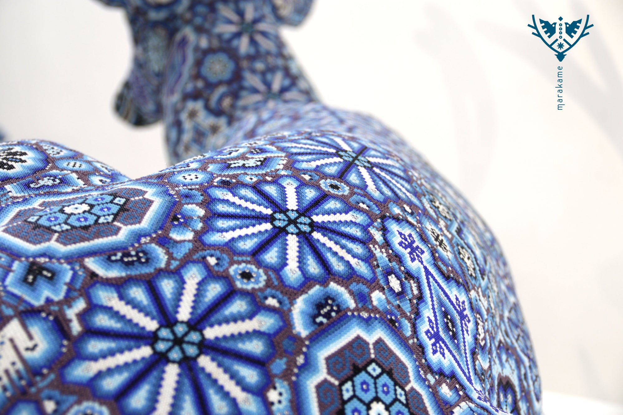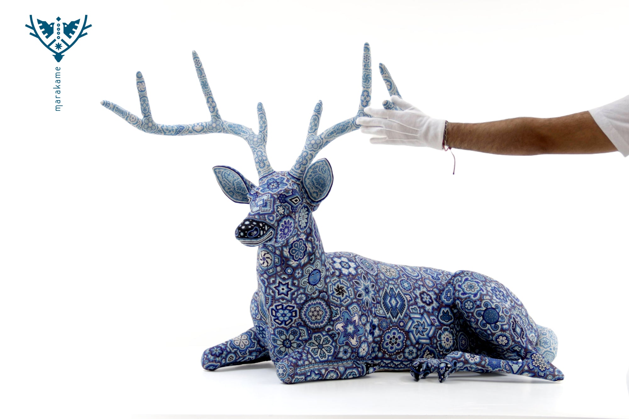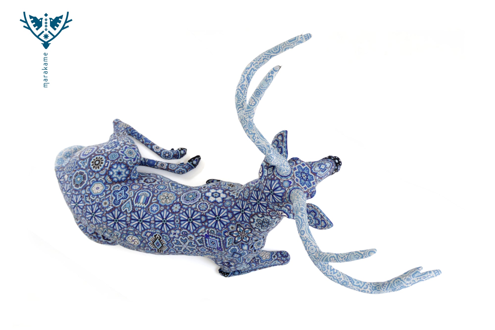 Kauyumarie, el venado azul, figura central en la cosmovisión wixárika, es el guía de la visión, el portador del nierika, el que traza los caminos. Se le conoce como viajero entre mundos, mensajero de las deidades y compañero del marakame en sus travesías ceremoniales. Pero en esta obra —realizada por la artista visionaria María Elena de la Cruz por comisión de Arte Marakame— lo vemos en una postura inusual: echado, en quietud.