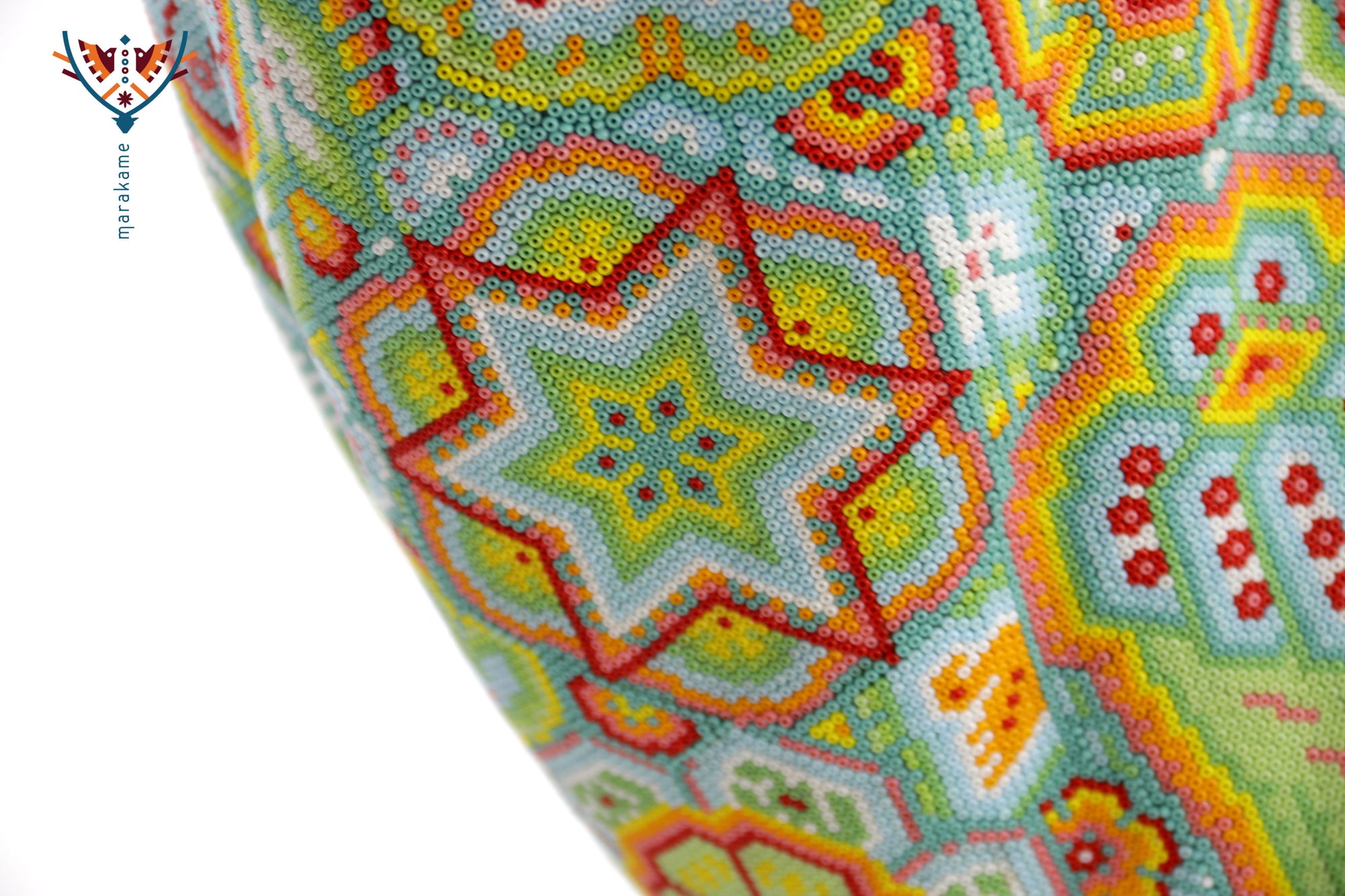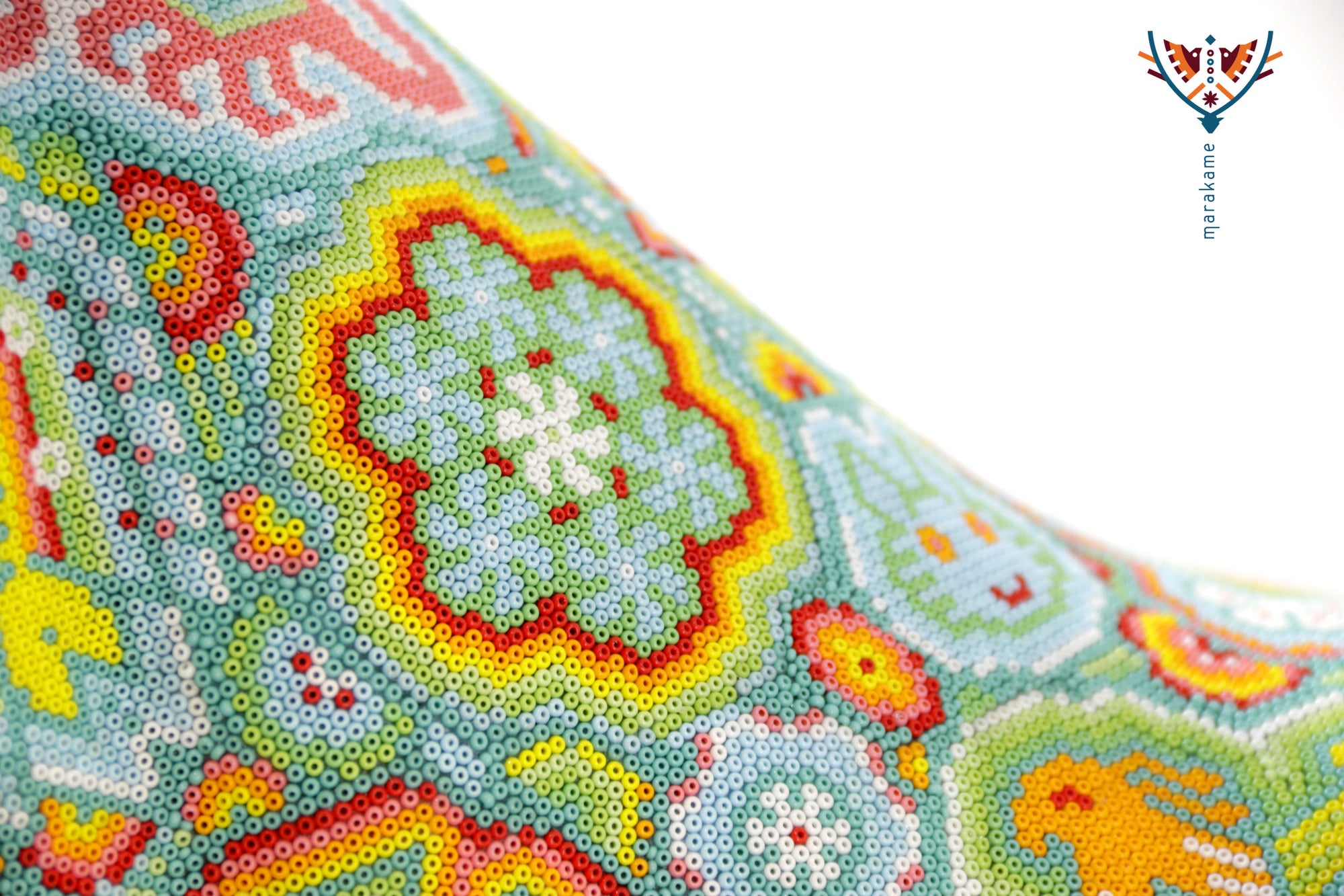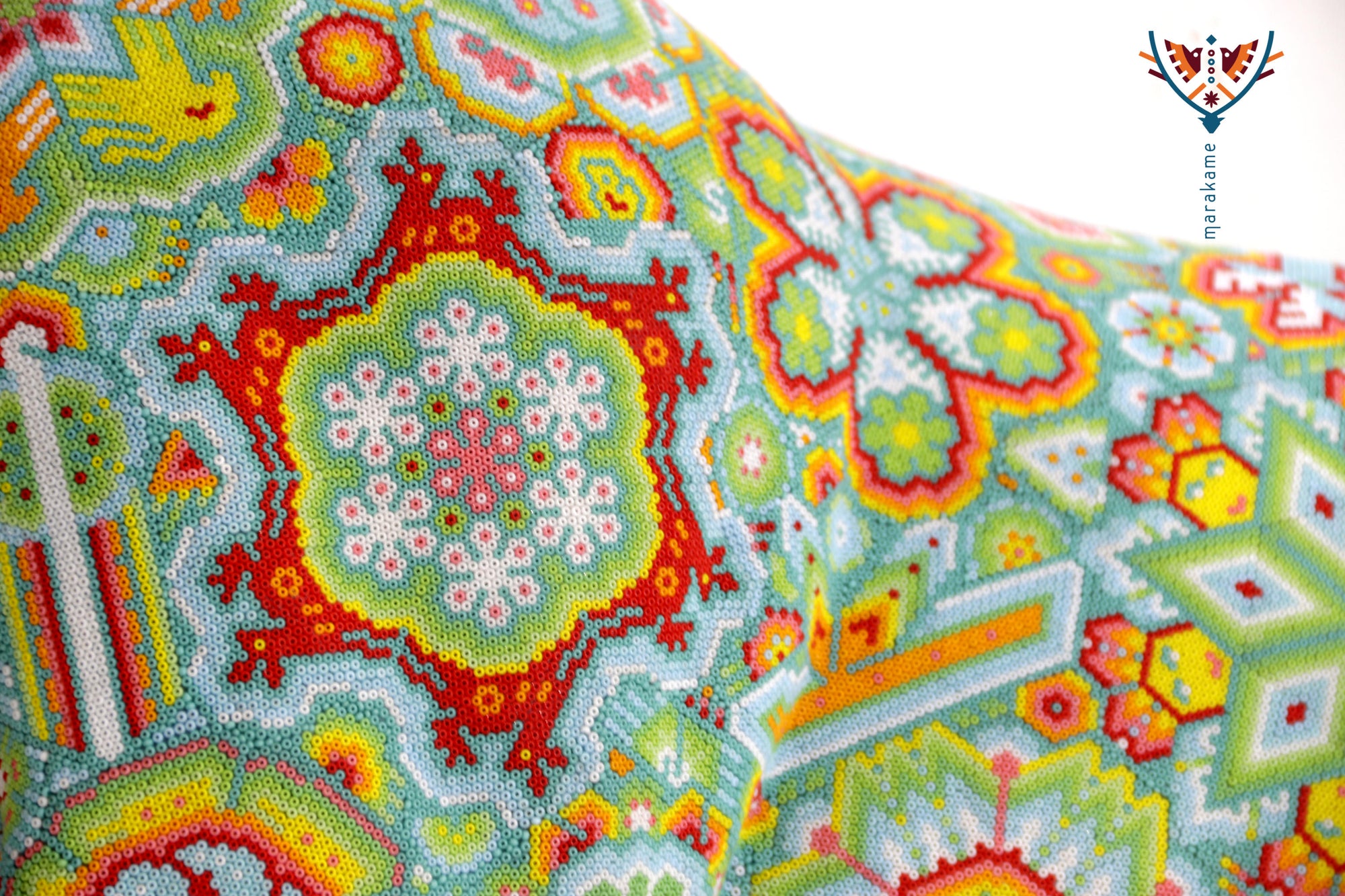 Lo verdaderamente innovador en esta pieza es su gama cromática. Diseñada por Arte Marakame, esta paleta alegre y luminosa, sin presencia de tonos oscuros, rompe con los esquemas tradicionales del arte en chaquira. Es una apuesta estética que conserva la raíz ceremonial pero habla con una energía nueva: abierta, vibrante, universal.