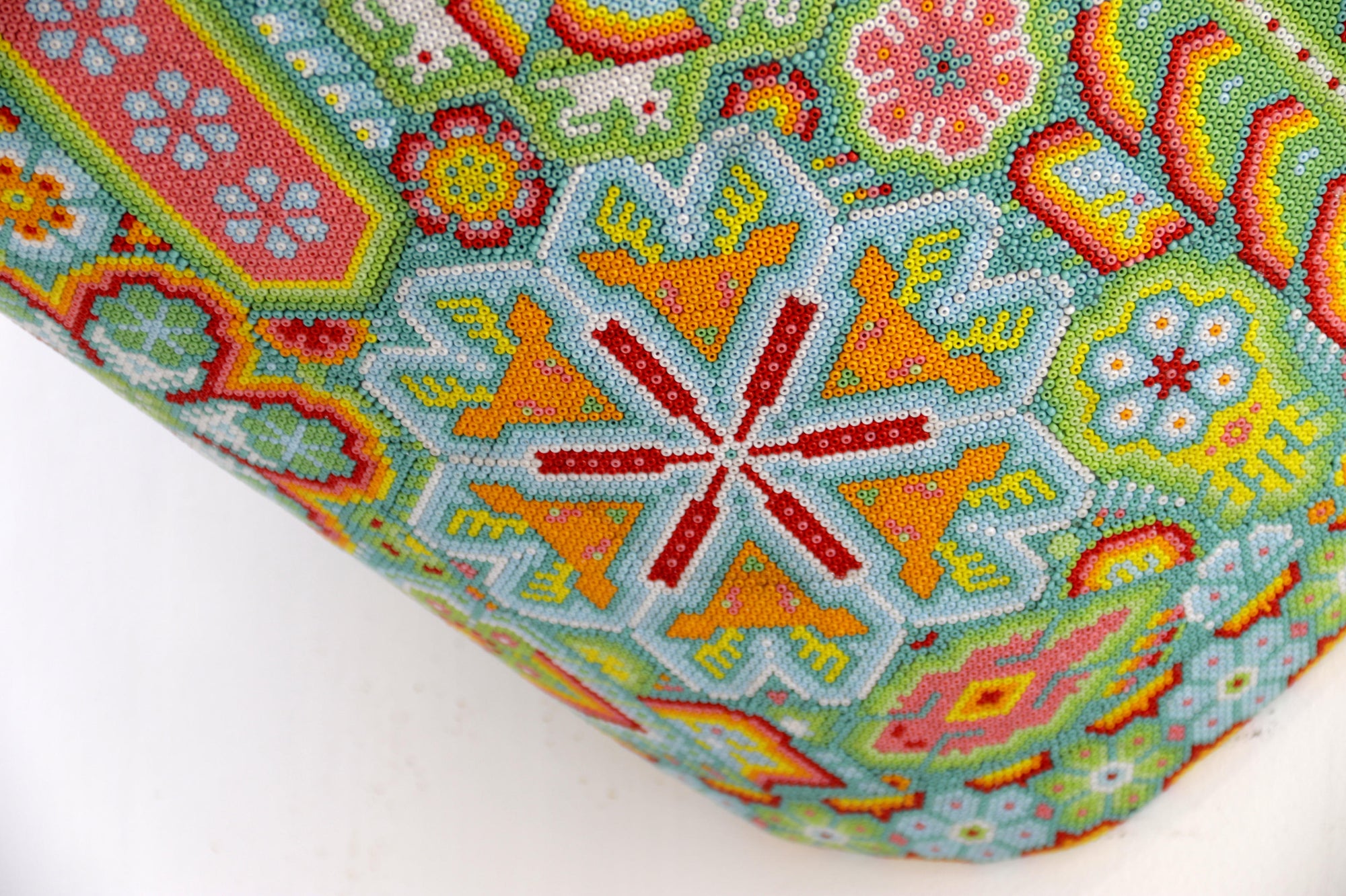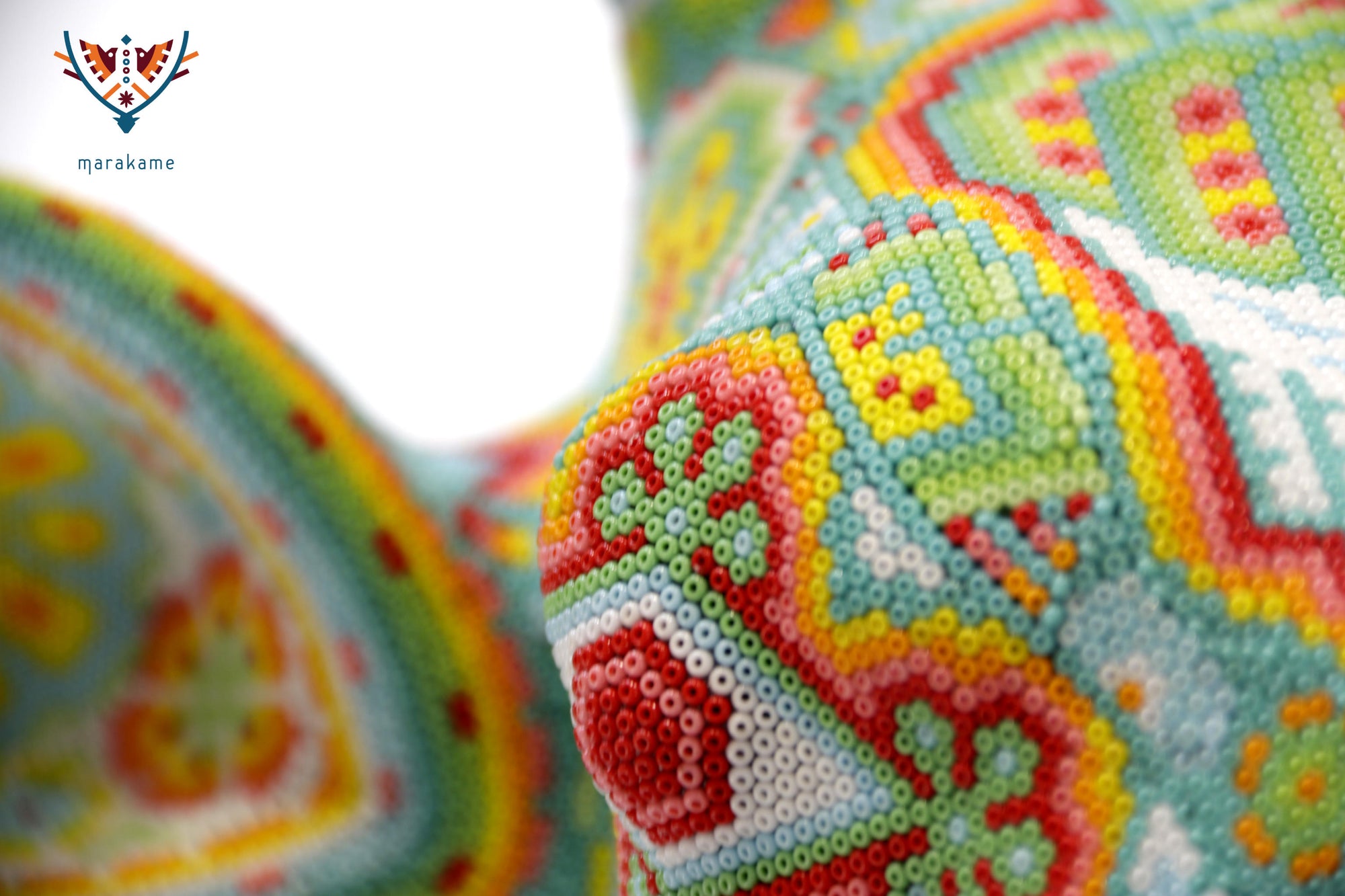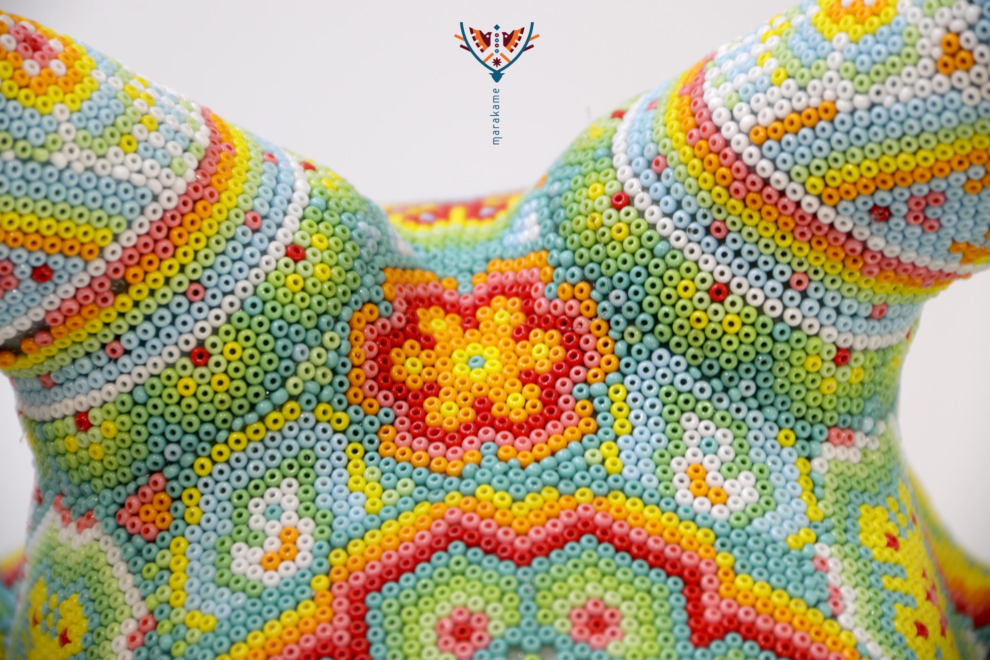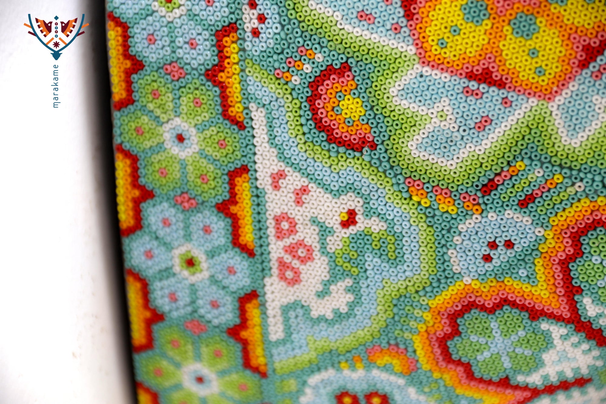 Lo verdaderamente innovador en esta pieza es su gama cromática. Diseñada por Arte Marakame, esta paleta alegre y luminosa, sin presencia de tonos oscuros, rompe con los esquemas tradicionales del arte en chaquira. Es una apuesta estética que conserva la raíz ceremonial pero habla con una energía nueva: abierta, vibrante, universal.