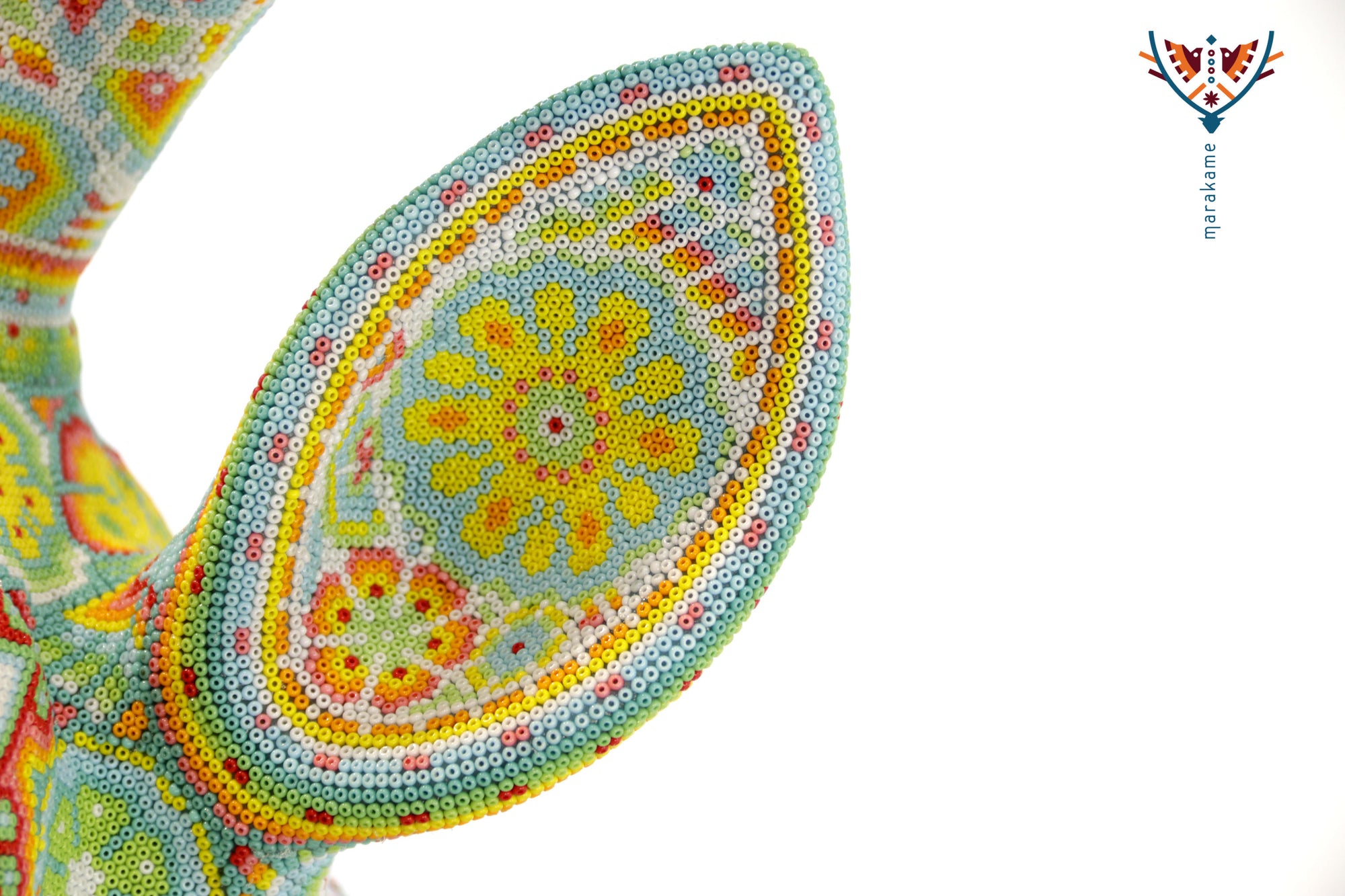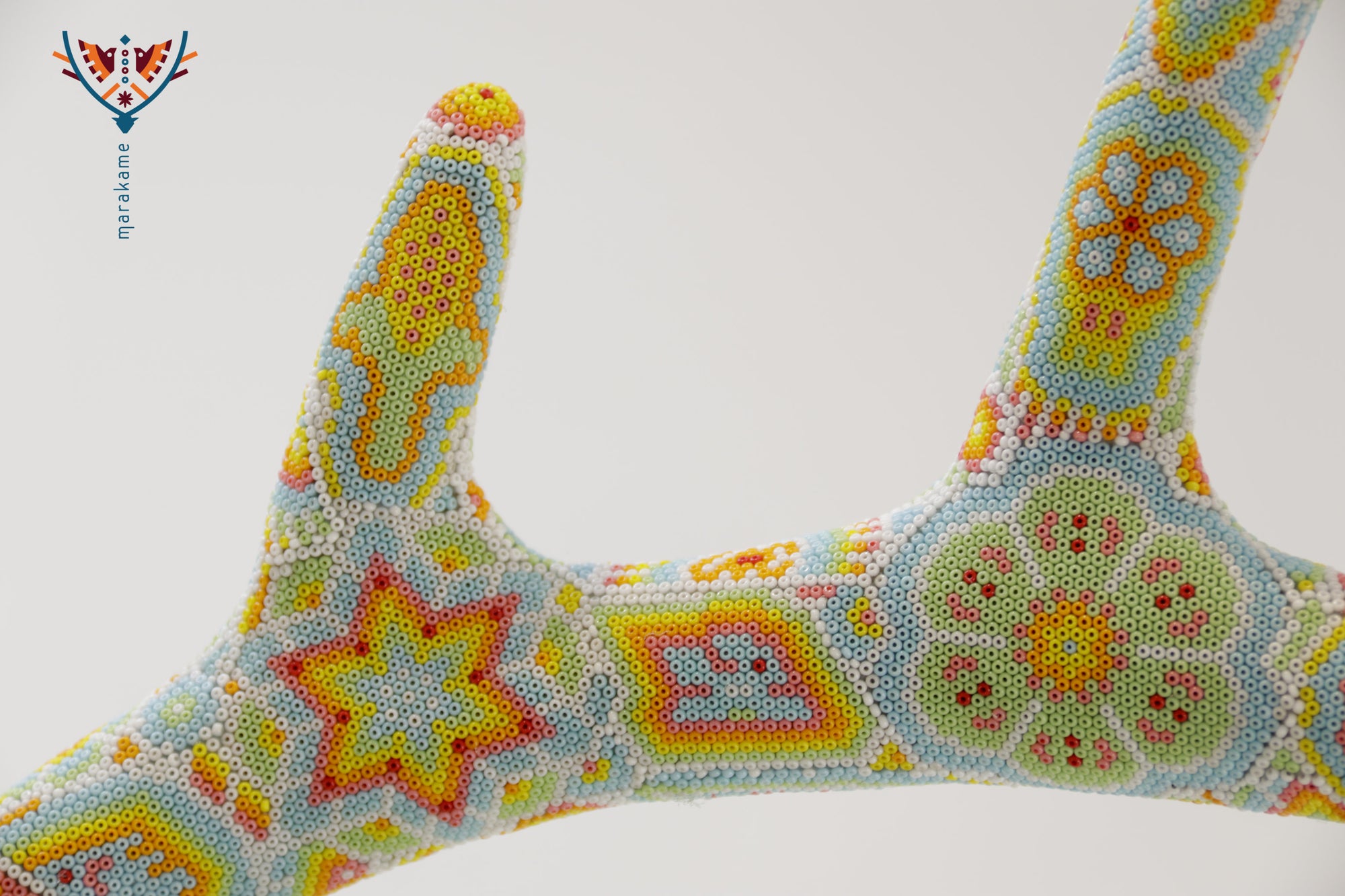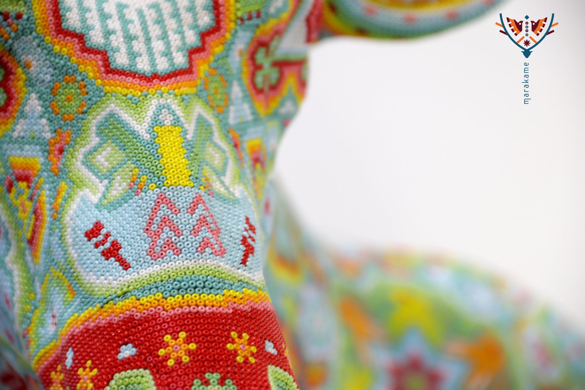 Su cuerpo —elegante, en impulso, con las patas delanteras extendidas y los cuernos como ramas cósmicas— está completamente intervenido con cientos de miles de chaquiras de cristal checoslovacas, aplicadas a mano por artistas visionarios wixaritari. Cada elemento sobre su superficie es parte del lenguaje simbólico wixárika: peyotes, espirales, ojos de dios, escorpiones, mariposas, el sol, la madre tierra, el maíz. Estos símbolos no decoran: transmiten, protegen, revelan.
