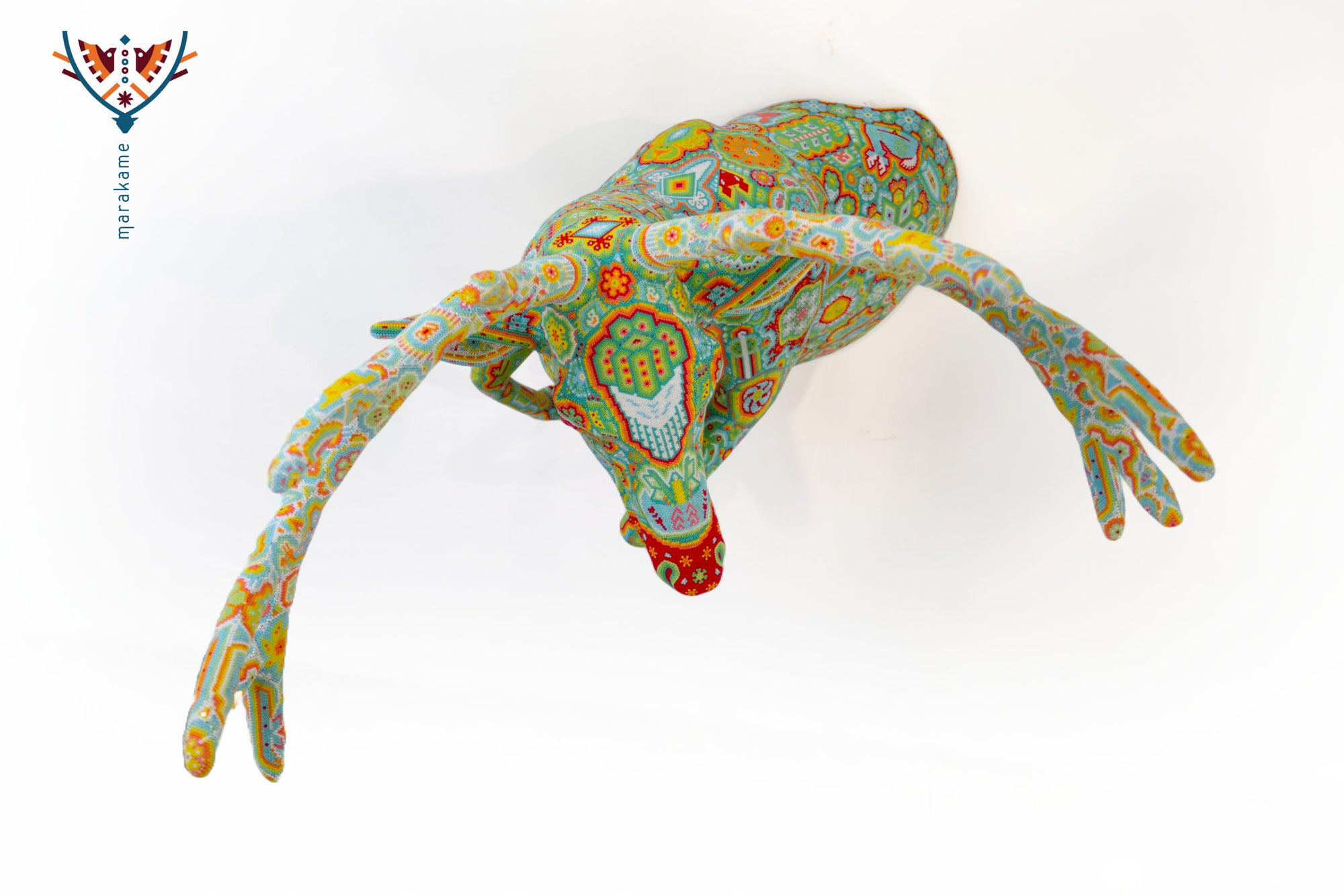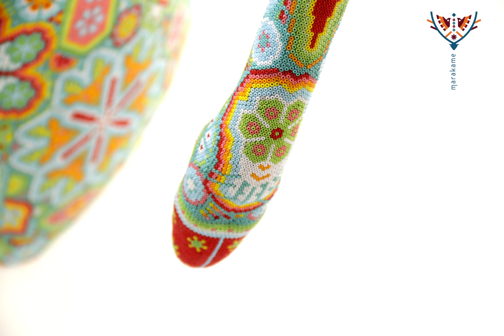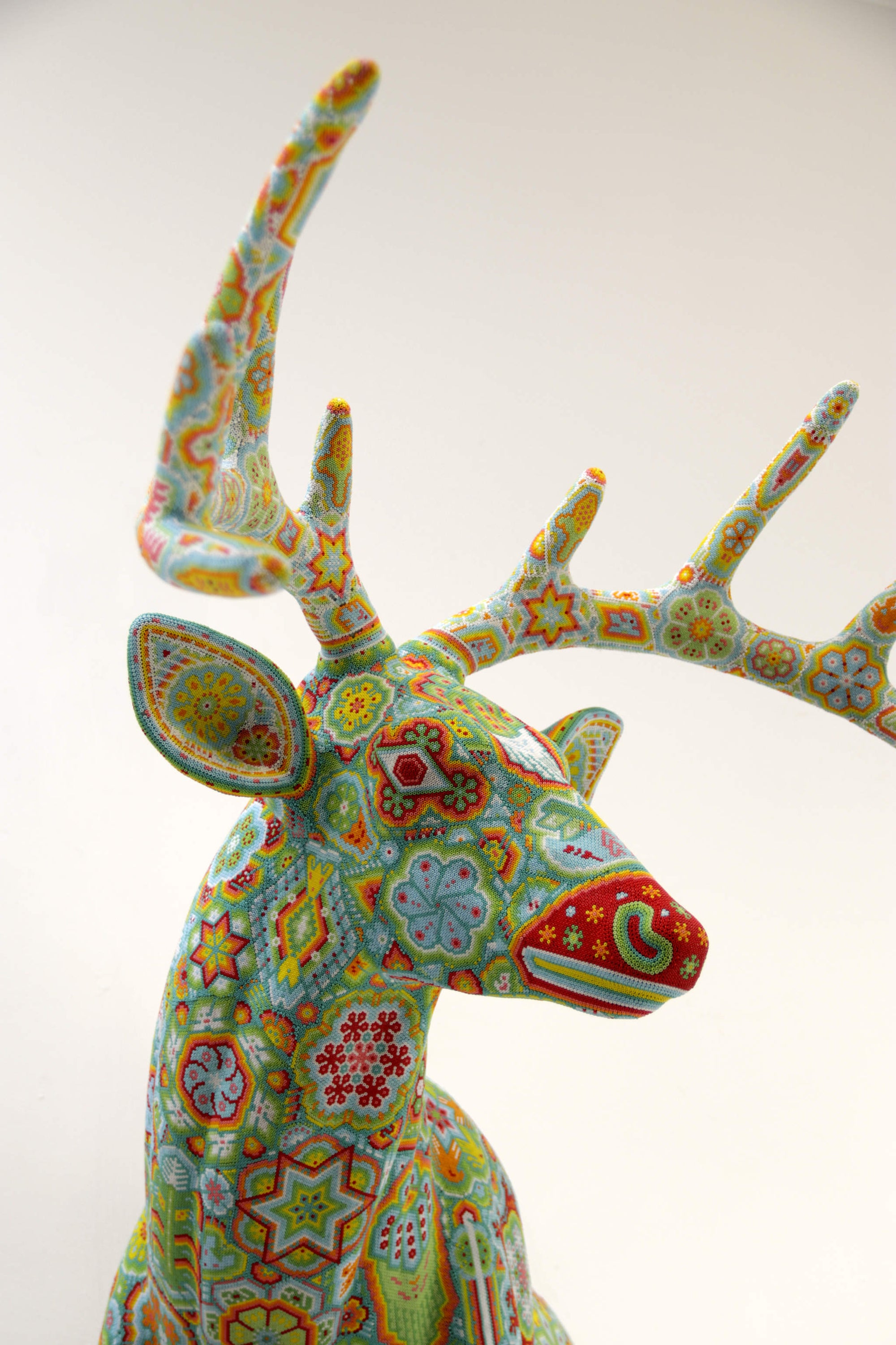 Su cuerpo —elegante, en impulso, con las patas delanteras extendidas y los cuernos como ramas cósmicas— está completamente intervenido con cientos de miles de chaquiras de cristal checoslovacas, aplicadas a mano por artistas visionarios wixaritari. Cada elemento sobre su superficie es parte del lenguaje simbólico wixárika: peyotes, espirales, ojos de dios, escorpiones, mariposas, el sol, la madre tierra, el maíz. Estos símbolos no decoran: transmiten, protegen, revelan.