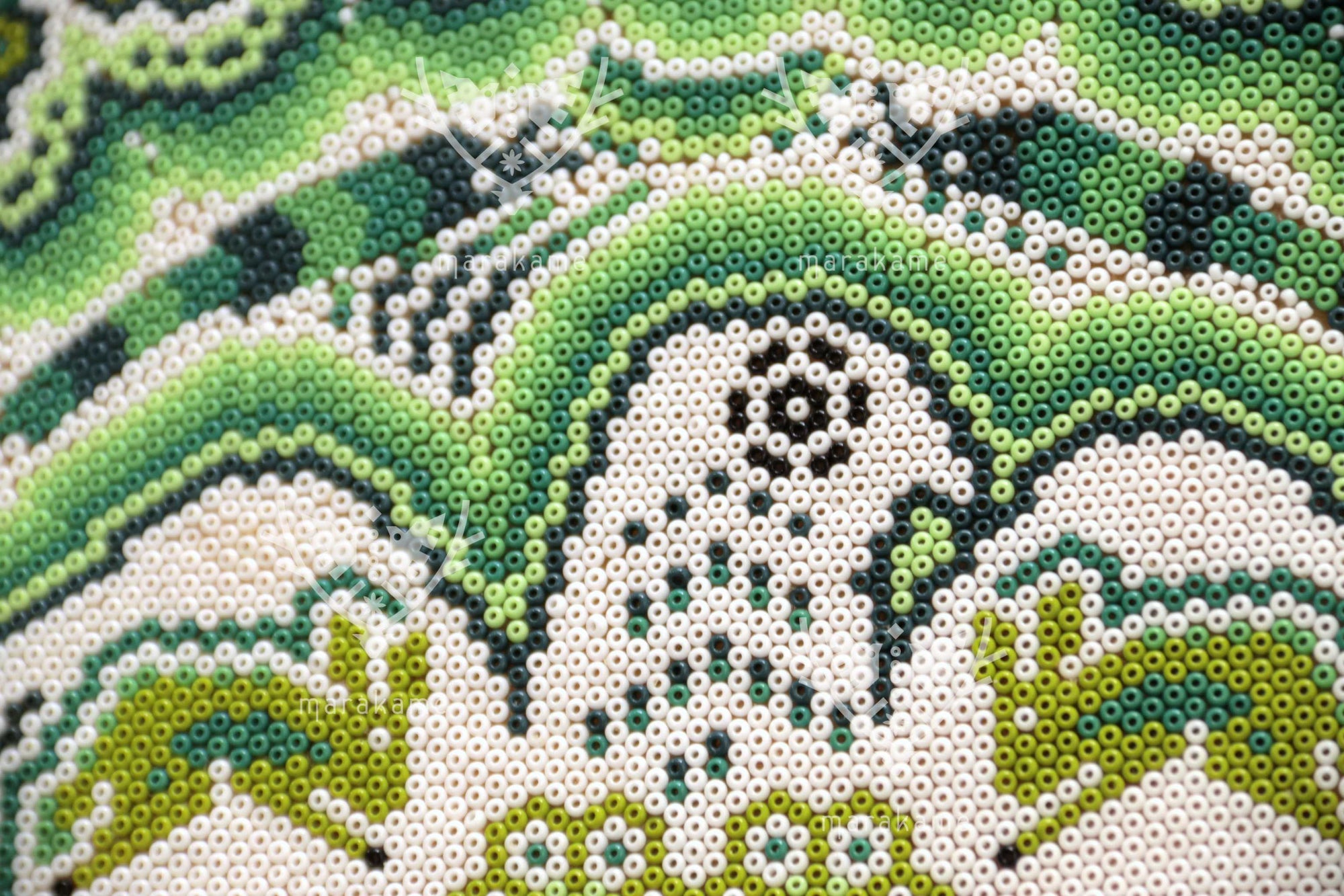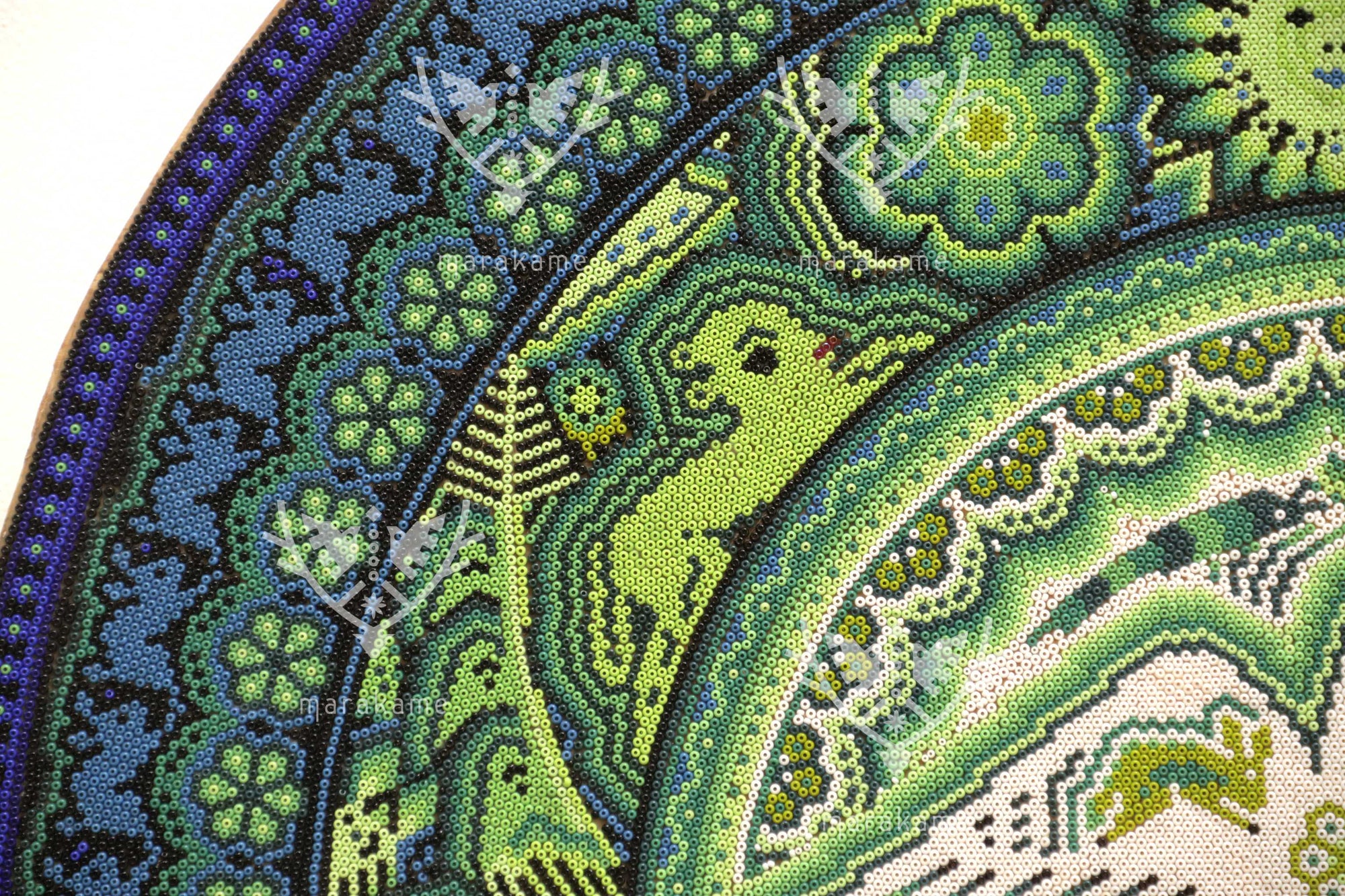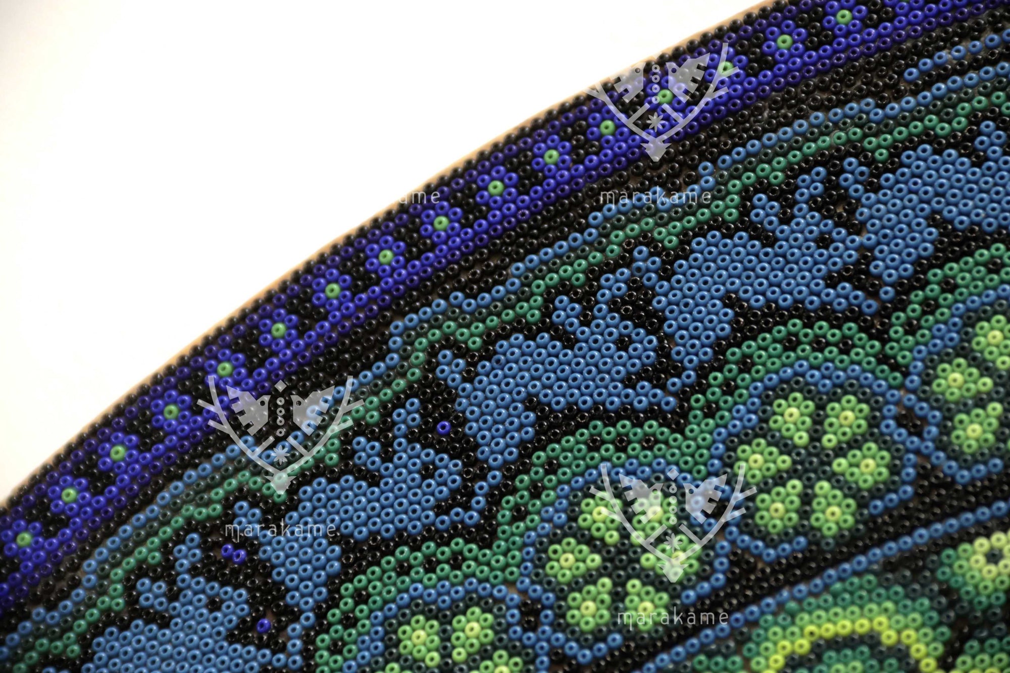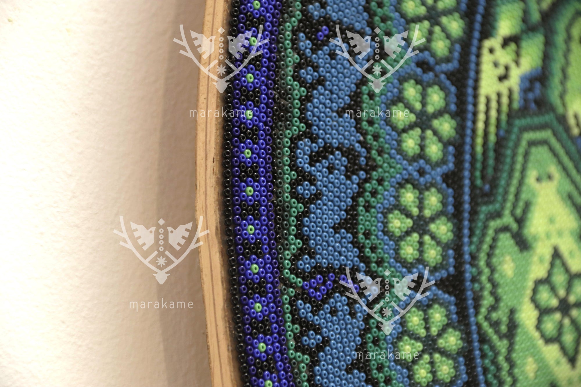 • ◇ Técnica: Chaquira de cristal calibrado 11/0 prensada con cera de campeche sobre círculo de madera.